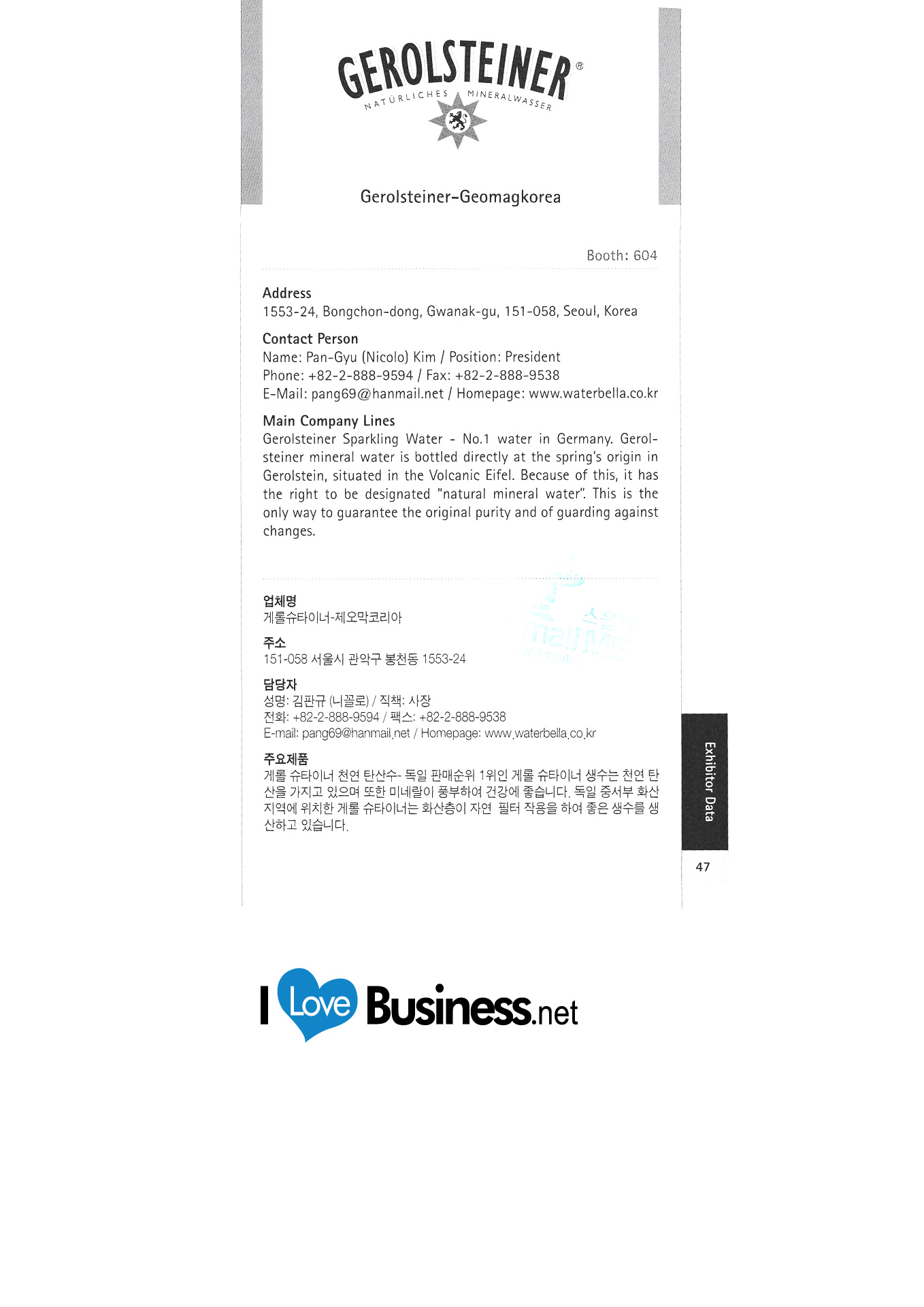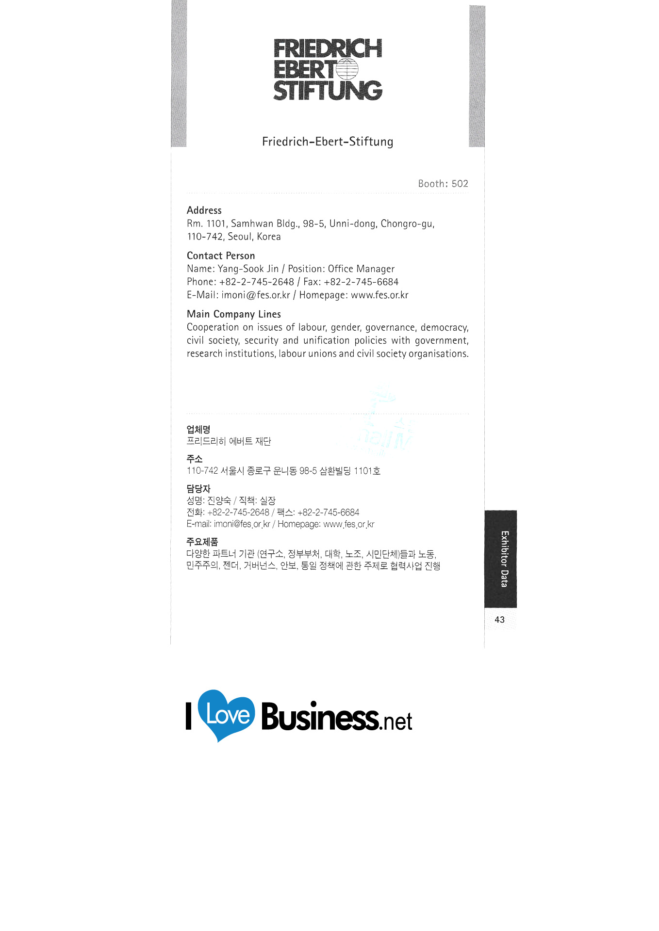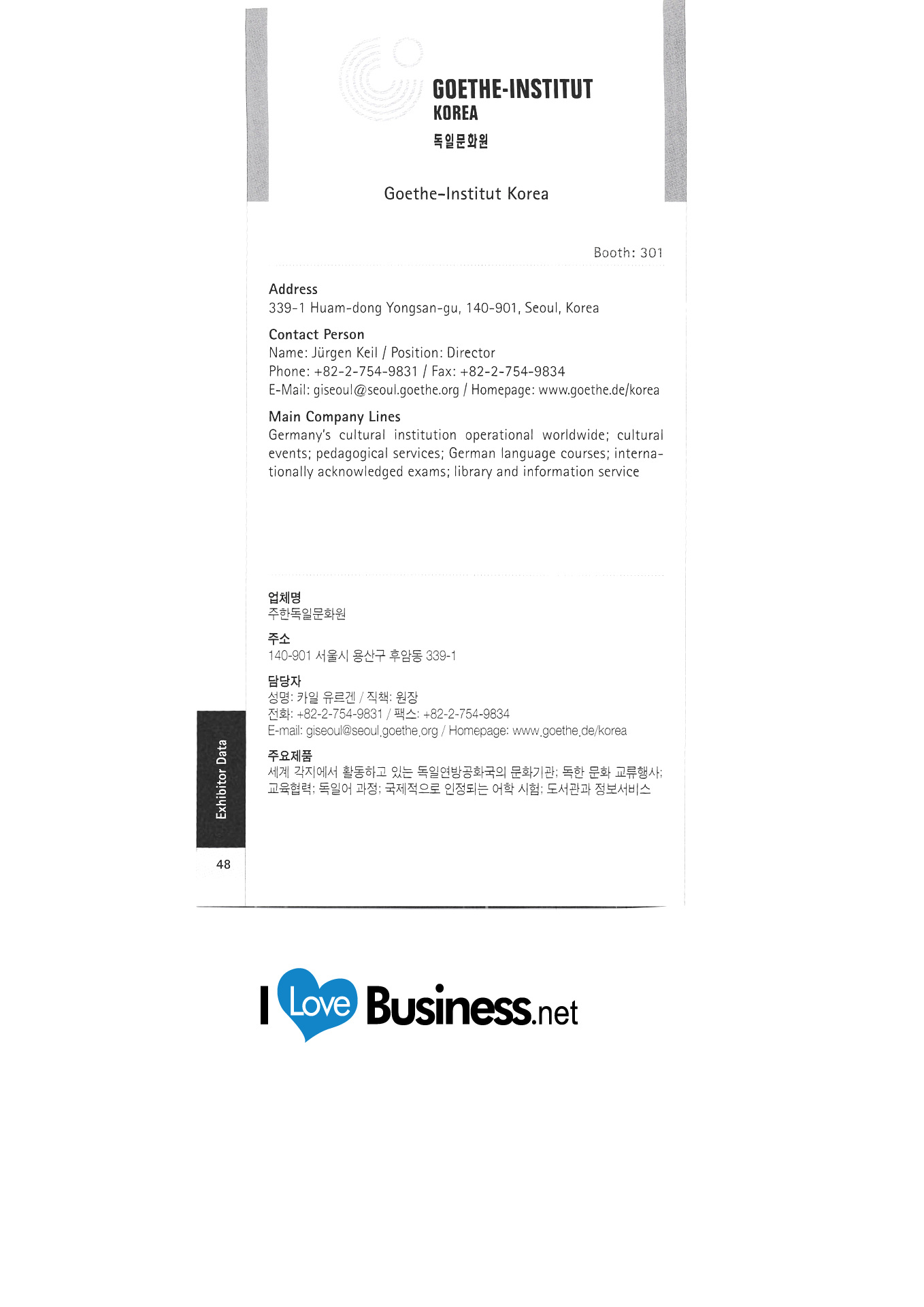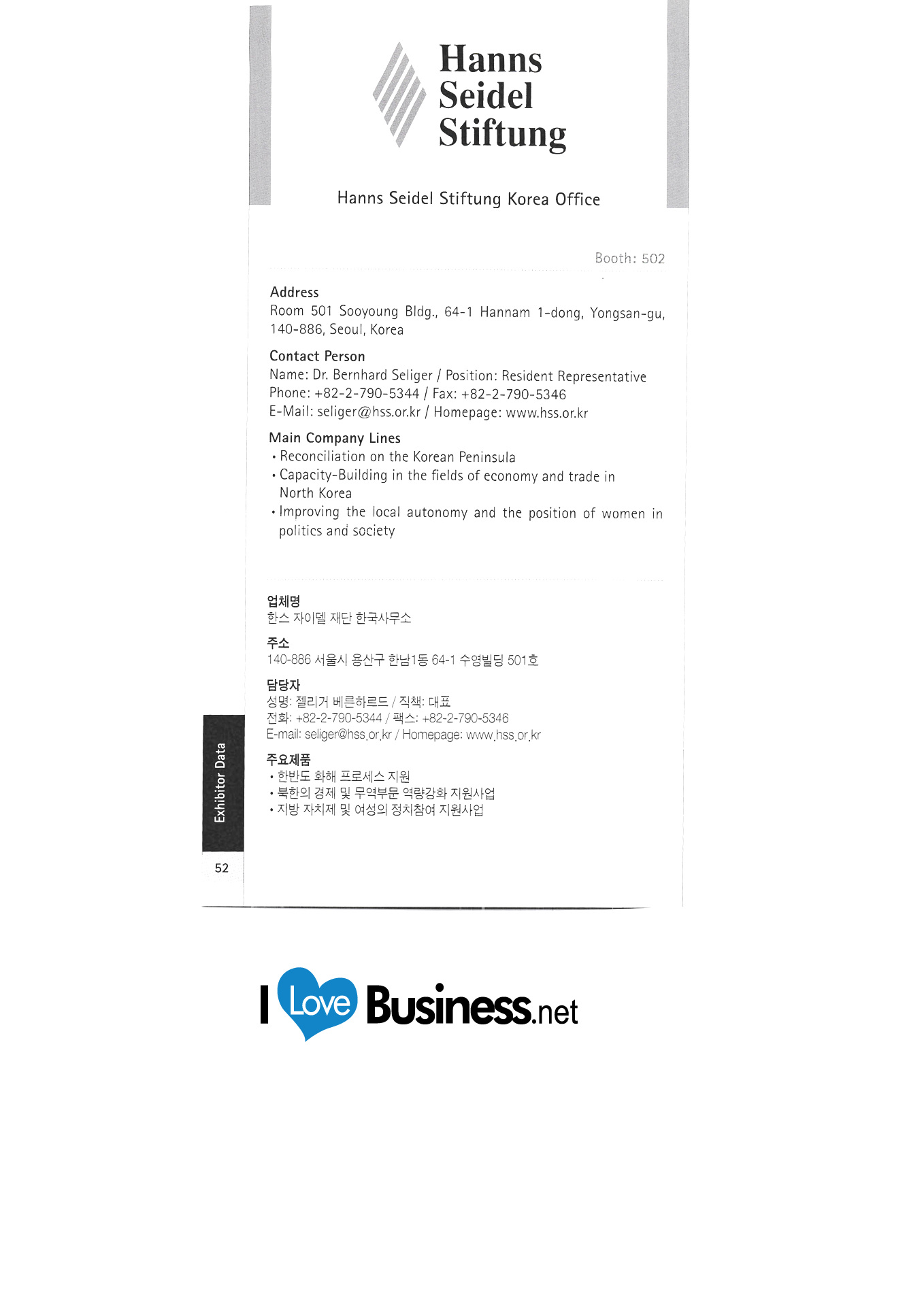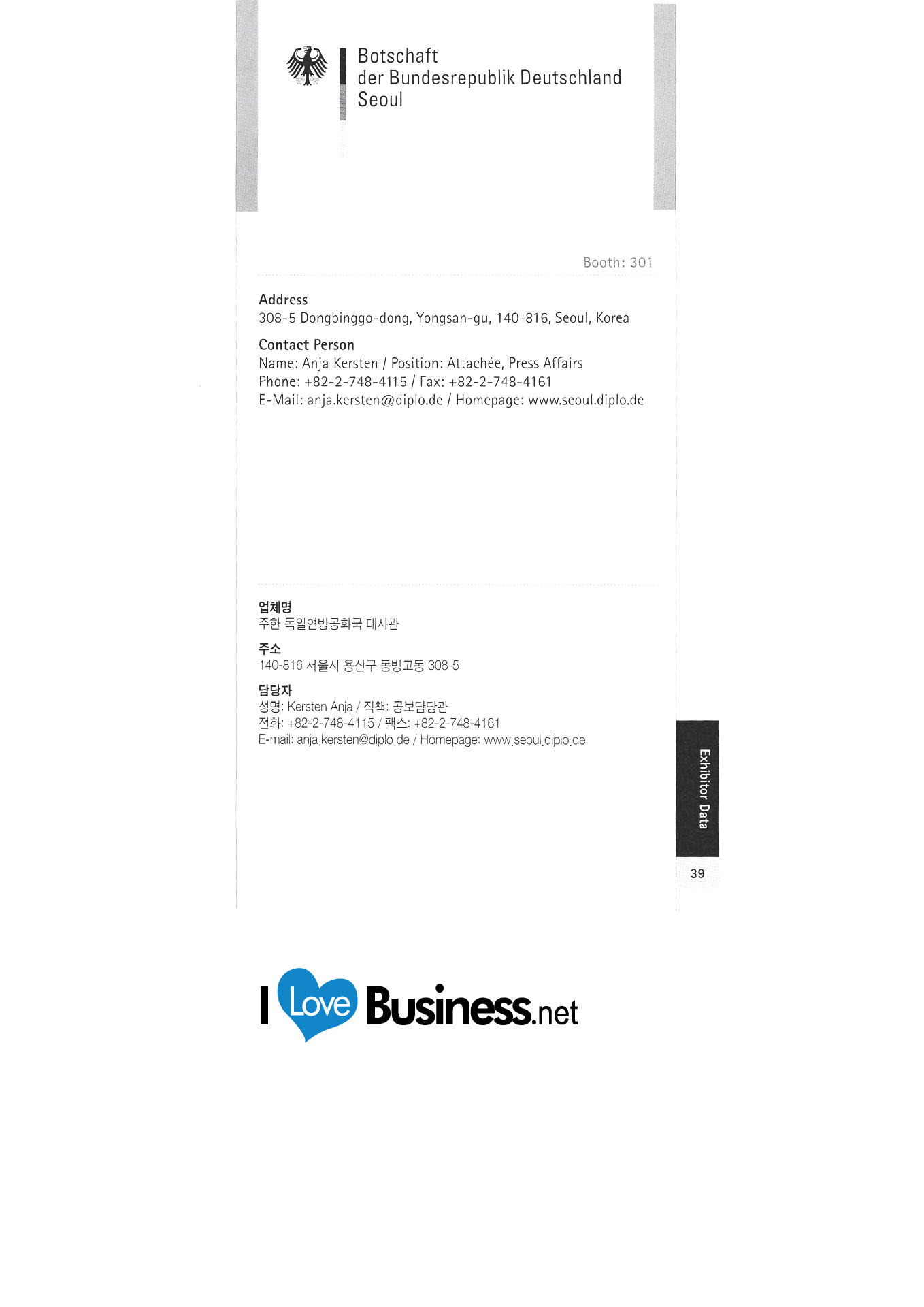 Deutsches Akademisches Austauschbüro Seoul Seoul Deutsche Schule Deutscher Weinverband c / o Koreanisch-Deutsche Handelskammer Die HL Korea Co., Ltd. EADS Korea Botschaft der Bundesrepublik Deutschland in Korea Whistler Korea FrankfurtRheinMain GmbH Internationales Marketing der Region Friedrich-Nauman-Stiftung Friedrich-Evert-Stiftung Korea Hooks Lubricant Co., Ltd. Galerie DER WEIN Deutsches Tourismusbüro Gerolsteiner-Zeomac Korea Deutsches Kulturzentrum in Korea Grillwalker HA Hessen Agentur GmbH Hankyung Ham Büro der Hans Seidel Foundation Korea HARTING KOREA "Hessisches Ministerium für Wirtschaft, Verkehr, Stadt- und Regionalentwicklung " Whoo Sangsa Jeong Air Technic Co., Ltd. Kako Asia Pacific Co., Ltd. Kinzo Architectural Design Office Comos Distribution Conrad Adenauer Stiftung Handok Industrial-Academic Cooperation Complex Deutsche Handelskammer in Korea (KGCCI) LANXESS Korea Ltd. Büro der Thüringer Wirtschaftsförderungsgesellschaft in Korea Lufthansa German Airlines Merck Corporation / Merck Advanced Technologies Corporation Mercedes-Benz Korea |