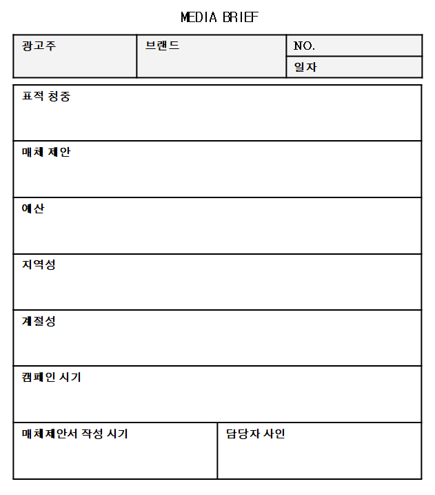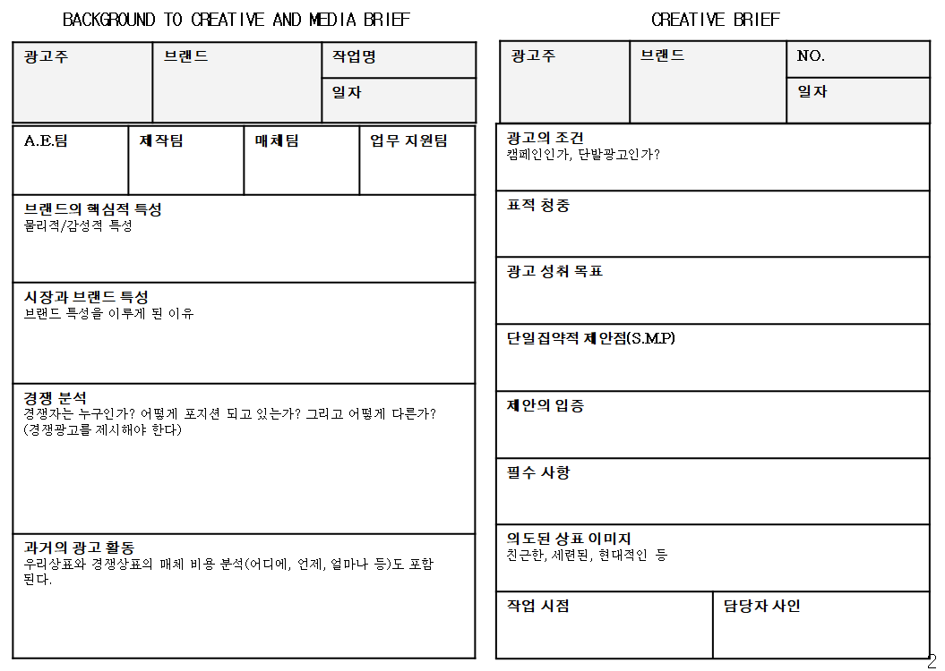 브리프란 광고기획 담당자가 작성하는 전략적 광고기획 양식이며 광고주에게 광고를 프리젠테이션하기 이전에 광고의 기본적인 방향을 합의하기 위해 만들어진 지침서이다. 또한, 광고대행사 내에서는 광고기획 담당자가 크리에이티브팀, 매체팀에 광고제작을 의뢰하기 위한 광고제작 지침서이다.