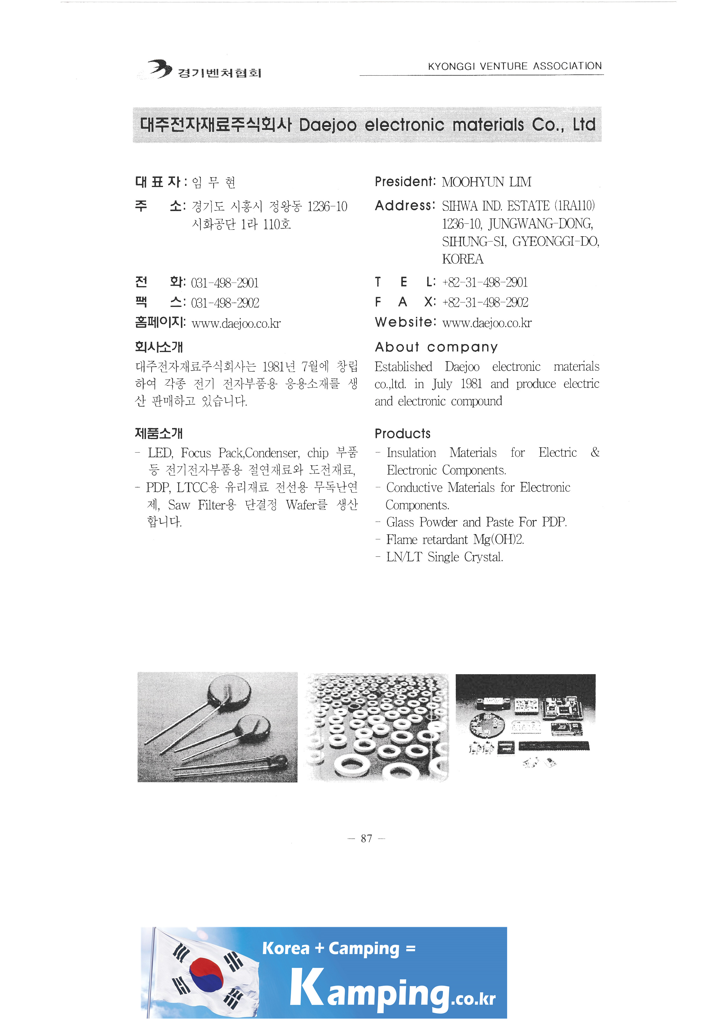 | 大洋高科技有限公司 大妍有限公司 大荣MTC 大和电气工业有限公司 大润木业实业有限公司 戴恩·莫比尼克 Daeil Systems Co.,Ltd. 与工作C S T 戴尔工程 大州市电子材料有限公司 大金精密 大韩科技产业 大贤环境科技 大兴易边有限公司 德寿文化史 德吉实业有限公司 DECON工程 多尔加 廉元 都裕机械工业 东门信息通讯有限公司 东邦电器实业有限公司 东信膜片有限公司 东亚电子科技 东阳继电器产业有限公司 东进化工有限公司 杜南有限公司 斗山电子工业有限公司 斗山信息通信有限公司 斗山专用车有限公司 两只手有限公司 双I Duoback Korea Co.,Ltd. 梦影画有限公司 迪诺斯有限公司 DS Tech Co.,Ltd. Dimetech Co.,Ltd. 夏令时 数字技术 Digitalsys Inc. |