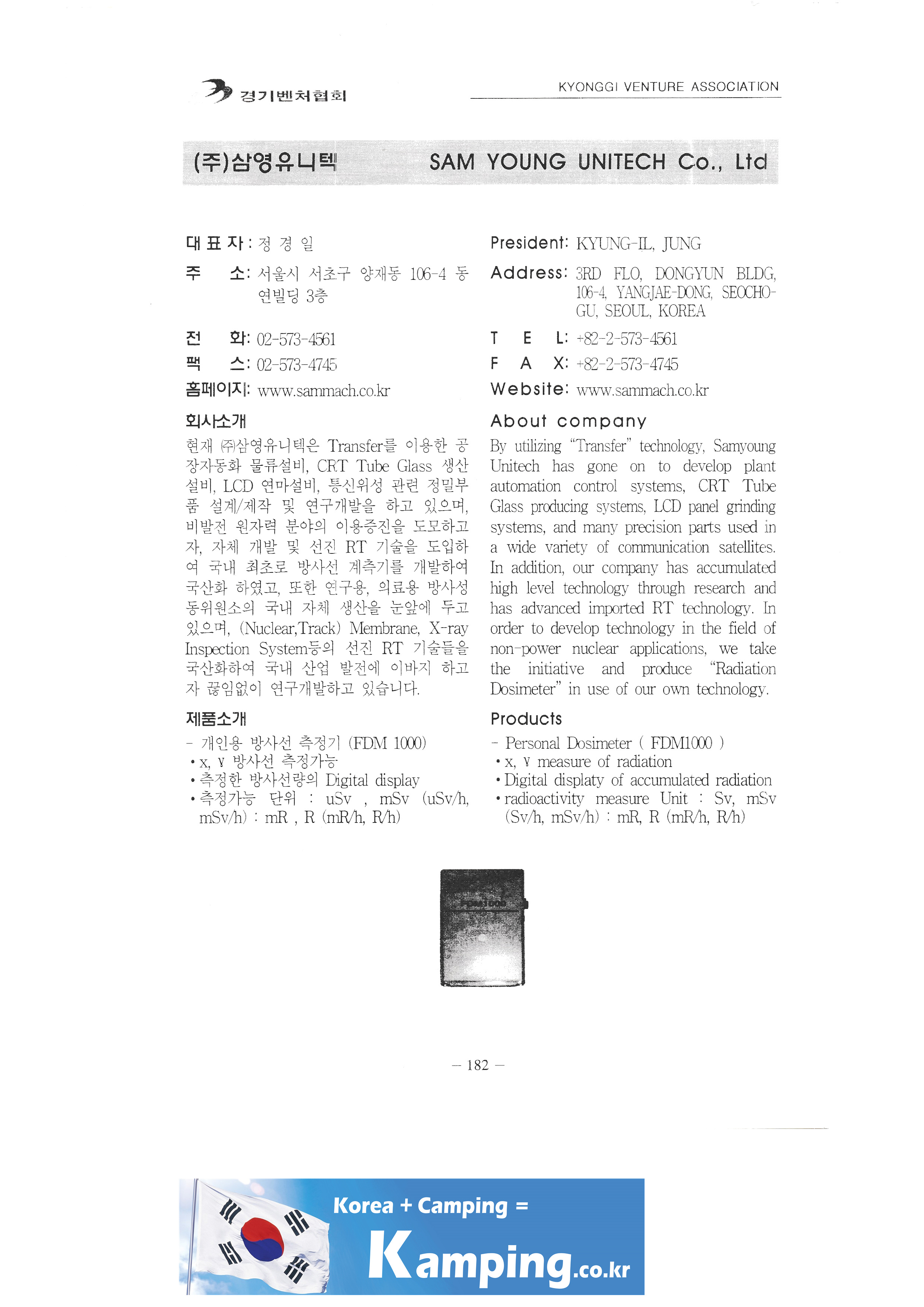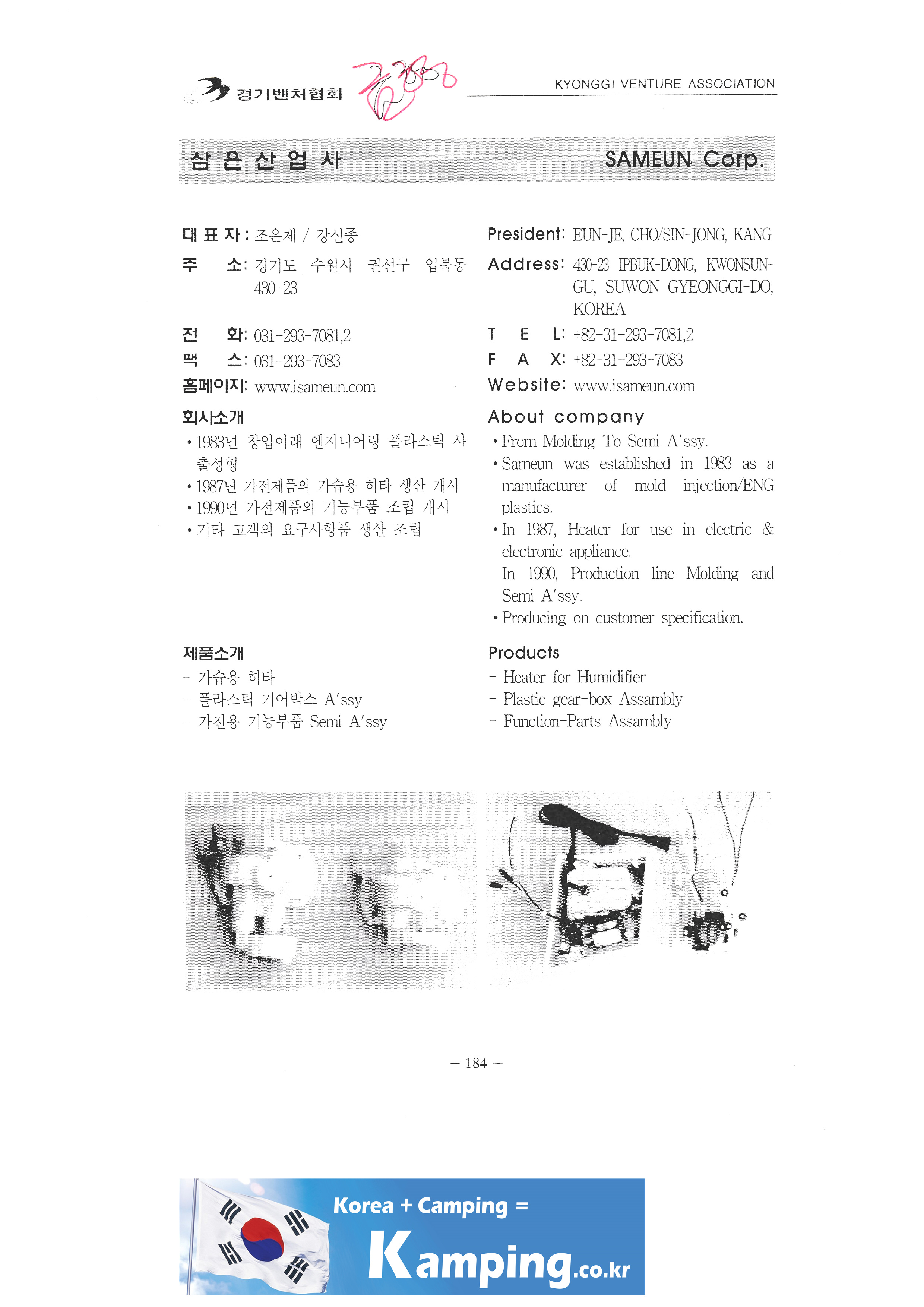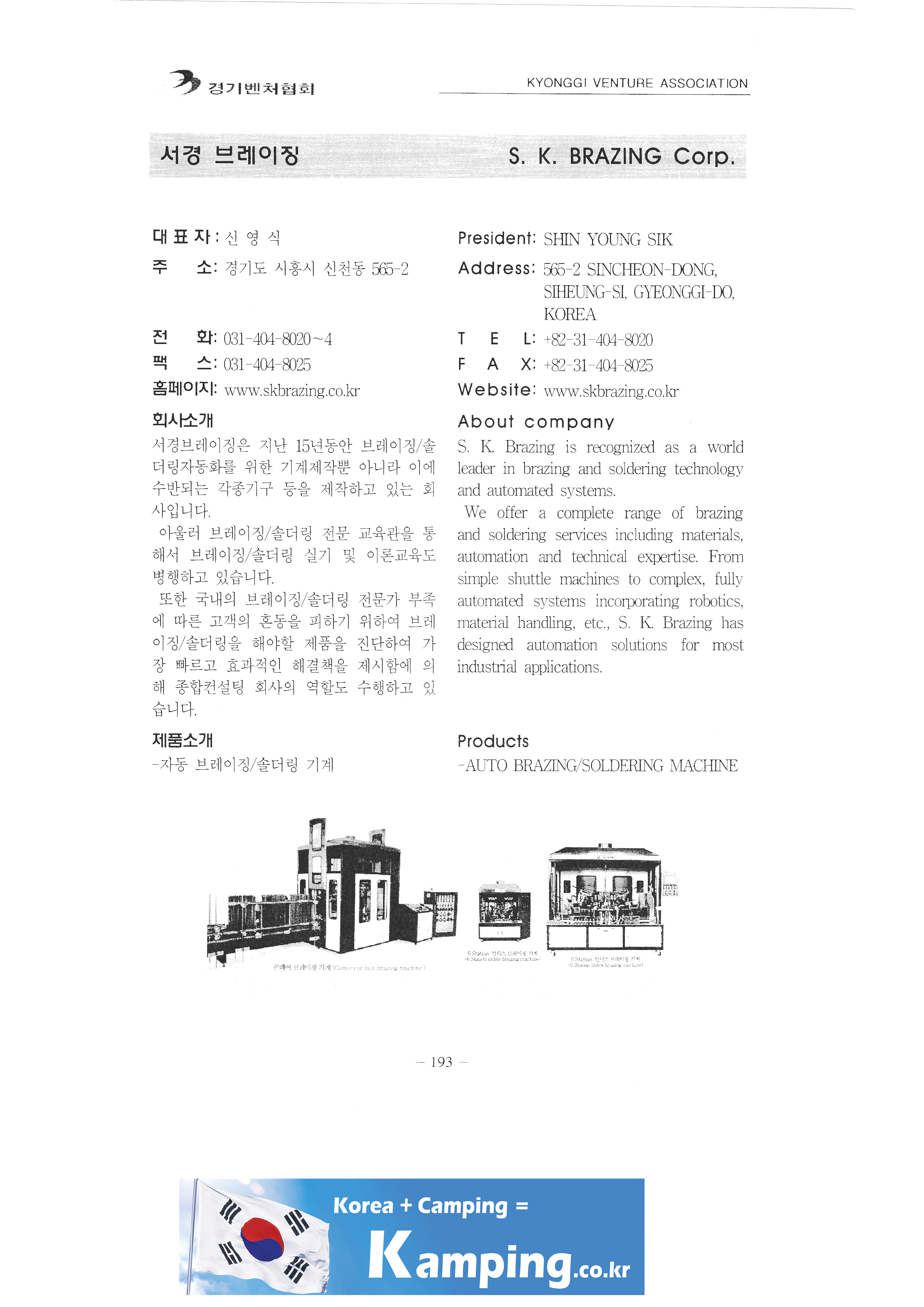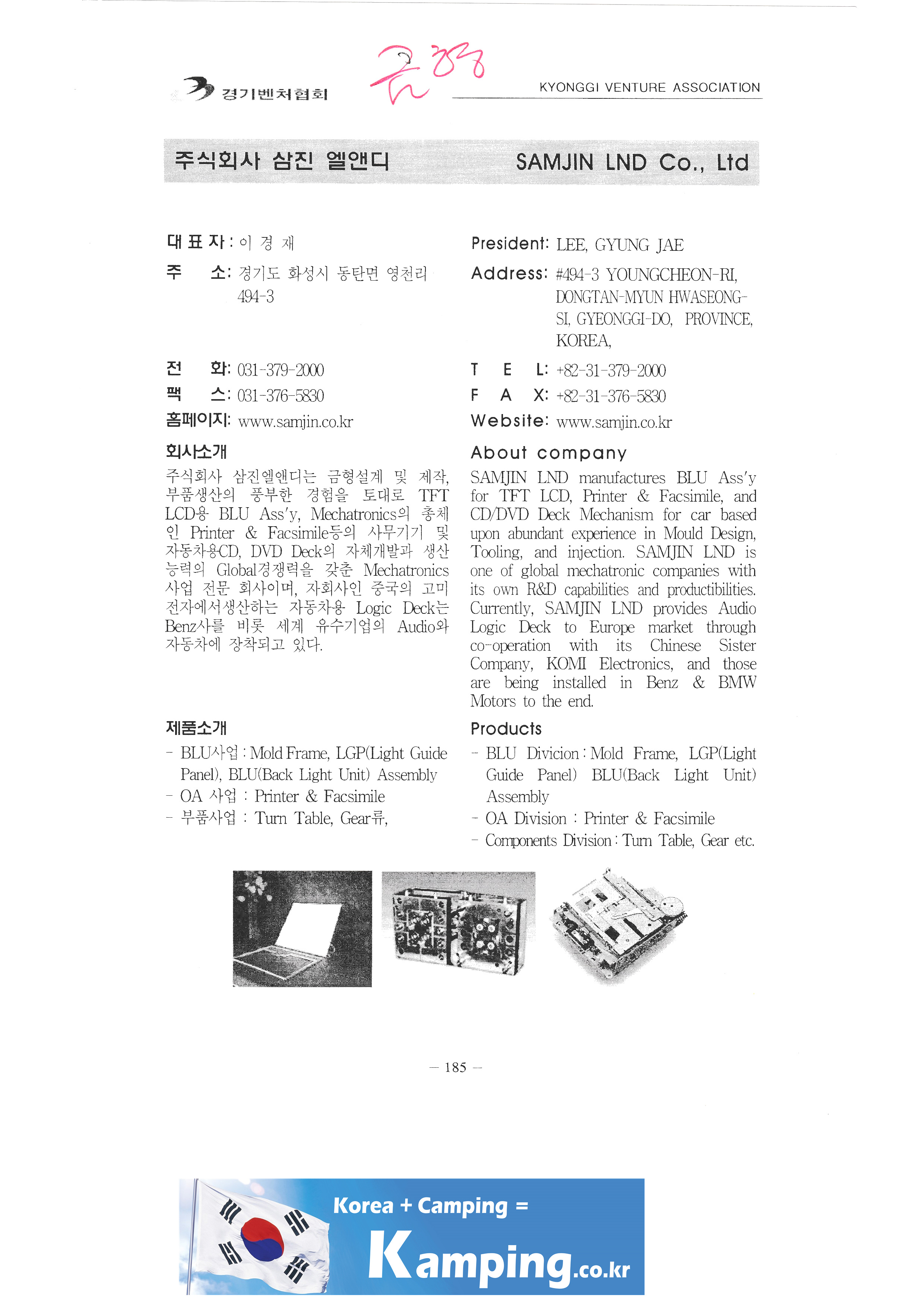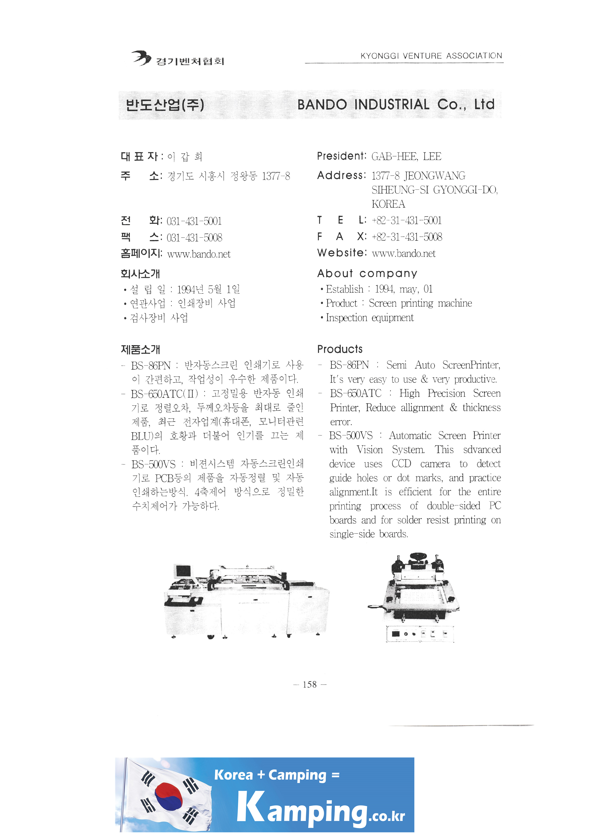 Bando Industry Co., Ltd. Bandiplex Co., Ltd. International Industrial Technology Research Institute, Inventor Bae Hye-jung Nurukdo Bank 25 Co., Ltd. Beomyang Unicold Co., Ltd. Best One Boris Battlefield Bowon Kyung Metal Co., Ltd. VC Korea Biryong Electronics Co., Ltd. B&P Science Vieche Solution Co., Ltd. Viol Developers Co., Ltd. Bitsaem Electronics Co., Ltd. Sound Tech Enterprise Co., Ltd. Samgun Berrycle Co., Ltd. Samkwang System Co., Ltd. Sammyung Tech Co., Ltd. Sambo Co., Ltd. Samsung Medical Equipment Co., Ltd. Samshin Machinery Samshin Machinery Co., Ltd. Samshin Innotek Co., Ltd. Samyoung Unitech Samyoung Synthetic Industry Sameun Industrial Company Samjin L&D Co., Ltd. Samwon Cobra Sangshin Co., Ltd. Sangshin Engineering Co., Ltd. Features Saeam Soft Co., Ltd. Saehan Co., Ltd. Sogang Decal Seokyung Brazing Seoul Jeonggi Seoul Pharmaceutical Co., Ltd. Seoul Chemical Seoil Chemical Co., Ltd. |