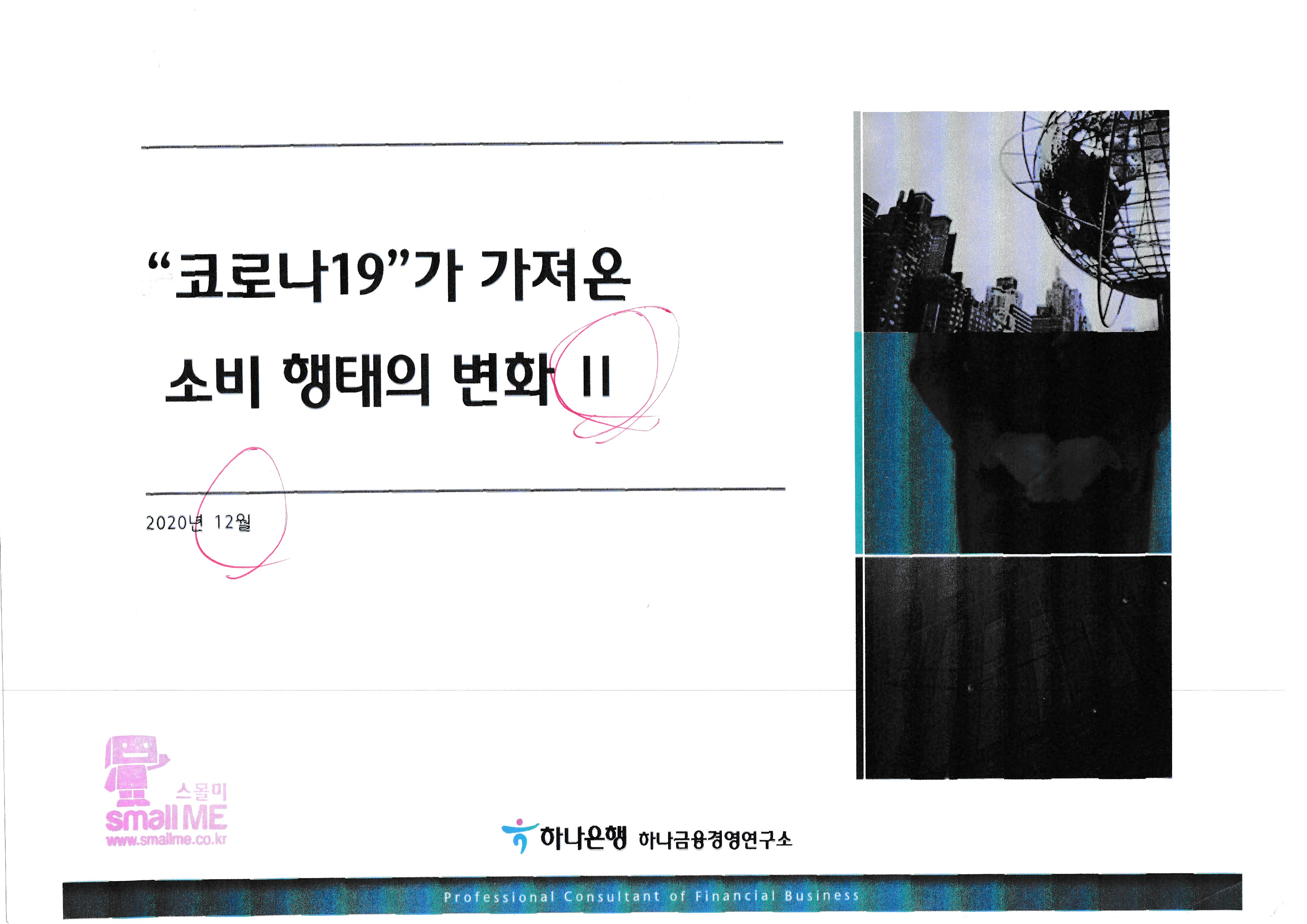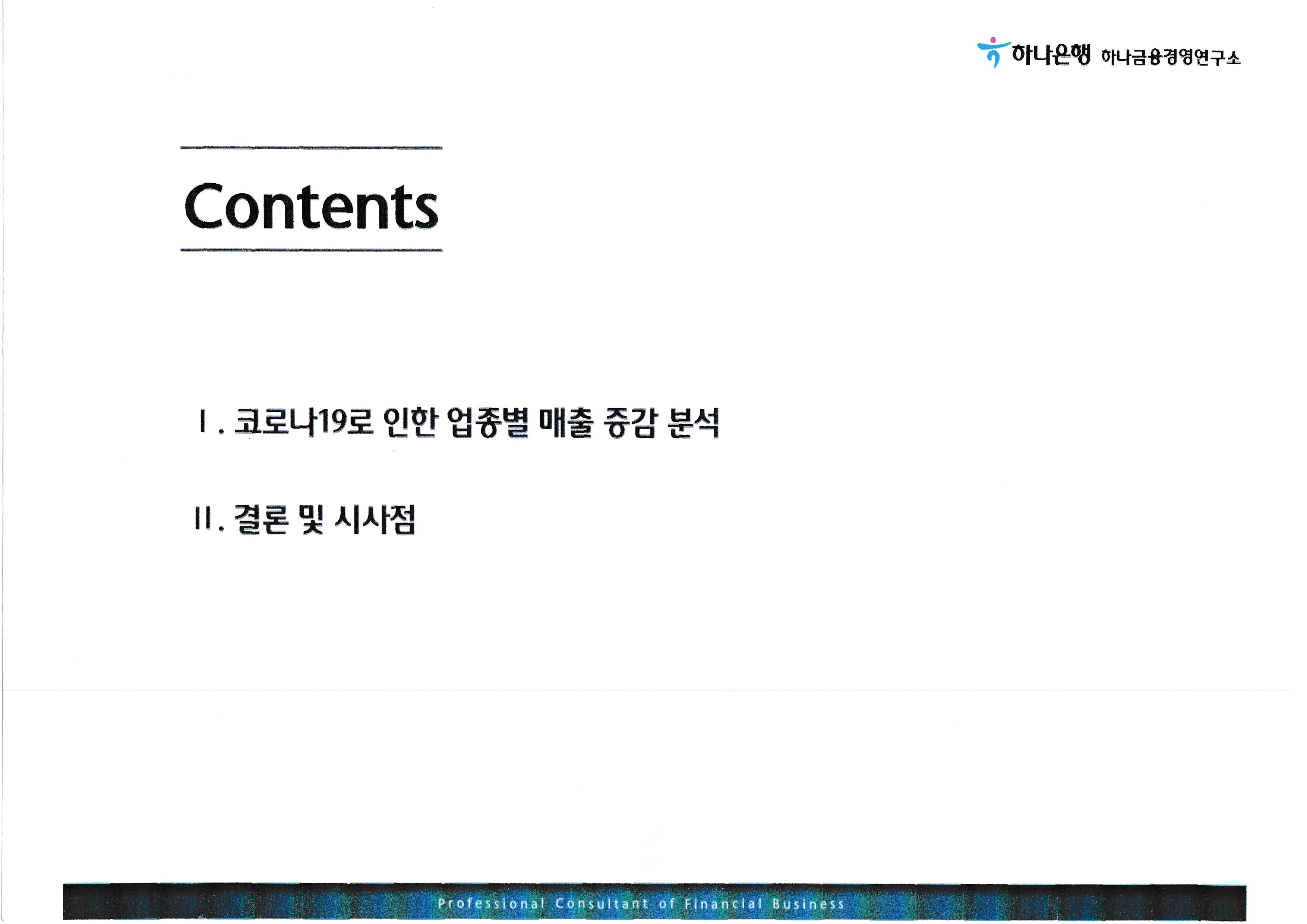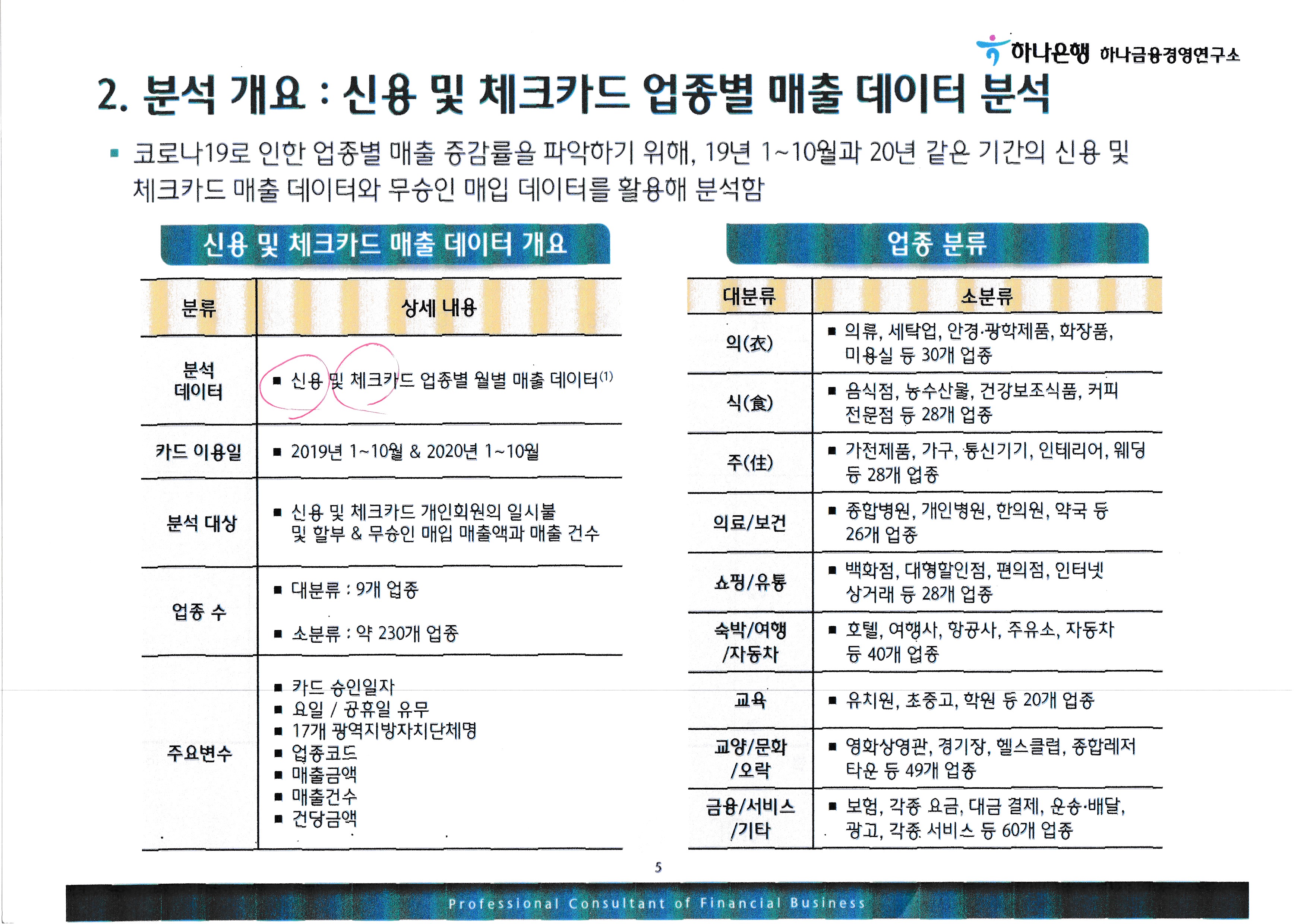 하나은행, 하나금융경영연구소에 카드매출을 기반으로 한 코로나 사태에 따른 시장소비형태의 변화에 대한 객관적 사실을 정리한 리포트. ================================= “코로나19”가 가져온 소비