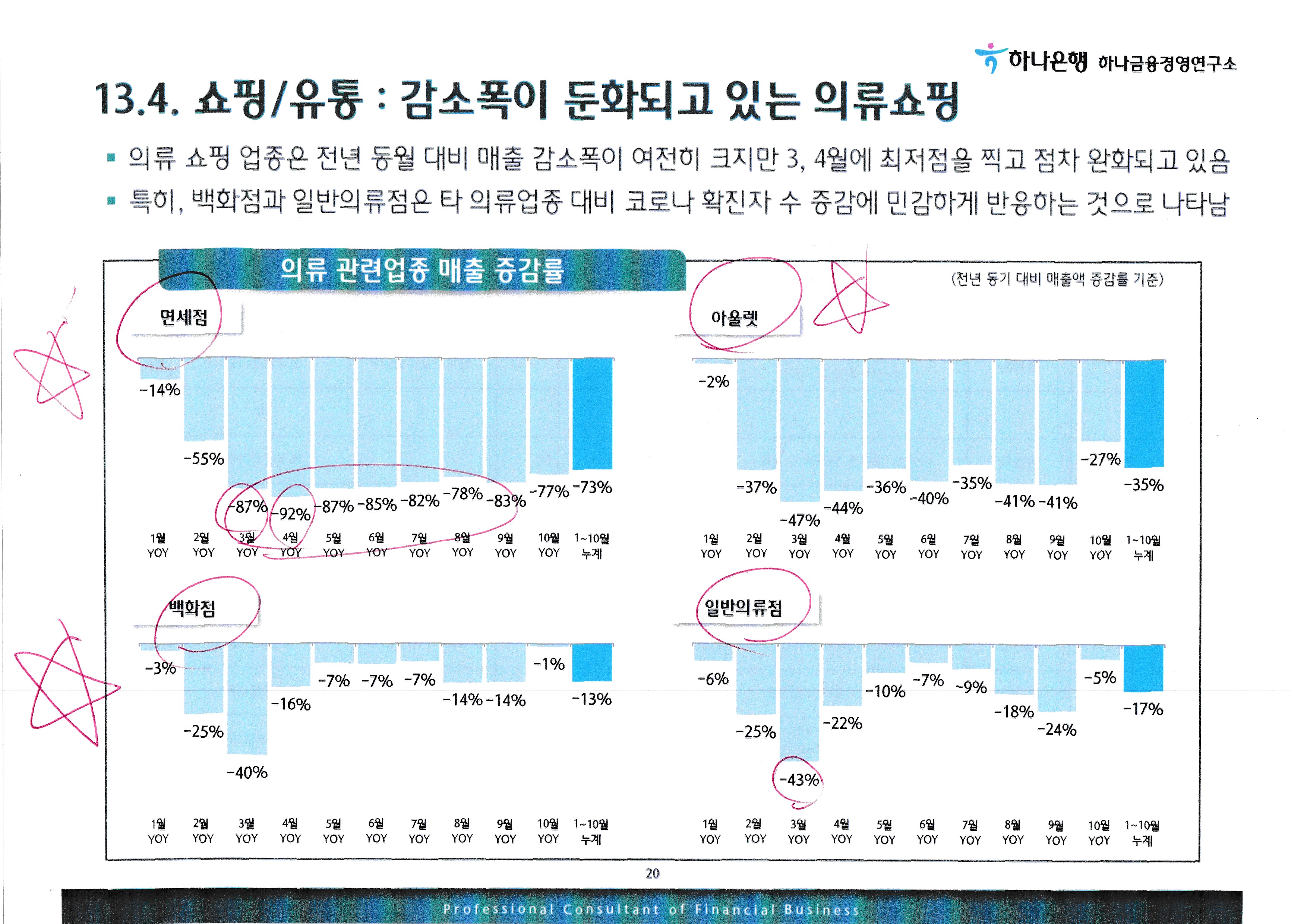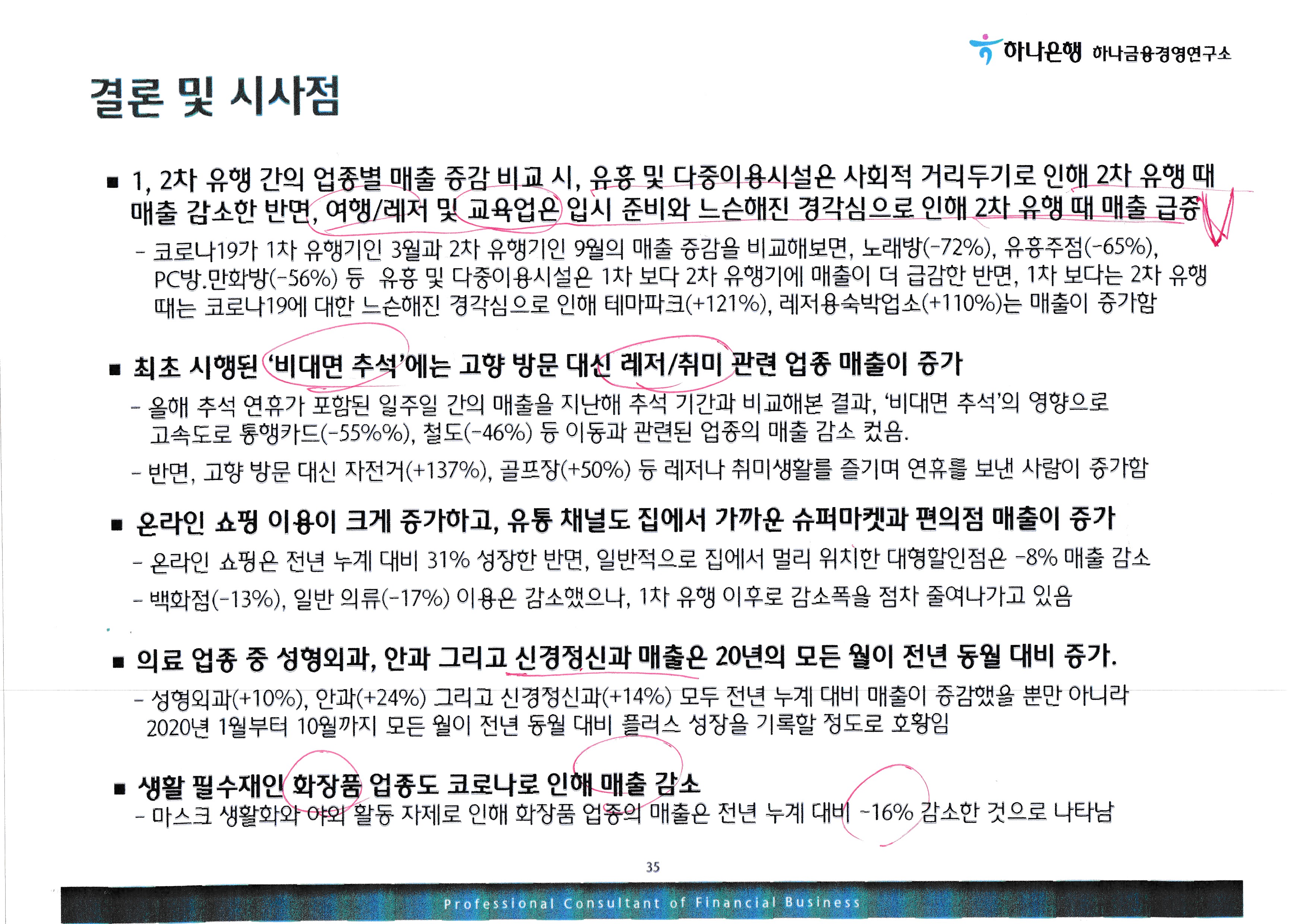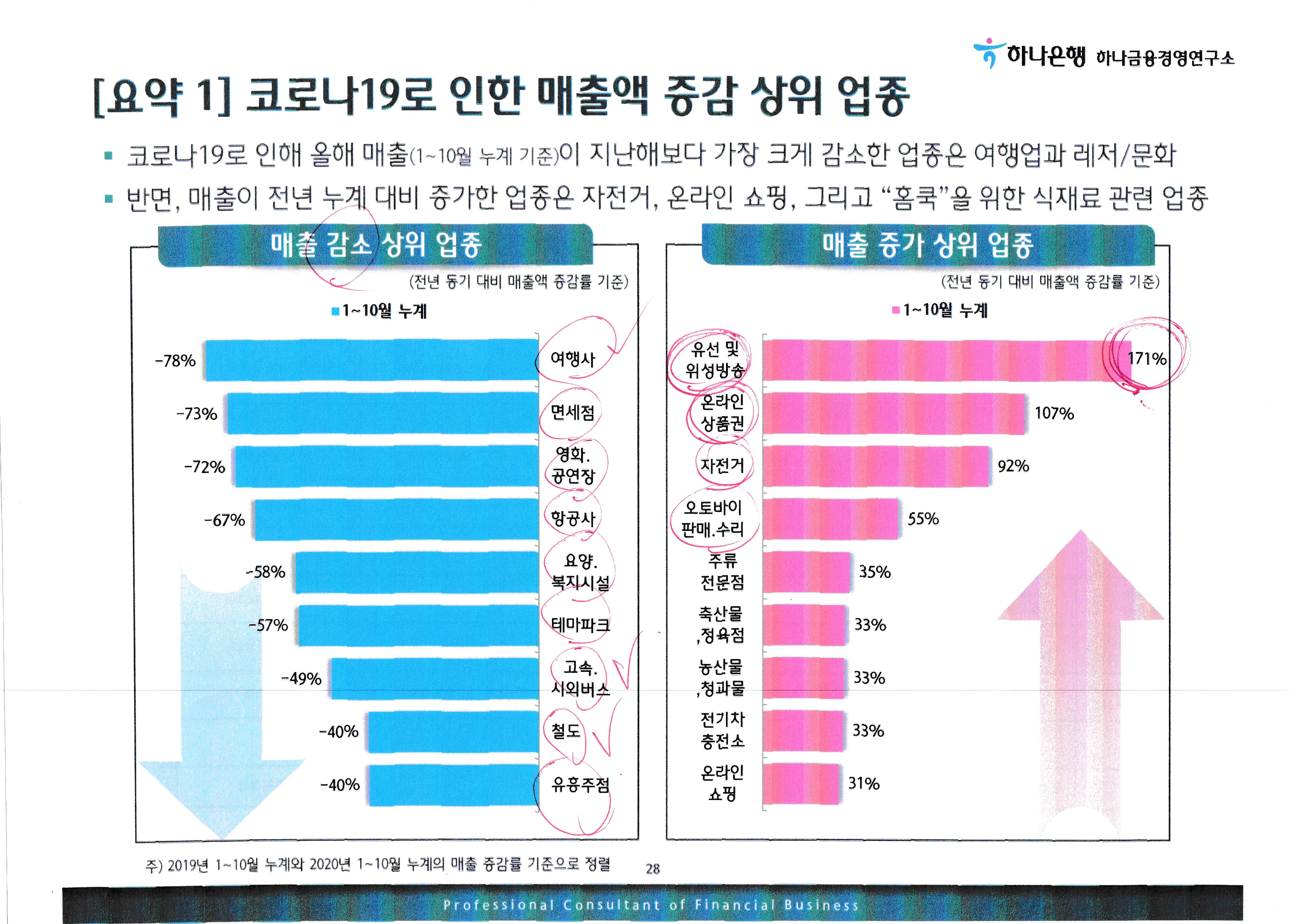 하나은행, 하나금융경영연구소에 카드매출을 기반으로 한 코로나 사태에 따른 시장소비형태의 변화에 대한 객관적 사실을 정리한 리포트. ================================= “코로나19”가 가져온 소비