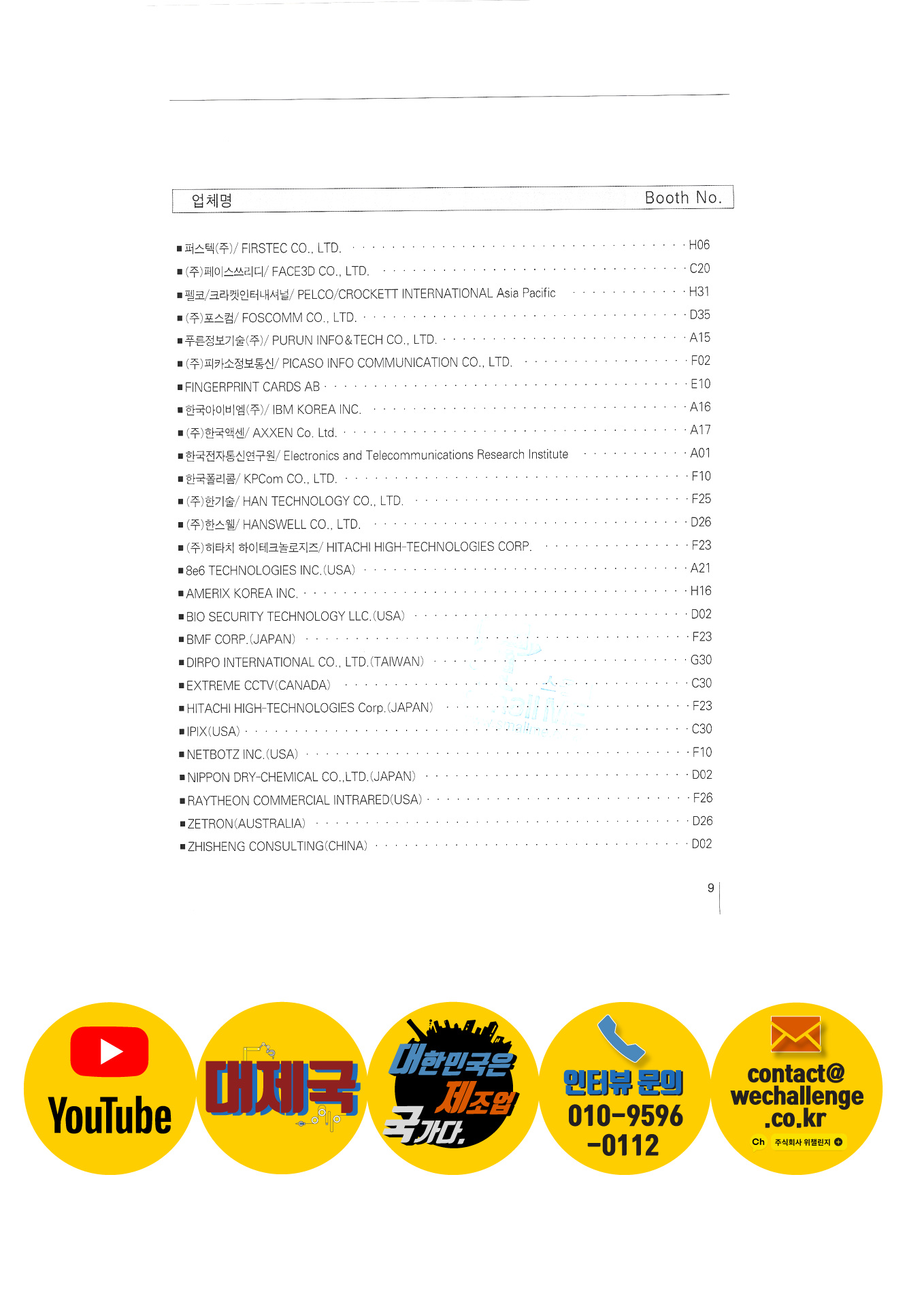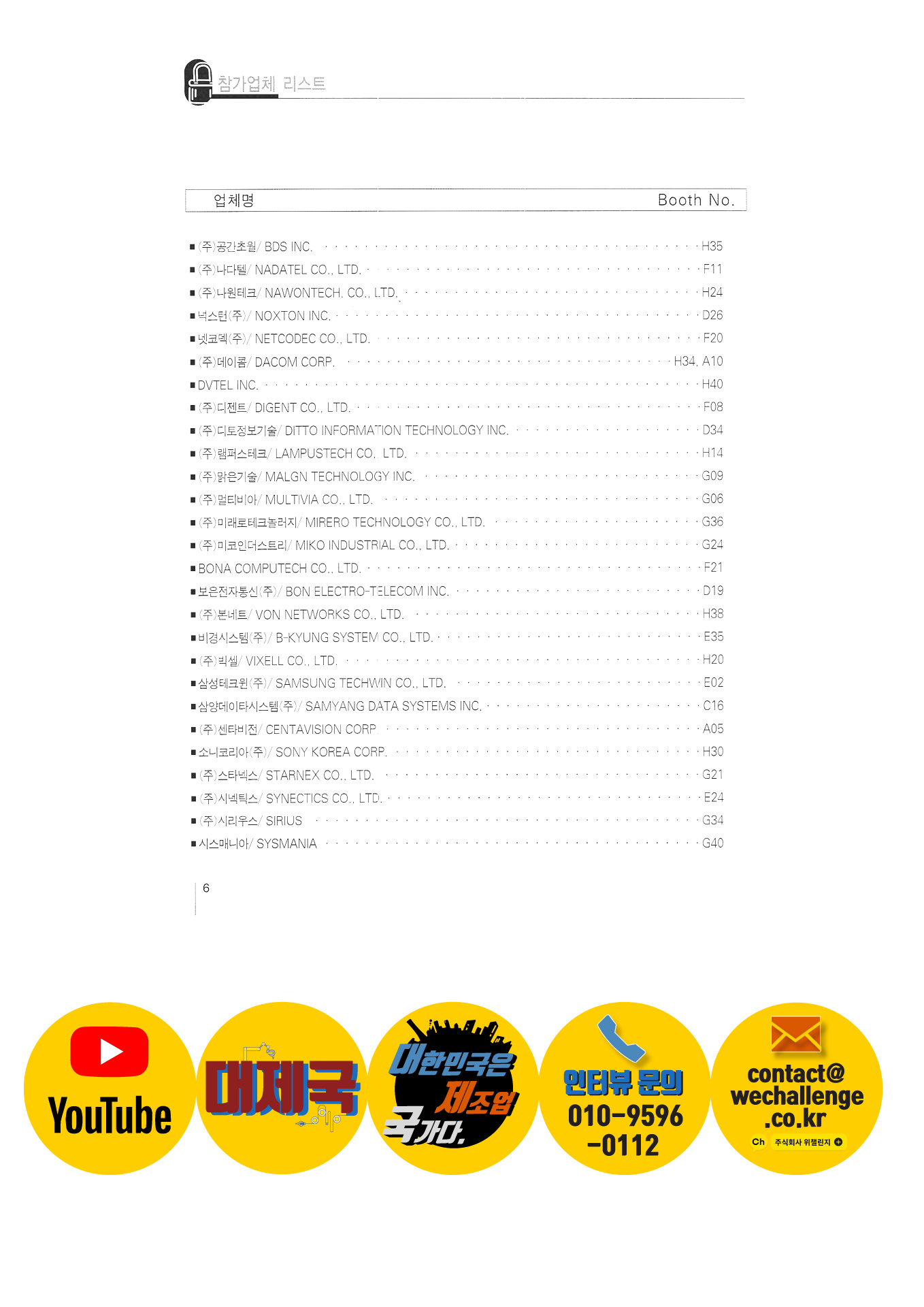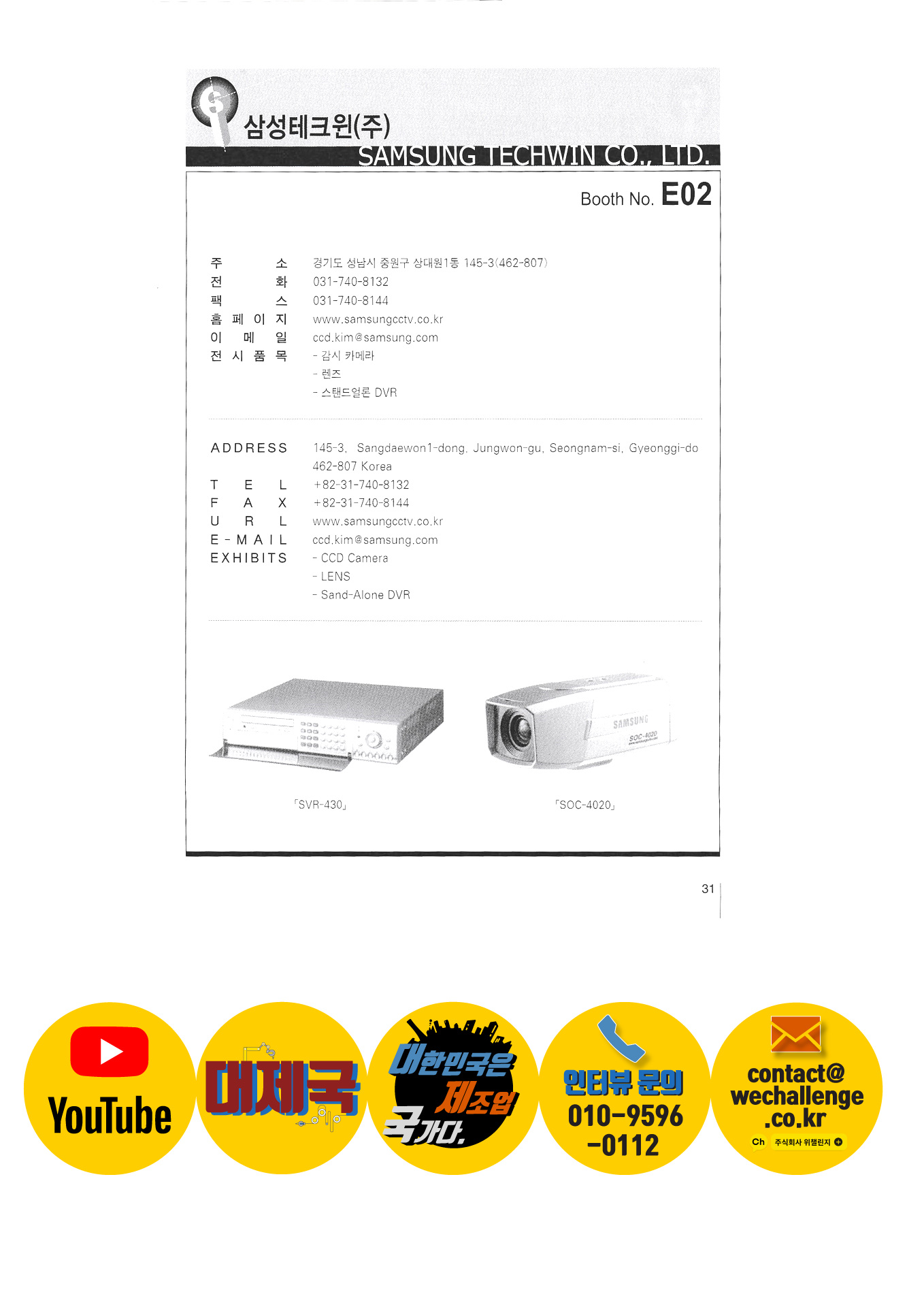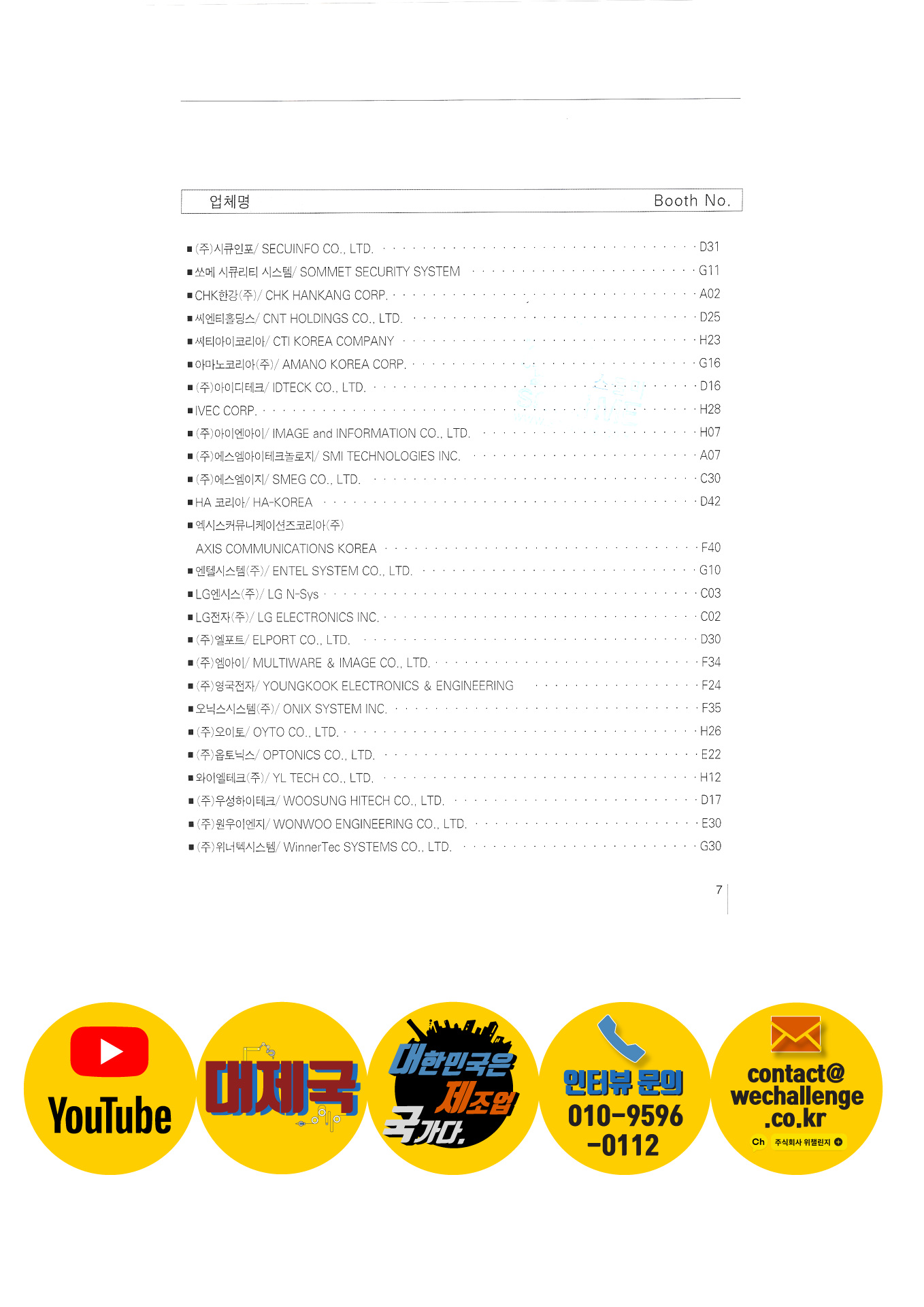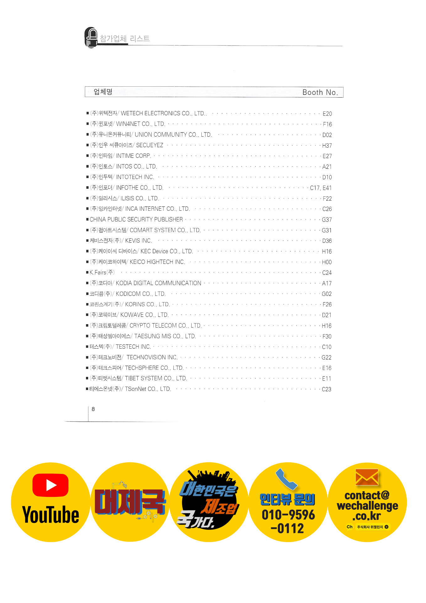 ㈜空間超越 ㈜灘テル ㈜ナウォンテック ノックアウトスターン㈜ ネットコーデック㈜ DVTEL INC ㈜ディジェント ㈜エディット情報技術 ㈜ラムパーステック ㈜晴れ技術 ㈜マルチビア ㈜未来テクノロジー ㈜ミコインターストリ BONA COMPUTECH CO。、LTD。 恩返し電子通信㈜ ㈜ボンネット 秘境システム㈜ ㈜ビクセル サムスンテックウォン㈜ 三洋データシステム㈜ ㈜センタービジョン ソニーコリア㈜ ㈜スターネックス ㈜シネクティクス ㈜シリウス シスマニア |