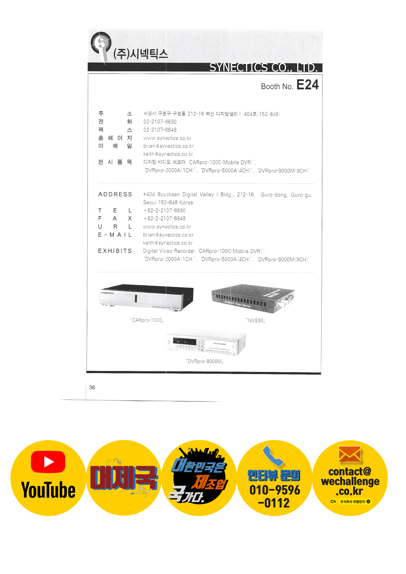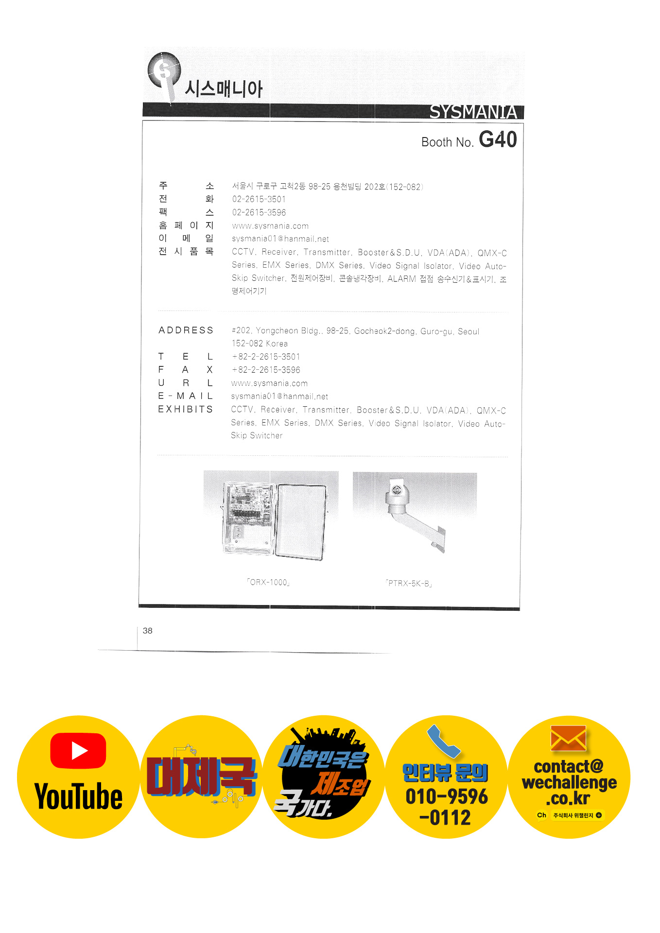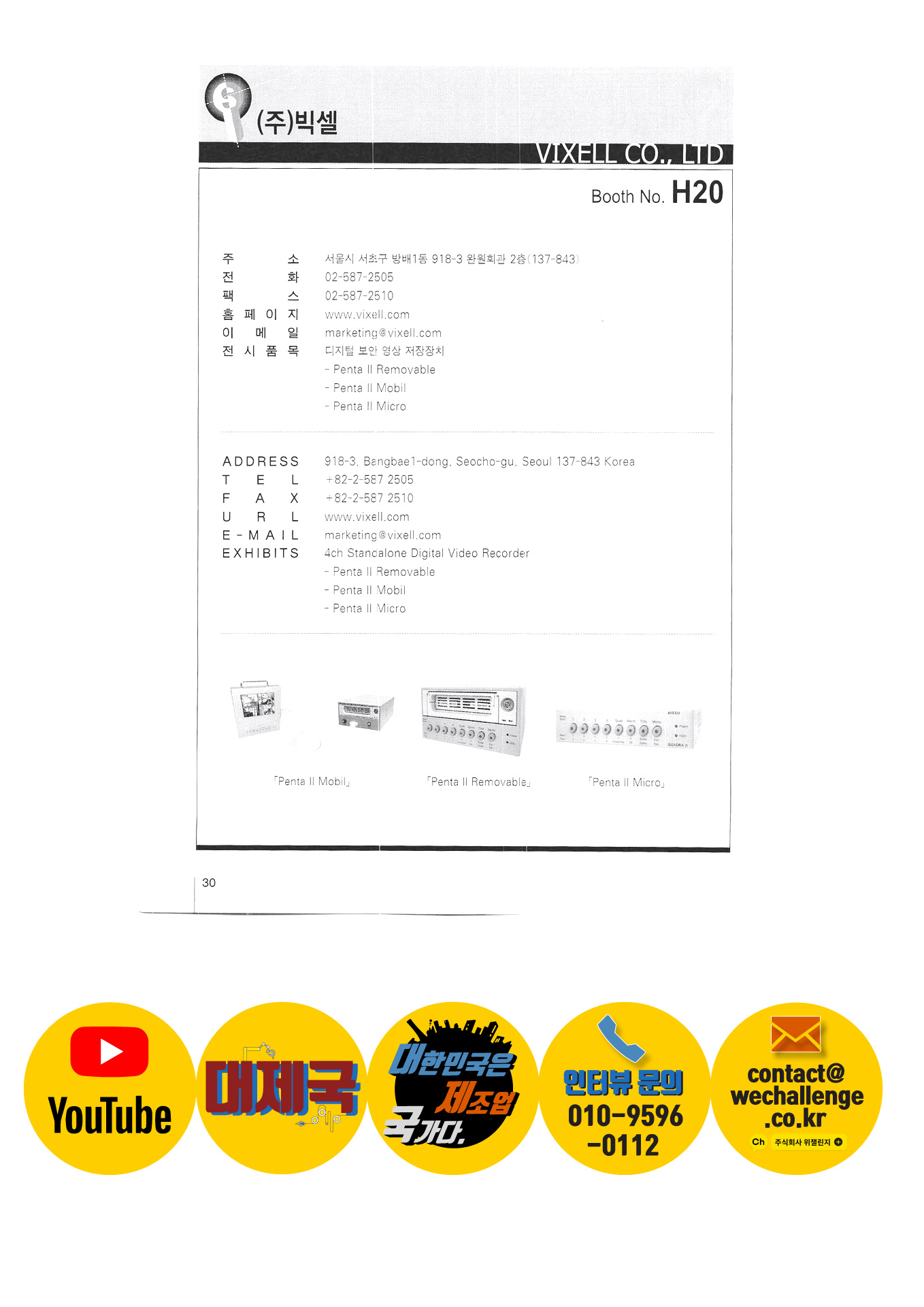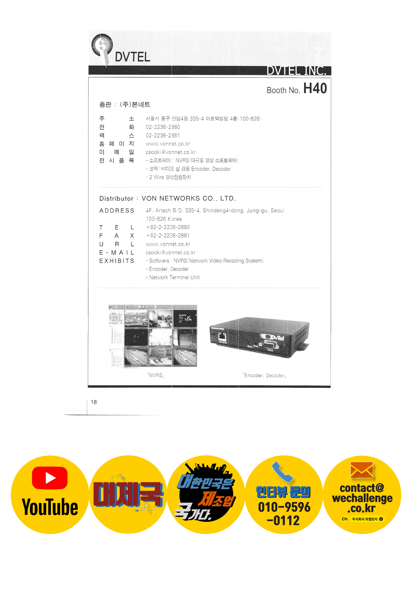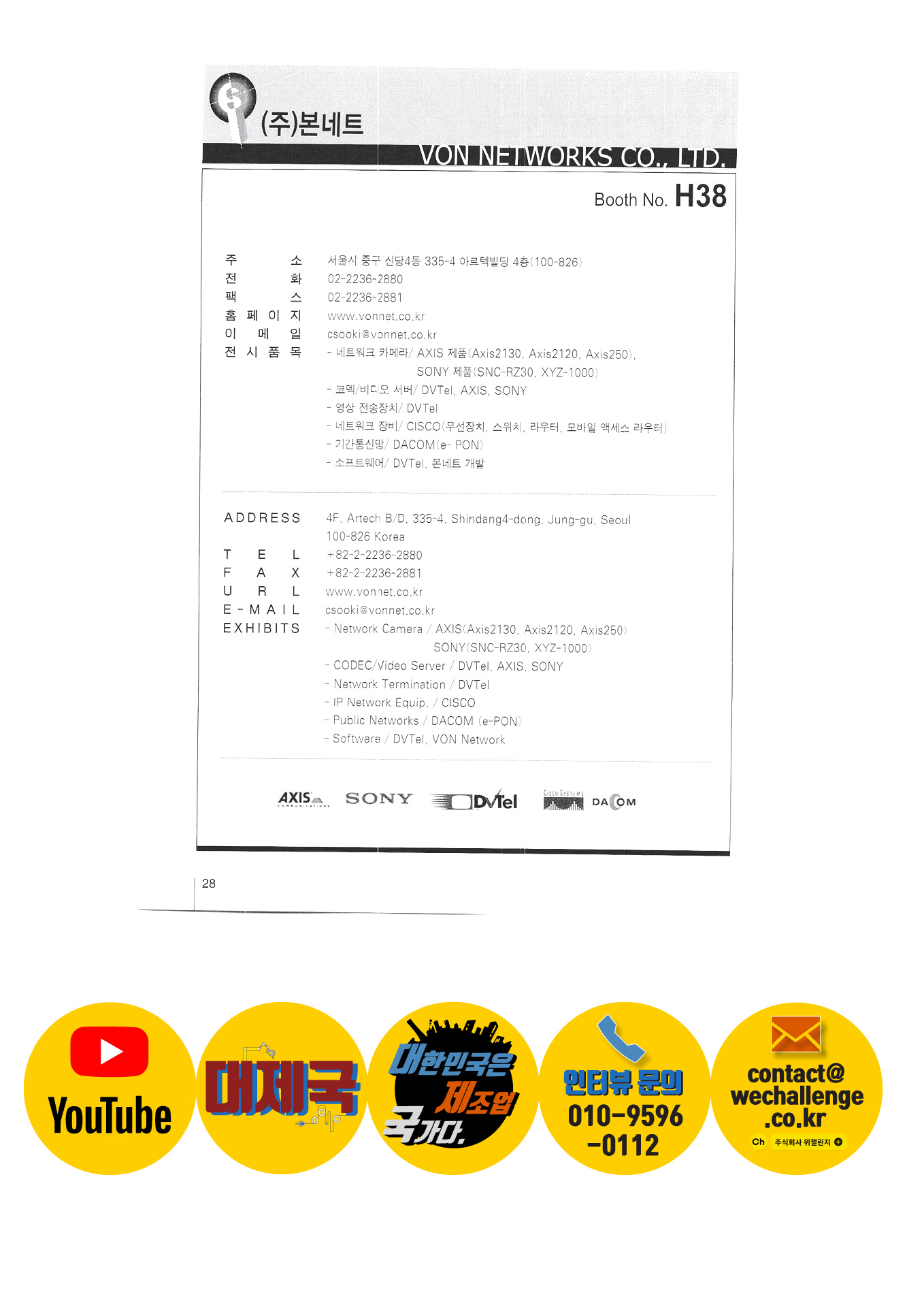 ㈜空間超越 ㈜灘テル ㈜ナウォンテック ノックアウトスターン㈜ ネットコーデック㈜ DVTEL INC ㈜ディジェント ㈜エディット情報技術 ㈜ラムパーステック ㈜晴れ技術 ㈜マルチビア ㈜未来テクノロジー ㈜ミコインターストリ BONA COMPUTECH CO。、LTD。 恩返し電子通信㈜ ㈜ボンネット 秘境システム㈜ ㈜ビクセル サムスンテックウォン㈜ 三洋データシステム㈜ ㈜センタービジョン ソニーコリア㈜ ㈜スターネックス ㈜シネクティクス ㈜シリウス シスマニア |