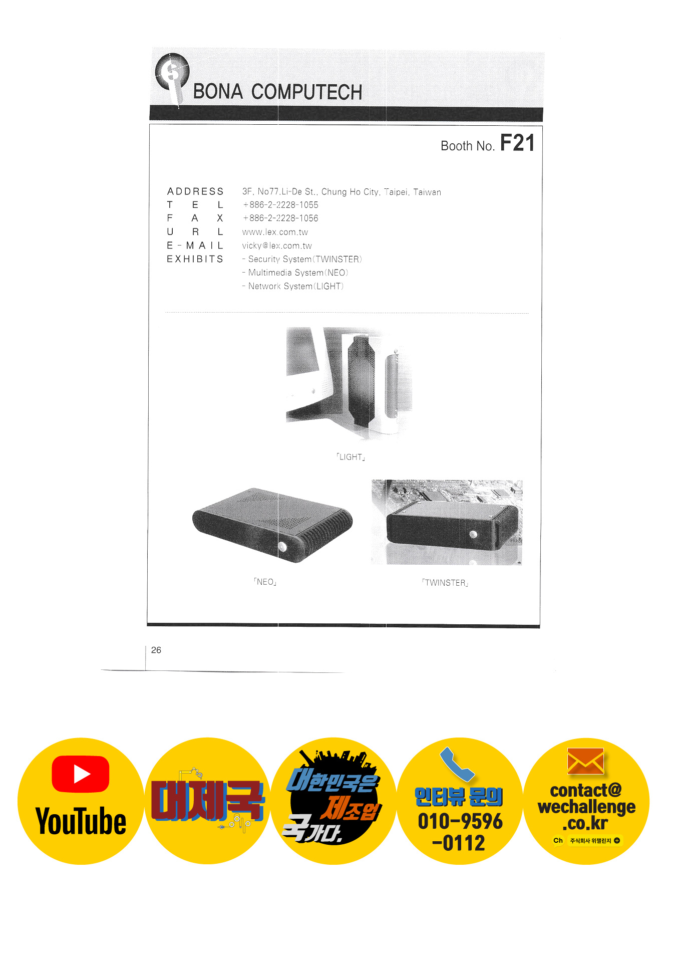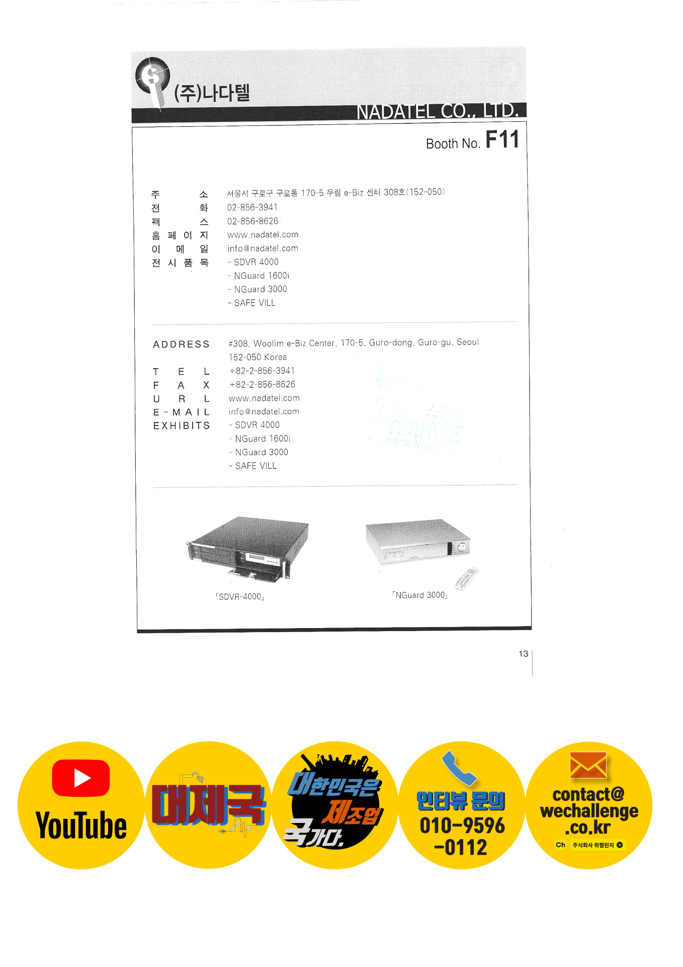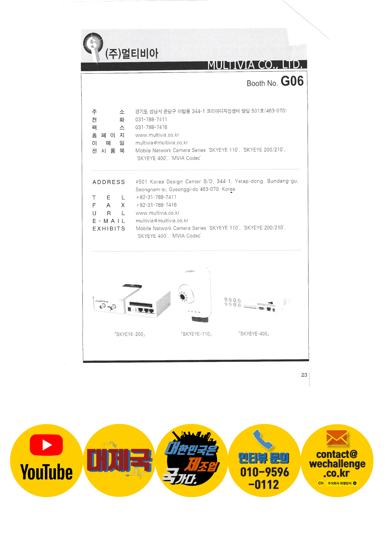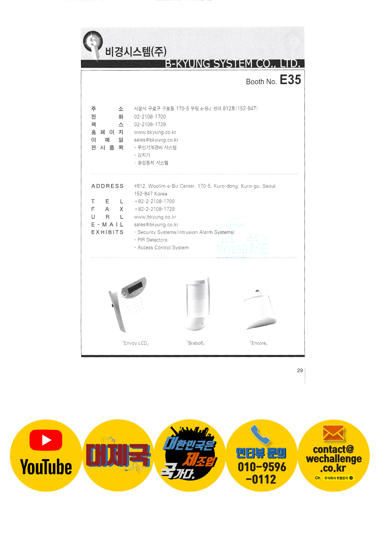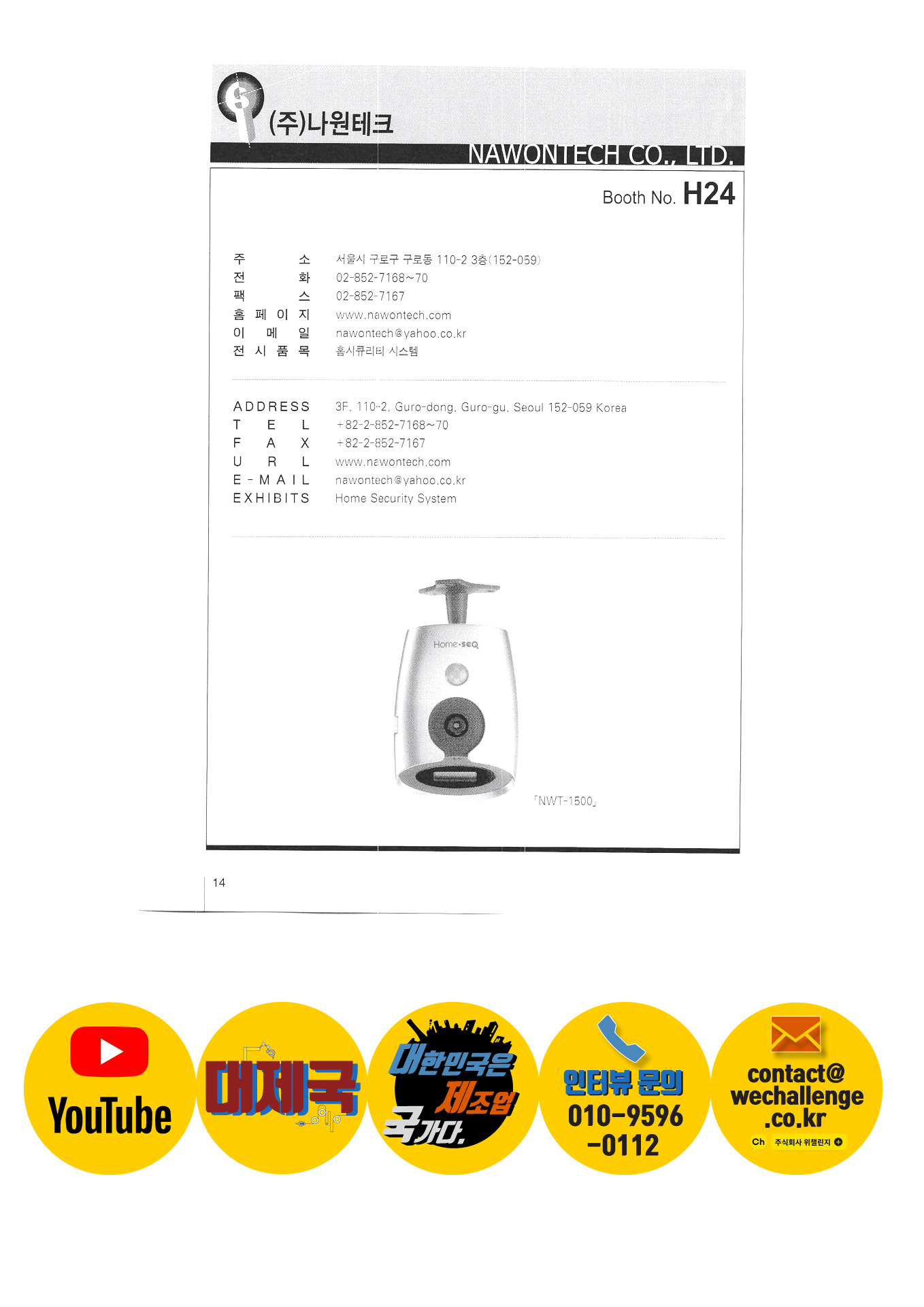 ㈜空間超越 ㈜灘テル ㈜ナウォンテック ノックアウトスターン㈜ ネットコーデック㈜ DVTEL INC ㈜ディジェント ㈜エディット情報技術 ㈜ラムパーステック ㈜晴れ技術 ㈜マルチビア ㈜未来テクノロジー ㈜ミコインターストリ BONA COMPUTECH CO。、LTD。 恩返し電子通信㈜ ㈜ボンネット 秘境システム㈜ ㈜ビクセル サムスンテックウォン㈜ 三洋データシステム㈜ ㈜センタービジョン ソニーコリア㈜ ㈜スターネックス ㈜シネクティクス ㈜シリウス シスマニア |
