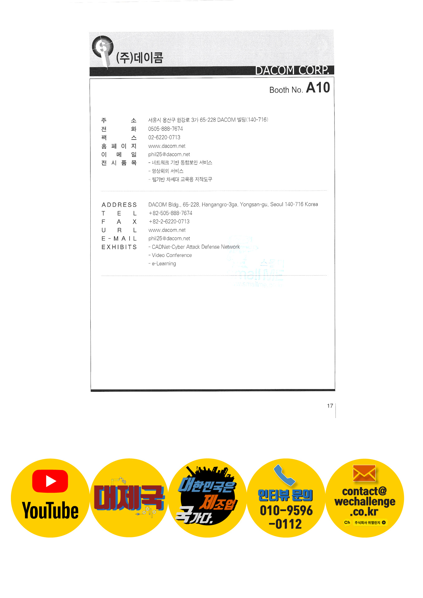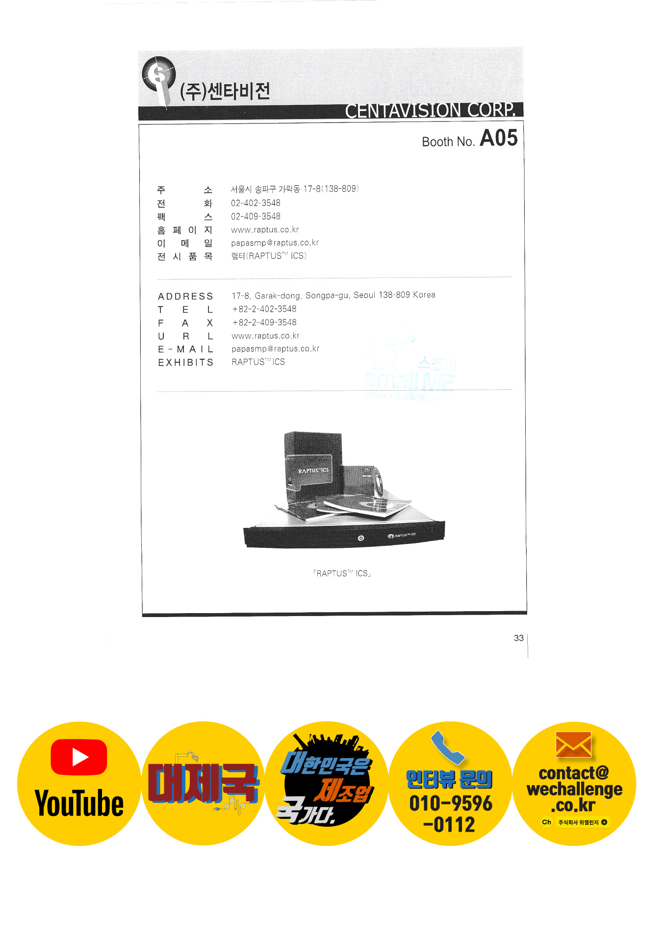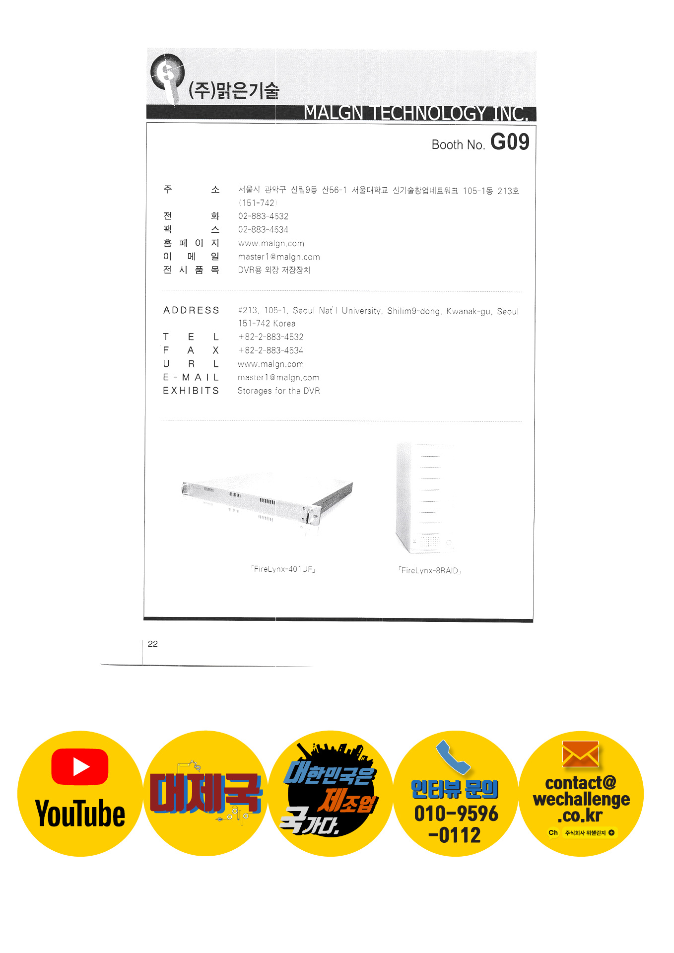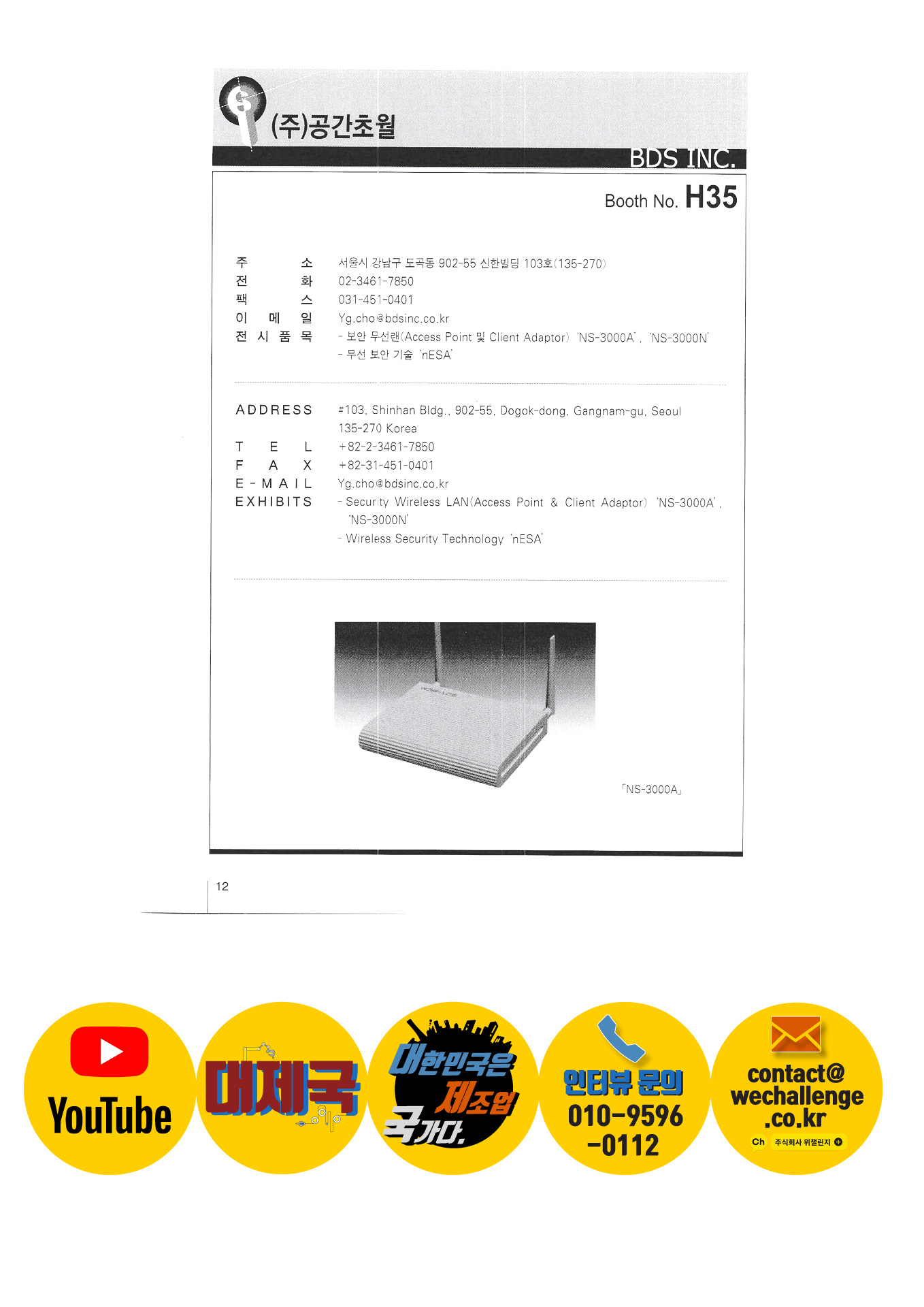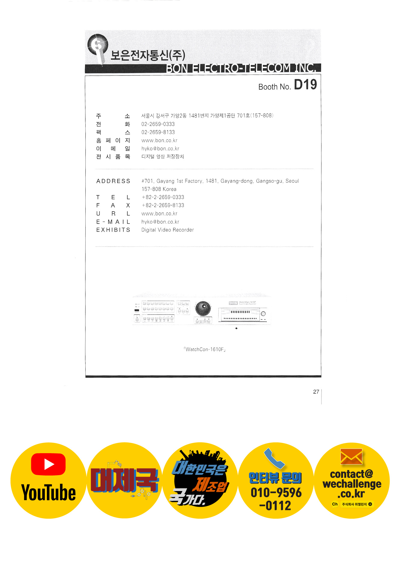 ㈜空間超越 ㈜灘テル ㈜ナウォンテック ノックアウトスターン㈜ ネットコーデック㈜ DVTEL INC ㈜ディジェント ㈜エディット情報技術 ㈜ラムパーステック ㈜晴れ技術 ㈜マルチビア ㈜未来テクノロジー ㈜ミコインターストリ BONA COMPUTECH CO。、LTD。 恩返し電子通信㈜ ㈜ボンネット 秘境システム㈜ ㈜ビクセル サムスンテックウォン㈜ 三洋データシステム㈜ ㈜センタービジョン ソニーコリア㈜ ㈜スターネックス ㈜シネクティクス ㈜シリウス シスマニア |