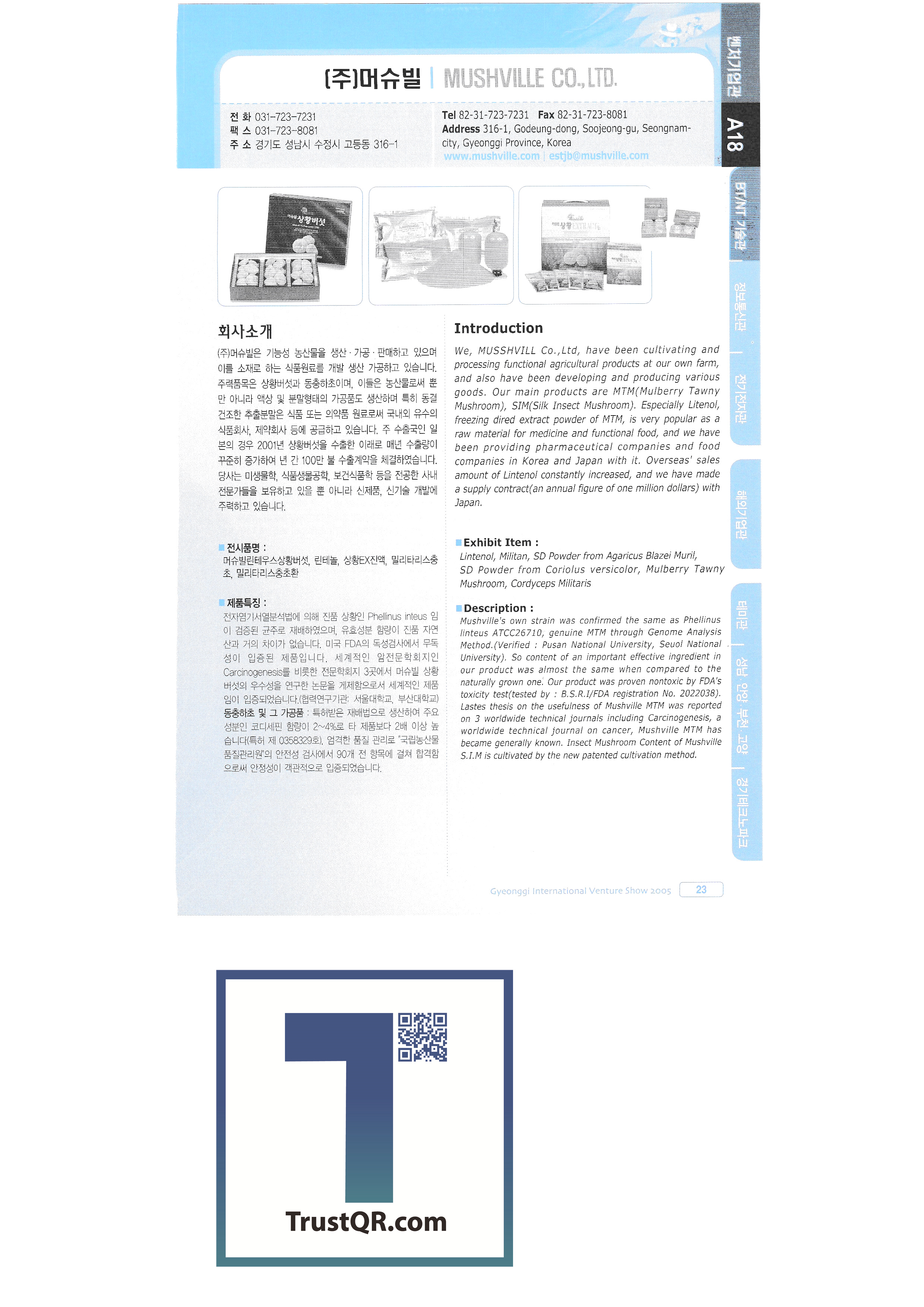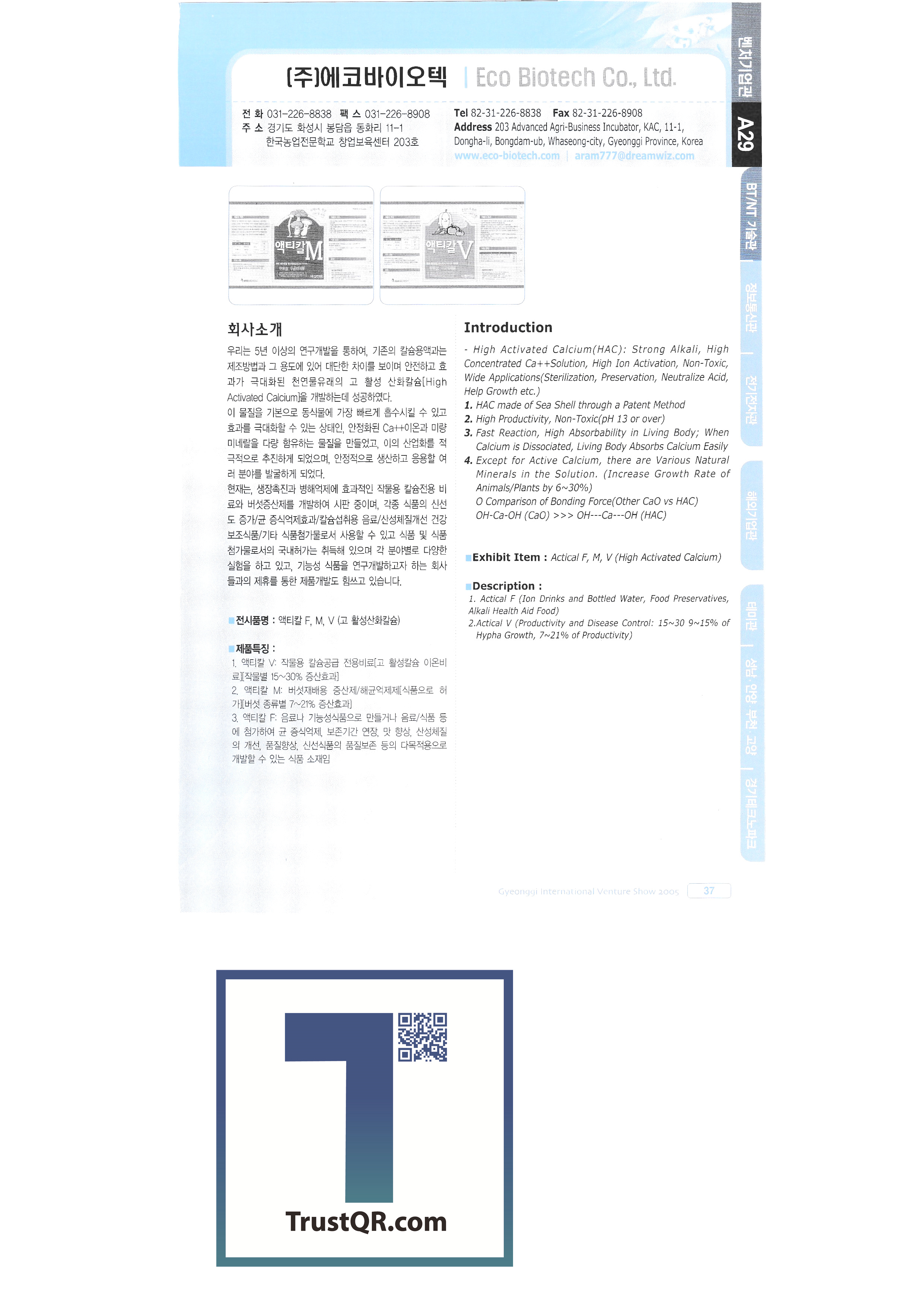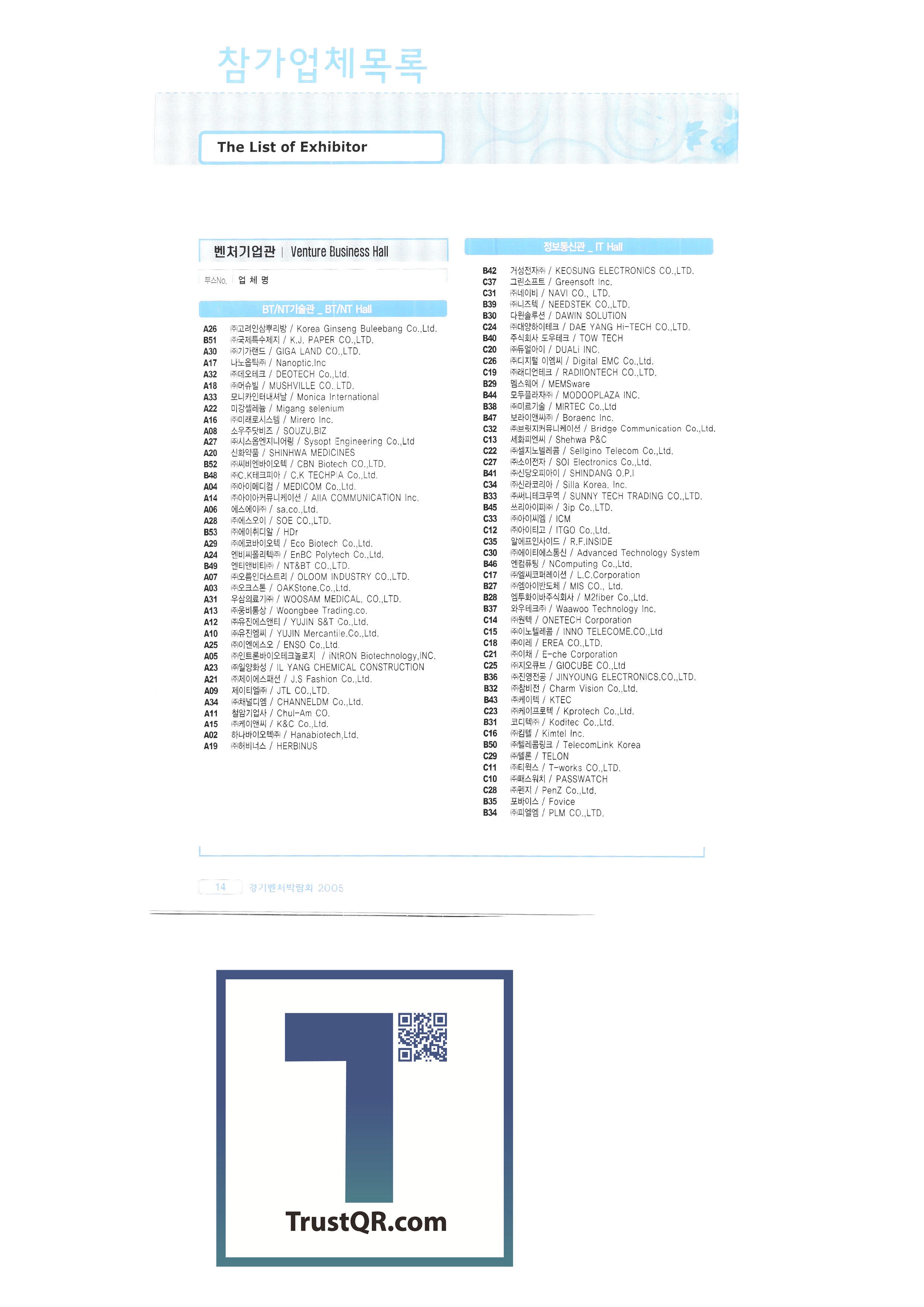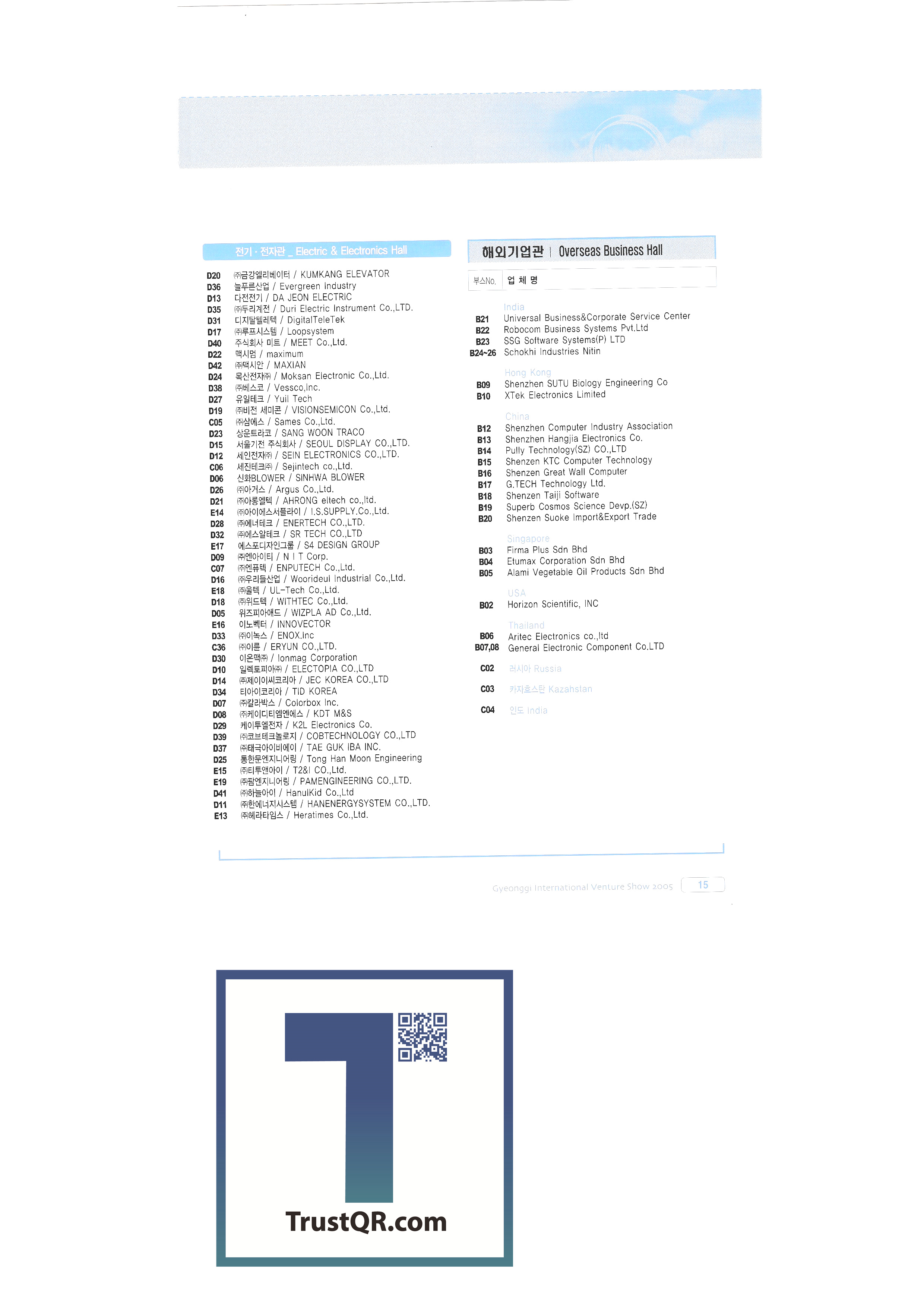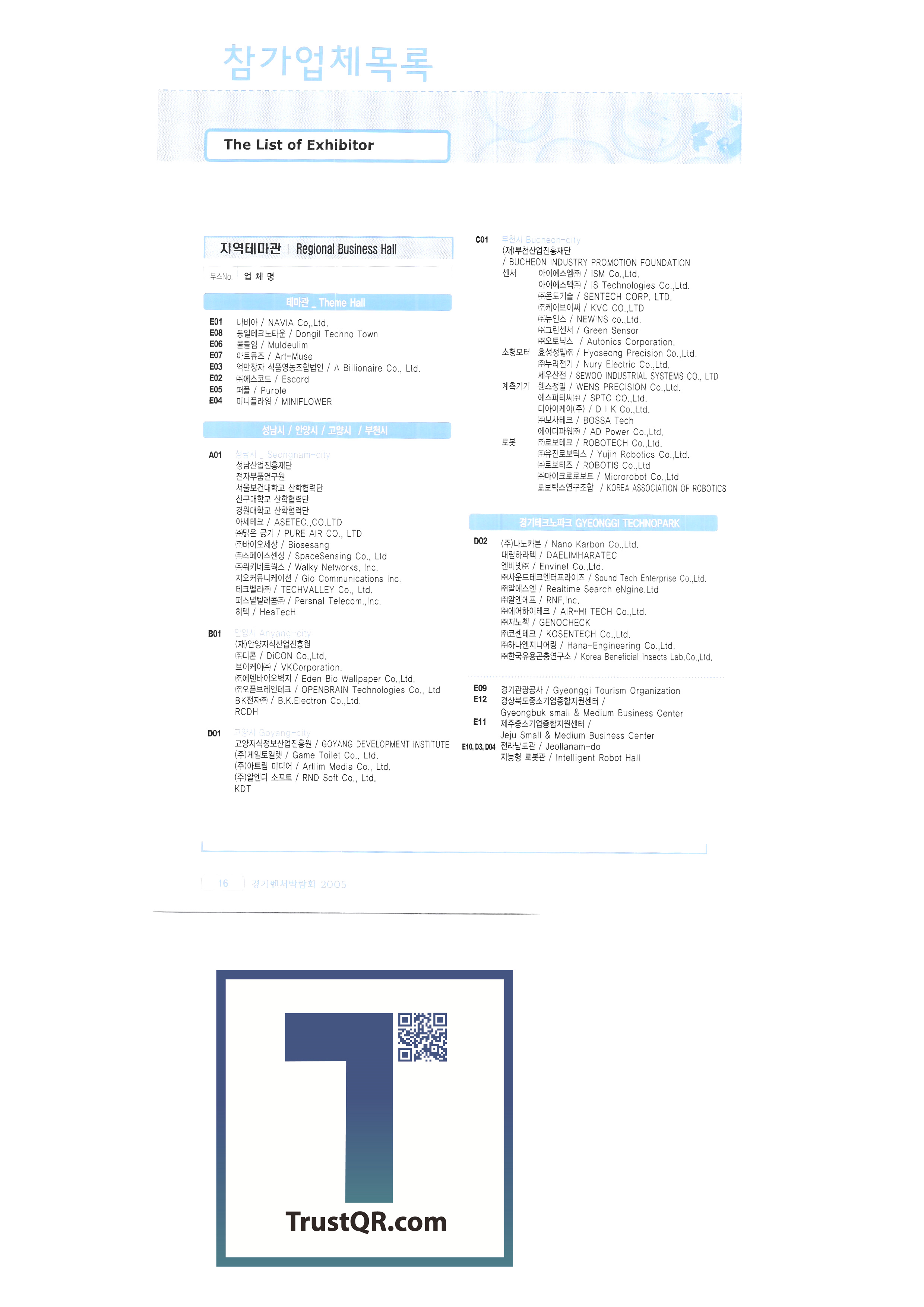 Korea Ginseng Root Room Kukje Special Paper Co., Ltd. Giga Land Co., Ltd. Nano Optics Co., Ltd. Deo Tech Mershville Monica International Rice bran selenium Miraero System Co., Ltd. Microcosm Dot Beads Sysop Engineering Co., Ltd. Shinhwa Pharmaceutical CBN Biotech Co., Ltd. C.K Techpia IMedicom IA Communication SA Co., Ltd. SOE HdR Co., Ltd. Eco Biotech Co., Ltd. NC Polytech Co., Ltd. NT&BT Oreum Industry Co., Ltd. Oakstone Co., Ltd. Woosam Medical Co., Ltd. Woongbi Trade Co., Ltd. Eugene S&T Eugene MC |