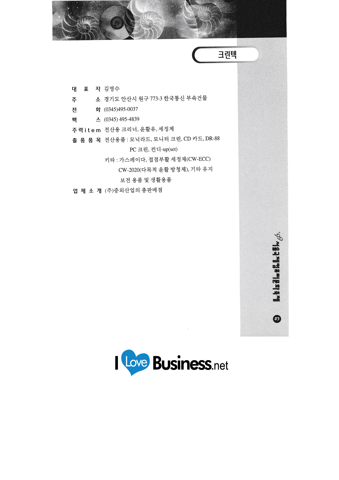 | 인터넷경매 인포웨이브코리아 조양정보통신 중앙전자&출판 지티엔터프라이즈 진성솔루션 첨단공학소프트연구소 청강문화산업대학 청구전산시스템 충청대학 캐릭터뱅크 캐릭터코리아 크린텍 필로스 하나교역 한국산업디자인진흥원 한국석유공사 한국아이소테크 한마음 캐드컴 한마음소프트 한양대 현대증권 한컴교육나라 |