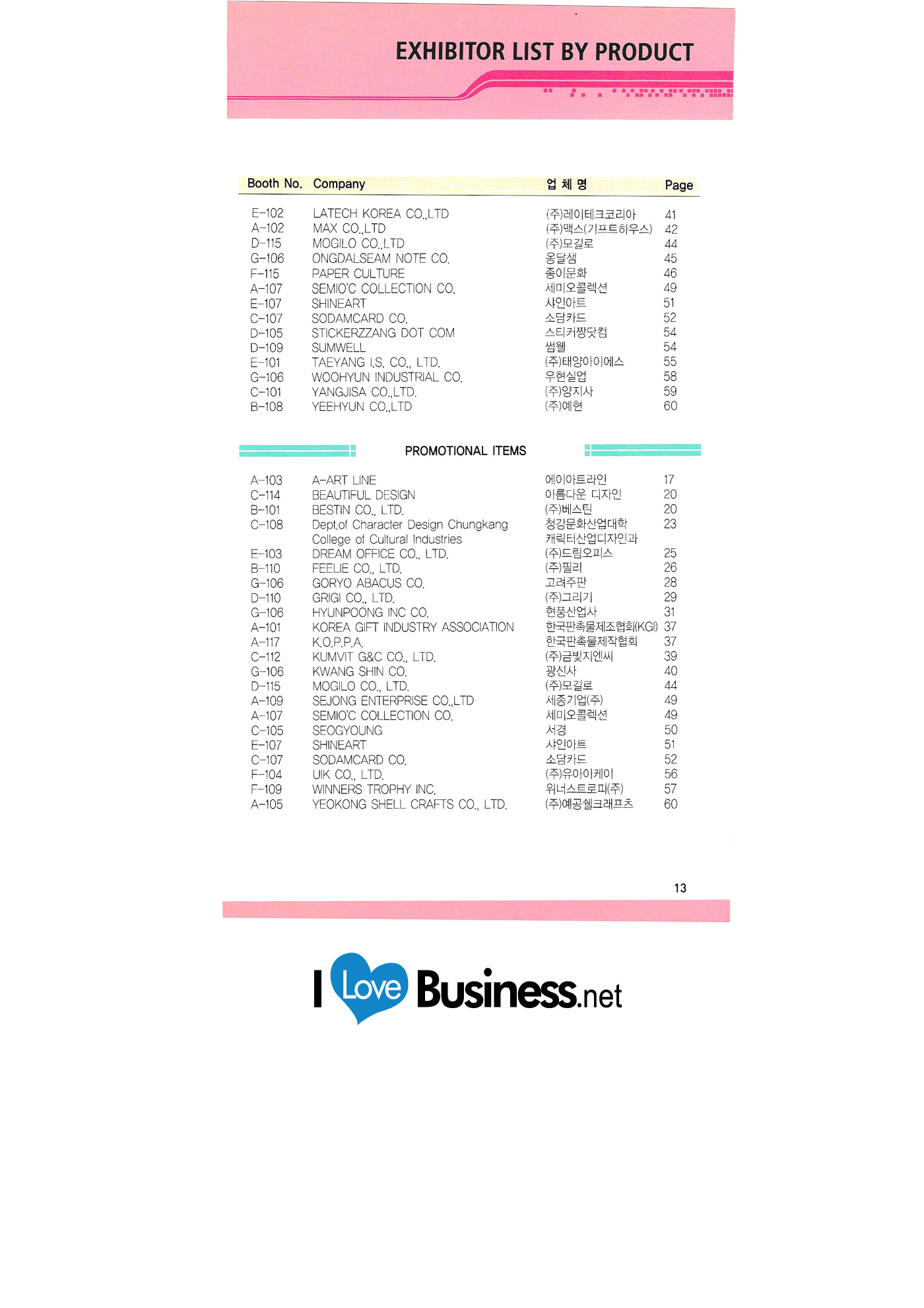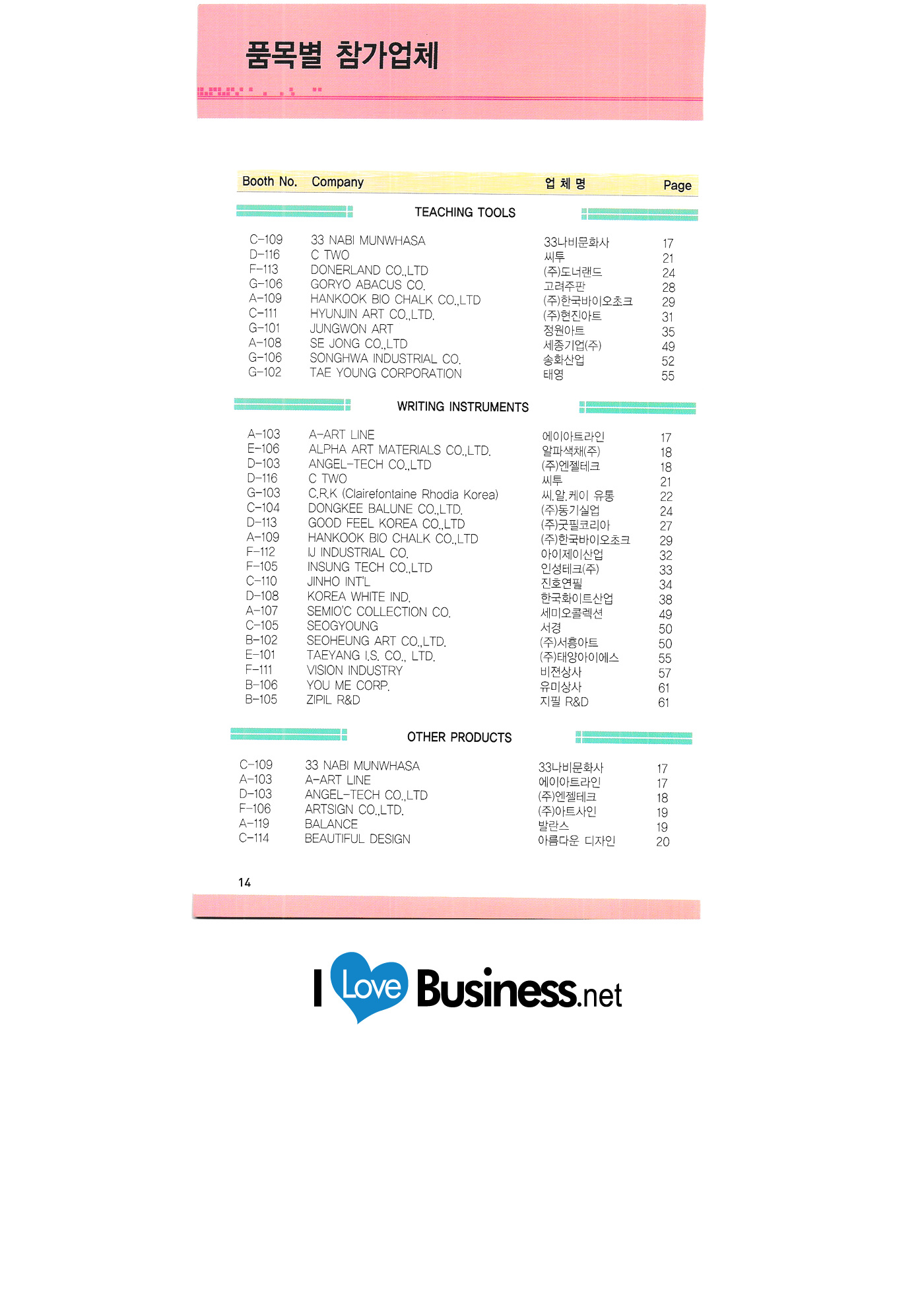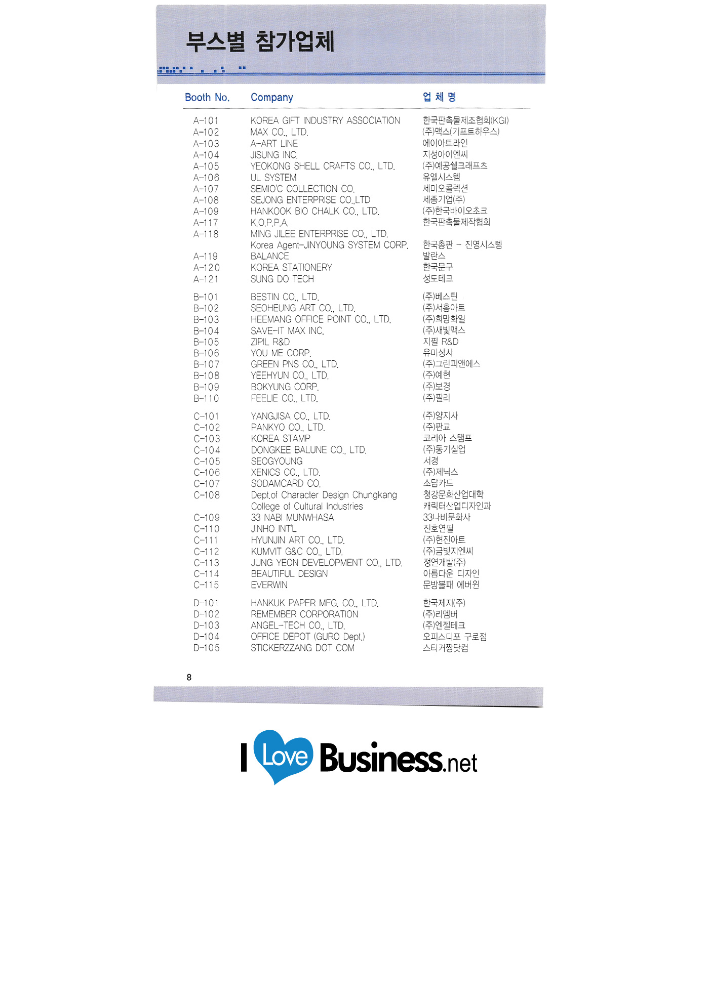 | 33나비문화사 에이아트라인 알파색채㈜ ㈜엔젤테크 ㈜아트사인 발란스 아름다운 디자인 ㈜베스틴 ㈜보경 씨투 씨.알.케이 유통 창신정밀공업사 ㈜코엑스 청강문화산업대학 캐릭터산업디자인과 ㈜도너랜드 ㈜동기실업 ㈜드림오피스 ㈜이랄라 인터내셔날 문방불패 에버윈 ㈜필리 ㈜건화지기 ㈜굿필코리아 고려주판 ㈜그린피앤에스 ㈜그리기 ㈜한국바이오초크 한국제지㈜ ㈜희망화일 ㈜현진아트 현풍산업사 아이제이산업 인드림텍 인성테크㈜ 장군사 |
