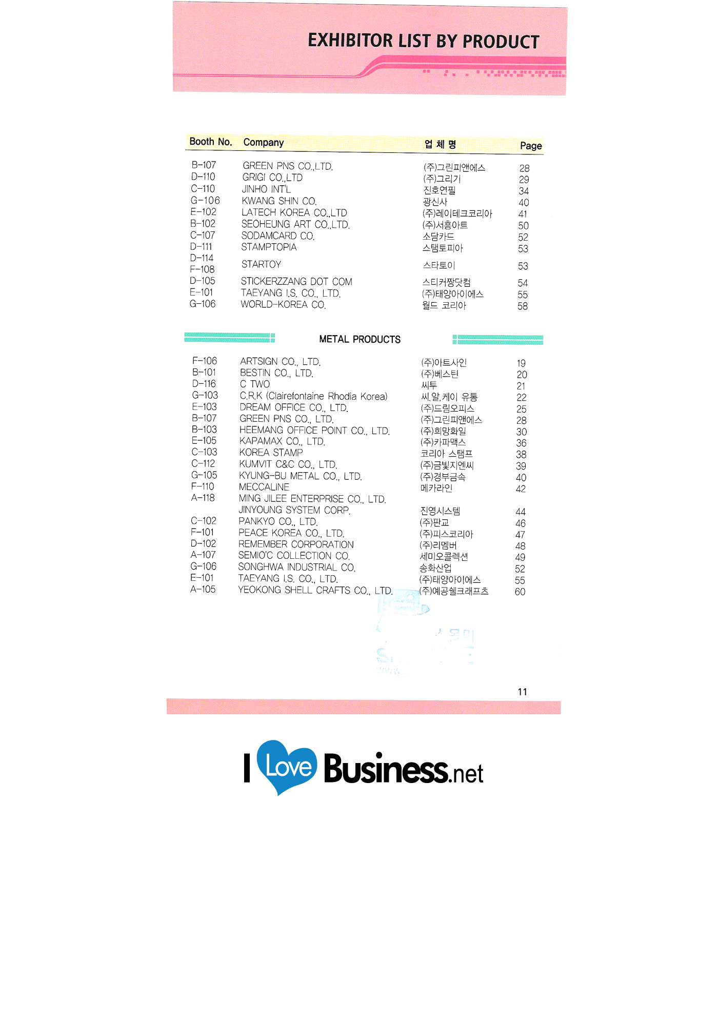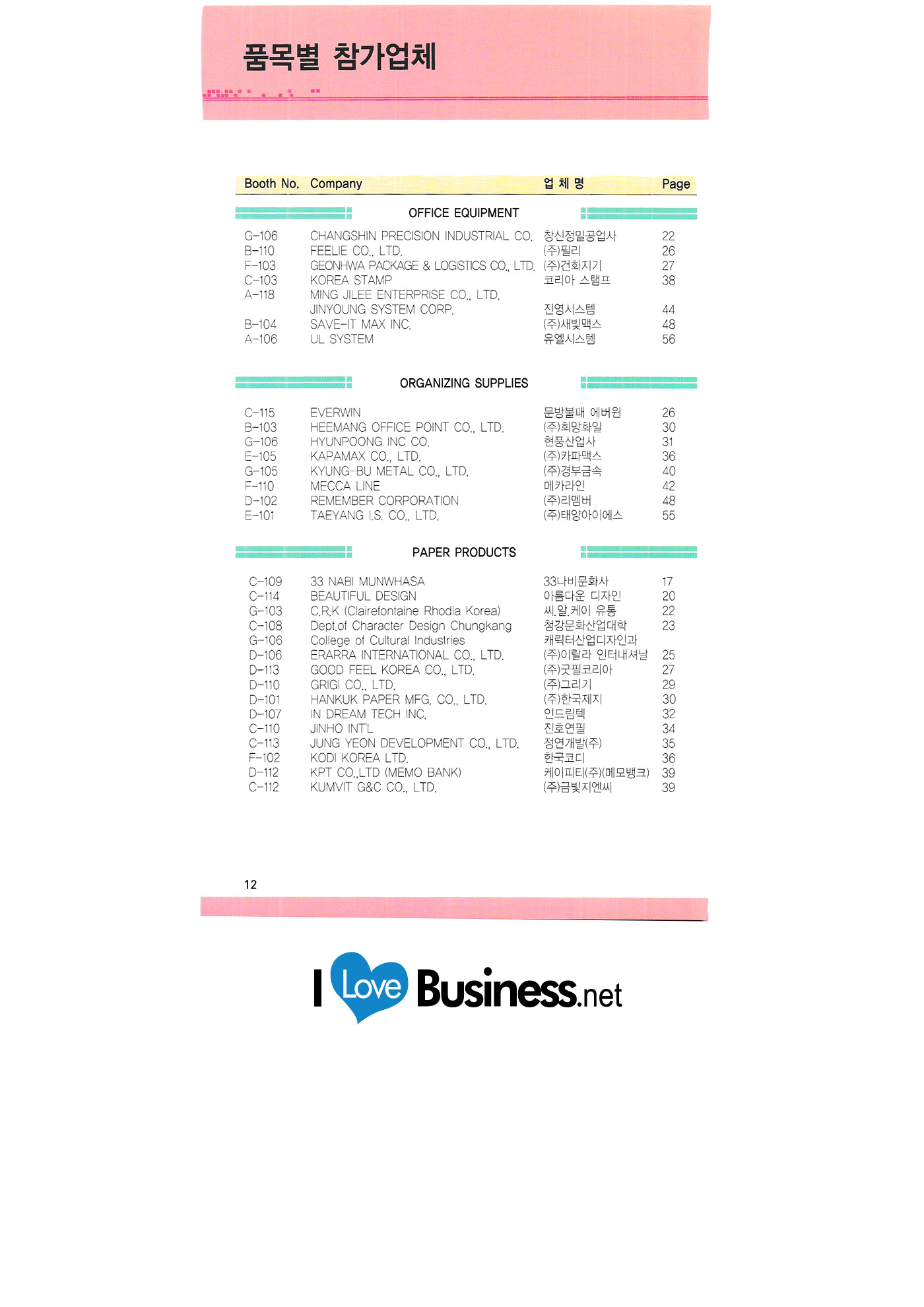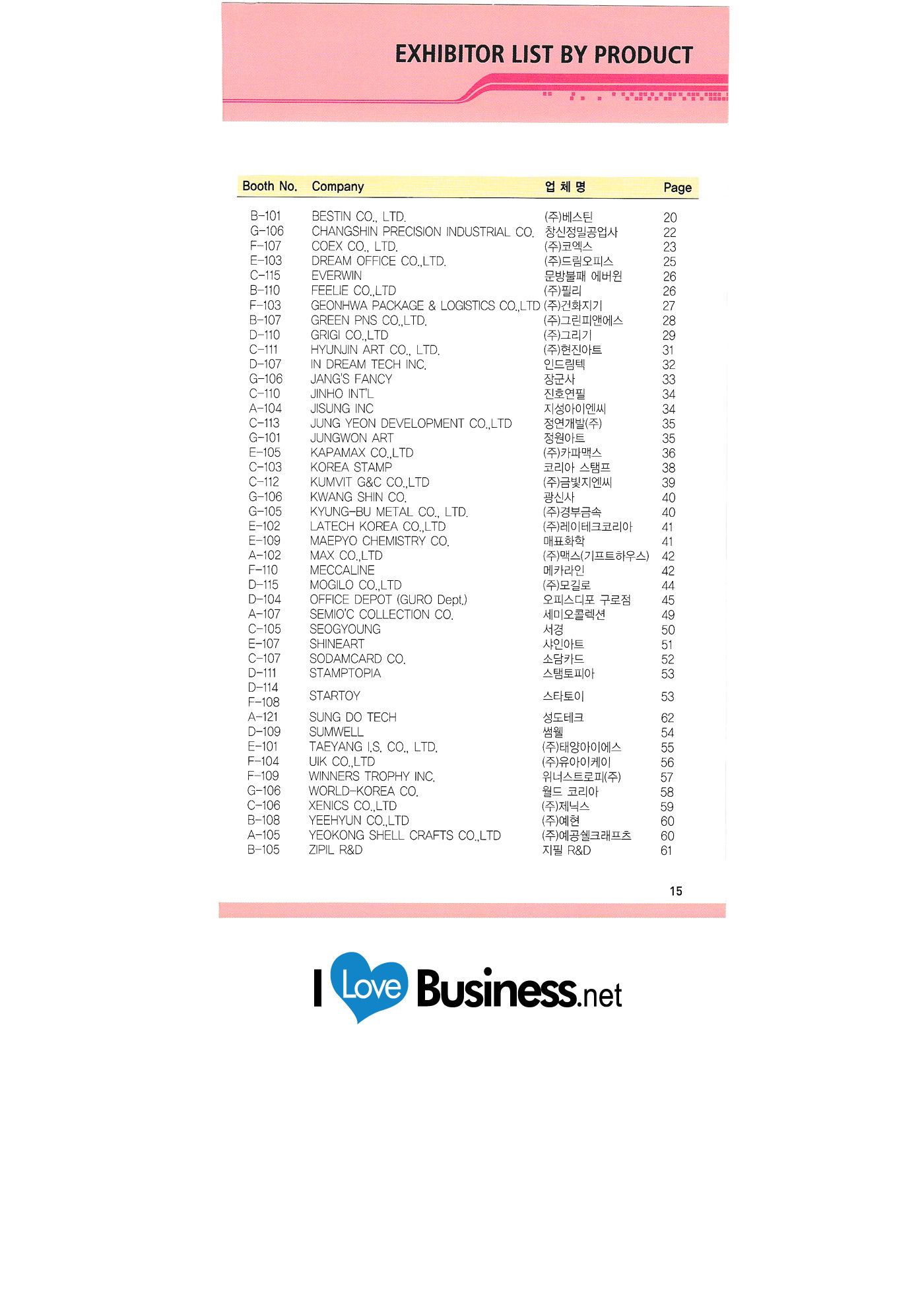 | 33나비문화사 에이아트라인 알파색채㈜ ㈜엔젤테크 ㈜아트사인 발란스 아름다운 디자인 ㈜베스틴 ㈜보경 씨투 씨.알.케이 유통 창신정밀공업사 ㈜코엑스 청강문화산업대학 캐릭터산업디자인과 ㈜도너랜드 ㈜동기실업 ㈜드림오피스 ㈜이랄라 인터내셔날 문방불패 에버윈 ㈜필리 ㈜건화지기 ㈜굿필코리아 고려주판 ㈜그린피앤에스 ㈜그리기 ㈜한국바이오초크 한국제지㈜ ㈜희망화일 ㈜현진아트 현풍산업사 아이제이산업 인드림텍 인성테크㈜ 장군사 |