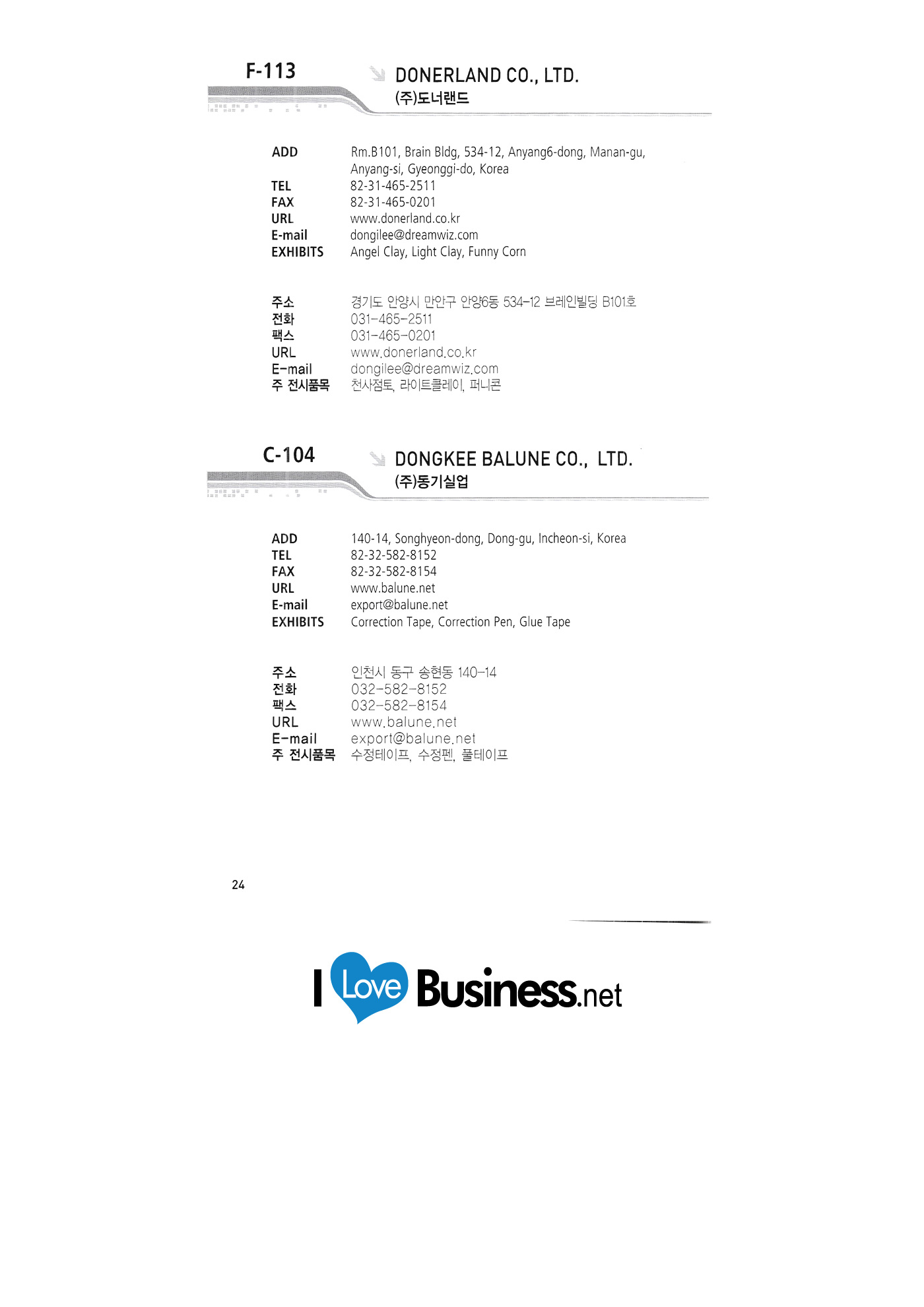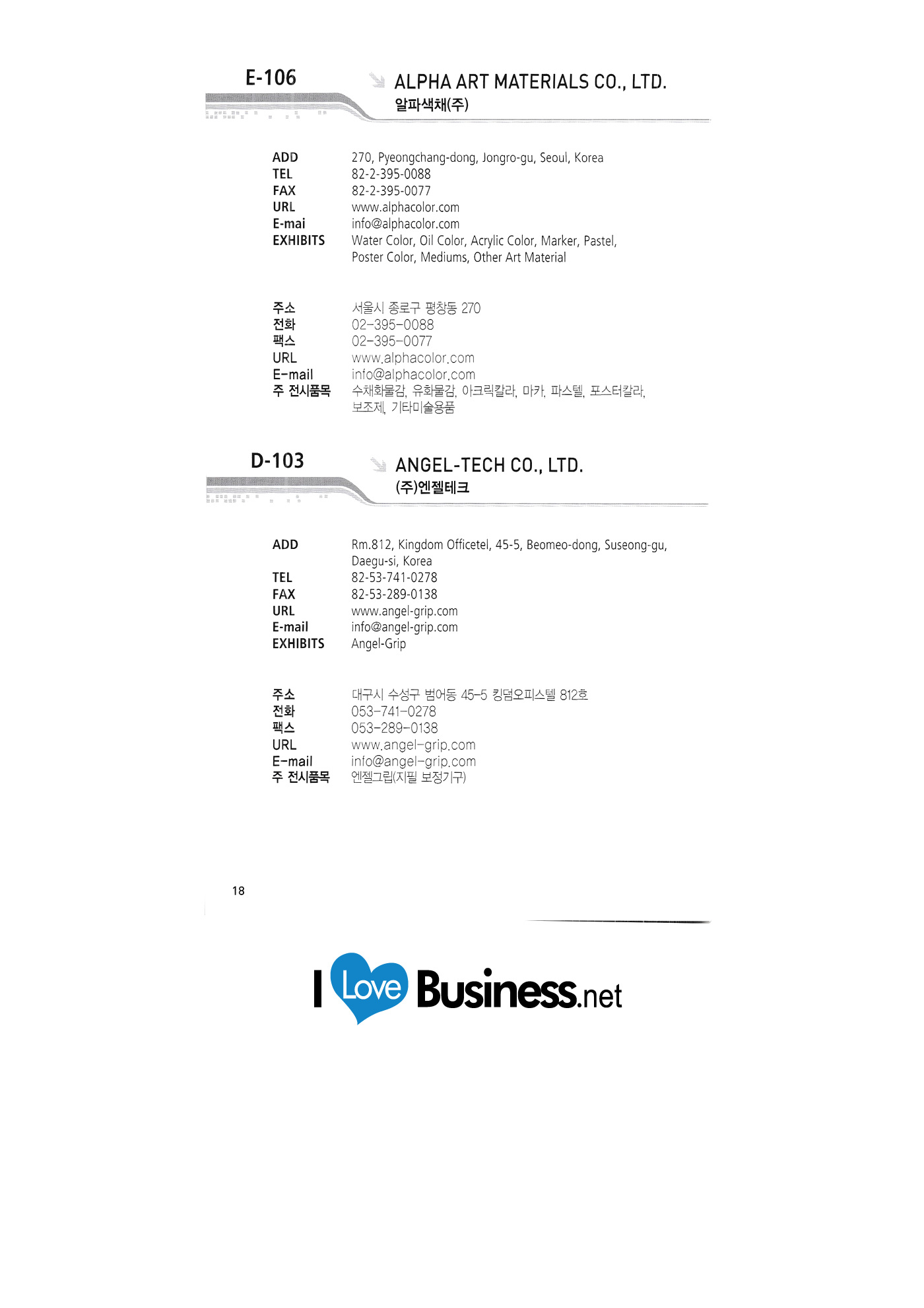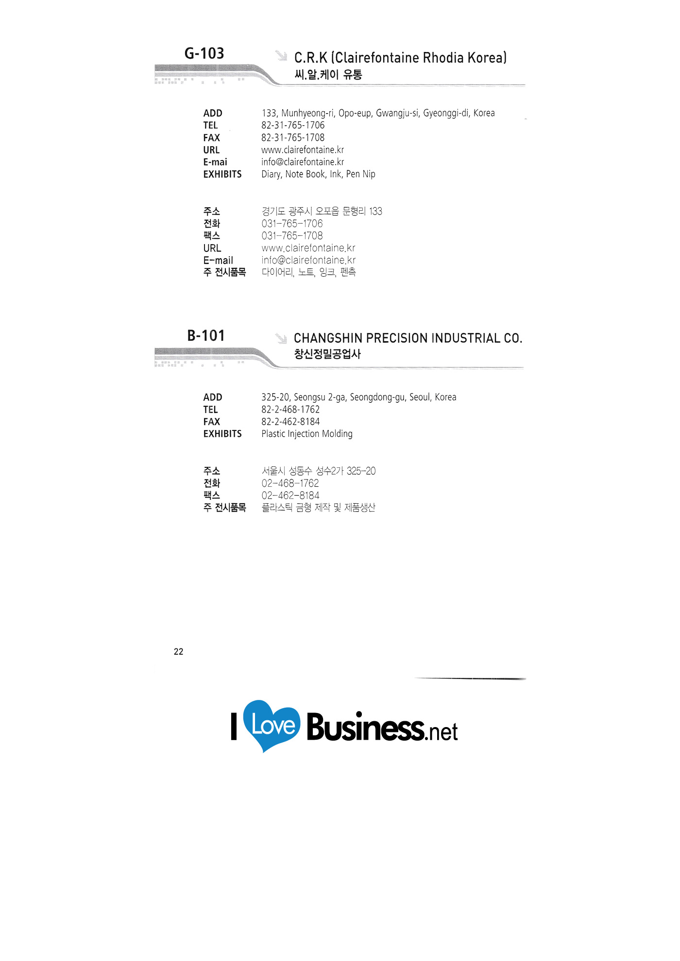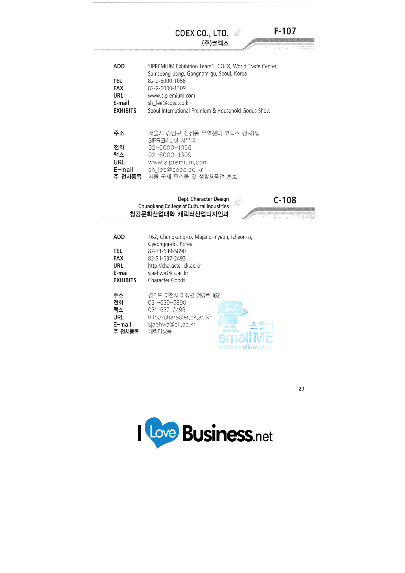 33Butterfly Culture History A Art Line Alpha Color Co., Ltd. Angel Tech Co., Ltd. Art Sign Co., Ltd. balance Beautiful design Vestin Co., Ltd. Bokyung Co., Ltd. C2 C. R. K distribution Changshin Precision Industry COEX Chunggang University of Culture and Industry, Character Industry Design Department Doner Land Co., Ltd. Donggi Industrial Co., Ltd. Dream Office Co., Ltd. Irala International Co., Ltd. Everwin Philly Co., Ltd. Kunhwa Machine Co., Ltd. Good Feel Korea Co., Ltd. Goryeo Abacus Green P&S Drawing Co., Ltd. Korea Biochoke Co., Ltd. Hankuk Paper Co., Ltd. Hope File Co., Ltd. Hyunjin Art Co., Ltd. Hyeonpoong Industrial Company IJ Industry Indreamtech Insung Tech Co., Ltd. General |
