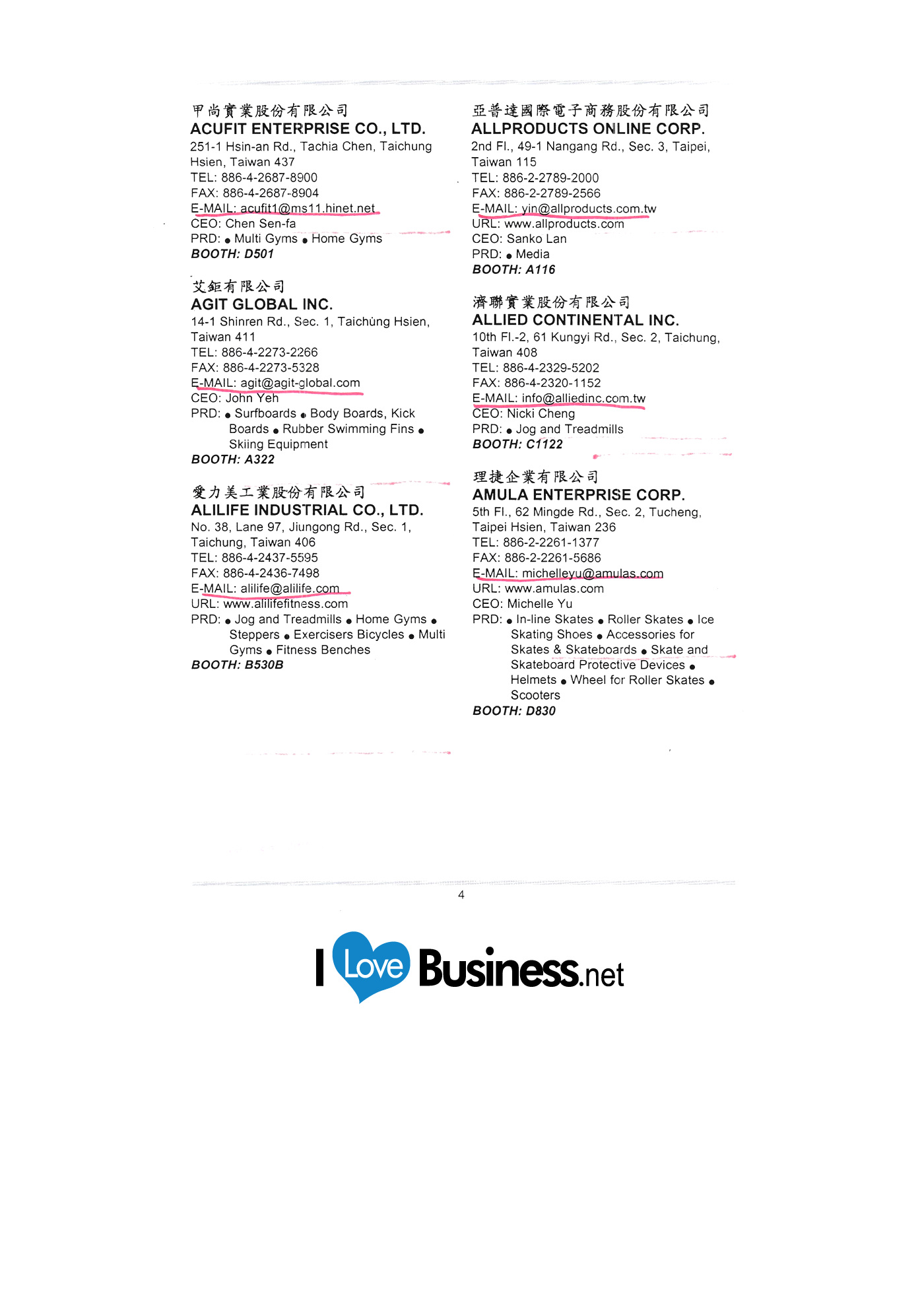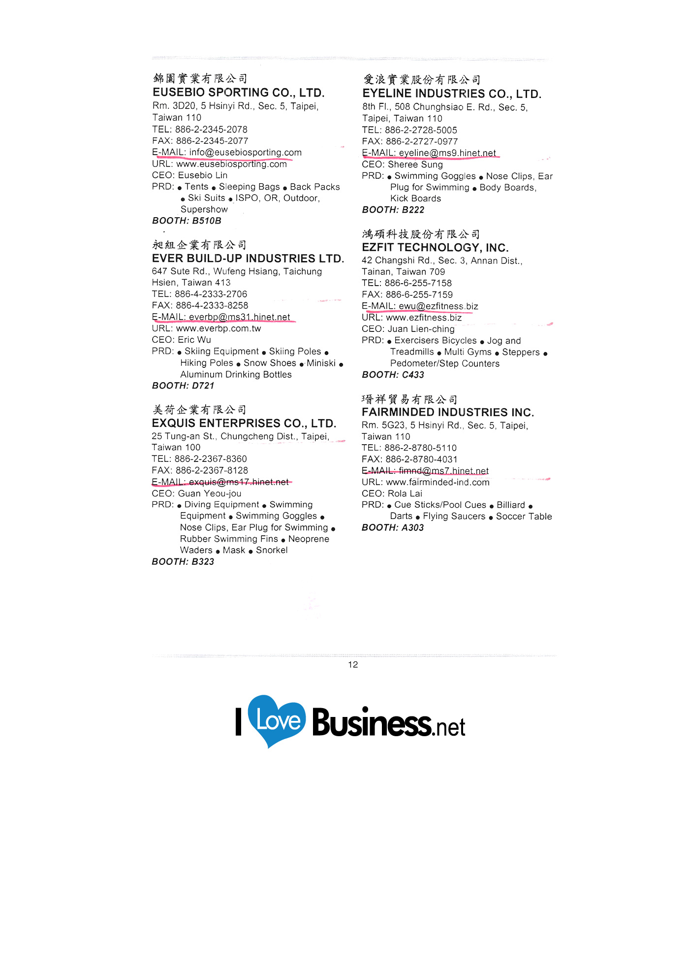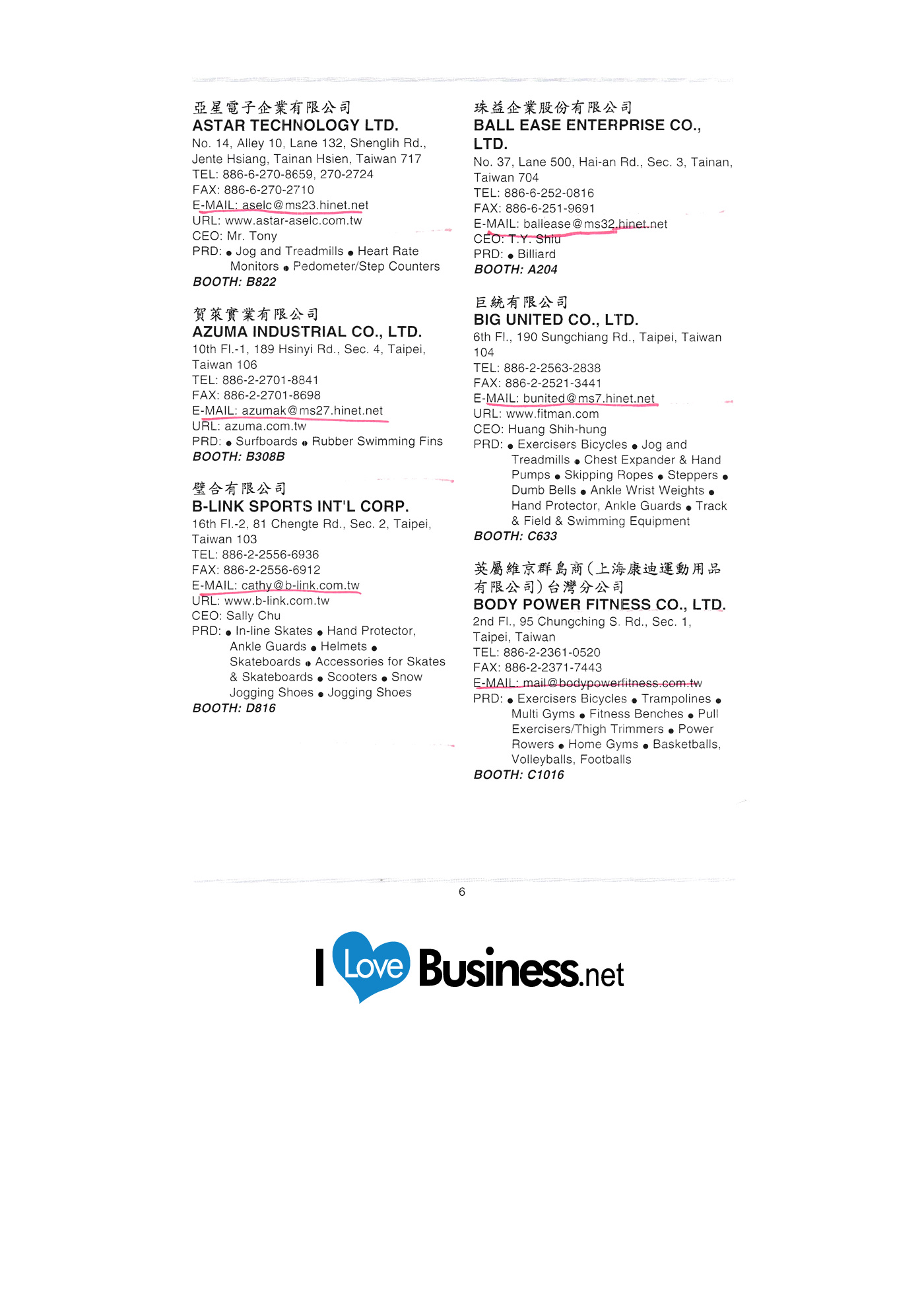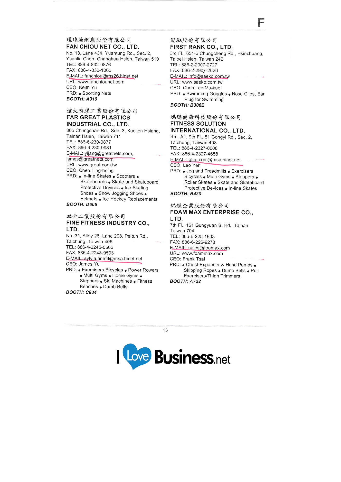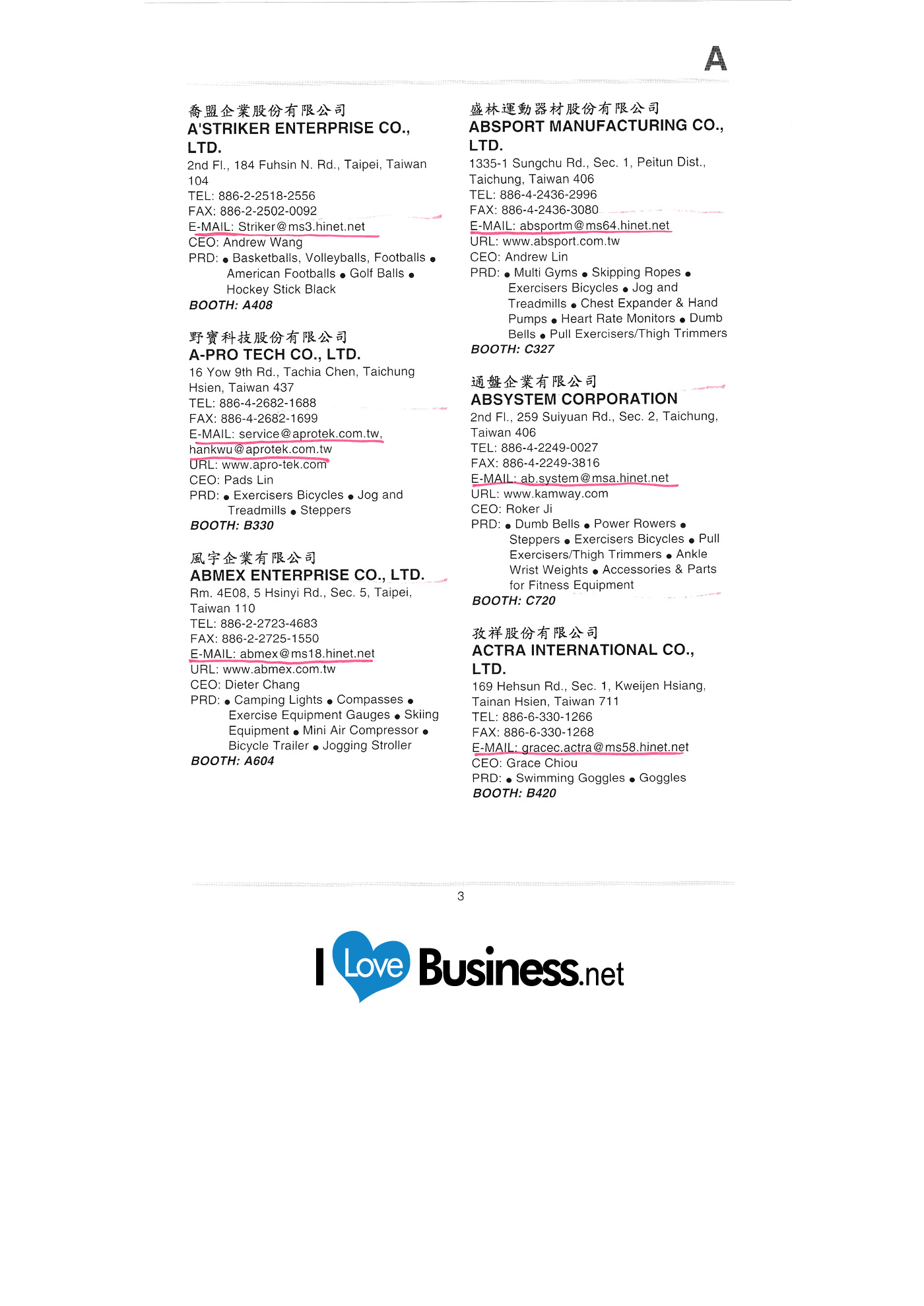 A'STRIKER ENTERPRISE CO.,LTD. A-PRO TECH CO.,LTD. ABMEX ENTERPRISE CO.,LTD. ABSPORT MANUFACTURING CO.,LTD. ABSYSTEM CORPORATION ACTRA INTERNATIONAL CO.,LTD. ACUFIT ENTERPRISE CO.,LTD. AGIT GLOBAL INC. ALILIFE INDUSTRIAL CO.,LTD. ALLPRODUCTS ONLINE CORP. ALLIED CONTINENTAL INC. AMULA ENTERPRISE CORP. ANCORE-CHIOU ENT CO.,LTD. ARAB-ASIAN TRADE ARMORTECH INDUSTRIES CO.,LTD. ARNE K.H WANG GRAPHITE INTERNATIONAL CO.,LTD. AROPEC SPORTS CORP. ASIA BUSINESS ASTAR TECHNOLOGY LTD. AZUMA INDUSTRIAL CO.,LTD. B-LINK SPORTS INT'L CORP. BALL EASE ENTERPRISE CO.,LTD. BIG UNITED CO.,LTD. BODY POWER FITNESS CO.,LTD. BONNY SPORTS CORP. BUILD RAY ENTERPRISE CO.,LTD. CAMPACK - TENT INDUSTRIAL CO.,LTD. CASTLE SPORTING ENTERPRISE CO.,LTD. CHANG YOW INDUSTRY CO.,LTD. CHERG LE INDUSTRY CO. CHERNG YEAR ENTERPRISE CO.,LTD. CHI MENG INDUSTRY CO.,LTD. CHIA TING FOUNDRIES CO.,LTD. CHILIN ELECTRONICS CO.,LTD. CHIN TE WANG INDUSTRIAL CO.,LTD. CHINA ECONOMIC NEWS SERVICE CIAN CHIANG INDUSTRY CO.,LTD. D- MASTER UNIVERSAL CORP. DAN YU SPORTS CO.,LTD. DANKEN ENTERPRISE CO.,LTD. DEEYANG CO.,LTD. DIAMOND HOUSE INT'L INC. DIBAR GROUPS ENTERPRISE CO.,LTD. DIRECTION TECHNOLOGY CO.,LTD. DUTECK INDUSTRIAL CO.,LTD. DYACO INT'L INC. E-NENG TECH ENTERPRISE CO.,LTD. E.J LUCAS INDUSTRIAL CORP. EAGLES INDUSTRIES CORP.,LTD. ECHOWELL ELECTRONICS CO.,LTD. ELEGANT UNION INDUSTRIAL CO.,LTD. ENERGY STAR CO.,LTD. ERADIATE ENTERPRISE CO.,LTD. EULIA ENTERPRISE CO.,LTD. EUSEBIO SPORTING CO.,LTD. EVER BUILD-UP INDUSTRIES LTD. KEXQUIS ENTERPRISES CO.,LTD. EYELINE INDUSTRIES CO.,LTD. EZFIT TECHNOLOGY, INC. FAIRMINDED INDUSTRIES INC. FAN CHIOU NET CO.,LTD. FAR GREAT PLASTICS INDUSTRIAL CO.,LTD. FINE FITNESS INDUSTRY CO.,LTD. FIRST RANK CO.,LTD. FITNESS SOLUTION INTERNATIONAL CO.,LTD. FOAM MAX ENTERPRISE CO.,LTD. FORHOUSE CORPORATION FREESPORT CORP. FULLYEAR-BROTHER ENT.CO.,LTD. G.PULSE INETERNATIONAL CO.,LTD. GC KEAN SYNTHETICS INC. GEE HOO INDUSTRIAL CORP. |