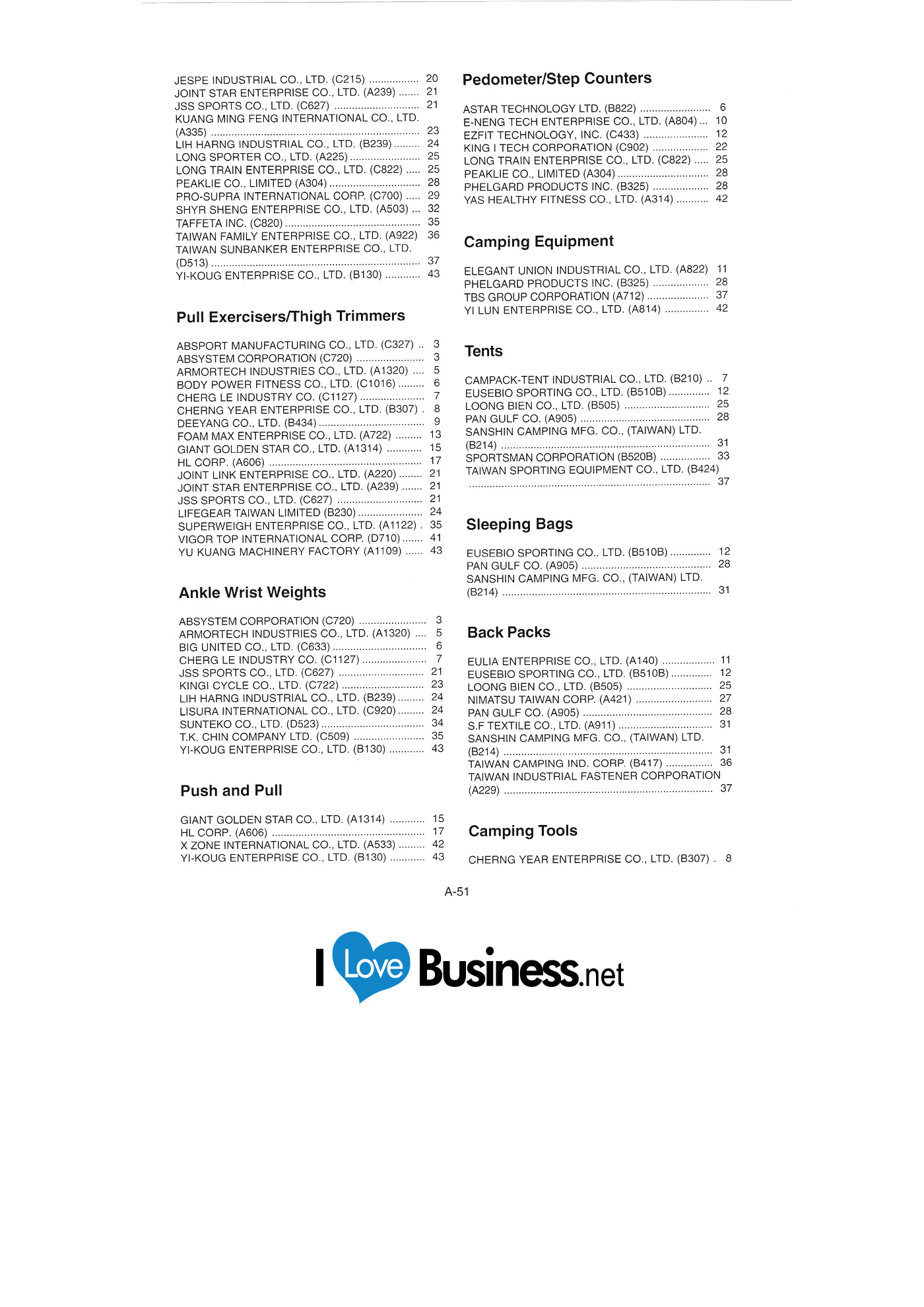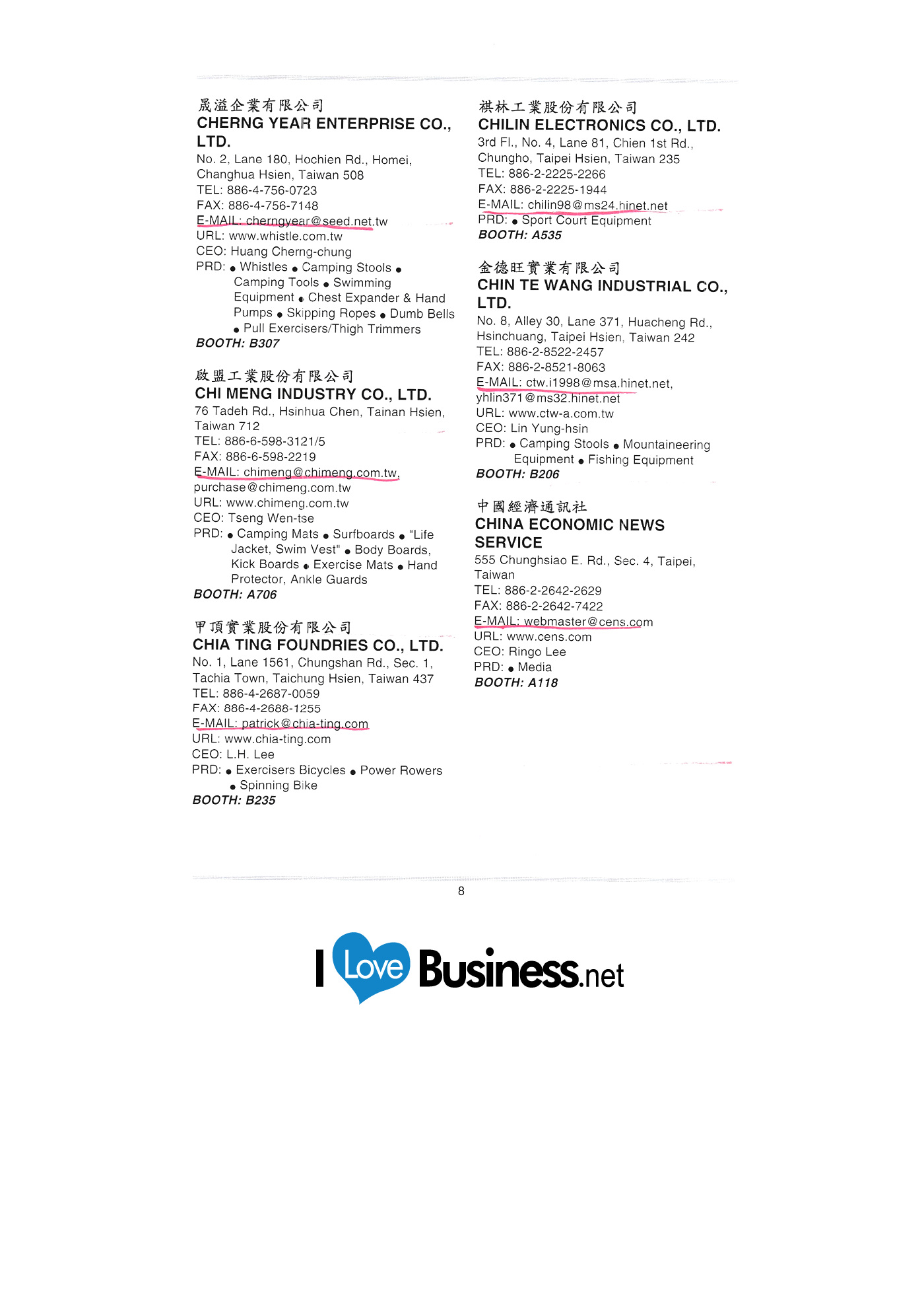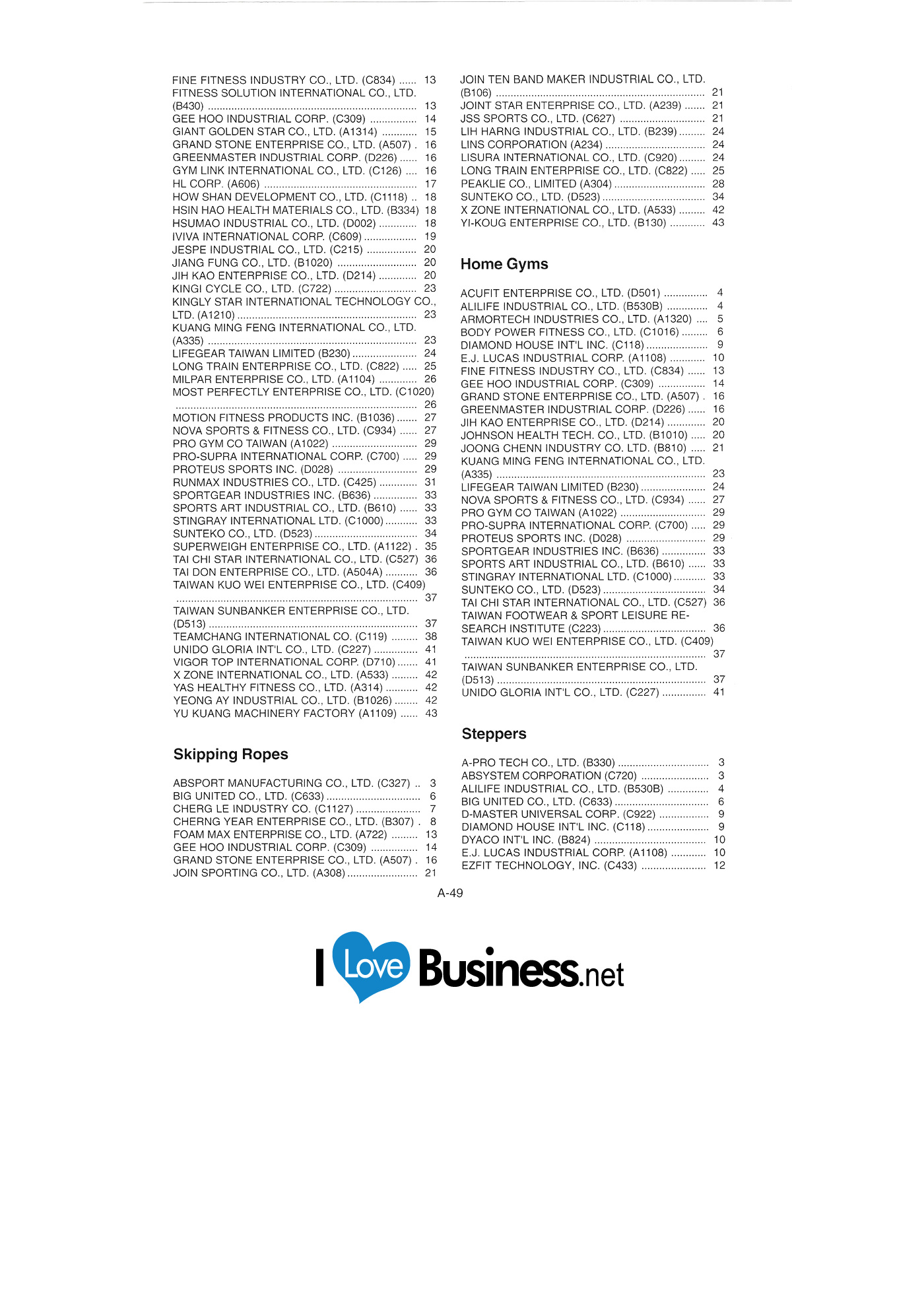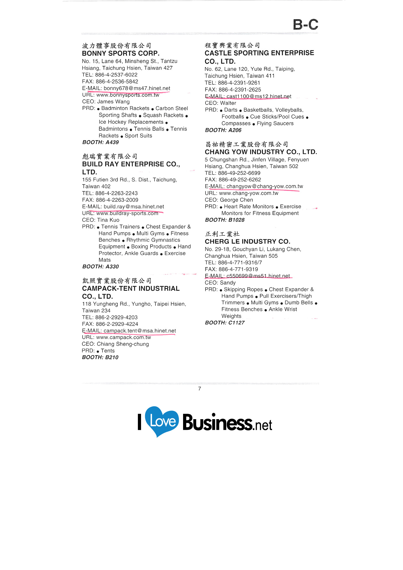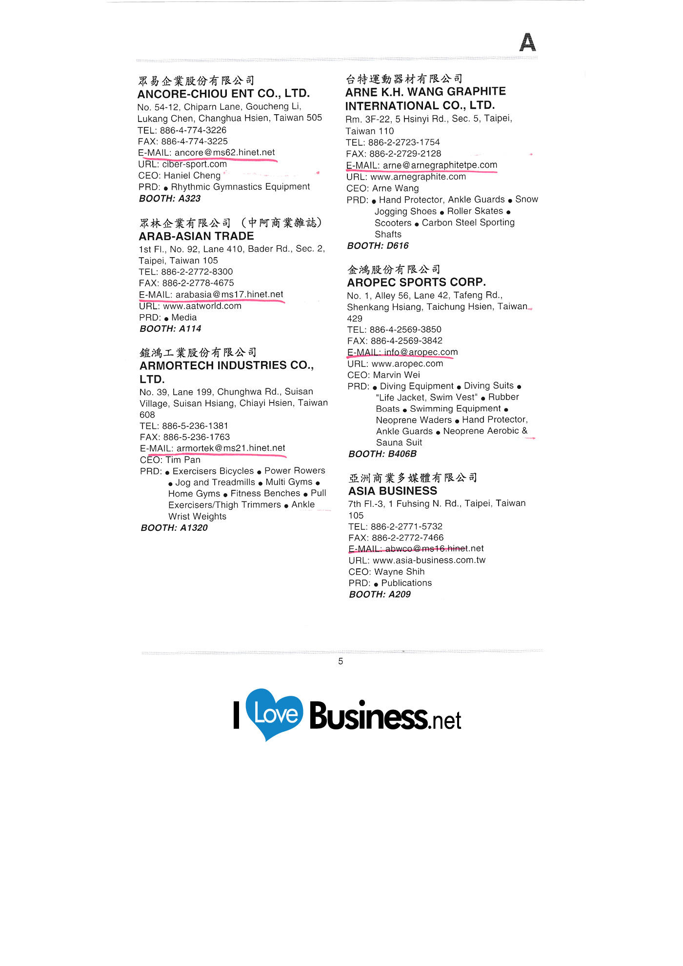 A'STRIKER ENTERPRISE CO.,LTD. A-PRO TECH CO.,LTD. ABMEX ENTERPRISE CO.,LTD. ABSPORT MANUFACTURING CO.,LTD. ABSYSTEM CORPORATION ACTRA INTERNATIONAL CO.,LTD. ACUFIT ENTERPRISE CO.,LTD. AGIT GLOBAL INC. ALILIFE INDUSTRIAL CO.,LTD. ALLPRODUCTS ONLINE CORP. ALLIED CONTINENTAL INC. AMULA ENTERPRISE CORP. ANCORE-CHIOU ENT CO.,LTD. ARAB-ASIAN TRADE ARMORTECH INDUSTRIES CO.,LTD. ARNE K.H WANG GRAPHITE INTERNATIONAL CO.,LTD. AROPEC SPORTS CORP. ASIA BUSINESS ASTAR TECHNOLOGY LTD. AZUMA INDUSTRIAL CO.,LTD. B-LINK SPORTS INT'L CORP. BALL EASE ENTERPRISE CO.,LTD. BIG UNITED CO.,LTD. BODY POWER FITNESS CO.,LTD. BONNY SPORTS CORP. BUILD RAY ENTERPRISE CO.,LTD. CAMPACK - TENT INDUSTRIAL CO.,LTD. CASTLE SPORTING ENTERPRISE CO.,LTD. CHANG YOW INDUSTRY CO.,LTD. CHERG LE INDUSTRY CO. CHERNG YEAR ENTERPRISE CO.,LTD. CHI MENG INDUSTRY CO.,LTD. CHIA TING FOUNDRIES CO.,LTD. CHILIN ELECTRONICS CO.,LTD. CHIN TE WANG INDUSTRIAL CO.,LTD. CHINA ECONOMIC NEWS SERVICE CIAN CHIANG INDUSTRY CO.,LTD. D- MASTER UNIVERSAL CORP. DAN YU SPORTS CO.,LTD. DANKEN ENTERPRISE CO.,LTD. DEEYANG CO.,LTD. DIAMOND HOUSE INT'L INC. DIBAR GROUPS ENTERPRISE CO.,LTD. DIRECTION TECHNOLOGY CO.,LTD. DUTECK INDUSTRIAL CO.,LTD. DYACO INT'L INC. E-NENG TECH ENTERPRISE CO.,LTD. E.J LUCAS INDUSTRIAL CORP. EAGLES INDUSTRIES CORP.,LTD. ECHOWELL ELECTRONICS CO.,LTD. ELEGANT UNION INDUSTRIAL CO.,LTD. ENERGY STAR CO.,LTD. ERADIATE ENTERPRISE CO.,LTD. EULIA ENTERPRISE CO.,LTD. EUSEBIO SPORTING CO.,LTD. EVER BUILD-UP INDUSTRIES LTD. KEXQUIS ENTERPRISES CO.,LTD. EYELINE INDUSTRIES CO.,LTD. EZFIT TECHNOLOGY, INC. FAIRMINDED INDUSTRIES INC. FAN CHIOU NET CO.,LTD. FAR GREAT PLASTICS INDUSTRIAL CO.,LTD. FINE FITNESS INDUSTRY CO.,LTD. FIRST RANK CO.,LTD. FITNESS SOLUTION INTERNATIONAL CO.,LTD. FOAM MAX ENTERPRISE CO.,LTD. FORHOUSE CORPORATION FREESPORT CORP. FULLYEAR-BROTHER ENT.CO.,LTD. G.PULSE INETERNATIONAL CO.,LTD. GC KEAN SYNTHETICS INC. GEE HOO INDUSTRIAL CORP. |