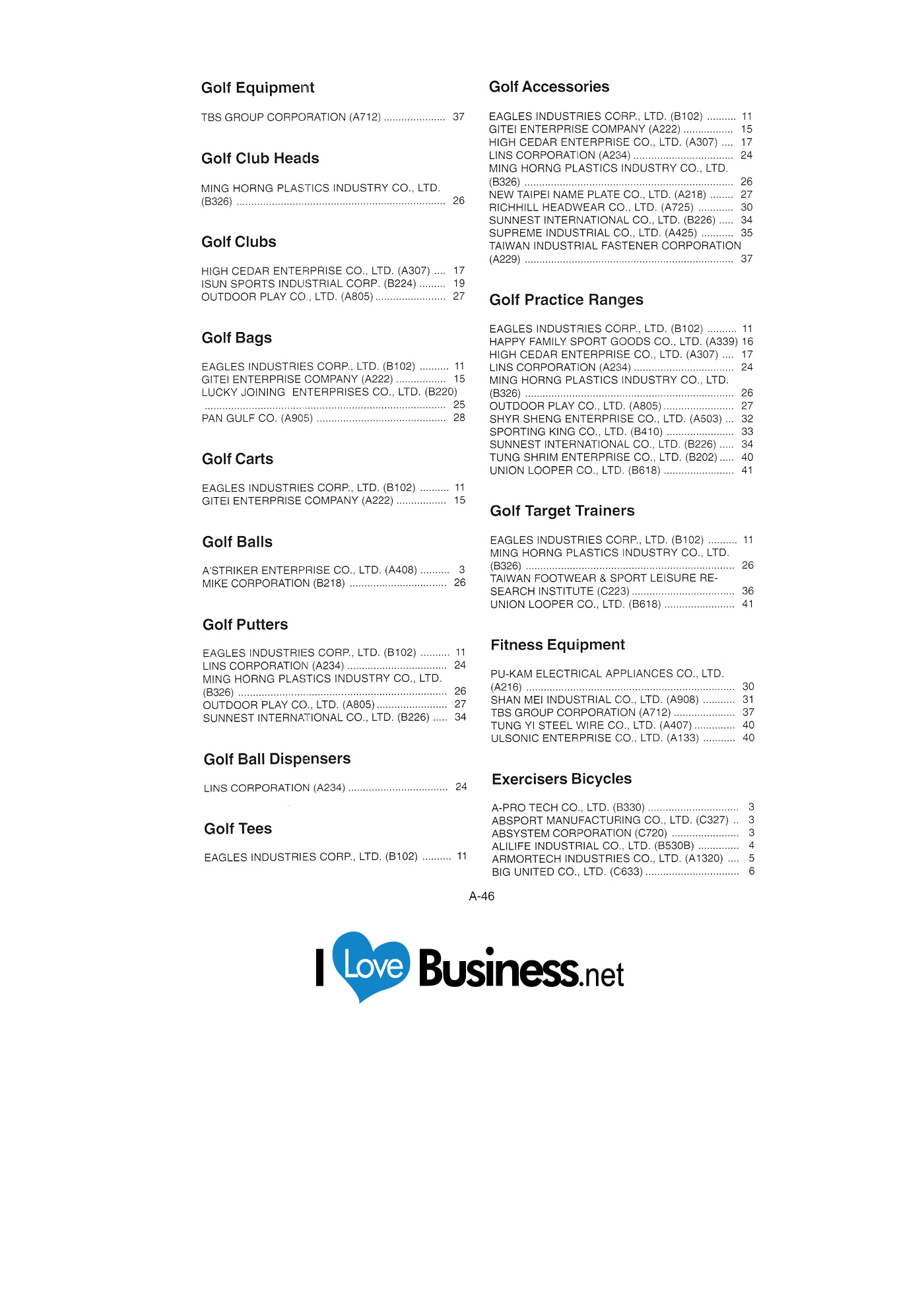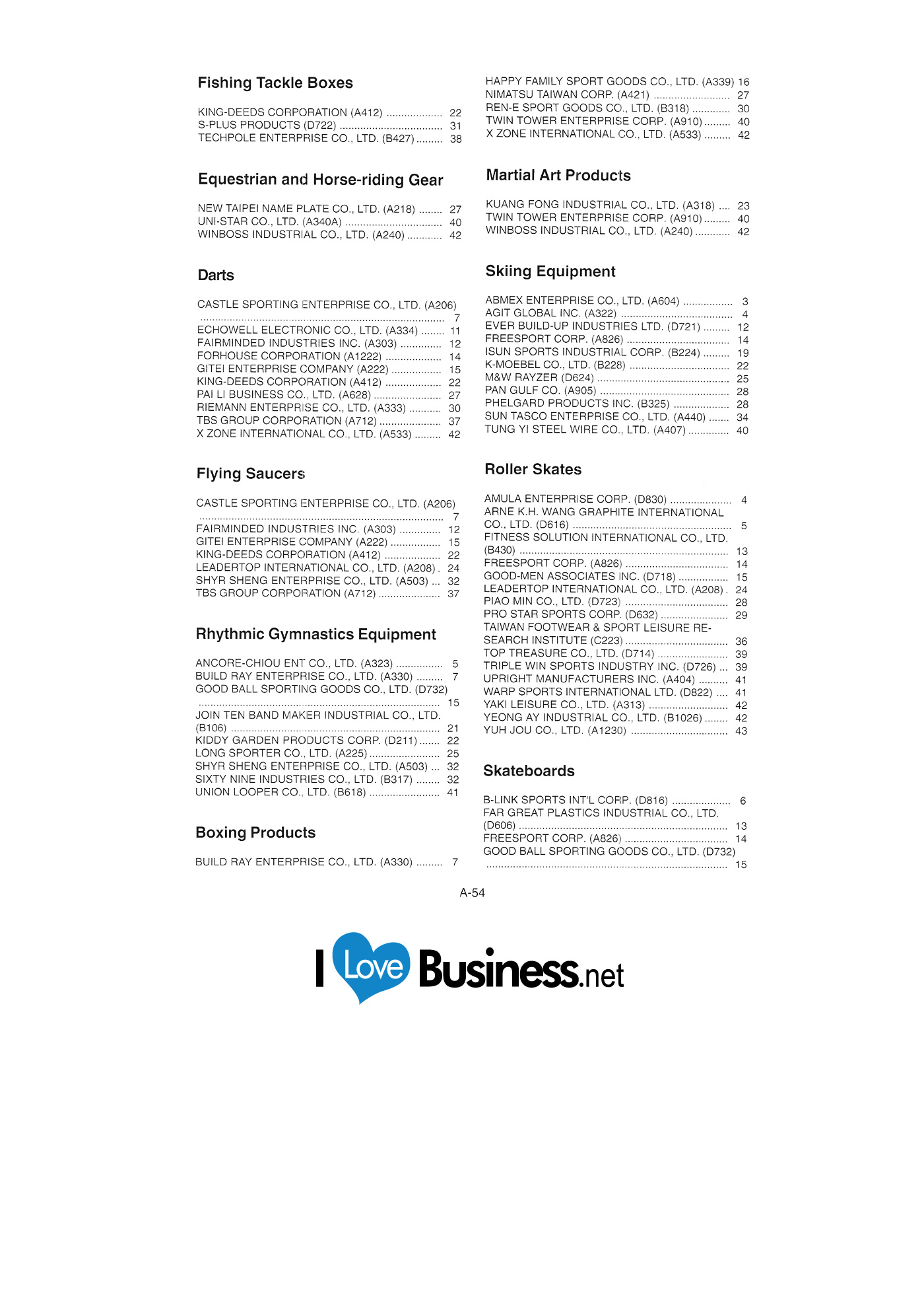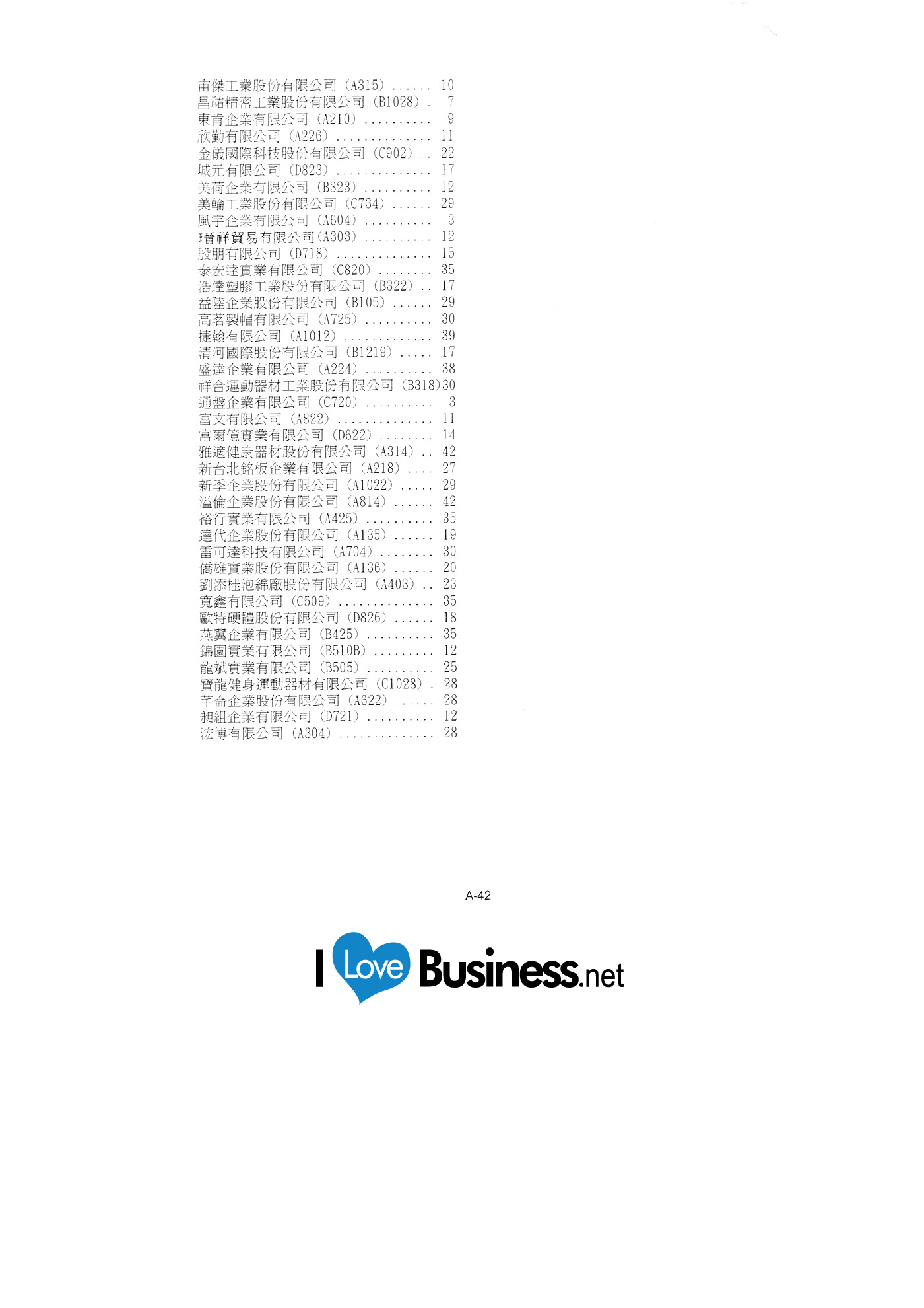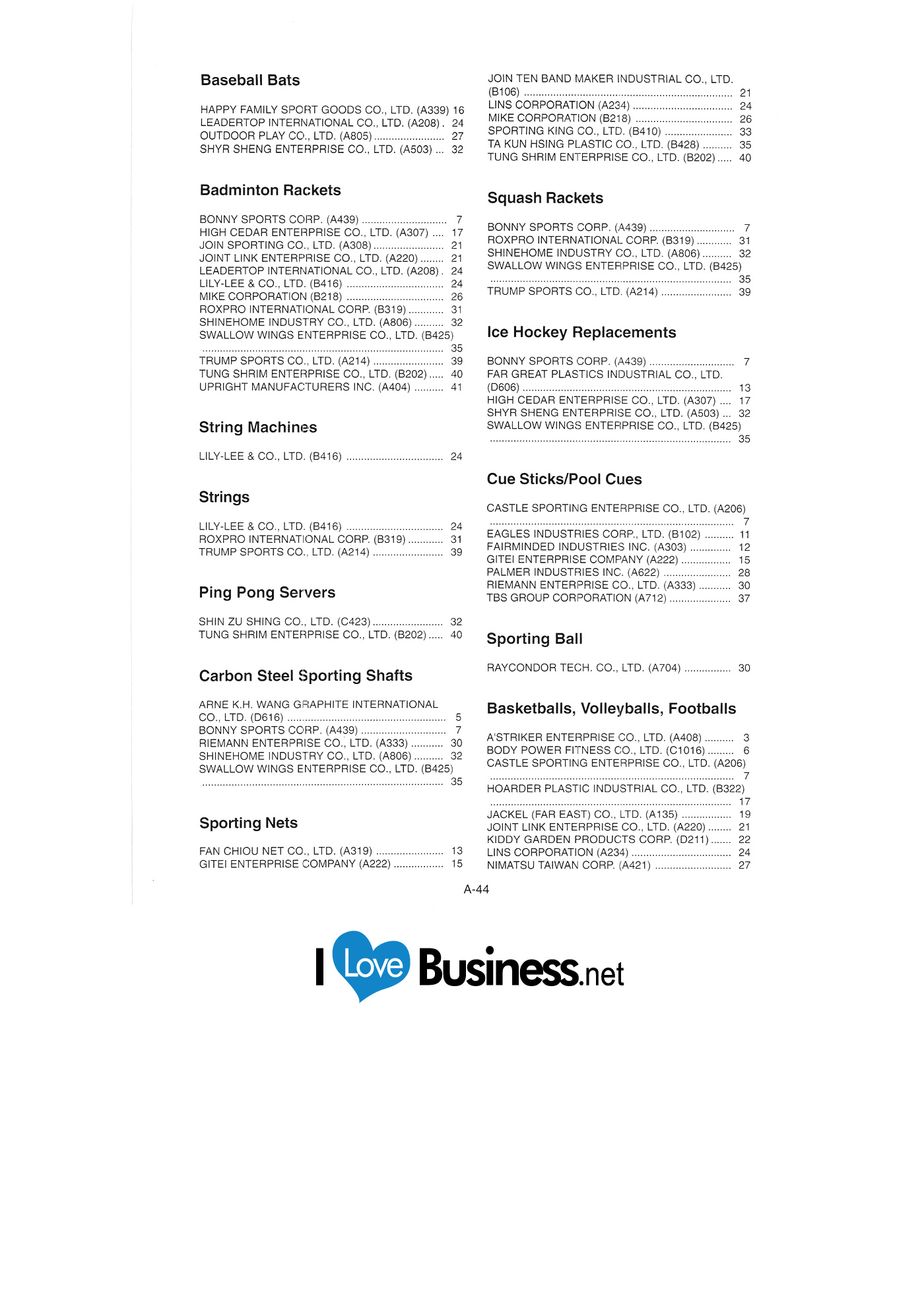 A'STRIKER ENTERPRISE CO.,LTD. A-PRO TECH CO.,LTD. ABMEX ENTERPRISE CO.,LTD. ABSPORT MANUFACTURING CO.,LTD. ABSYSTEM CORPORATION ACTRA INTERNATIONAL CO.,LTD. ACUFIT ENTERPRISE CO.,LTD. AGIT GLOBAL INC. ALILIFE INDUSTRIAL CO.,LTD. ALLPRODUCTS ONLINE CORP. ALLIED CONTINENTAL INC. AMULA ENTERPRISE CORP. ANCORE-CHIOU ENT CO.,LTD. ARAB-ASIAN TRADE ARMORTECH INDUSTRIES CO.,LTD. ARNE K.H WANG GRAPHITE INTERNATIONAL CO.,LTD. AROPEC SPORTS CORP. ASIA BUSINESS ASTAR TECHNOLOGY LTD. AZUMA INDUSTRIAL CO.,LTD. B-LINK SPORTS INT'L CORP. BALL EASE ENTERPRISE CO.,LTD. BIG UNITED CO.,LTD. BODY POWER FITNESS CO.,LTD. BONNY SPORTS CORP. BUILD RAY ENTERPRISE CO.,LTD. CAMPACK - TENT INDUSTRIAL CO.,LTD. CASTLE SPORTING ENTERPRISE CO.,LTD. CHANG YOW INDUSTRY CO.,LTD. CHERG LE INDUSTRY CO. CHERNG YEAR ENTERPRISE CO.,LTD. CHI MENG INDUSTRY CO.,LTD. CHIA TING FOUNDRIES CO.,LTD. CHILIN ELECTRONICS CO.,LTD. CHIN TE WANG INDUSTRIAL CO.,LTD. CHINA ECONOMIC NEWS SERVICE CIAN CHIANG INDUSTRY CO.,LTD. D- MASTER UNIVERSAL CORP. DAN YU SPORTS CO.,LTD. DANKEN ENTERPRISE CO.,LTD. DEEYANG CO.,LTD. DIAMOND HOUSE INT'L INC. DIBAR GROUPS ENTERPRISE CO.,LTD. DIRECTION TECHNOLOGY CO.,LTD. DUTECK INDUSTRIAL CO.,LTD. DYACO INT'L INC. E-NENG TECH ENTERPRISE CO.,LTD. E.J LUCAS INDUSTRIAL CORP. EAGLES INDUSTRIES CORP.,LTD. ECHOWELL ELECTRONICS CO.,LTD. ELEGANT UNION INDUSTRIAL CO.,LTD. ENERGY STAR CO.,LTD. ERADIATE ENTERPRISE CO.,LTD. EULIA ENTERPRISE CO.,LTD. EUSEBIO SPORTING CO.,LTD. EVER BUILD-UP INDUSTRIES LTD. KEXQUIS ENTERPRISES CO.,LTD. EYELINE INDUSTRIES CO.,LTD. EZFIT TECHNOLOGY, INC. FAIRMINDED INDUSTRIES INC. FAN CHIOU NET CO.,LTD. FAR GREAT PLASTICS INDUSTRIAL CO.,LTD. FINE FITNESS INDUSTRY CO.,LTD. FIRST RANK CO.,LTD. FITNESS SOLUTION INTERNATIONAL CO.,LTD. FOAM MAX ENTERPRISE CO.,LTD. FORHOUSE CORPORATION FREESPORT CORP. FULLYEAR-BROTHER ENT.CO.,LTD. G.PULSE INETERNATIONAL CO.,LTD. GC KEAN SYNTHETICS INC. GEE HOO INDUSTRIAL CORP. |