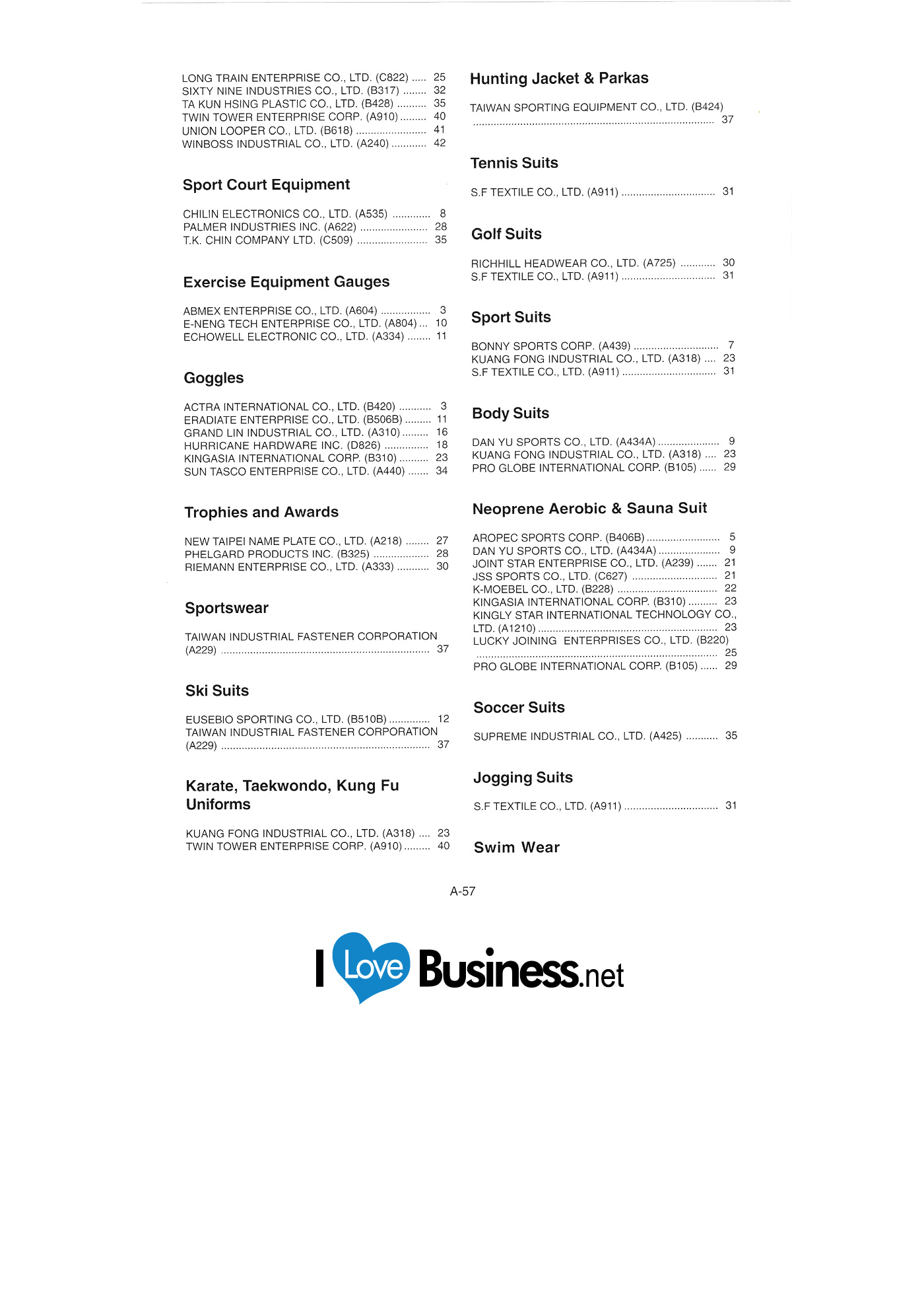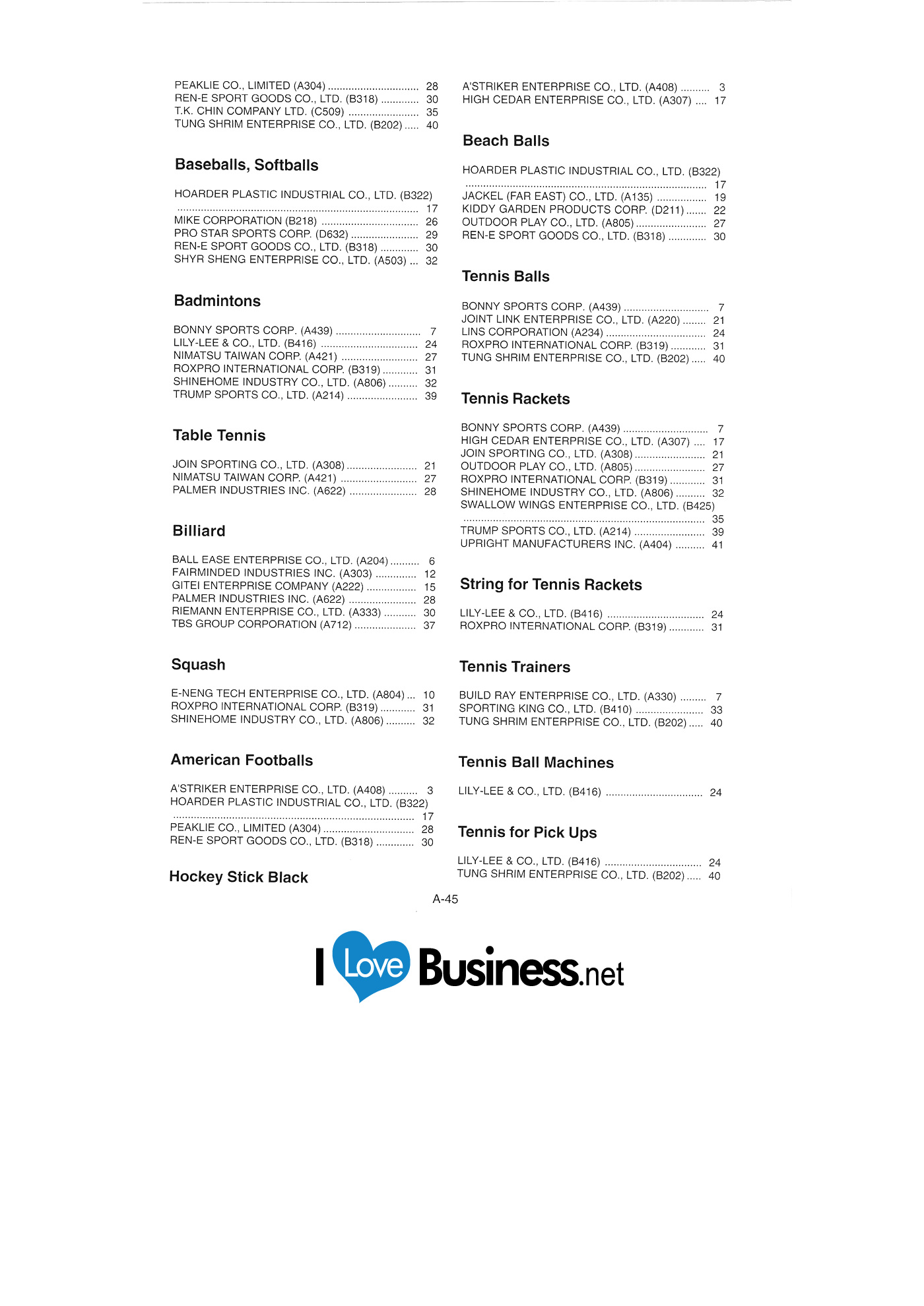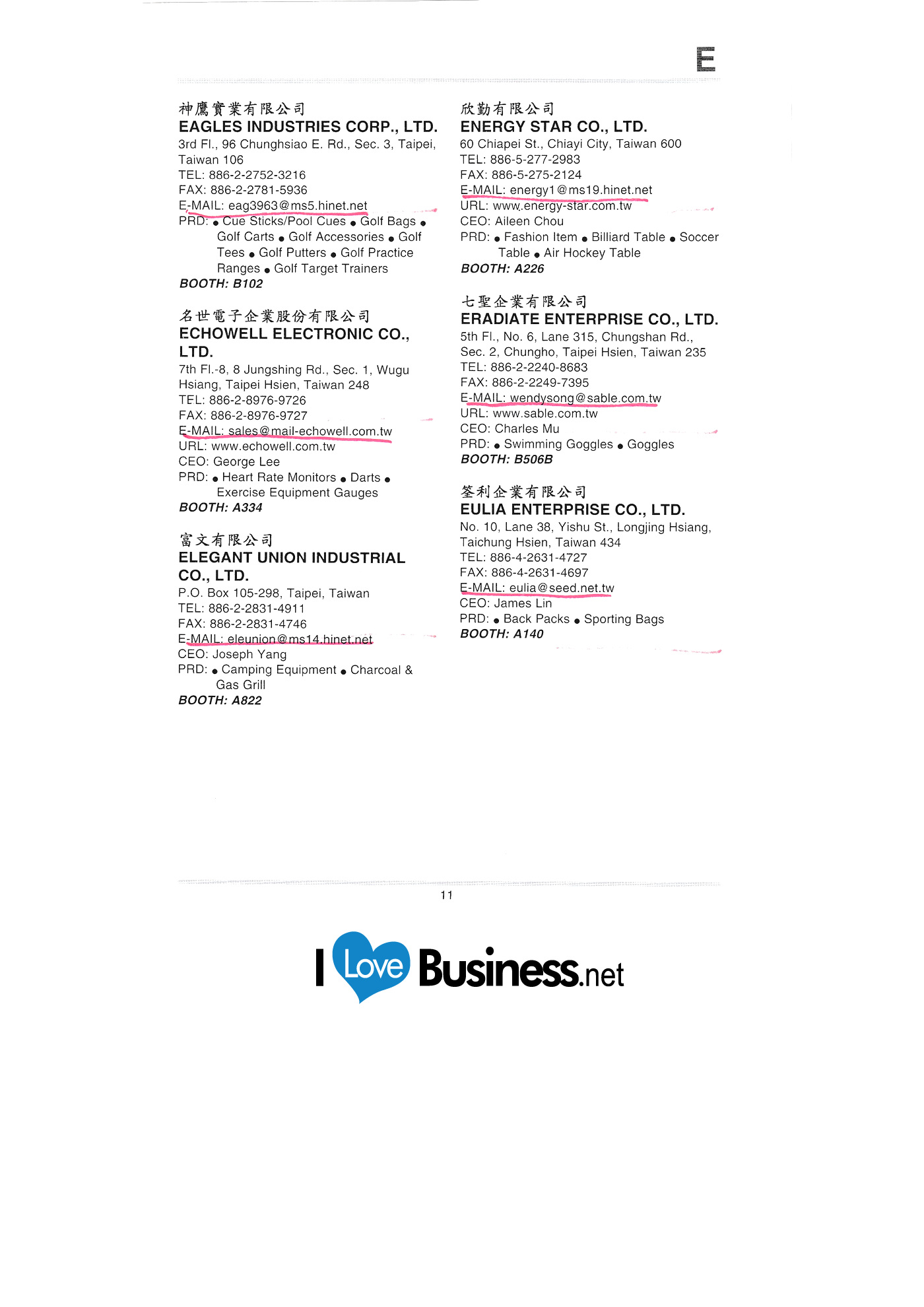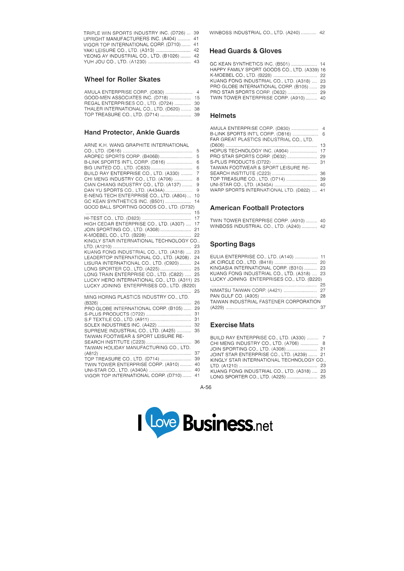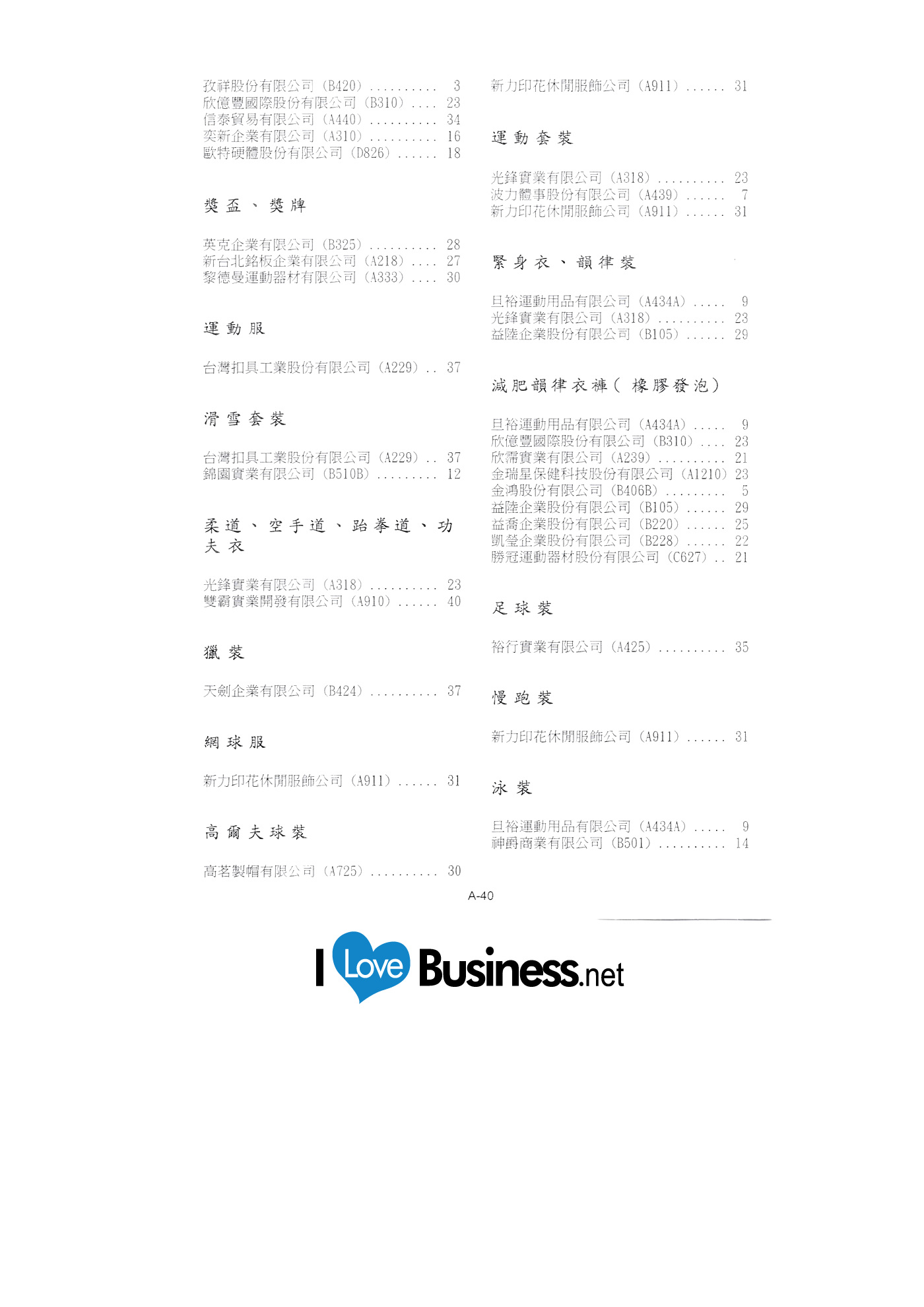 A'STRIKER ENTERPRISE CO.,LTD. A-PRO TECH CO.,LTD. ABMEX ENTERPRISE CO.,LTD. ABSPORT MANUFACTURING CO.,LTD. ABSYSTEM CORPORATION ACTRA INTERNATIONAL CO.,LTD. ACUFIT ENTERPRISE CO.,LTD. AGIT GLOBAL INC. ALILIFE INDUSTRIAL CO.,LTD. ALLPRODUCTS ONLINE CORP. ALLIED CONTINENTAL INC. AMULA ENTERPRISE CORP. ANCORE-CHIOU ENT CO.,LTD. ARAB-ASIAN TRADE ARMORTECH INDUSTRIES CO.,LTD. ARNE K.H WANG GRAPHITE INTERNATIONAL CO.,LTD. AROPEC SPORTS CORP. ASIA BUSINESS ASTAR TECHNOLOGY LTD. AZUMA INDUSTRIAL CO.,LTD. B-LINK SPORTS INT'L CORP. BALL EASE ENTERPRISE CO.,LTD. BIG UNITED CO.,LTD. BODY POWER FITNESS CO.,LTD. BONNY SPORTS CORP. BUILD RAY ENTERPRISE CO.,LTD. CAMPACK - TENT INDUSTRIAL CO.,LTD. CASTLE SPORTING ENTERPRISE CO.,LTD. CHANG YOW INDUSTRY CO.,LTD. CHERG LE INDUSTRY CO. CHERNG YEAR ENTERPRISE CO.,LTD. CHI MENG INDUSTRY CO.,LTD. CHIA TING FOUNDRIES CO.,LTD. CHILIN ELECTRONICS CO.,LTD. CHIN TE WANG INDUSTRIAL CO.,LTD. CHINA ECONOMIC NEWS SERVICE CIAN CHIANG INDUSTRY CO.,LTD. D- MASTER UNIVERSAL CORP. DAN YU SPORTS CO.,LTD. DANKEN ENTERPRISE CO.,LTD. DEEYANG CO.,LTD. DIAMOND HOUSE INT'L INC. DIBAR GROUPS ENTERPRISE CO.,LTD. DIRECTION TECHNOLOGY CO.,LTD. DUTECK INDUSTRIAL CO.,LTD. DYACO INT'L INC. E-NENG TECH ENTERPRISE CO.,LTD. E.J LUCAS INDUSTRIAL CORP. EAGLES INDUSTRIES CORP.,LTD. ECHOWELL ELECTRONICS CO.,LTD. ELEGANT UNION INDUSTRIAL CO.,LTD. ENERGY STAR CO.,LTD. ERADIATE ENTERPRISE CO.,LTD. EULIA ENTERPRISE CO.,LTD. EUSEBIO SPORTING CO.,LTD. EVER BUILD-UP INDUSTRIES LTD. KEXQUIS ENTERPRISES CO.,LTD. EYELINE INDUSTRIES CO.,LTD. EZFIT TECHNOLOGY, INC. FAIRMINDED INDUSTRIES INC. FAN CHIOU NET CO.,LTD. FAR GREAT PLASTICS INDUSTRIAL CO.,LTD. FINE FITNESS INDUSTRY CO.,LTD. FIRST RANK CO.,LTD. FITNESS SOLUTION INTERNATIONAL CO.,LTD. FOAM MAX ENTERPRISE CO.,LTD. FORHOUSE CORPORATION FREESPORT CORP. FULLYEAR-BROTHER ENT.CO.,LTD. G.PULSE INETERNATIONAL CO.,LTD. GC KEAN SYNTHETICS INC. GEE HOO INDUSTRIAL CORP. |