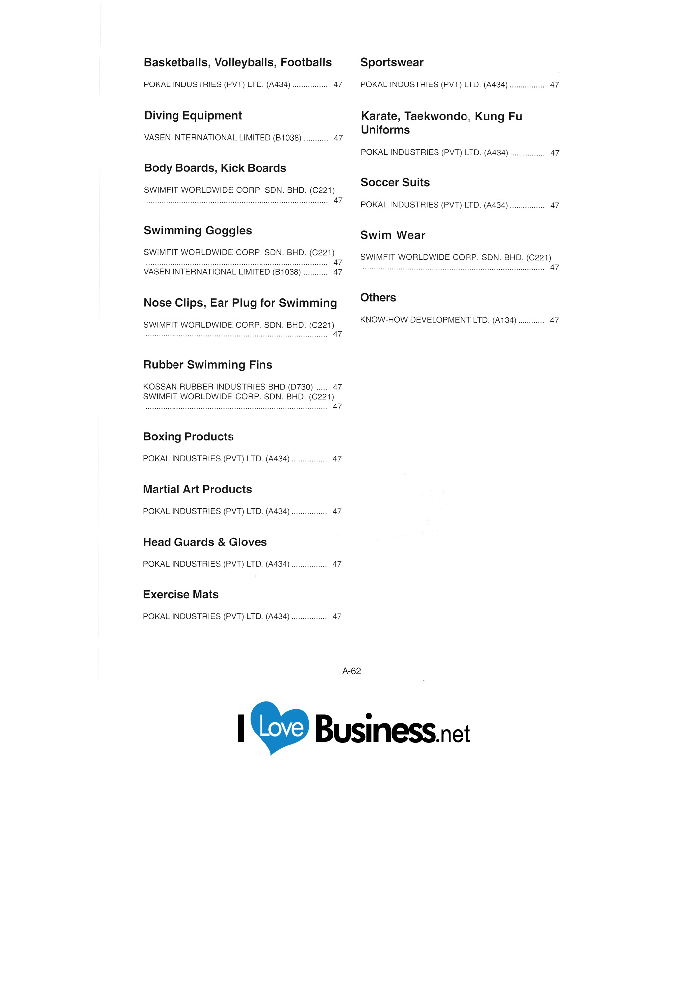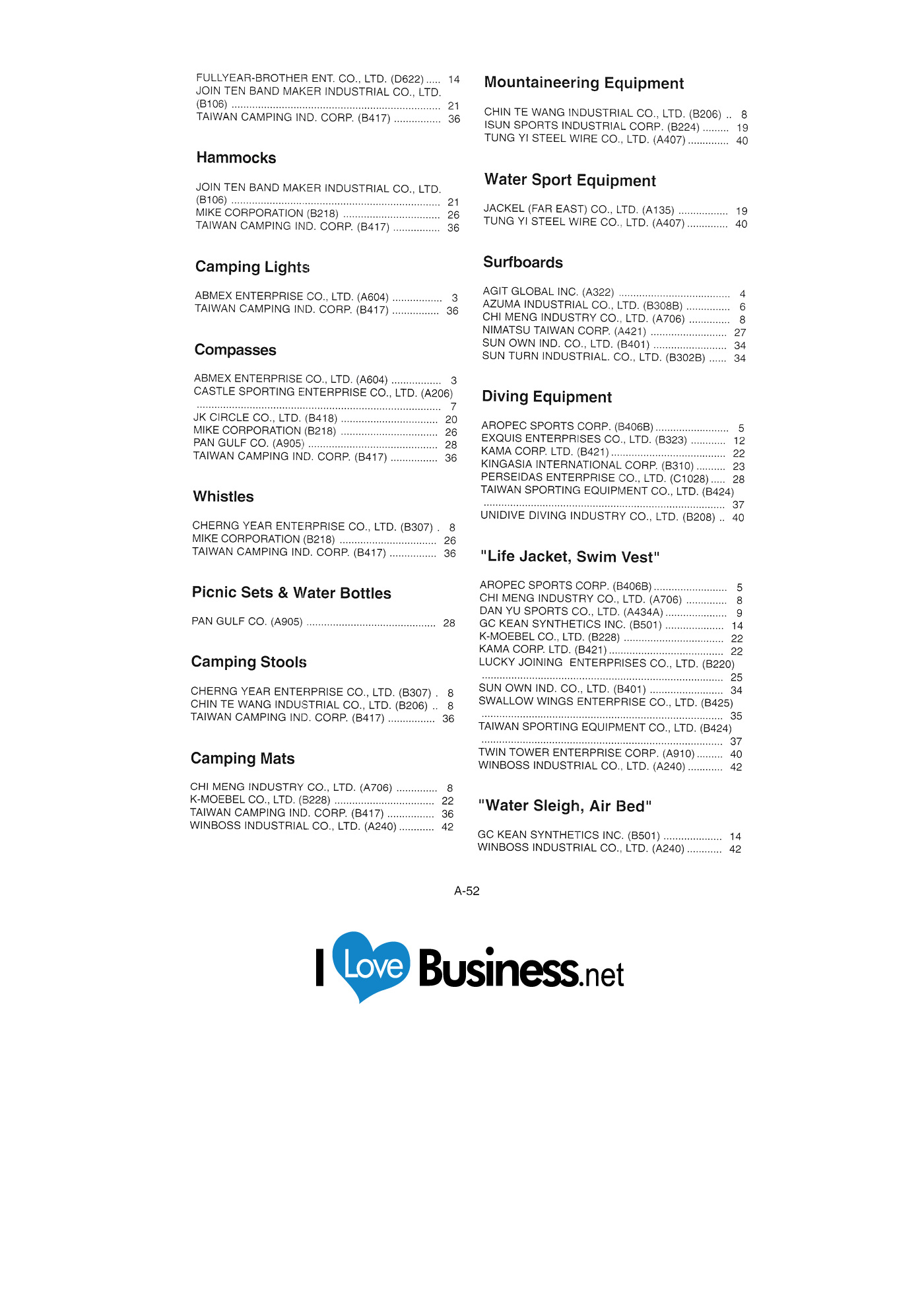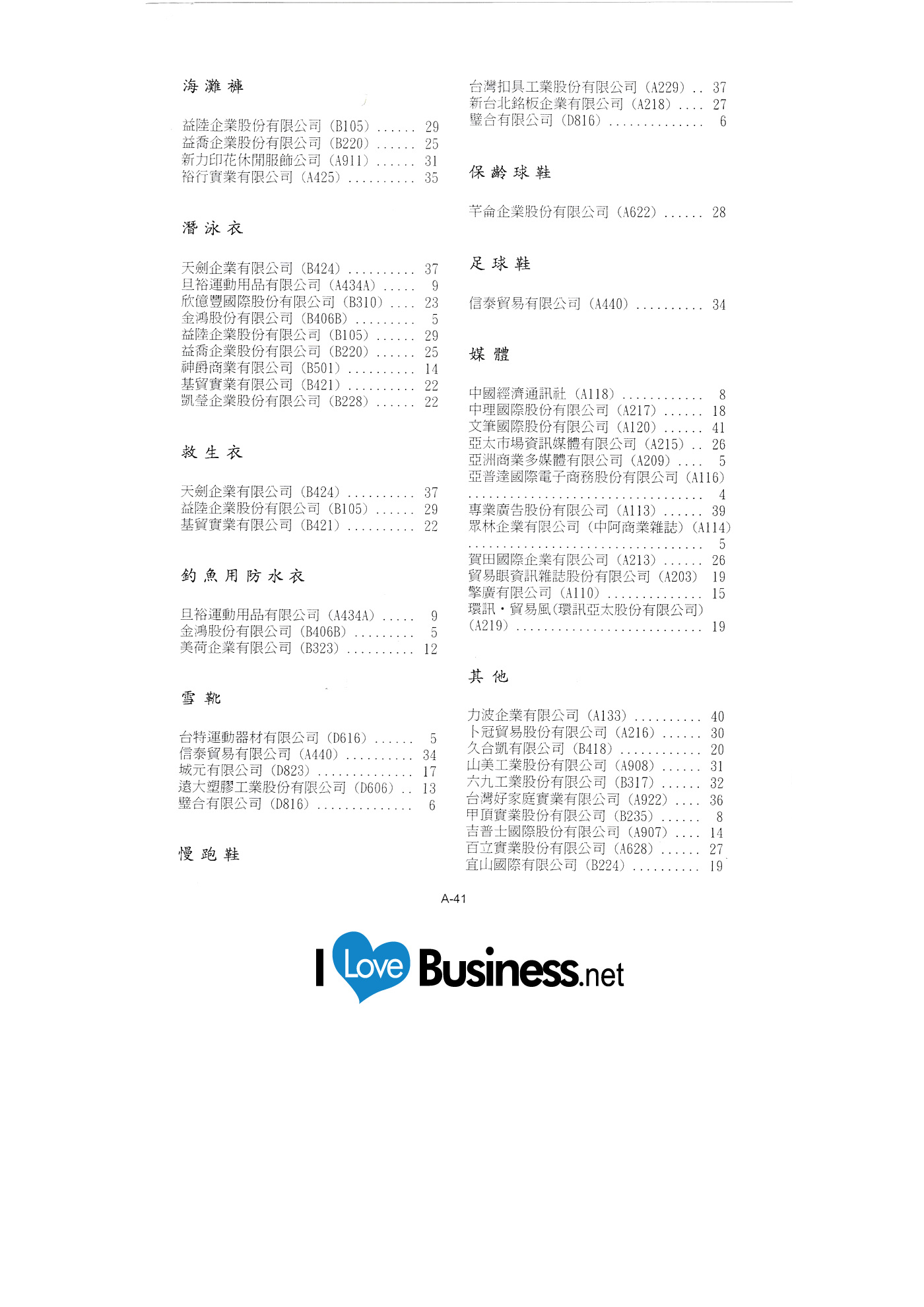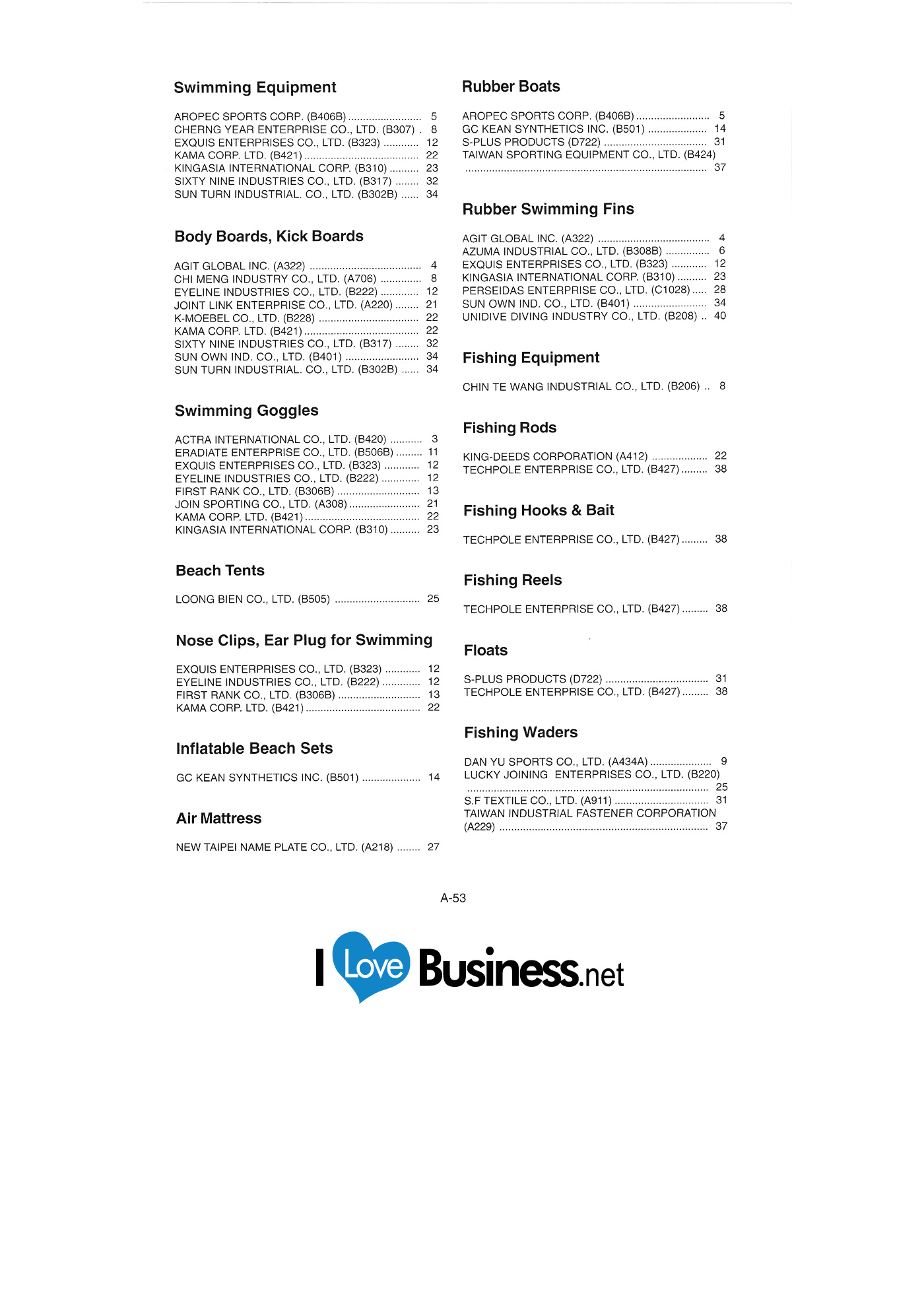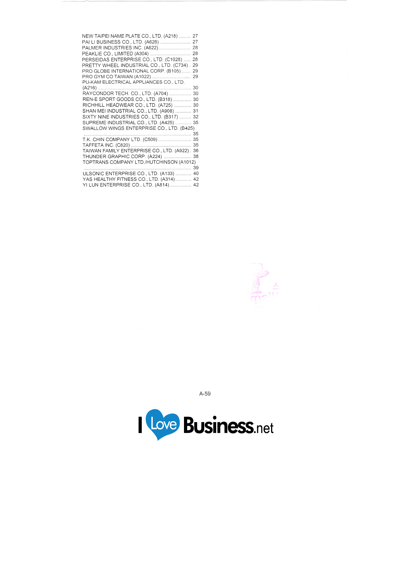 A'STRIKER ENTERPRISE CO.,LTD. A-PRO TECH CO.,LTD. ABMEX ENTERPRISE CO.,LTD. ABSPORT MANUFACTURING CO.,LTD. ABSYSTEM CORPORATION ACTRA INTERNATIONAL CO.,LTD. ACUFIT ENTERPRISE CO.,LTD. AGIT GLOBAL INC. ALILIFE INDUSTRIAL CO.,LTD. ALLPRODUCTS ONLINE CORP. ALLIED CONTINENTAL INC. AMULA ENTERPRISE CORP. ANCORE-CHIOU ENT CO.,LTD. ARAB-ASIAN TRADE ARMORTECH INDUSTRIES CO.,LTD. ARNE K.H WANG GRAPHITE INTERNATIONAL CO.,LTD. AROPEC SPORTS CORP. ASIA BUSINESS ASTAR TECHNOLOGY LTD. AZUMA INDUSTRIAL CO.,LTD. B-LINK SPORTS INT'L CORP. BALL EASE ENTERPRISE CO.,LTD. BIG UNITED CO.,LTD. BODY POWER FITNESS CO.,LTD. BONNY SPORTS CORP. BUILD RAY ENTERPRISE CO.,LTD. CAMPACK - TENT INDUSTRIAL CO.,LTD. CASTLE SPORTING ENTERPRISE CO.,LTD. CHANG YOW INDUSTRY CO.,LTD. CHERG LE INDUSTRY CO. CHERNG YEAR ENTERPRISE CO.,LTD. CHI MENG INDUSTRY CO.,LTD. CHIA TING FOUNDRIES CO.,LTD. CHILIN ELECTRONICS CO.,LTD. CHIN TE WANG INDUSTRIAL CO.,LTD. CHINA ECONOMIC NEWS SERVICE CIAN CHIANG INDUSTRY CO.,LTD. D- MASTER UNIVERSAL CORP. DAN YU SPORTS CO.,LTD. DANKEN ENTERPRISE CO.,LTD. DEEYANG CO.,LTD. DIAMOND HOUSE INT'L INC. DIBAR GROUPS ENTERPRISE CO.,LTD. DIRECTION TECHNOLOGY CO.,LTD. DUTECK INDUSTRIAL CO.,LTD. DYACO INT'L INC. E-NENG TECH ENTERPRISE CO.,LTD. E.J LUCAS INDUSTRIAL CORP. EAGLES INDUSTRIES CORP.,LTD. ECHOWELL ELECTRONICS CO.,LTD. ELEGANT UNION INDUSTRIAL CO.,LTD. ENERGY STAR CO.,LTD. ERADIATE ENTERPRISE CO.,LTD. EULIA ENTERPRISE CO.,LTD. EUSEBIO SPORTING CO.,LTD. EVER BUILD-UP INDUSTRIES LTD. KEXQUIS ENTERPRISES CO.,LTD. EYELINE INDUSTRIES CO.,LTD. EZFIT TECHNOLOGY, INC. FAIRMINDED INDUSTRIES INC. FAN CHIOU NET CO.,LTD. FAR GREAT PLASTICS INDUSTRIAL CO.,LTD. FINE FITNESS INDUSTRY CO.,LTD. FIRST RANK CO.,LTD. FITNESS SOLUTION INTERNATIONAL CO.,LTD. FOAM MAX ENTERPRISE CO.,LTD. FORHOUSE CORPORATION FREESPORT CORP. FULLYEAR-BROTHER ENT.CO.,LTD. G.PULSE INETERNATIONAL CO.,LTD. GC KEAN SYNTHETICS INC. GEE HOO INDUSTRIAL CORP. |