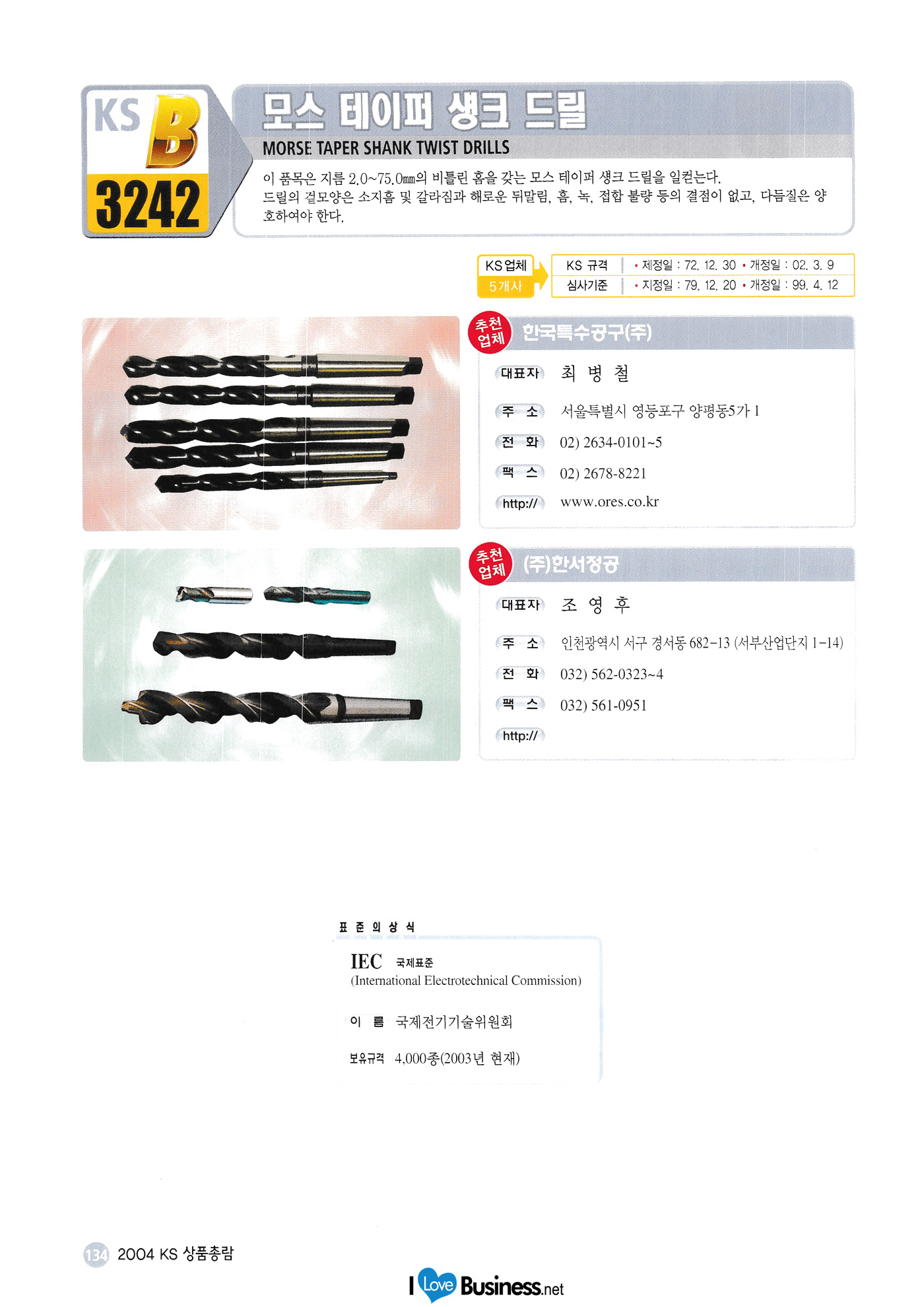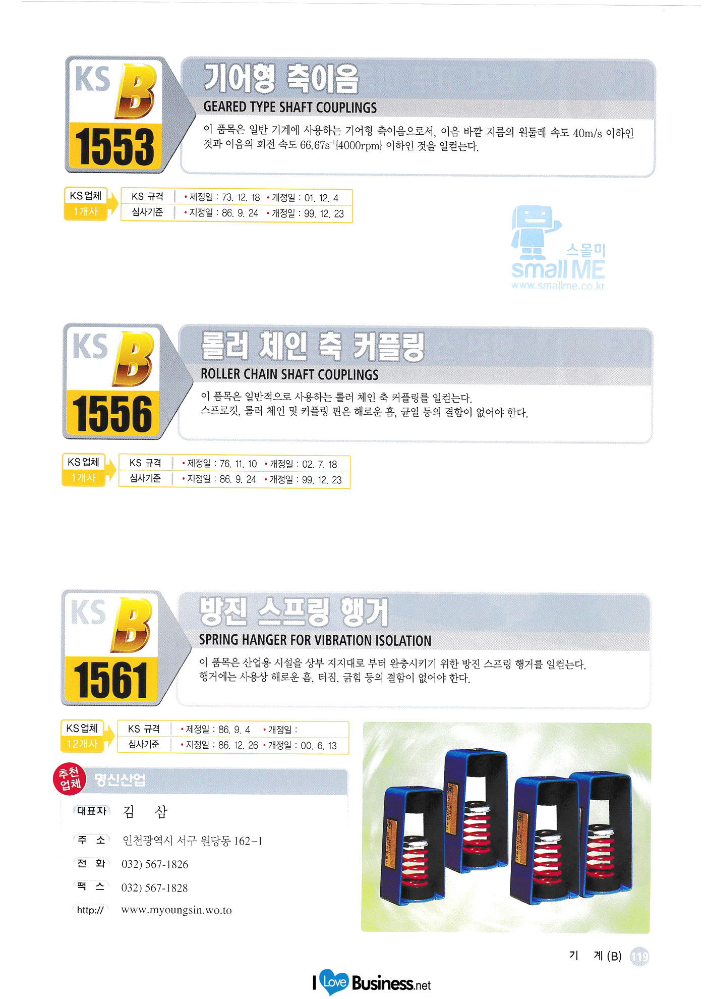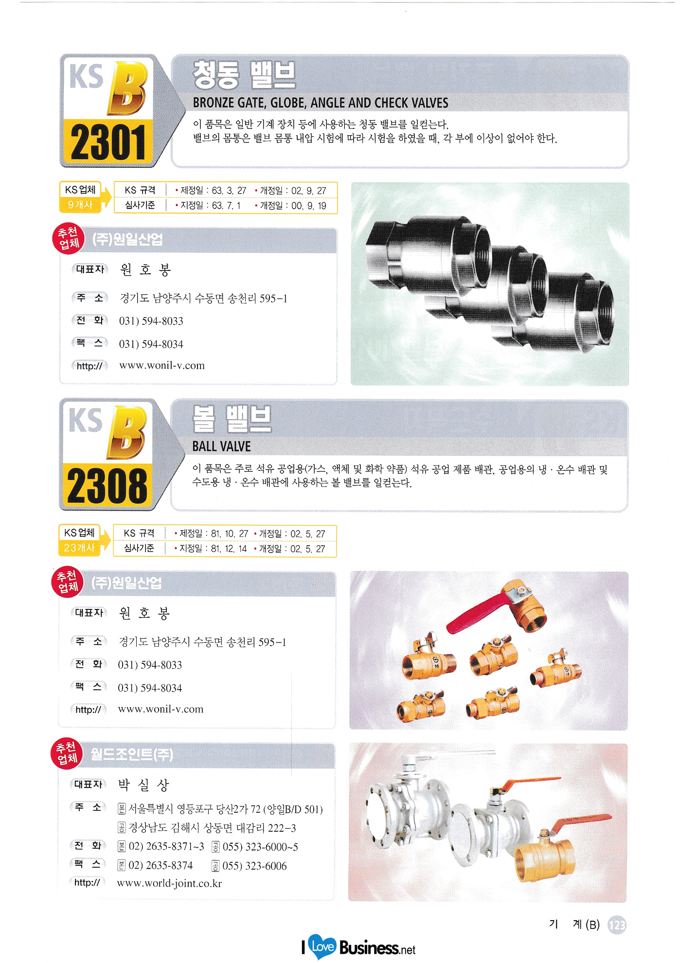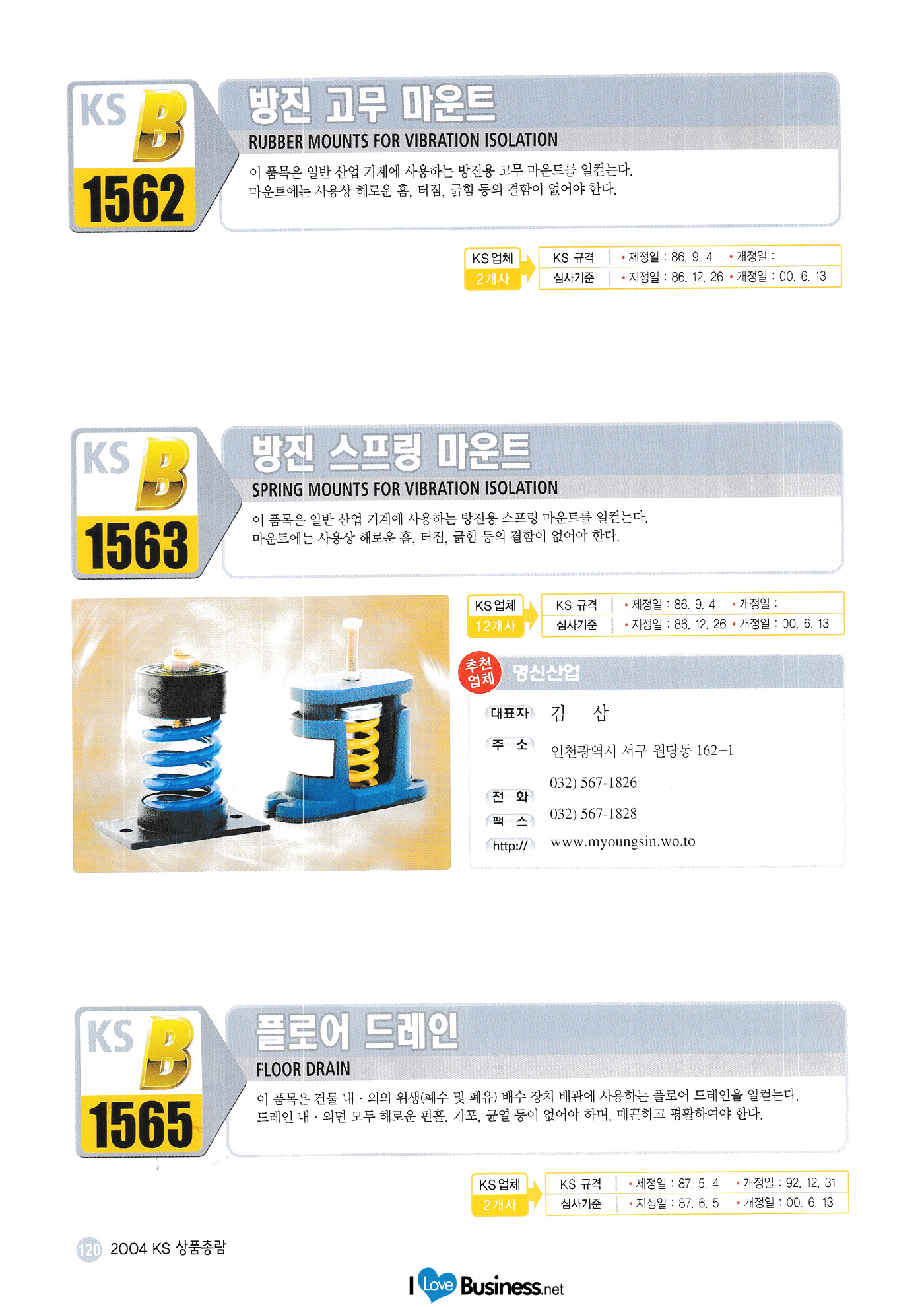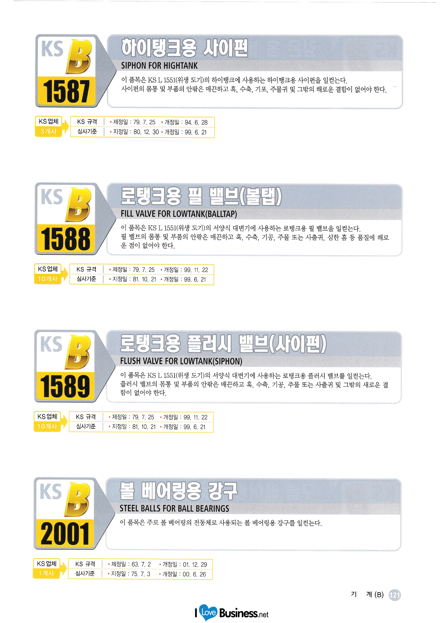 | 2004 한국 상품총람 위생 도기 부속 쇠붙이 벨로우즈형 신축 관 이음 냉매용 플레어 및 경납땜 관 이음쇠 주철 1MPa Y형 증기 여과기 금속제 플렉시블 호스 배관용 강제 맞대기 용접식 관 이음쇠 배관용 강판제 맞대기 용접식 관 이음쇠 동합금 납땜 관 이음쇠 동 및 동합금 플레어 관 이음쇠 폴리에틸렌 관 이음쇠 일반 배관용 스테인리스 강판 프레스식 관 이음쇠 플랜지형 플렉시블 축 커플링 기어형 축이음 롤러 체인 축 커플링 방진 스프링 행거 방진 고무 마운트 방진 스프링 마운트 플로어 드레인 하이탱크용 사이펀 로탱크용 필밸브(볼탭) 로탱크용 플러시 밸브(사이펀) 볼 베이링용 강구 깊은 홈 볼 베어링 테이퍼 롤러 베어링 구름 베어링 유닛용 볼 베어링 청동 밸브 볼 밸브 플러팅 밸브 수도꼭지 수도용 제수 밸브 수도용 버터플라이 밸브 수도용 덕타일 주철 제수 밸브 수도용 공기 밸브 수도용 새들붙이 분수전 주철 밸브 주강 플랜지형 밸브 세척 밸브 물용 자동 공기 배출 밸브 겹판 스프링 열간 성형 코일 스프링 냉간 성형 압축 코일 스프링 냉간 성형 인장 코일 스프링 오일 실 O링 웨이퍼형 고무붙이 버터플라이 밸브 펜치 라디오 펜치 강력 니퍼 콤비네이션 플라이어 스패너 멍키 렌치 스크루 드라이버 파이프 렌치 철공용 줄 손작업 쇠톱날 모스 테이퍼 생크 드릴 스트레이트 생크 드릴 미터 나사용 핸드 탭 유니파이 보통 나사용 핸드탭 보통 바이스(각통형) 수동 가스 절단기 수동 가스 용접기 용접 절단기용 압력 조정기 철강의 노멀라이징 및 어닐링 가공 철강의 고주파 담금질과 템퍼링 가공 철강의 퀜칭 및 템퍼링 가공 강의 가스 질화 가공 강제 줄자 섬유제 줄자 접선류 익차형 수도미터 적산 열량계 부르동관 압력계 다이어프램식 가스 키터 오일 미터 접션류 익차형 온수 미터 고압용 수량계 인장 시험기 브리넬 경도 시험기 압축시험기 브리넬 경도시험기 압축시험기 만능재료시험기 건조계렌즈용생물현미경 오버헤드영사기 피스톤링 가스밸브 냉매용 스톱밸브 스프레이 건 및 컵 온수 보일러용 온도 제한기 및 온도 조절기 이음매 없는 강제 고압 가스용기 용접 강제 액화 석유 가스 용기(재충전용) 액화 석유 가스 용기용 밸브 일반용 액화 석유 가스 (LPG) 압력 조정기 고압 가스 용기용 밸브 건타입 오일버너 벨트 컨베이어용 롤러 체인 블록 스테인리스 물탱크 양쪽흡입벌루트펌프 수봉식 진공펌프 깊은 우물용 수중 모터 펌프 배수용 수중모터펌프 전향익송풍기 유압용필터 팬코일유닛 난방용강판방열기 난방용 방열기부속품 원통형, 튜블러형 및 상자형 도어록 산업용캐스터 공사용수중펌프 |
