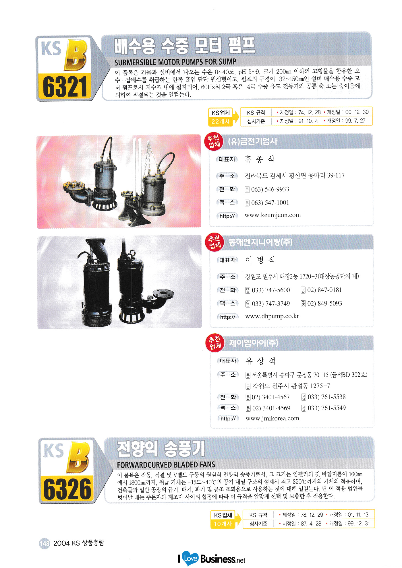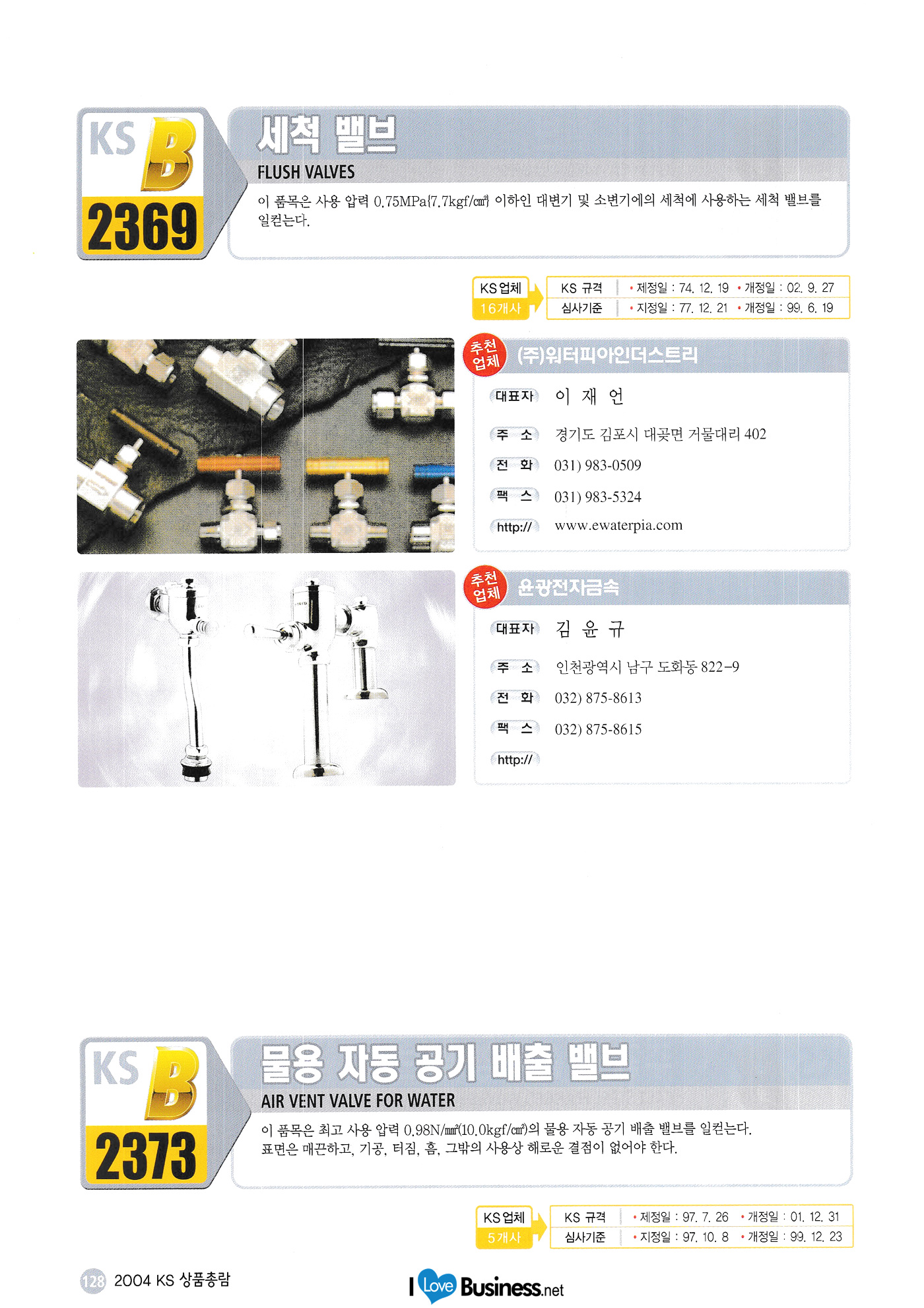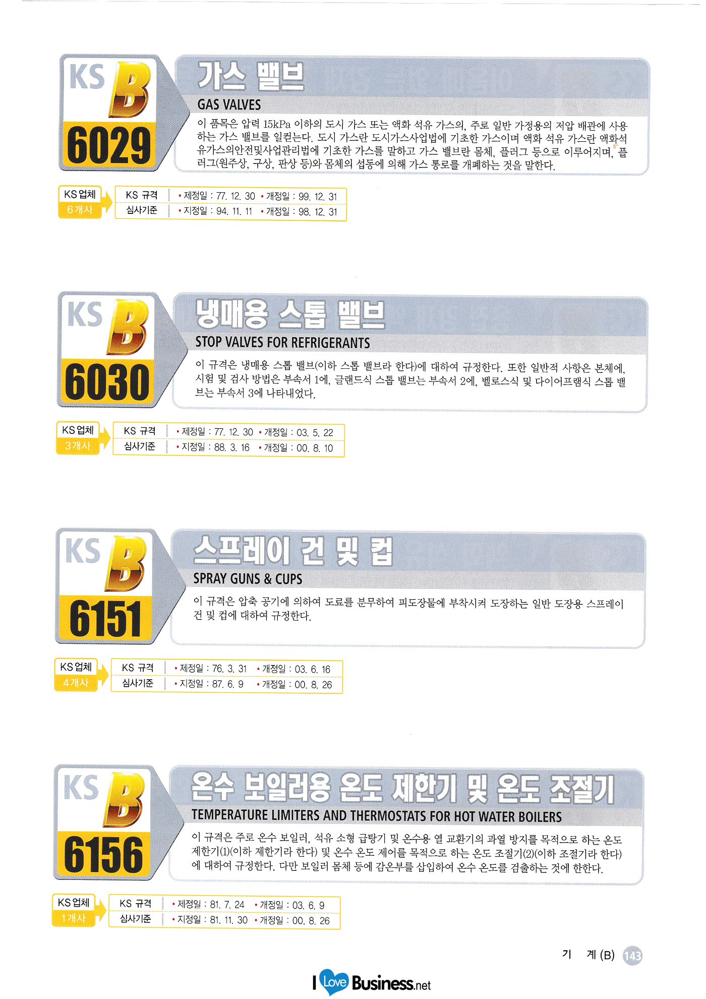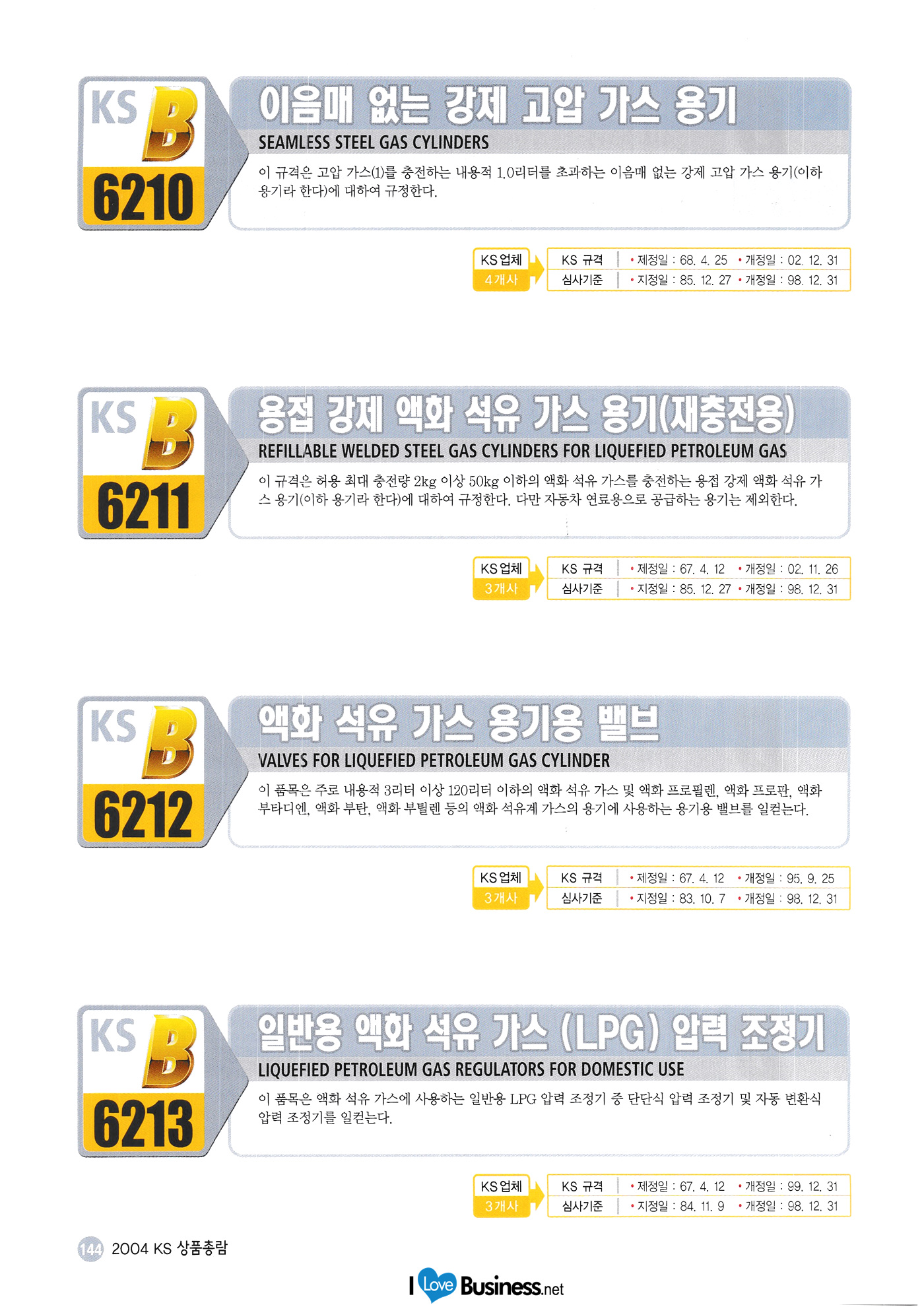 | 2004 Korea Product Overview Metal fittings attached to sanitary ware Bellows type expansion pipe joint Flare for refrigerant and brazing pipe fittings Cast iron 1MPa Y type steam filter Metal flexible hose Steel butt welded pipe fittings for piping Butt-welded pipe fitting made of steel plate for piping Copper alloy soldering pipe fittings Copper and copper alloy flared pipe fittings Polyethylene pipe fittings Stainless steel plate press type pipe fitting for general piping Flanged flexible shaft coupling Gear type shaft joint Roller chain shaft coupling Anti-vibration spring hanger Anti-vibration rubber mount Anti-vibration spring mount Floor drain Siphon for high tank Fill valve for low tank (ball tap) Flush valve for low tank (siphon) Steel ball for ball bearing Deep groove ball bearing Tapered roller bearings Ball bearings for rolling bearing units Bronze valve Ball valve Flushing valve water tap Water divisor valve Butterfly valve for water Ductile cast iron water valve for water supply Water air valve Water fountain with birds Cast iron valve Cast Steel Flanged Valve Flushing valve Automatic air release valve for water Leaf spring Hot formed coil spring Cold Formed Compression Coil Spring Cold Formed Tension Coil Spring Oil seal O ring Wafer Type Rubber Butterfly Valve pliers Radio pliers Powerful nipper Combination flyer spanner Monkey wrench screwdriver Pipe wrench Ironwork file Handwork hacksaw blade Morse Taper Shank Drill Straight shank drill Hand tap for metric thread Hand tap for unify normal screw Normal vise (corner type) Manual gas cutting machine Manual gas welding machine Pressure regulator for welding cutters Normalizing and annealing processing of steel Induction hardening and tempering processing of steel Quenching and tempering of steel Gas nitriding processing of steel Forced tape measure Textile tape measure Tangential flow airfoil type water meter Accumulator calorimeter Bourdon tube pressure gauge Diaphragm type gas kiter Oil meter Connection type hot water meter High pressure water meter Tensile testing machine Brinell hardness tester Compression tester Brinell hardness tester Compression tester Universal Testing Machine Biological Microscope for Drying System Lenses Overhead projector Piston ring Gas valve Stop valve for refrigerant Spray gun and cup Temperature limiter and thermostat for hot water boiler Seamless forced high pressure gas container Welding forced liquefied petroleum gas container (for refilling) Valves for liquefied petroleum gas containers General Purpose Liquefied Petroleum Gas (LPG) Pressure Regulator Valves for high pressure gas containers Gun type oil burner Roller for belt conveyor Chain block Stainless steel water tank Double suction volute pump Water ring vacuum pump Submersible motor pump for deep wells Submersible motor pump for drainage Forward Wing Blower Hydraulic filter Fan coil unit Heating steel plate radiator Heating radiator accessories Cylindrical, tubular and box door locks Industrial caster Construction submersible pump |