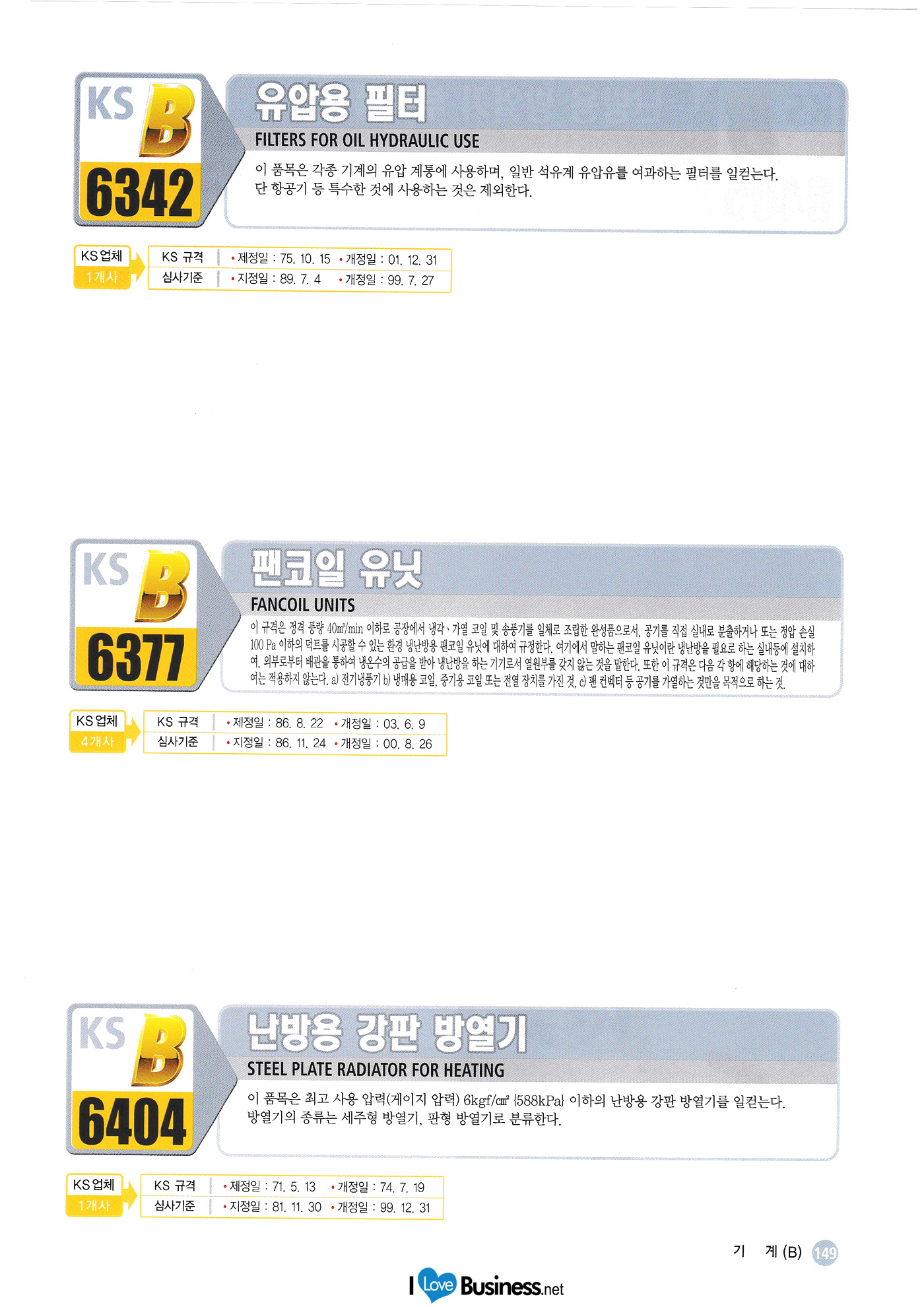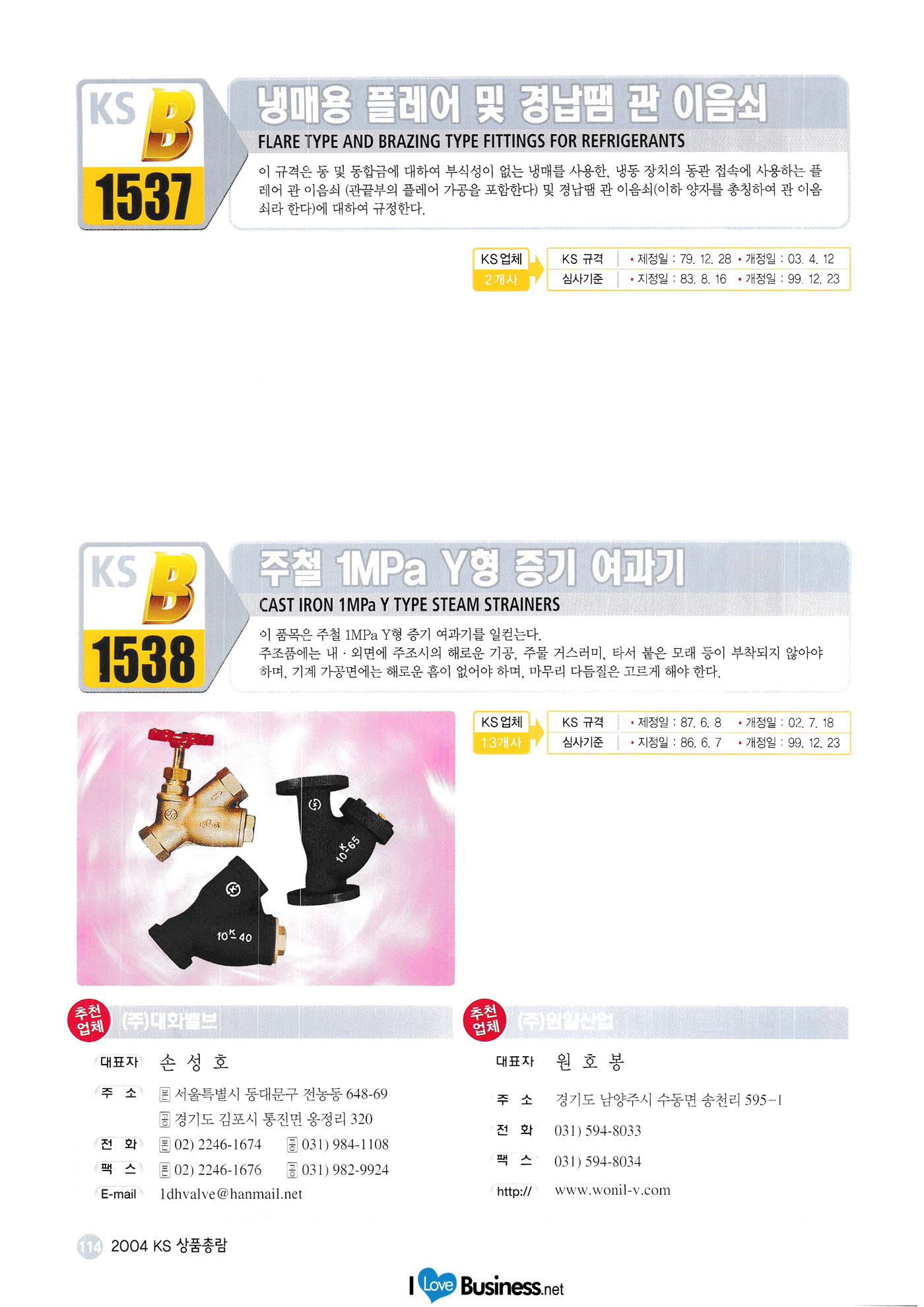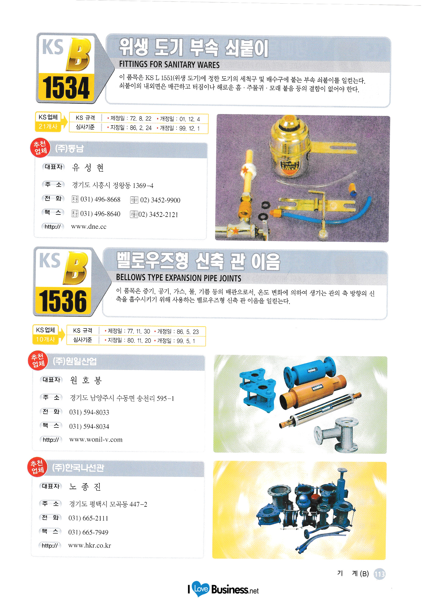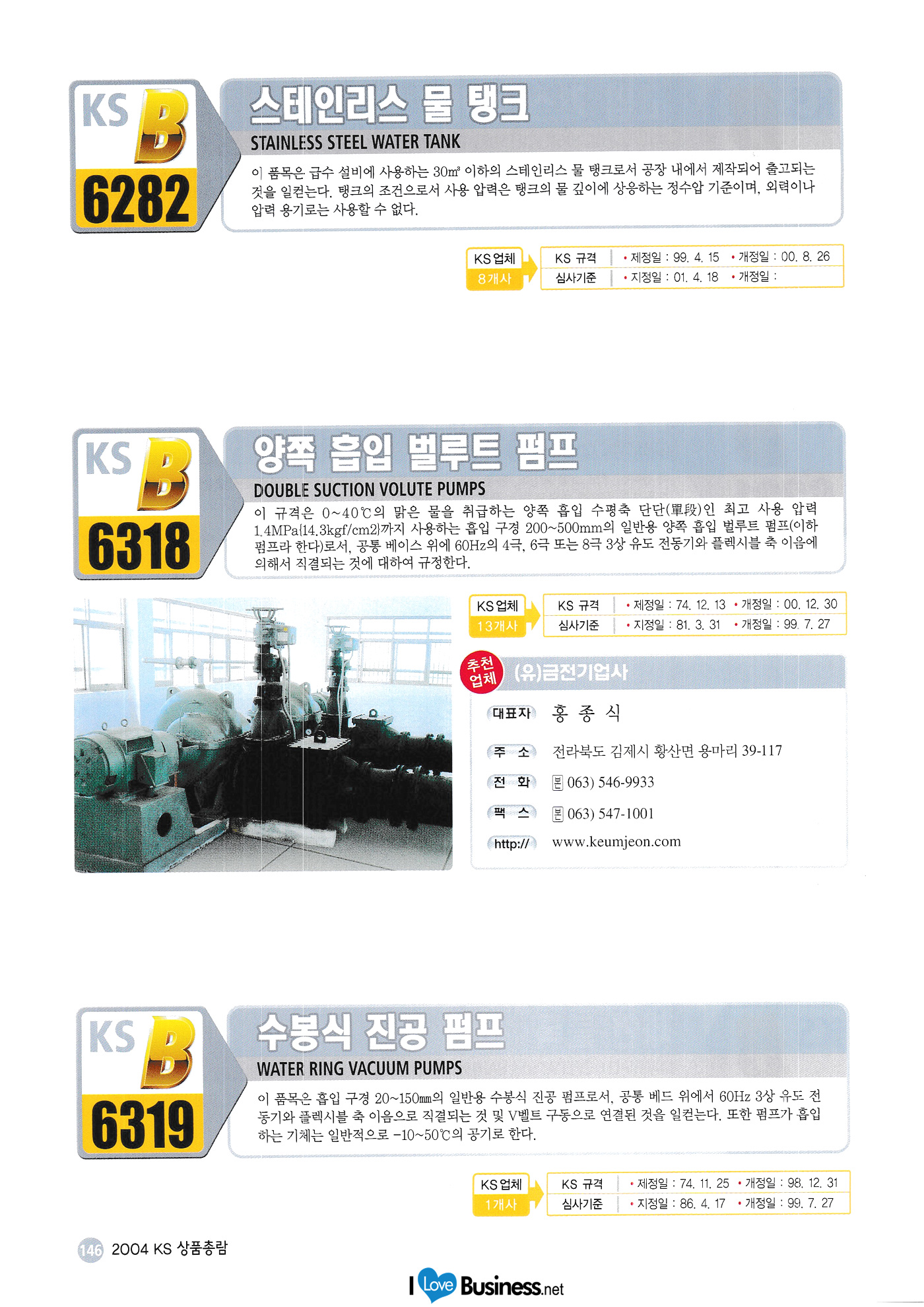 | 2004 Korea Product Overview Metal fittings attached to sanitary ware Bellows type expansion pipe joint Flare for refrigerant and brazing pipe fittings Cast iron 1MPa Y type steam filter Metal flexible hose Steel butt welded pipe fittings for piping Butt-welded pipe fitting made of steel plate for piping Copper alloy soldering pipe fittings Copper and copper alloy flared pipe fittings Polyethylene pipe fittings Stainless steel plate press type pipe fitting for general piping Flanged flexible shaft coupling Gear type shaft joint Roller chain shaft coupling Anti-vibration spring hanger Anti-vibration rubber mount Anti-vibration spring mount Floor drain Siphon for high tank Fill valve for low tank (ball tap) Flush valve for low tank (siphon) Steel ball for ball bearing Deep groove ball bearing Tapered roller bearings Ball bearings for rolling bearing units Bronze valve Ball valve Flushing valve water tap Water divisor valve Butterfly valve for water Ductile cast iron water valve for water supply Water air valve Water fountain with birds Cast iron valve Cast Steel Flanged Valve Flushing valve Automatic air release valve for water Leaf spring Hot formed coil spring Cold Formed Compression Coil Spring Cold Formed Tension Coil Spring Oil seal O ring Wafer Type Rubber Butterfly Valve pliers Radio pliers Powerful nipper Combination flyer spanner Monkey wrench screwdriver Pipe wrench Ironwork file Handwork hacksaw blade Morse Taper Shank Drill Straight shank drill Hand tap for metric thread Hand tap for unify normal screw Normal vise (corner type) Manual gas cutting machine Manual gas welding machine Pressure regulator for welding cutters Normalizing and annealing processing of steel Induction hardening and tempering processing of steel Quenching and tempering of steel Gas nitriding processing of steel Forced tape measure Textile tape measure Tangential flow airfoil type water meter Accumulator calorimeter Bourdon tube pressure gauge Diaphragm type gas kiter Oil meter Connection type hot water meter High pressure water meter Tensile testing machine Brinell hardness tester Compression tester Brinell hardness tester Compression tester Universal Testing Machine Biological Microscope for Drying System Lenses Overhead projector Piston ring Gas valve Stop valve for refrigerant Spray gun and cup Temperature limiter and thermostat for hot water boiler Seamless forced high pressure gas container Welding forced liquefied petroleum gas container (for refilling) Valves for liquefied petroleum gas containers General Purpose Liquefied Petroleum Gas (LPG) Pressure Regulator Valves for high pressure gas containers Gun type oil burner Roller for belt conveyor Chain block Stainless steel water tank Double suction volute pump Water ring vacuum pump Submersible motor pump for deep wells Submersible motor pump for drainage Forward Wing Blower Hydraulic filter Fan coil unit Heating steel plate radiator Heating radiator accessories Cylindrical, tubular and box door locks Industrial caster Construction submersible pump |