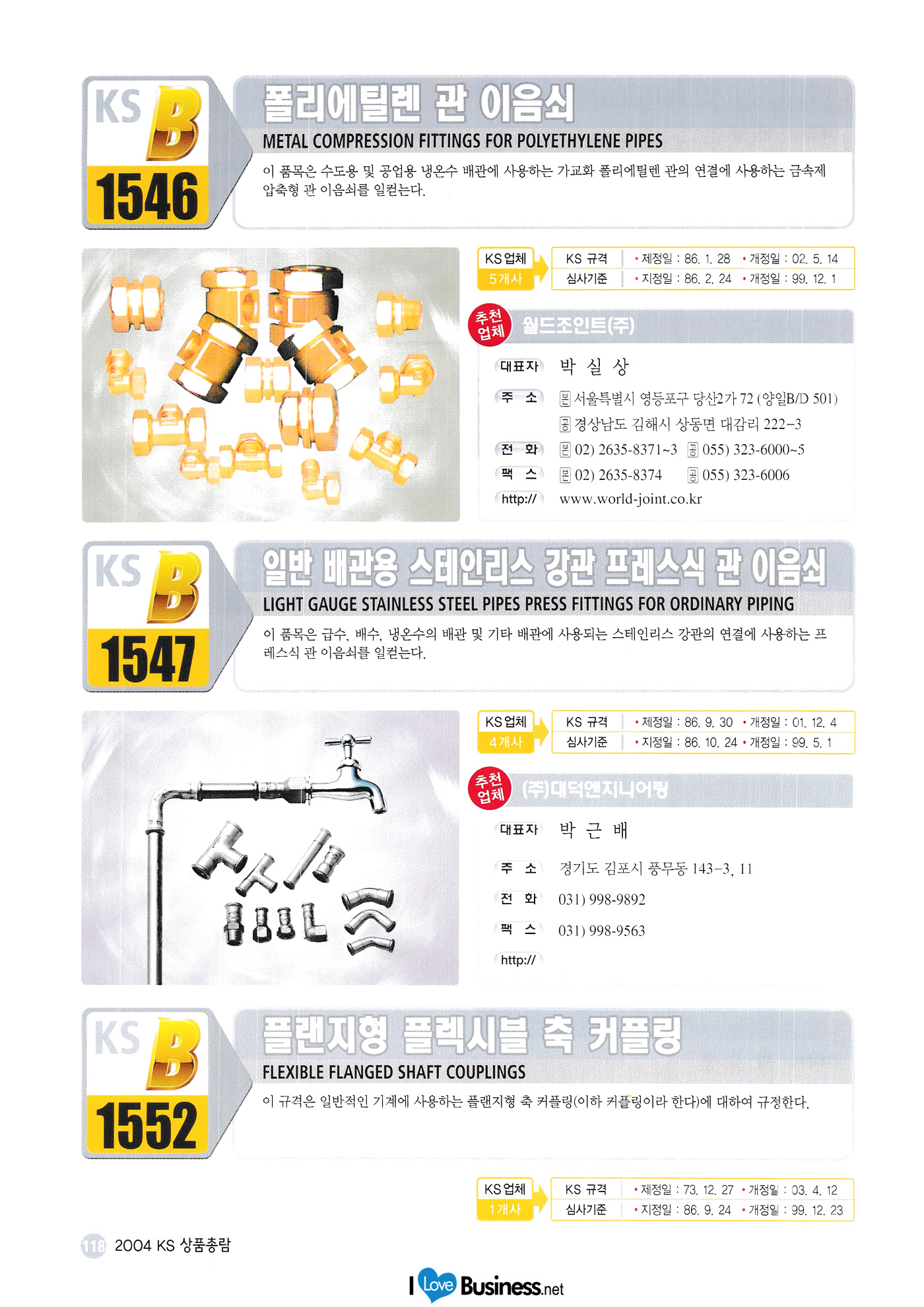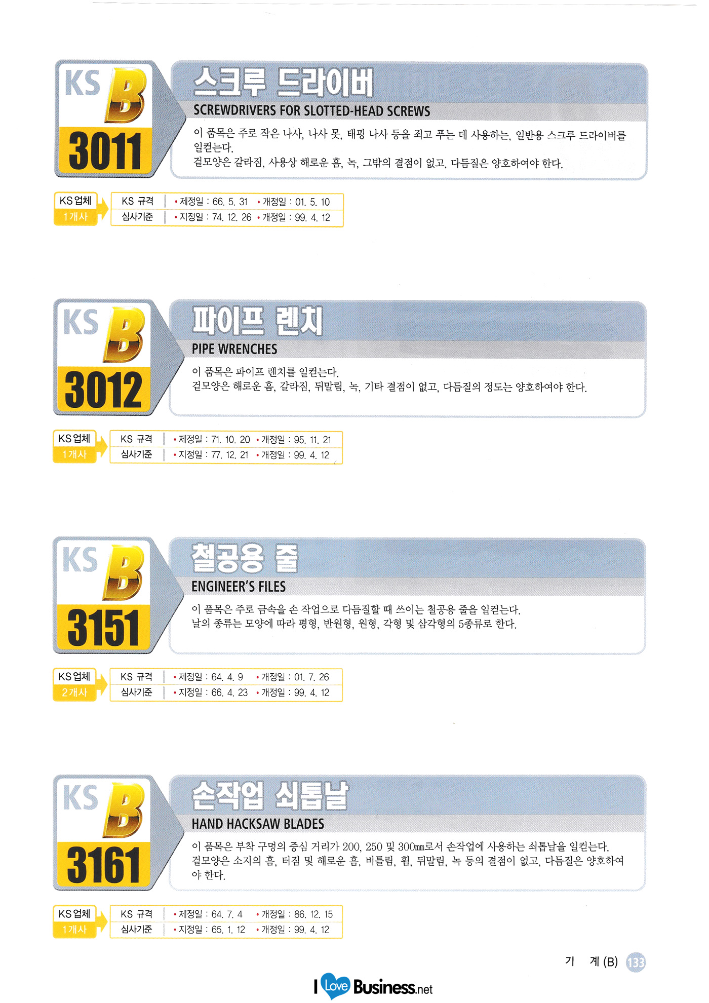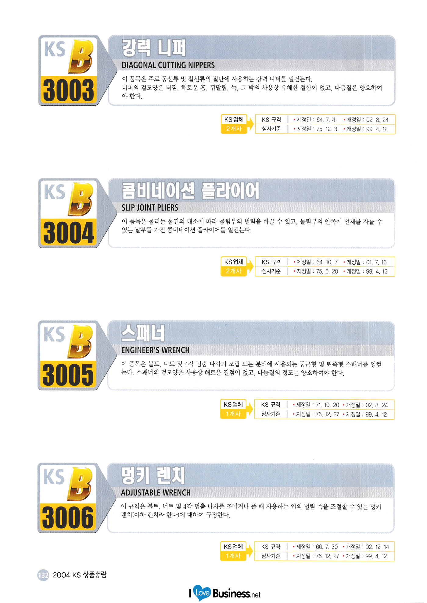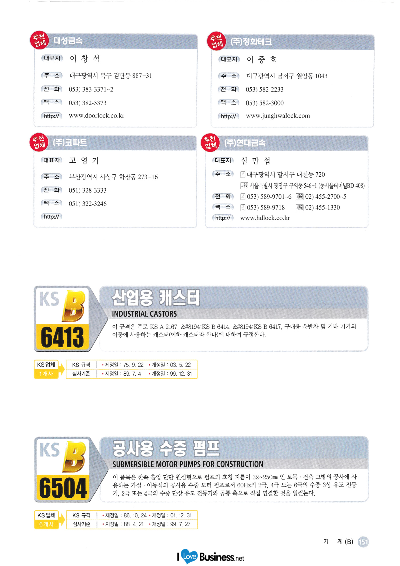 | 2004 Korea Product Overview Metal fittings attached to sanitary ware Bellows type expansion pipe joint Flare for refrigerant and brazing pipe fittings Cast iron 1MPa Y type steam filter Metal flexible hose Steel butt welded pipe fittings for piping Butt-welded pipe fitting made of steel plate for piping Copper alloy soldering pipe fittings Copper and copper alloy flared pipe fittings Polyethylene pipe fittings Stainless steel plate press type pipe fitting for general piping Flanged flexible shaft coupling Gear type shaft joint Roller chain shaft coupling Anti-vibration spring hanger Anti-vibration rubber mount Anti-vibration spring mount Floor drain Siphon for high tank Fill valve for low tank (ball tap) Flush valve for low tank (siphon) Steel ball for ball bearing Deep groove ball bearing Tapered roller bearings Ball bearings for rolling bearing units Bronze valve Ball valve Flushing valve water tap Water divisor valve Butterfly valve for water Ductile cast iron water valve for water supply Water air valve Water fountain with birds Cast iron valve Cast Steel Flanged Valve Flushing valve Automatic air release valve for water Leaf spring Hot formed coil spring Cold Formed Compression Coil Spring Cold Formed Tension Coil Spring Oil seal O ring Wafer Type Rubber Butterfly Valve pliers Radio pliers Powerful nipper Combination flyer spanner Monkey wrench screwdriver Pipe wrench Ironwork file Handwork hacksaw blade Morse Taper Shank Drill Straight shank drill Hand tap for metric thread Hand tap for unify normal screw Normal vise (corner type) Manual gas cutting machine Manual gas welding machine Pressure regulator for welding cutters Normalizing and annealing processing of steel Induction hardening and tempering processing of steel Quenching and tempering of steel Gas nitriding processing of steel Forced tape measure Textile tape measure Tangential flow airfoil type water meter Accumulator calorimeter Bourdon tube pressure gauge Diaphragm type gas kiter Oil meter Connection type hot water meter High pressure water meter Tensile testing machine Brinell hardness tester Compression tester Brinell hardness tester Compression tester Universal Testing Machine Biological Microscope for Drying System Lenses Overhead projector Piston ring Gas valve Stop valve for refrigerant Spray gun and cup Temperature limiter and thermostat for hot water boiler Seamless forced high pressure gas container Welding forced liquefied petroleum gas container (for refilling) Valves for liquefied petroleum gas containers General Purpose Liquefied Petroleum Gas (LPG) Pressure Regulator Valves for high pressure gas containers Gun type oil burner Roller for belt conveyor Chain block Stainless steel water tank Double suction volute pump Water ring vacuum pump Submersible motor pump for deep wells Submersible motor pump for drainage Forward Wing Blower Hydraulic filter Fan coil unit Heating steel plate radiator Heating radiator accessories Cylindrical, tubular and box door locks Industrial caster Construction submersible pump |