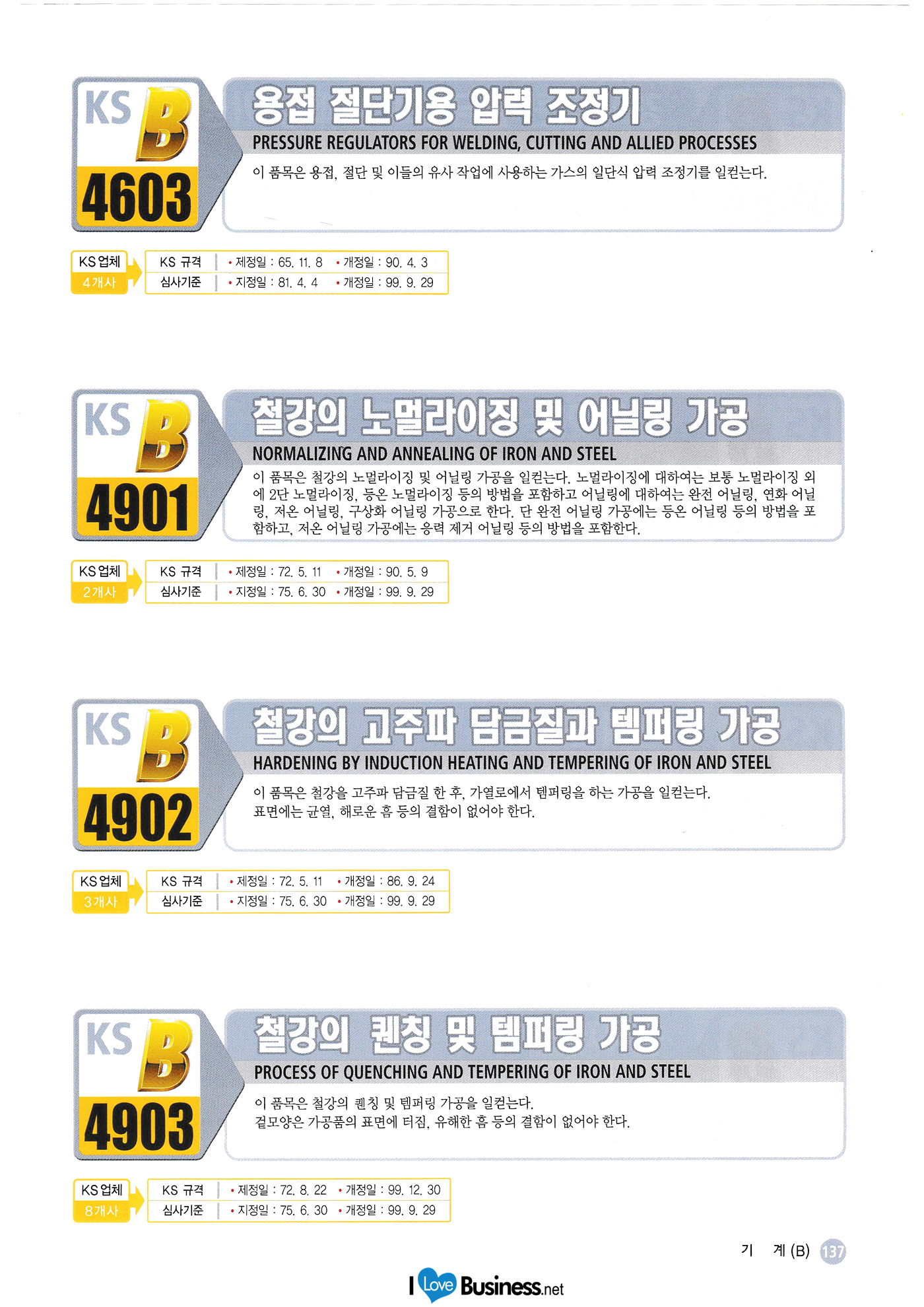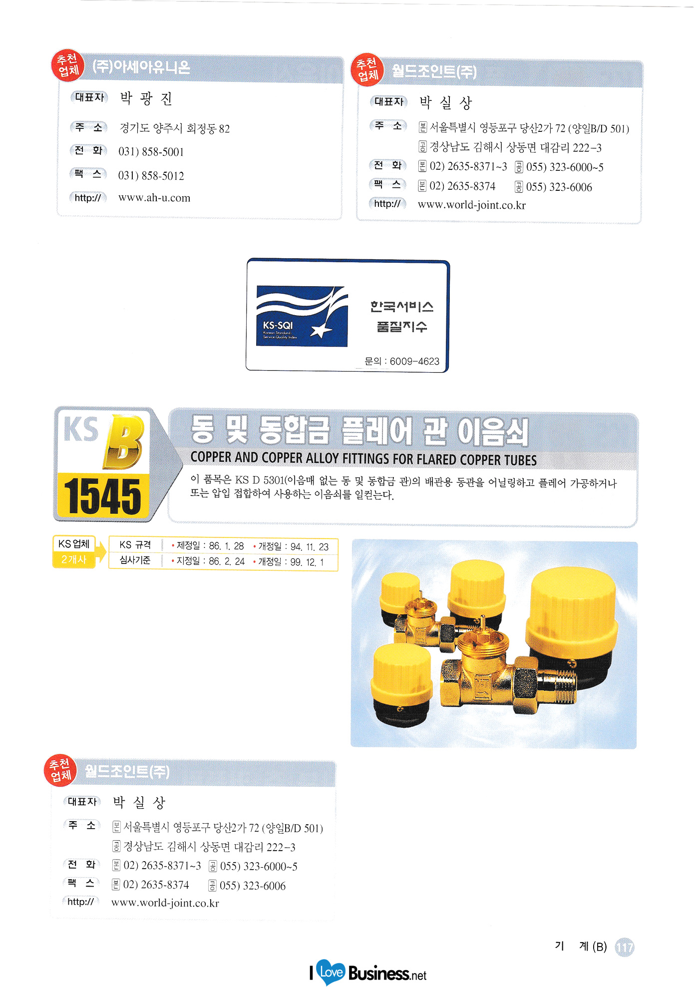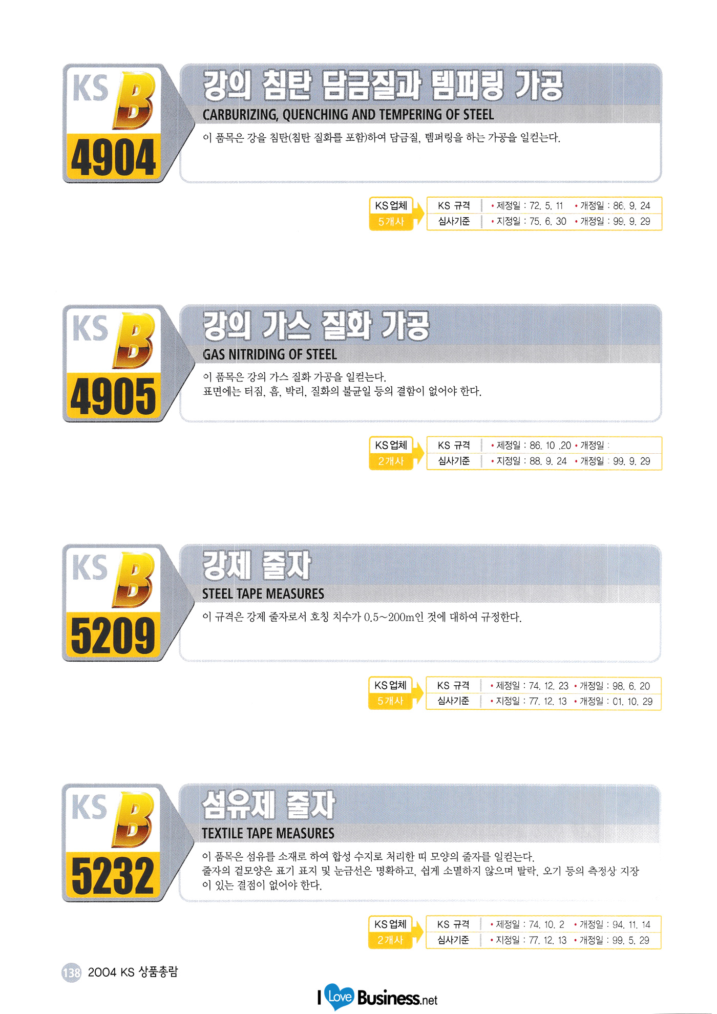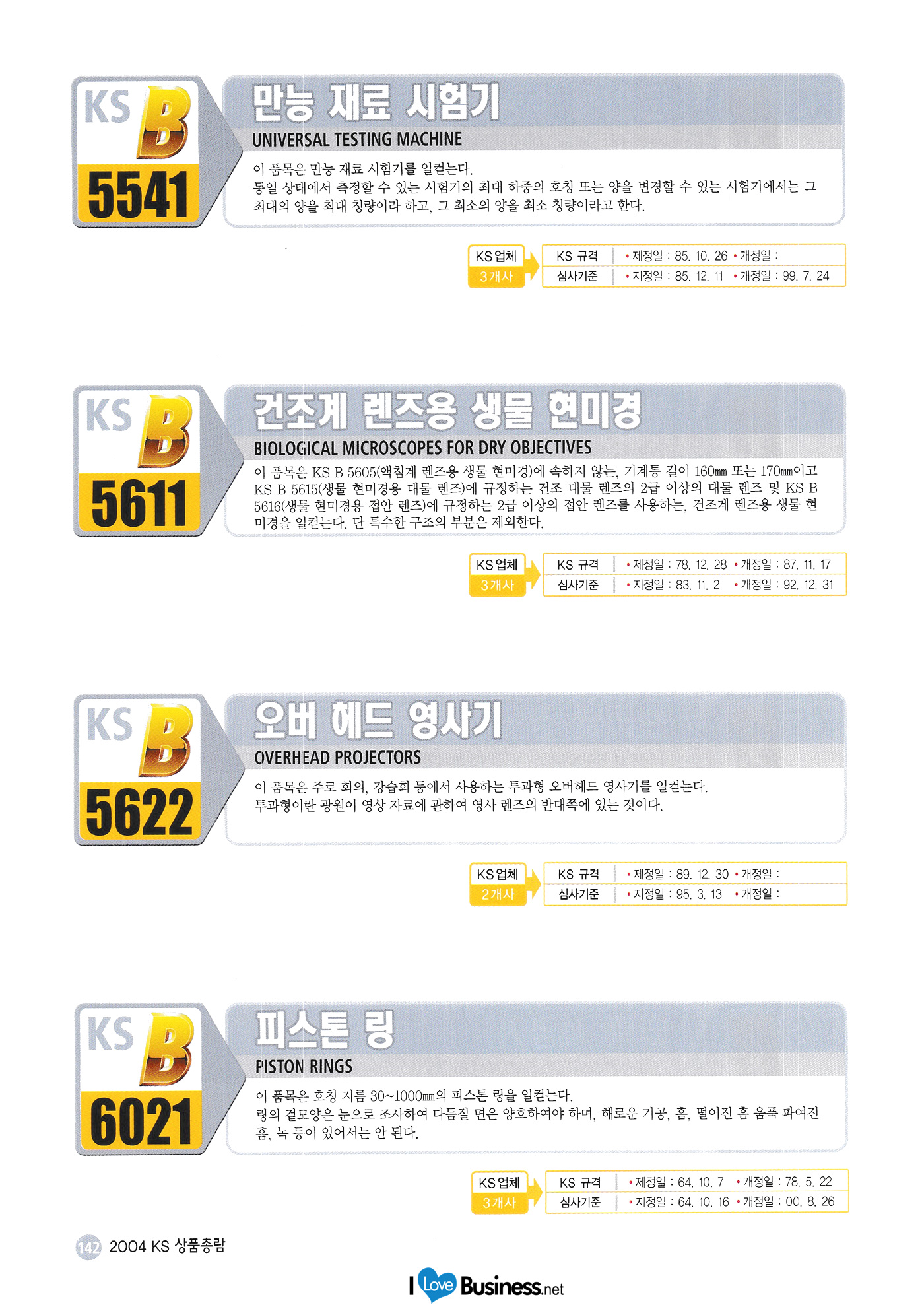 | 2004 Korea Product Overview Metal fittings attached to sanitary ware Bellows type expansion pipe joint Flare for refrigerant and brazing pipe fittings Cast iron 1MPa Y type steam filter Metal flexible hose Steel butt welded pipe fittings for piping Butt-welded pipe fitting made of steel plate for piping Copper alloy soldering pipe fittings Copper and copper alloy flared pipe fittings Polyethylene pipe fittings Stainless steel plate press type pipe fitting for general piping Flanged flexible shaft coupling Gear type shaft joint Roller chain shaft coupling Anti-vibration spring hanger Anti-vibration rubber mount Anti-vibration spring mount Floor drain Siphon for high tank Fill valve for low tank (ball tap) Flush valve for low tank (siphon) Steel ball for ball bearing Deep groove ball bearing Tapered roller bearings Ball bearings for rolling bearing units Bronze valve Ball valve Flushing valve water tap Water divisor valve Butterfly valve for water Ductile cast iron water valve for water supply Water air valve Water fountain with birds Cast iron valve Cast Steel Flanged Valve Flushing valve Automatic air release valve for water Leaf spring Hot formed coil spring Cold Formed Compression Coil Spring Cold Formed Tension Coil Spring Oil seal O ring Wafer Type Rubber Butterfly Valve pliers Radio pliers Powerful nipper Combination flyer spanner Monkey wrench screwdriver Pipe wrench Ironwork file Handwork hacksaw blade Morse Taper Shank Drill Straight shank drill Hand tap for metric thread Hand tap for unify normal screw Normal vise (corner type) Manual gas cutting machine Manual gas welding machine Pressure regulator for welding cutters Normalizing and annealing processing of steel Induction hardening and tempering processing of steel Quenching and tempering of steel Gas nitriding processing of steel Forced tape measure Textile tape measure Tangential flow airfoil type water meter Accumulator calorimeter Bourdon tube pressure gauge Diaphragm type gas kiter Oil meter Connection type hot water meter High pressure water meter Tensile testing machine Brinell hardness tester Compression tester Brinell hardness tester Compression tester Universal Testing Machine Biological Microscope for Drying System Lenses Overhead projector Piston ring Gas valve Stop valve for refrigerant Spray gun and cup Temperature limiter and thermostat for hot water boiler Seamless forced high pressure gas container Welding forced liquefied petroleum gas container (for refilling) Valves for liquefied petroleum gas containers General Purpose Liquefied Petroleum Gas (LPG) Pressure Regulator Valves for high pressure gas containers Gun type oil burner Roller for belt conveyor Chain block Stainless steel water tank Double suction volute pump Water ring vacuum pump Submersible motor pump for deep wells Submersible motor pump for drainage Forward Wing Blower Hydraulic filter Fan coil unit Heating steel plate radiator Heating radiator accessories Cylindrical, tubular and box door locks Industrial caster Construction submersible pump |