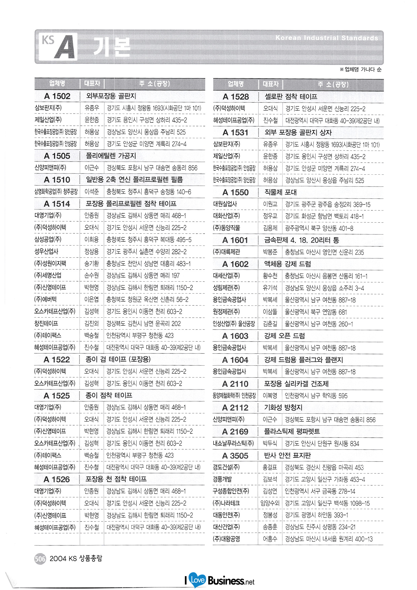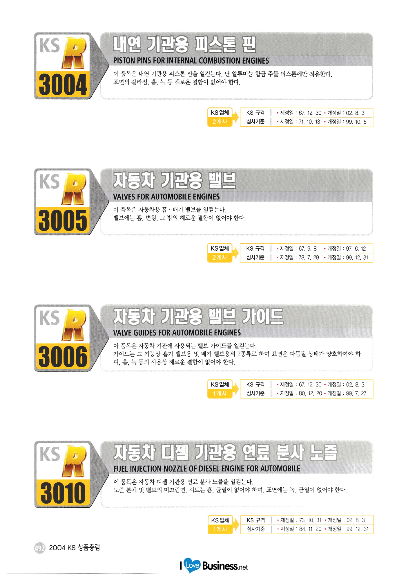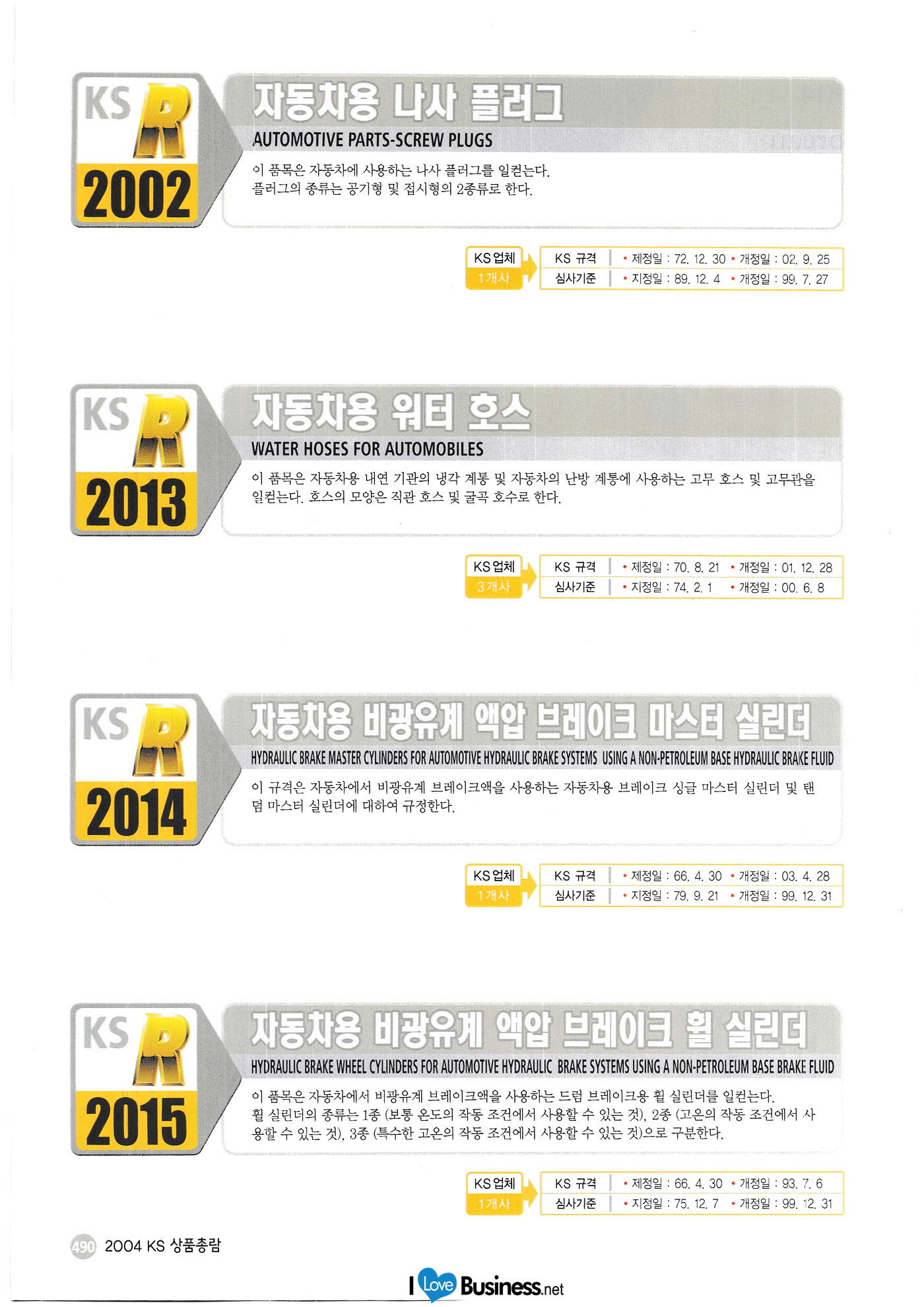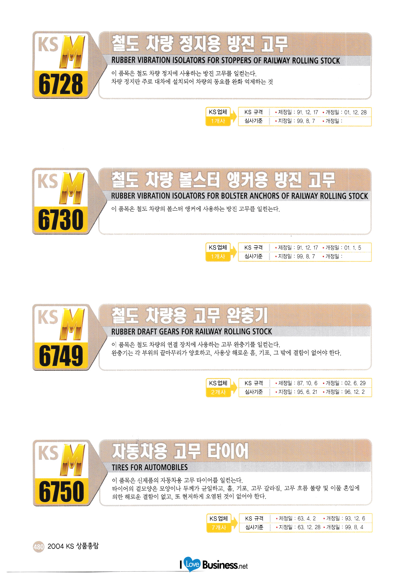 | 2004 한국 상품총람 철도차량정지용 방진고무 철도 차량볼스터 앵커용 방지고무 철도 차량용 고무 완충기 자동차용 고무타이어 산업 차량 및 건설 차량용 고무 타이어 농업 차량용 고무 타이어 2륜 자동차용 고무타이어 방진 마스크용 여과재 재생 고무 블록 골판지용 골심지 신문용지 두루마리화장지 마닐라 판지 벽지 크라프트지 골판지용 라이너 <의료> 1회용 플라스틱 주사기 의료용 고압 증기 멸균기 혈액, 약품 냉장고 및 냉동고 수액 세트 차광 보호구 용접용 보호면 보호 안경 주상 안전대 <수송기계> 자동차용 나사 플러그 자동차용 워터 호스 자동차용 비광유계 액압 브레이크 마스터 실린더 자동차용 비광유계 액압 브레이크 휠 실린더 자동차 배관용 금속관 자동차 기관용 반분할 미끄럼 베어링 자동차 기관용 실린더 라이너 자동차 기관용 피스톤 내연 기관용 피스톤 핀 자동차 기관용 밸브 자동차 기관용 밸브 가이드 자동차 디젤 기관용 연료 분사 노즐 자동차 기관용 실린더 헤드 개스킷 자동차용 와이퍼 블레이드 및 와이퍼 암 자동차 부품- 가솔린 기관용 스핀온형 오일 필터 기관용 공기 청정기 여과재 자동차용 클러치 디스크 자동차용 클러치 커버 통형 쇼크 업소버 자동차용 클러치 페이싱 자동차용 브레이크 라이닝 및 패드 자동차용 창틀 고무 자동차용 방진 고무 자동차 부품- 좌석벨트 자동차용 소음기 및 배기판 자동차 용품 – 연소자 보호 장치 자동차용 와이퍼 모터 자동차용 온수식 난방기 자동차용 정지 표시판 자동차용 유압식 휴대용 책 일반용 자전거 유사 산악 전용 자전거 경량 레일 보통 레일 <항공> 비행장 매립등 비행장 노출형 활주로등 및 유도로등 비행장 노출형 진입등 및 활주로말단등, 말단연장등, 종단등 섬광등 진입각 지시등(PAPI) 정전류 조정기 매립형 절연 변압기 |