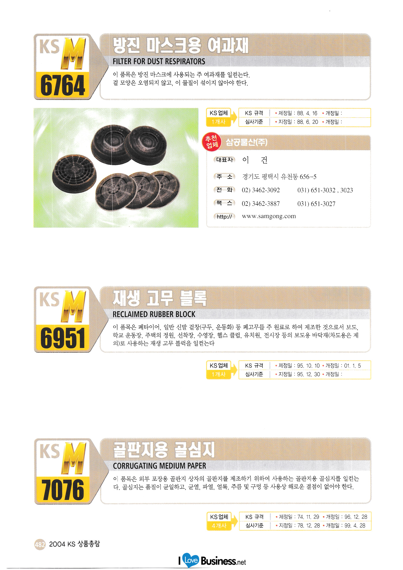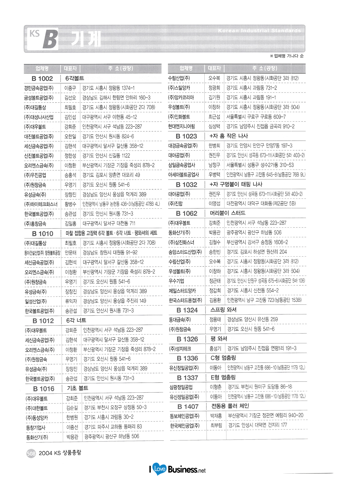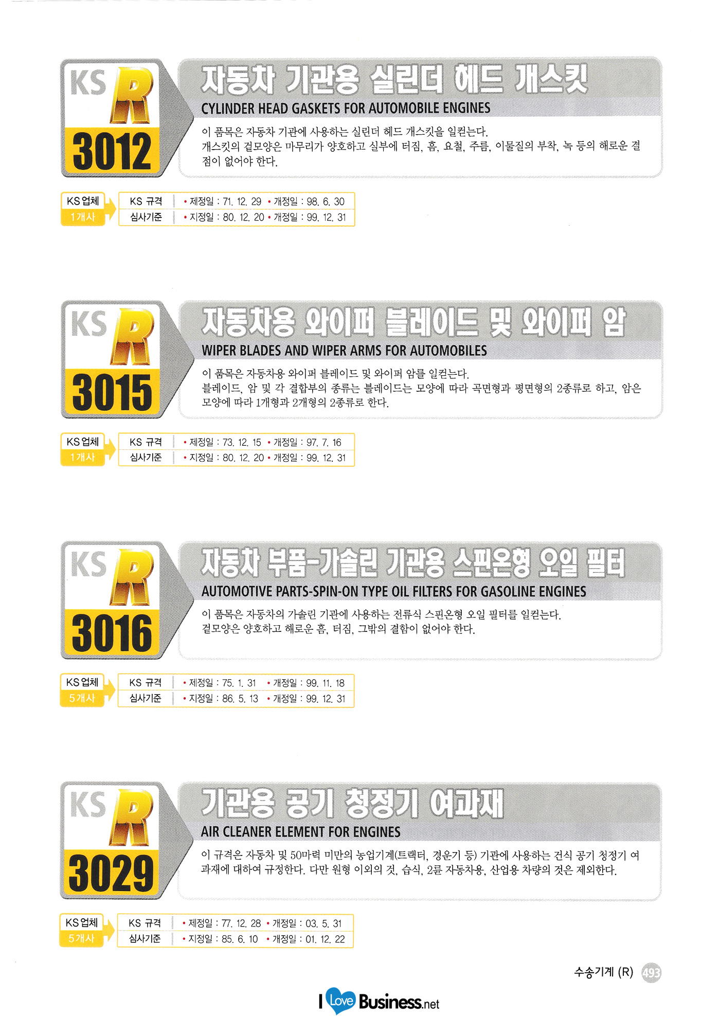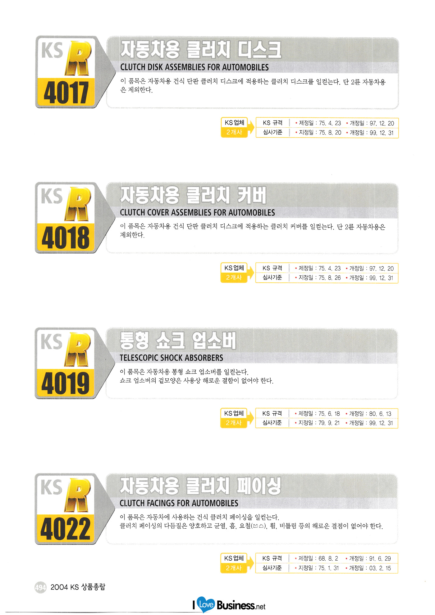 | 2004 한국 상품총람 철도차량정지용 방진고무 철도 차량볼스터 앵커용 방지고무 철도 차량용 고무 완충기 자동차용 고무타이어 산업 차량 및 건설 차량용 고무 타이어 농업 차량용 고무 타이어 2륜 자동차용 고무타이어 방진 마스크용 여과재 재생 고무 블록 골판지용 골심지 신문용지 두루마리화장지 마닐라 판지 벽지 크라프트지 골판지용 라이너 <의료> 1회용 플라스틱 주사기 의료용 고압 증기 멸균기 혈액, 약품 냉장고 및 냉동고 수액 세트 차광 보호구 용접용 보호면 보호 안경 주상 안전대 <수송기계> 자동차용 나사 플러그 자동차용 워터 호스 자동차용 비광유계 액압 브레이크 마스터 실린더 자동차용 비광유계 액압 브레이크 휠 실린더 자동차 배관용 금속관 자동차 기관용 반분할 미끄럼 베어링 자동차 기관용 실린더 라이너 자동차 기관용 피스톤 내연 기관용 피스톤 핀 자동차 기관용 밸브 자동차 기관용 밸브 가이드 자동차 디젤 기관용 연료 분사 노즐 자동차 기관용 실린더 헤드 개스킷 자동차용 와이퍼 블레이드 및 와이퍼 암 자동차 부품- 가솔린 기관용 스핀온형 오일 필터 기관용 공기 청정기 여과재 자동차용 클러치 디스크 자동차용 클러치 커버 통형 쇼크 업소버 자동차용 클러치 페이싱 자동차용 브레이크 라이닝 및 패드 자동차용 창틀 고무 자동차용 방진 고무 자동차 부품- 좌석벨트 자동차용 소음기 및 배기판 자동차 용품 – 연소자 보호 장치 자동차용 와이퍼 모터 자동차용 온수식 난방기 자동차용 정지 표시판 자동차용 유압식 휴대용 책 일반용 자전거 유사 산악 전용 자전거 경량 레일 보통 레일 <항공> 비행장 매립등 비행장 노출형 활주로등 및 유도로등 비행장 노출형 진입등 및 활주로말단등, 말단연장등, 종단등 섬광등 진입각 지시등(PAPI) 정전류 조정기 매립형 절연 변압기 |