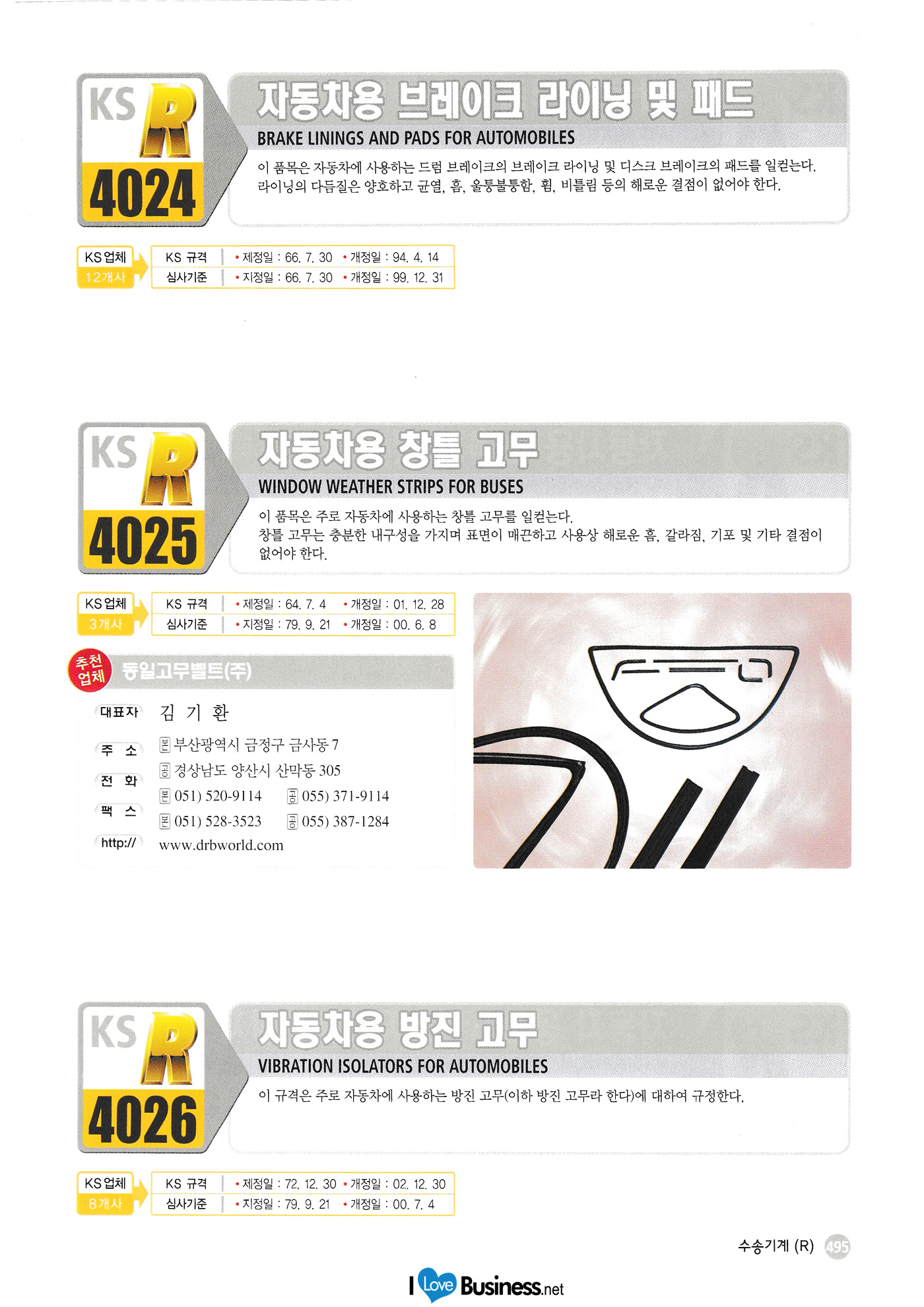 2004 Korea Product Overview Anti-vibration rubber for stopping railway vehicles Anti-Rubber for Railroad Vehicle Bolster Anchor Rubber shock absorbers for rail vehicles Automotive rubber tire Rubber tires for industrial and construction vehicles Rubber tires for agricultural vehicles Rubber tires for two-wheeled vehicles Filter material for dust mask Recycled rubber blocks Corrugated paper for corrugated board Newspaper Toilet paper Manila cardboard wallpaper Kraft paper Corrugated liner <Medical> Disposable plastic syringe High pressure steam sterilizer for medical use Blood and medication refrigerators and freezers Sap set Shading protection Protective surface for welding Protective glasses Pole safety <Transport machine> Automotive screw plug Automotive water hose Automotive non-mineral oil hydraulic brake master cylinder Non-mineral oil hydraulic brake wheel cylinder for automobile Metal pipe for automobile piping Semi-segment sliding bearings for automotive engines Cylinder liners for automobile engines Pistons for automobile engines Piston pins for internal combustion engines Valves for automotive engines Valve Guide for Automotive Engines Fuel injection nozzle for automobile diesel engine Cylinder head gasket for automobile engines Automotive wiper blades and wiper arms Auto parts-Spin-on oil filter for gasoline engines Air purifier filter media for engines Automotive clutch disc Automotive clutch cover Tubular shock absorber Automobile clutch facing Automotive brake linings and pads Car window frame rubber Anti-vibration rubber for automobiles Auto Parts-Seat Belt Silencers and cutouts for automobiles Automotive Supplies-Younger Protection Device Car wiper motor Automotive hot water heater Car stop sign Car hydraulic portable book General bike Similar mountain bikes Lightweight rail Ordinary rail <Air> Aerodrome reclamation light Airfield exposed runway and taxiway lights Airfield exposed access light, runway end light, end extension light, end light flash lamp Entry angle indicator (PAPI) Constant current regulator Flush Isolation Transformer |