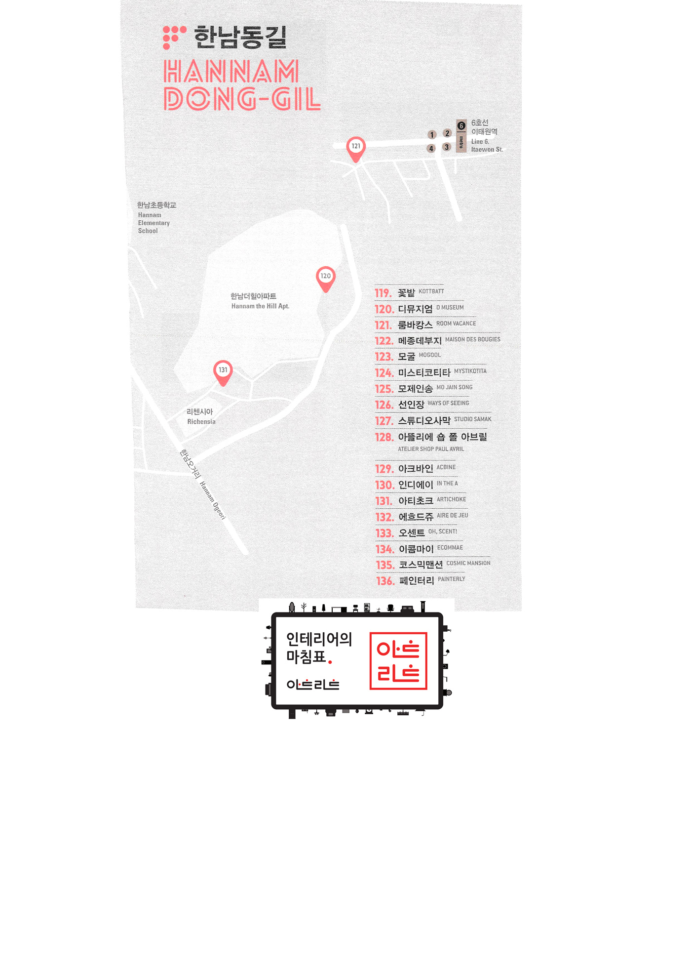 | <한남동길> 꽃밭 디뮤지엄 룸바캉스 메종데부지 모굴 미스티코티타 모제인송 선인장 스튜디오사막 아뜰리에 숍 폴 아브릴 아크바인 인디에이 아티초크 에흐드쥬 오센트 이콤마이 코스믹맨션 페인터리 |