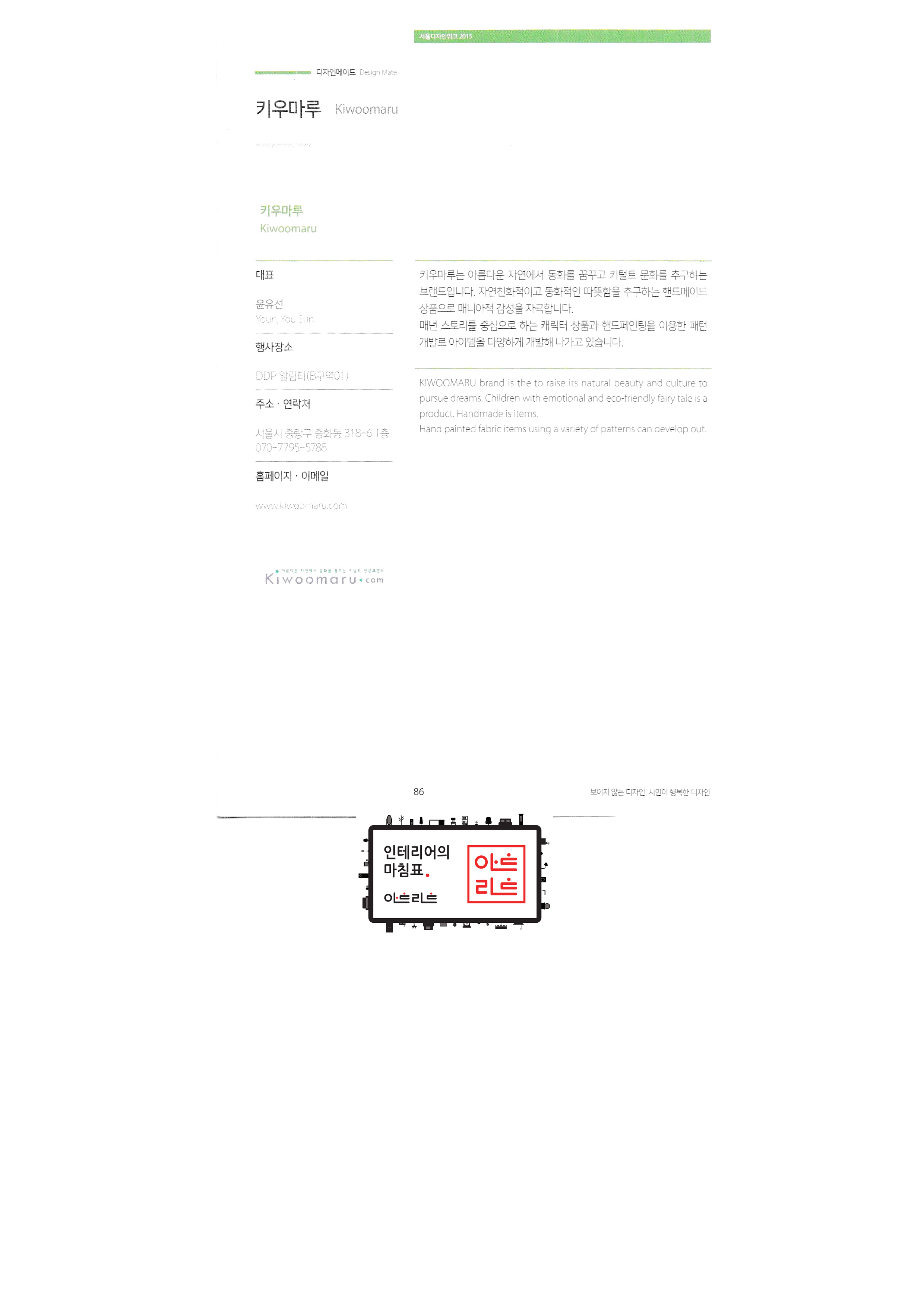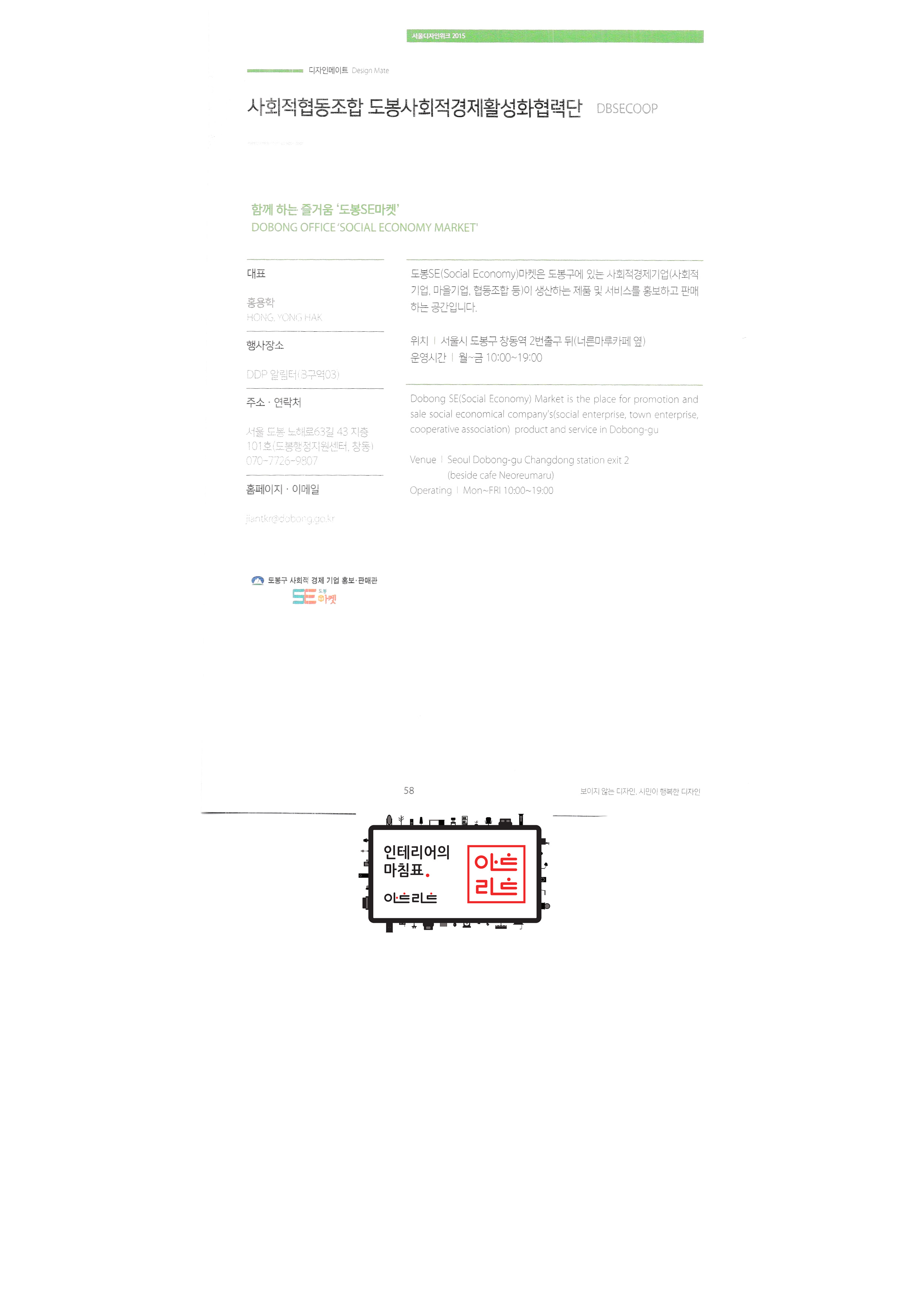 | 넛츠하우스 사회적협동조합 도봉사회적경제활성화협력단 라이크디즈 라잇트리디자인 리,플레이 블룸위드네이쳐&누리 시간이지나 엠큐이공일 오렌지 우아무아 이조 짐볼리쉬 카커메이미 컨셉스미싱 케이훼어스 키우마루 와이이케이글래스 |