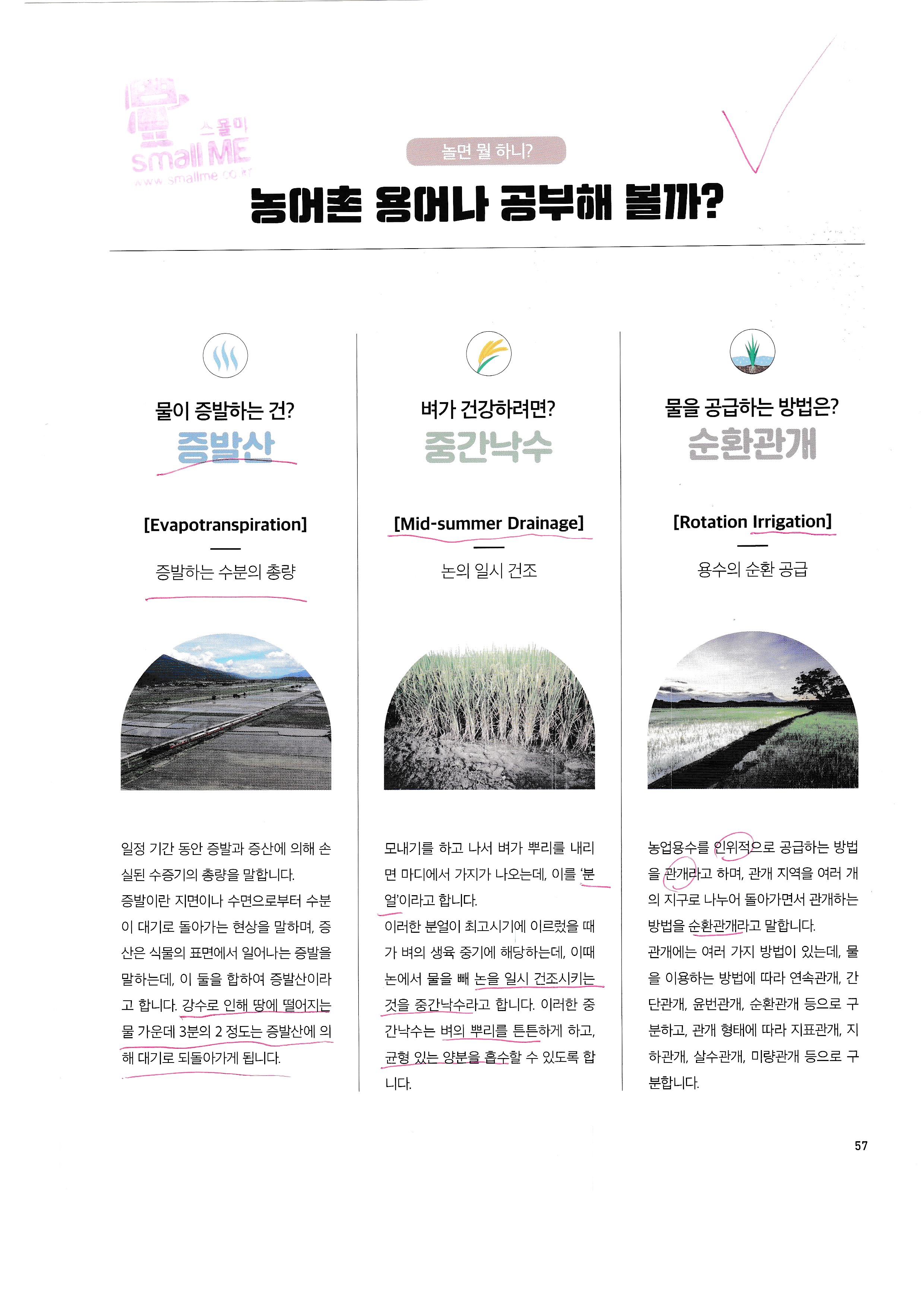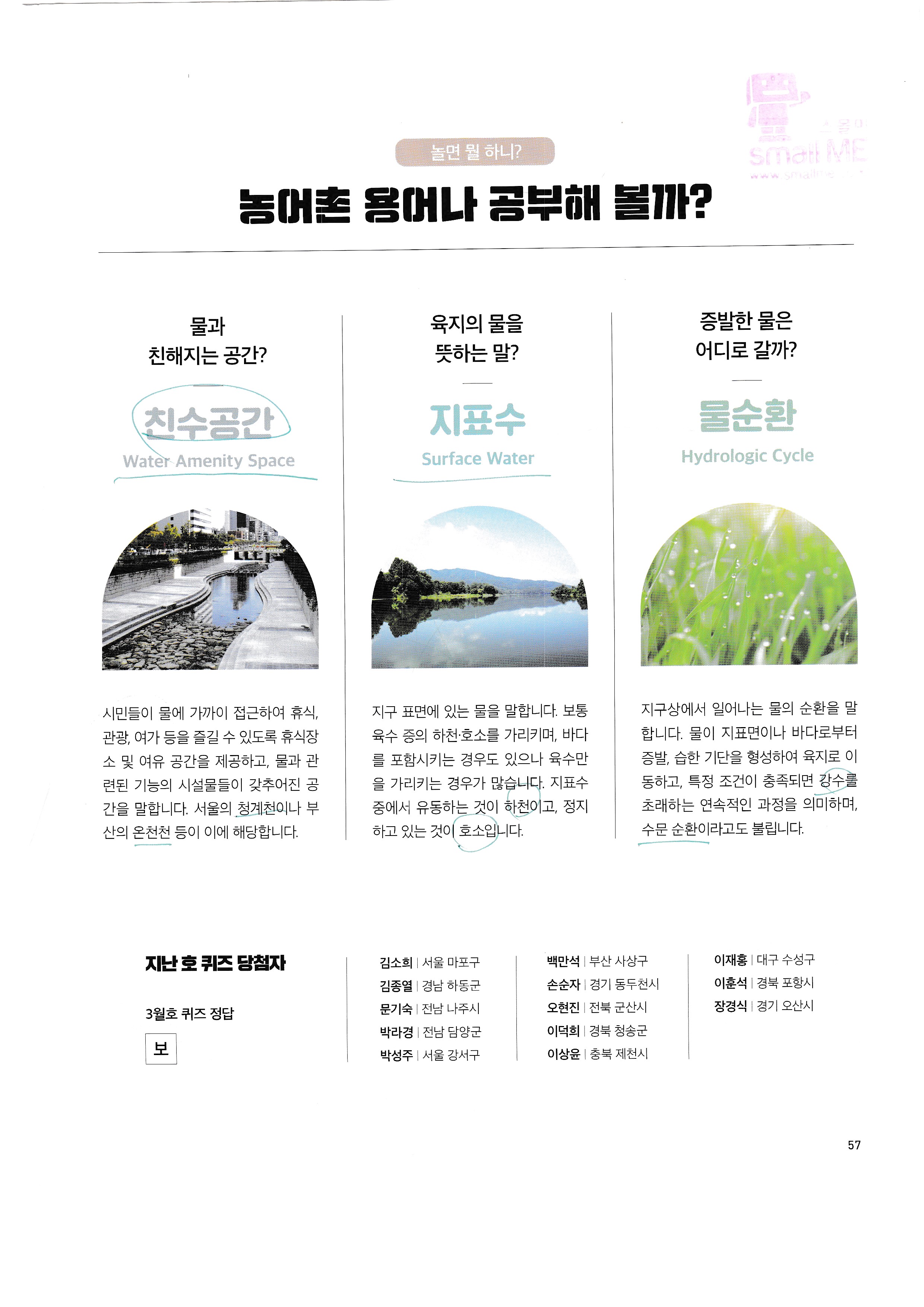 농어촌 용어 : 친수공간, 지표수, 물순환, 증발산, 중간낙수, 순환관개,