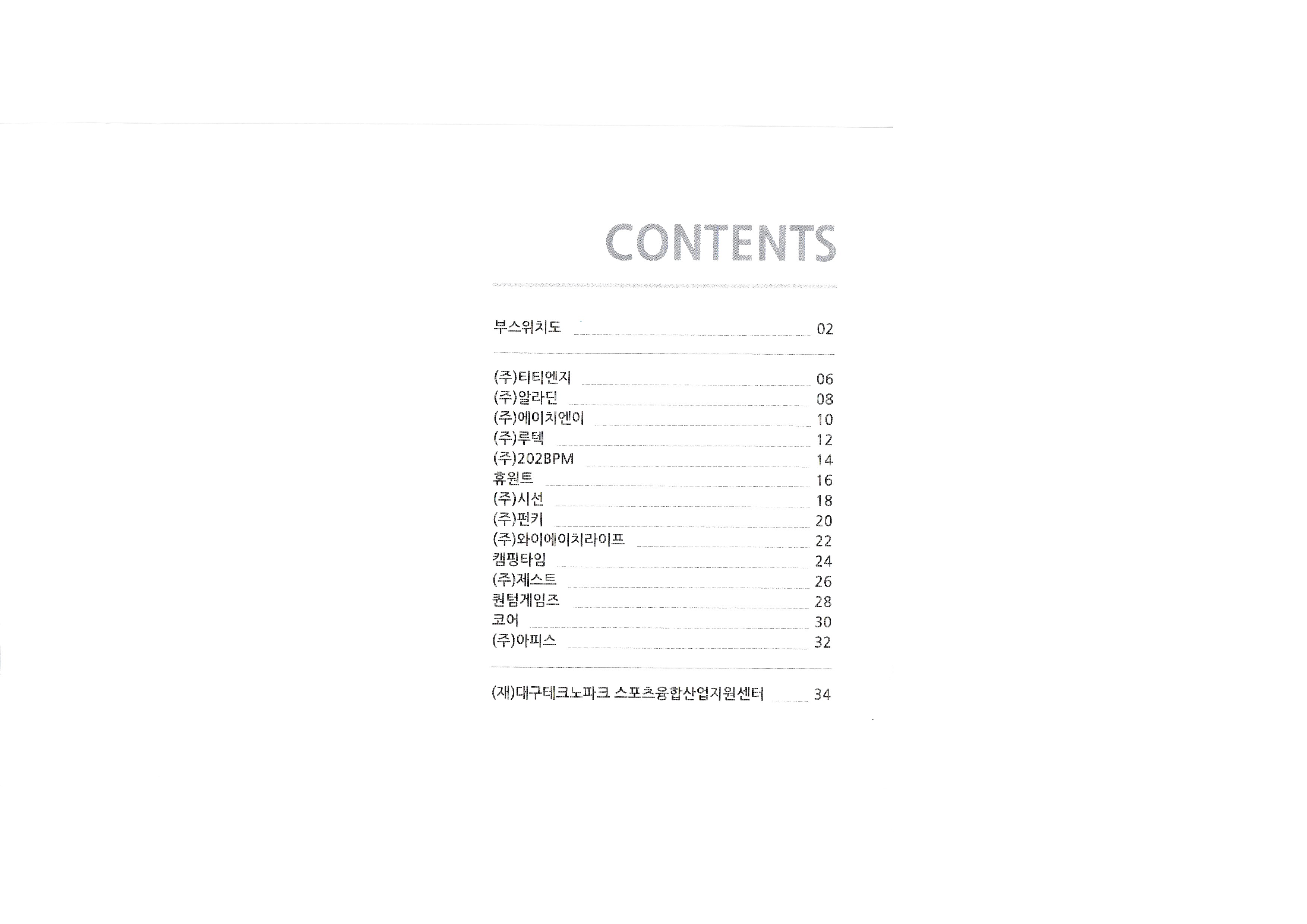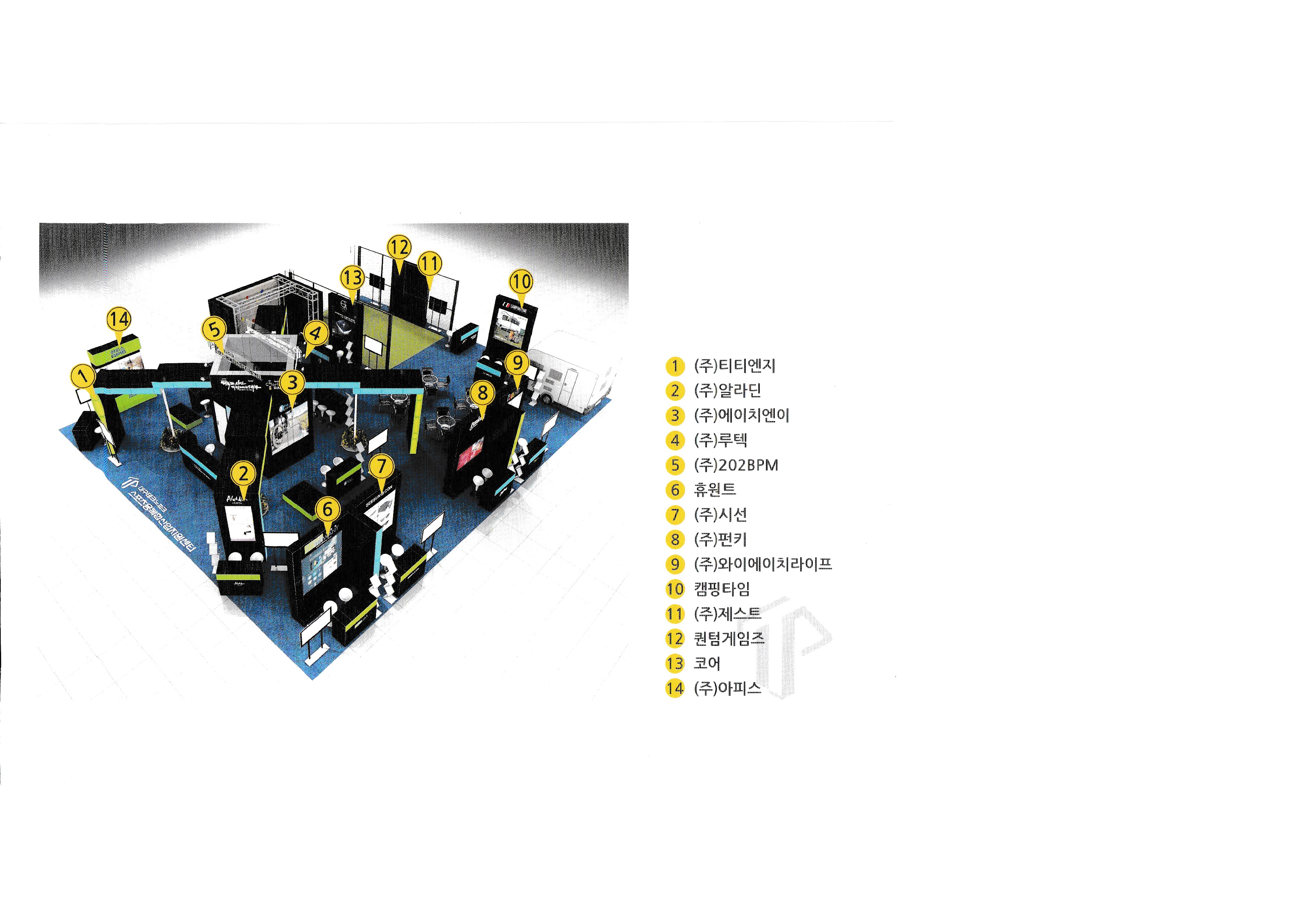 | (주)티티엔지 (주)알라딘 (주)에이치엔이 (주)루텍 (주)202BPM 휴원트 (주)시선 (주)펀키 (주)와이에이치라이프 캠핑타임 (주)제스트 퀀텀게임즈 코어 (주)아피스 |