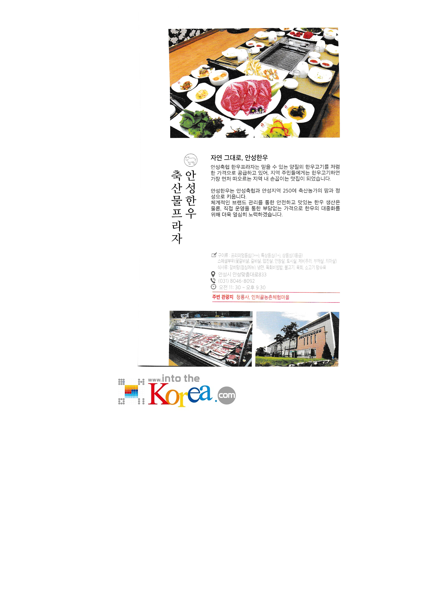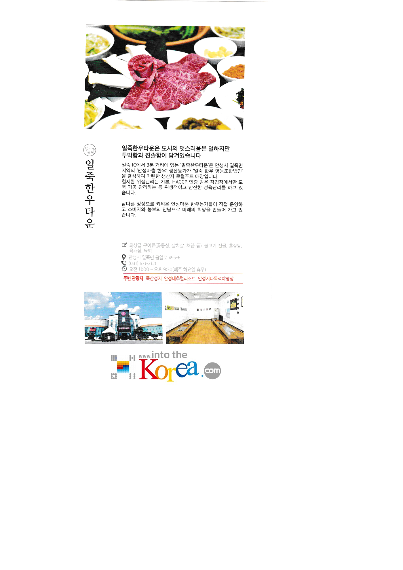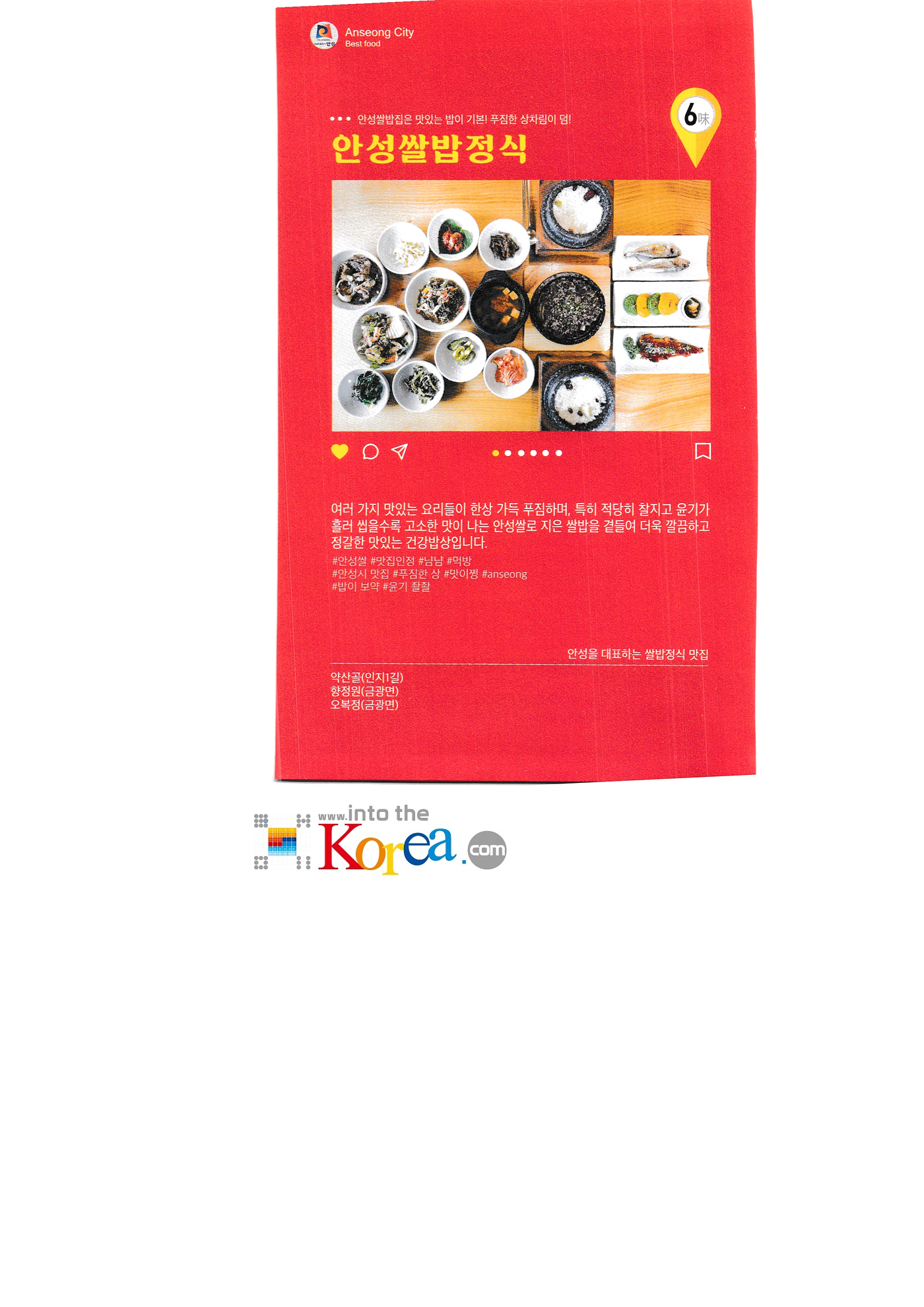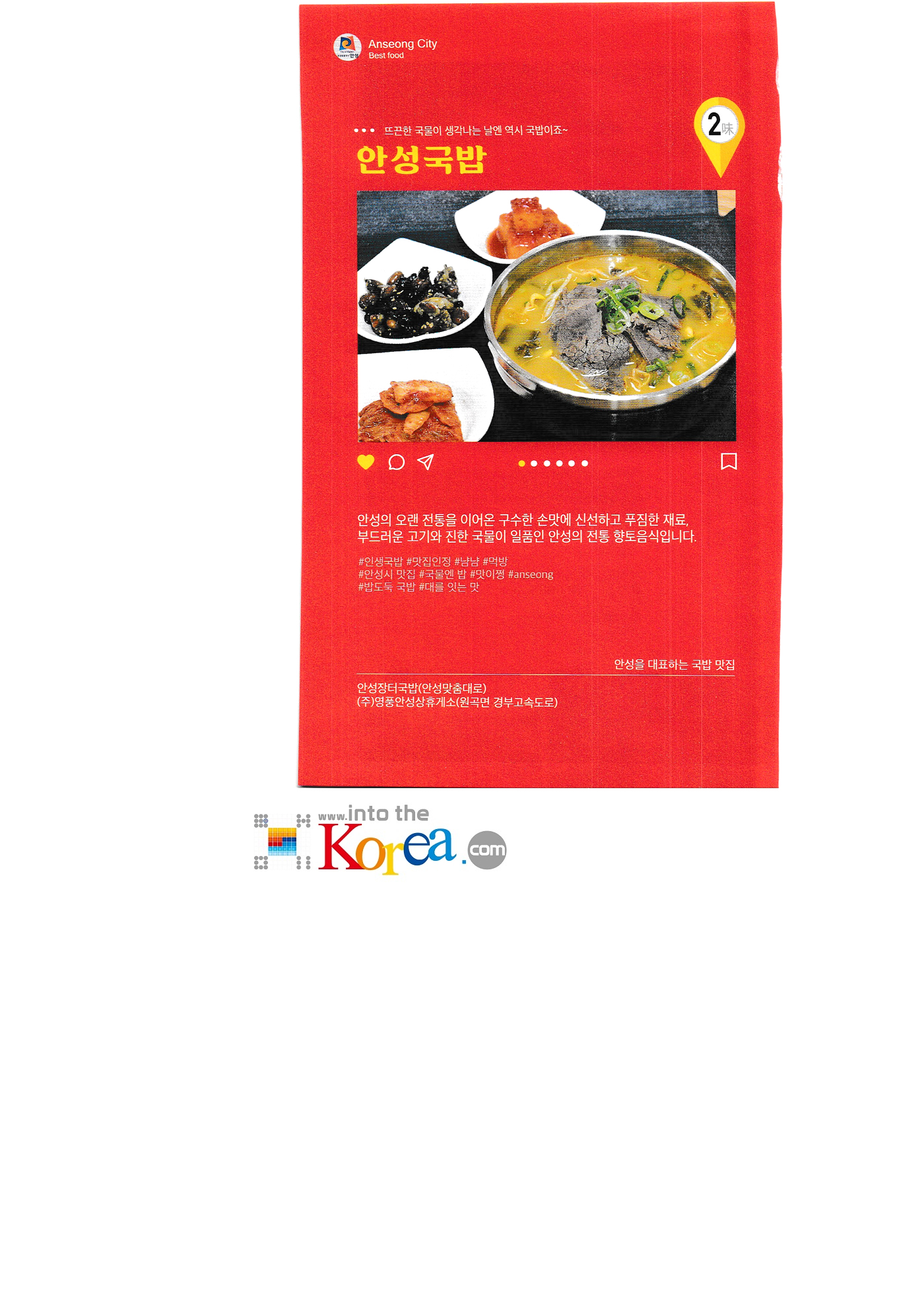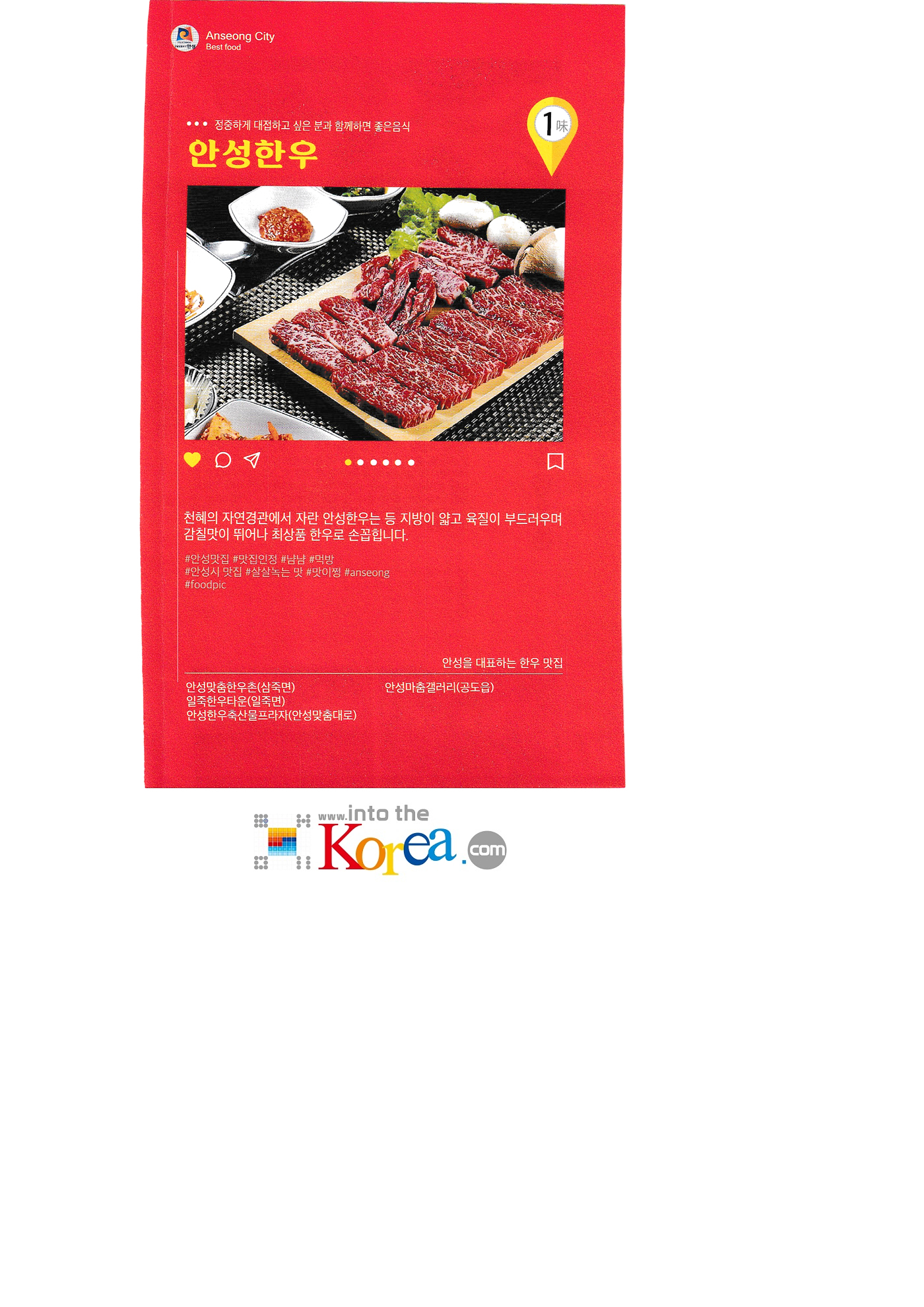 Anseong Korean Beef Anseongmatch Hanwoo Village Iljuk Hanwoo Town Anseong Hanwoo Livestock Plaza Anseong Marchum Gallery Anseong Gukbap Anjang Teo Soup Yeongpoong Anseongsang Rest Area Cheonggukjang Soli (Seoil Farm) Sungshin Restaurant Duribong freshwater porridge stub Namsan Goeul Jeonggane roe healthy rice cake Acorn acorn book Whole Pig and Acorn Central Branch Anseong rice set meal hyang garden Oh Bok-jeong |