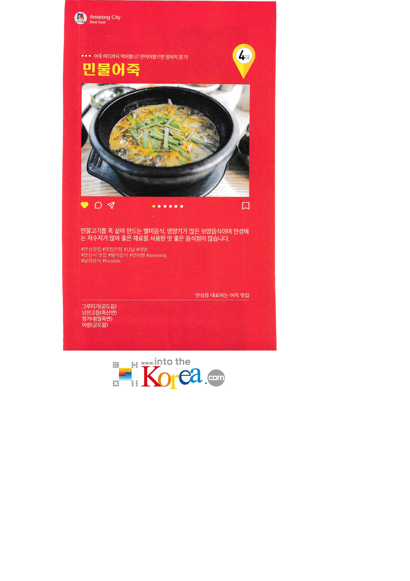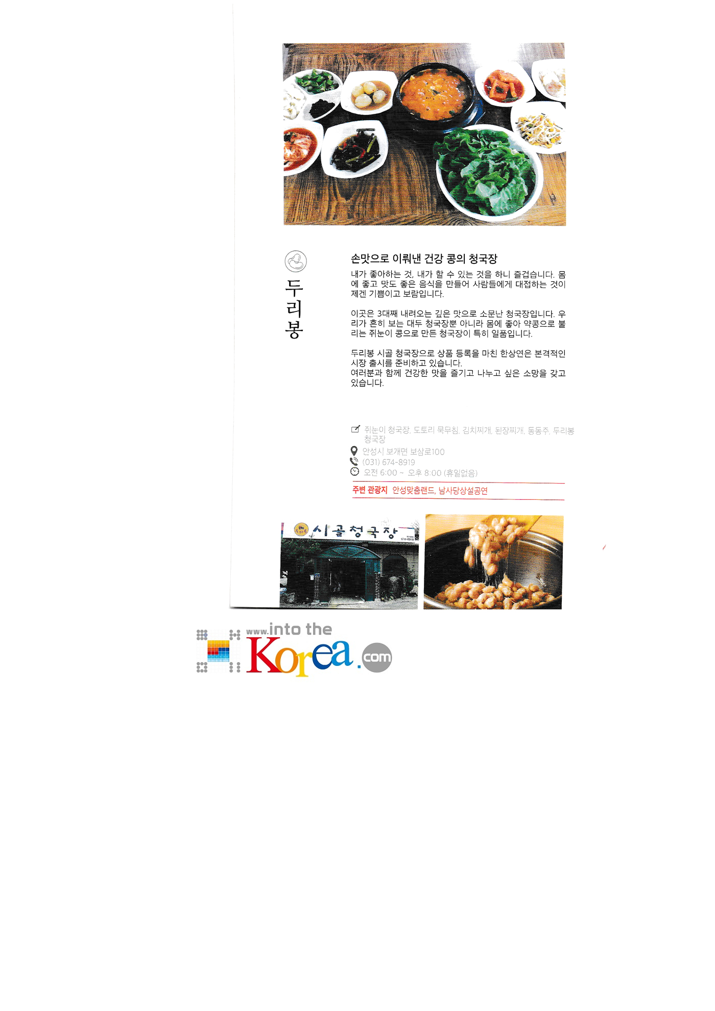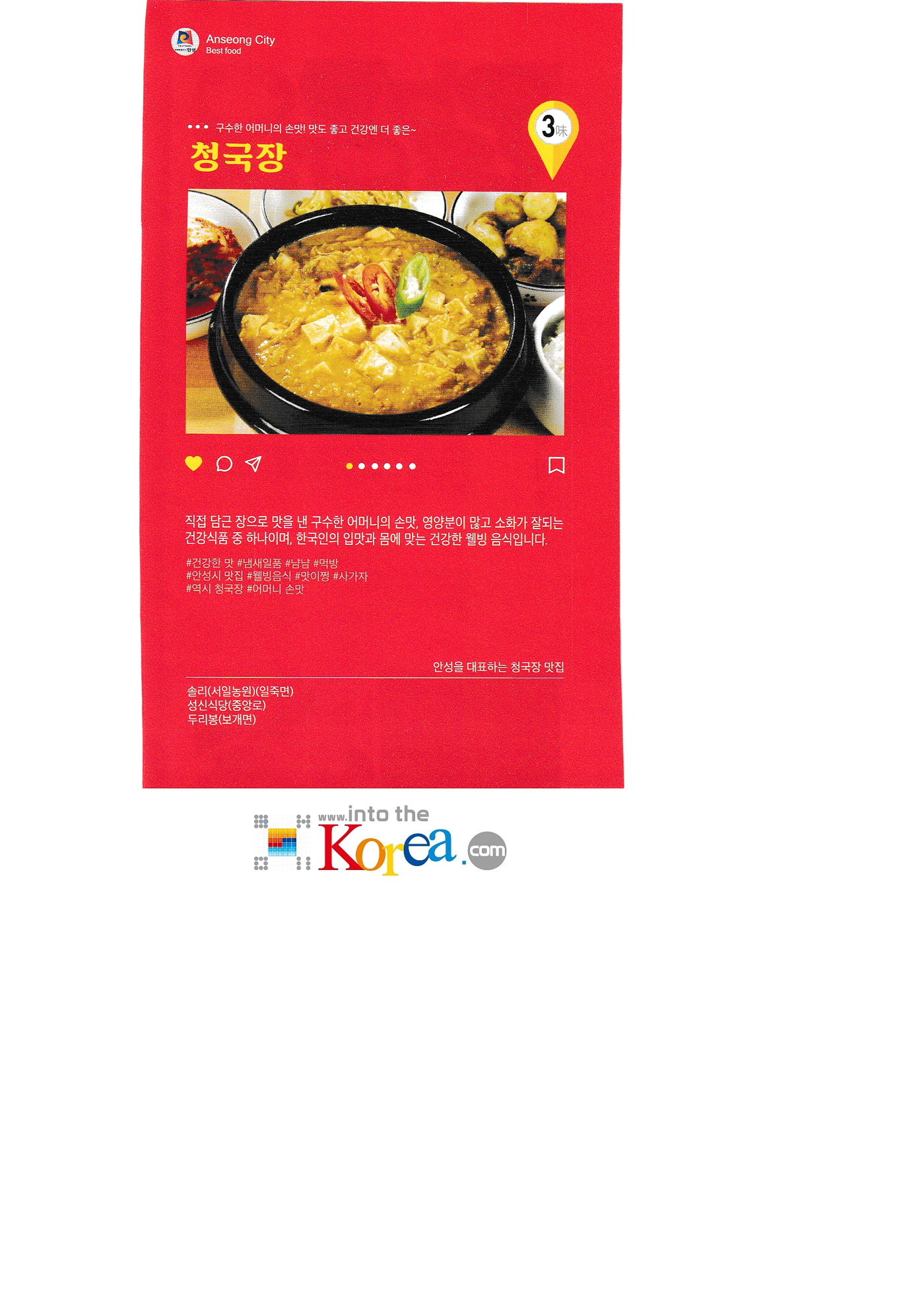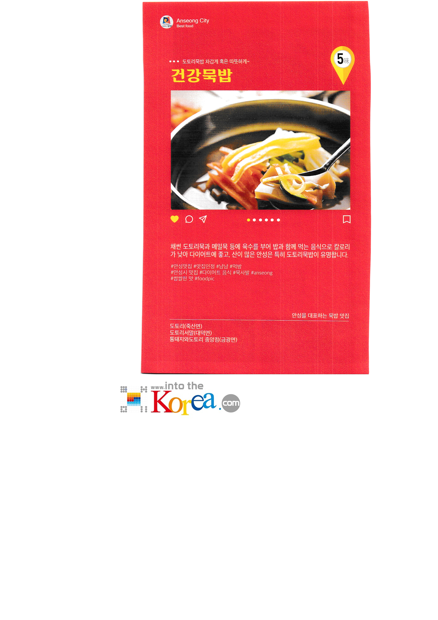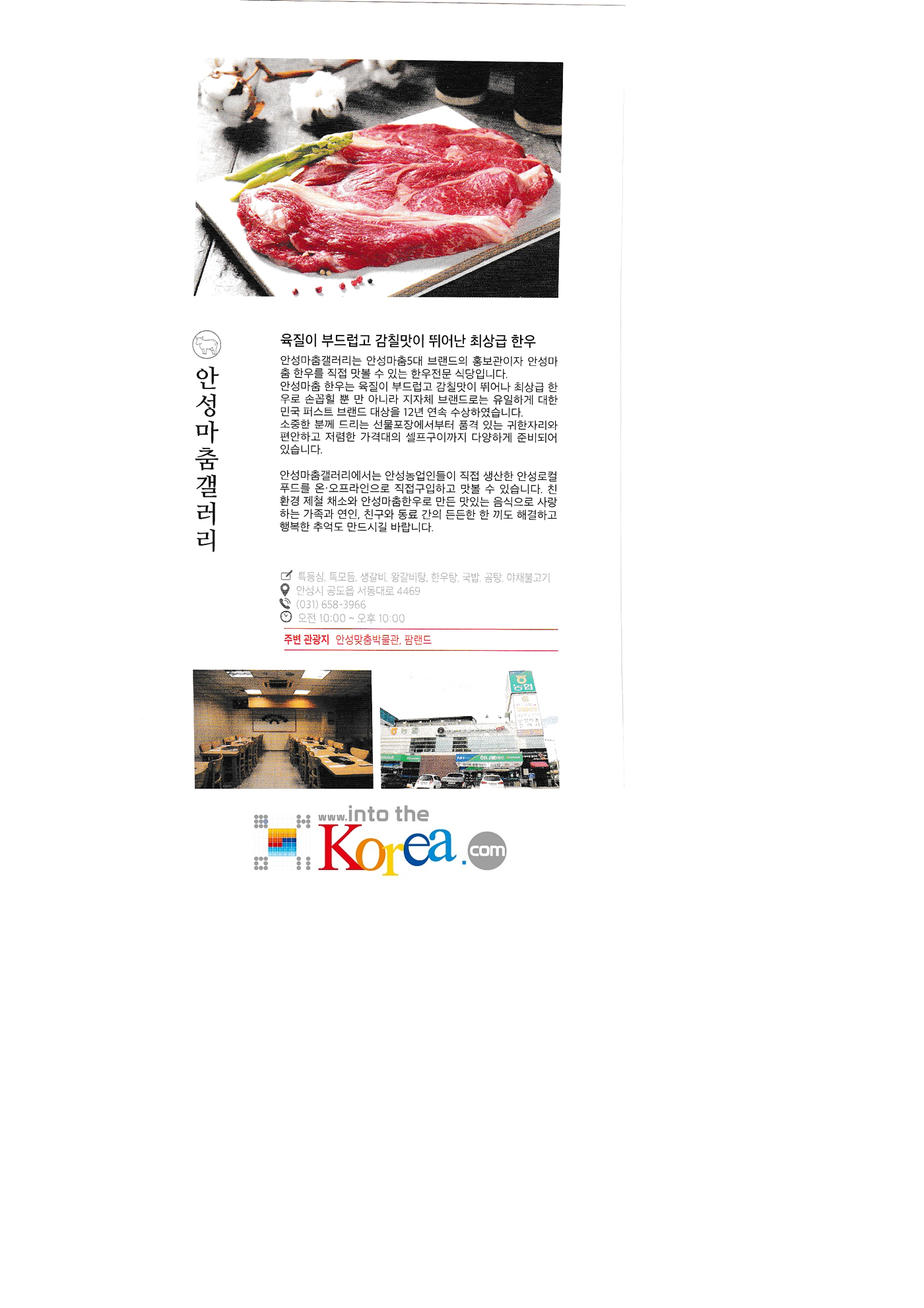 Anseong Korean Beef Anseongmatch Hanwoo Village Iljuk Hanwoo Town Anseong Hanwoo Livestock Plaza Anseong Marchum Gallery Anseong Gukbap Anjang Teo Soup Yeongpoong Anseongsang Rest Area Cheonggukjang Soli (Seoil Farm) Sungshin Restaurant Duribong freshwater porridge stub Namsan Goeul Jeonggane roe healthy rice cake Acorn acorn book Whole Pig and Acorn Central Branch Anseong rice set meal hyang garden Oh Bok-jeong |