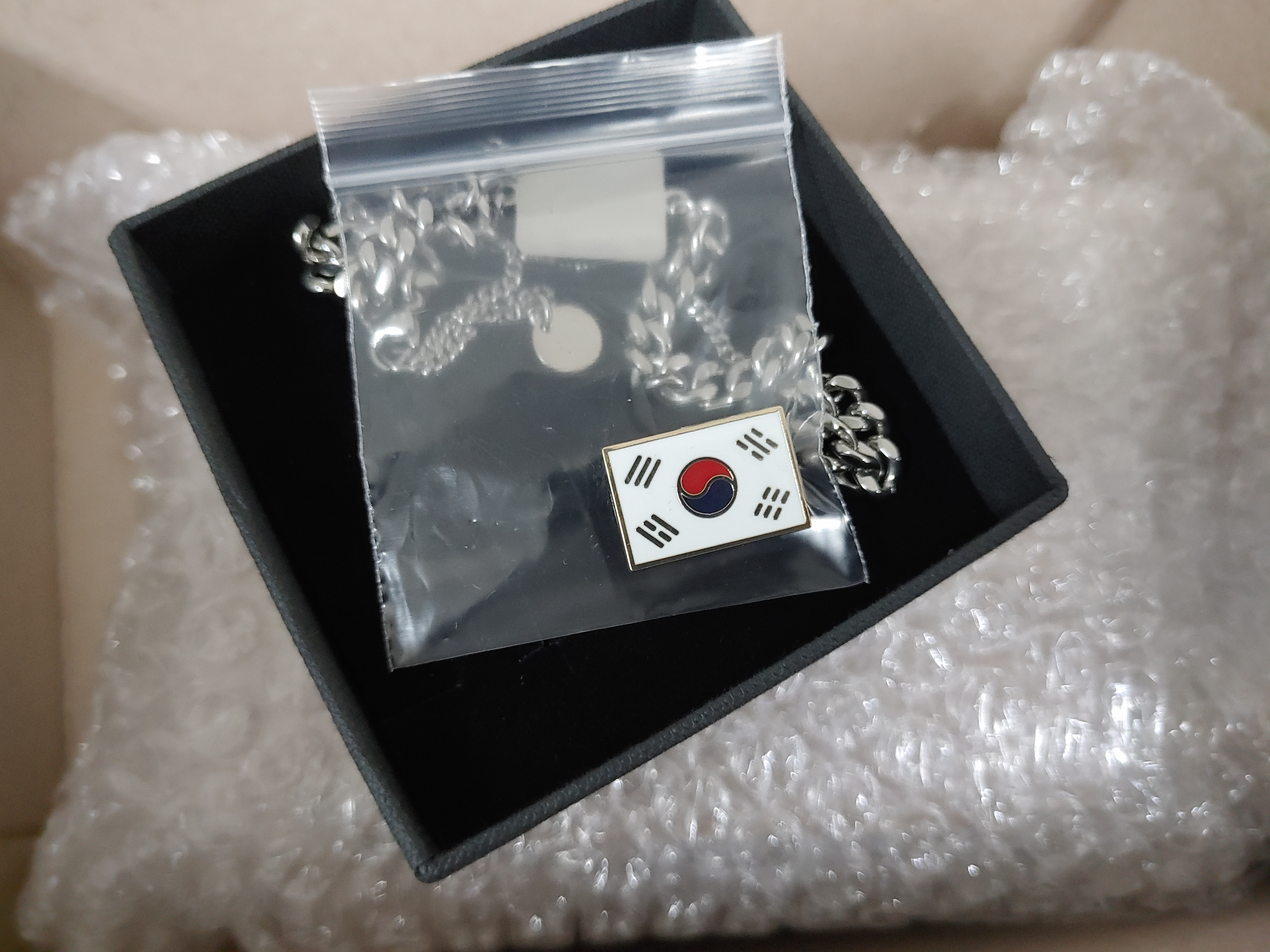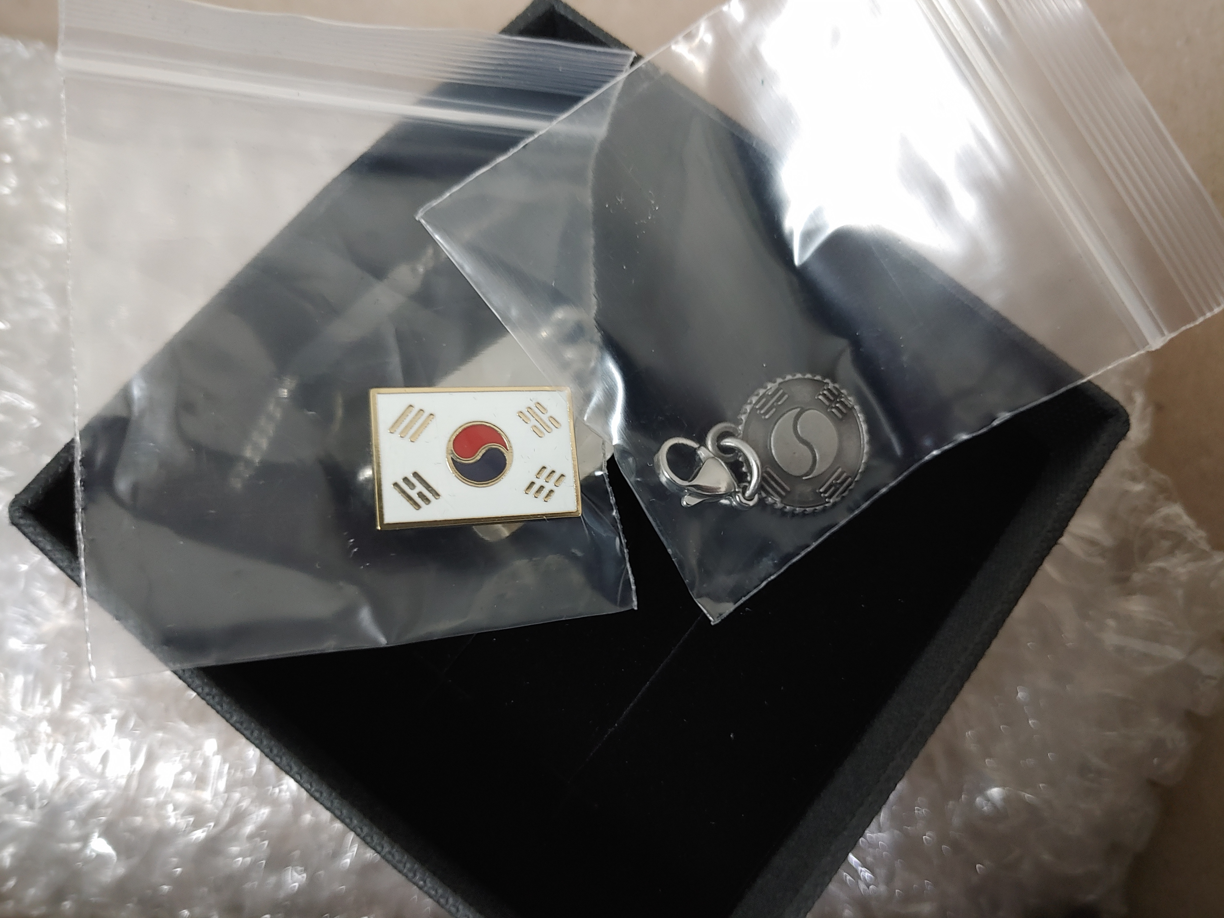 검은 박스를 여니...작은 태극기 뱃지와 태극기 열쇠고리 같은 것이 있다.