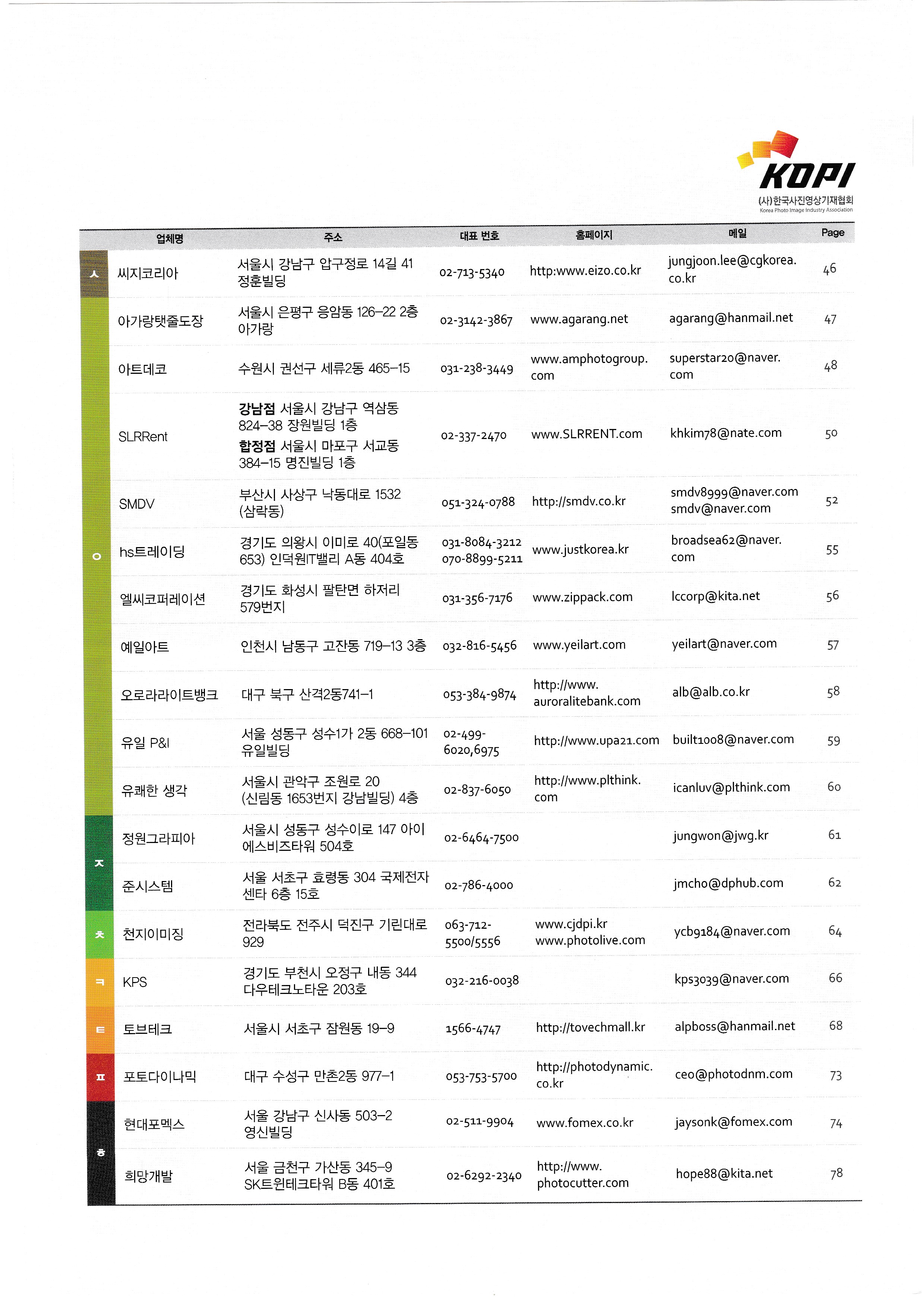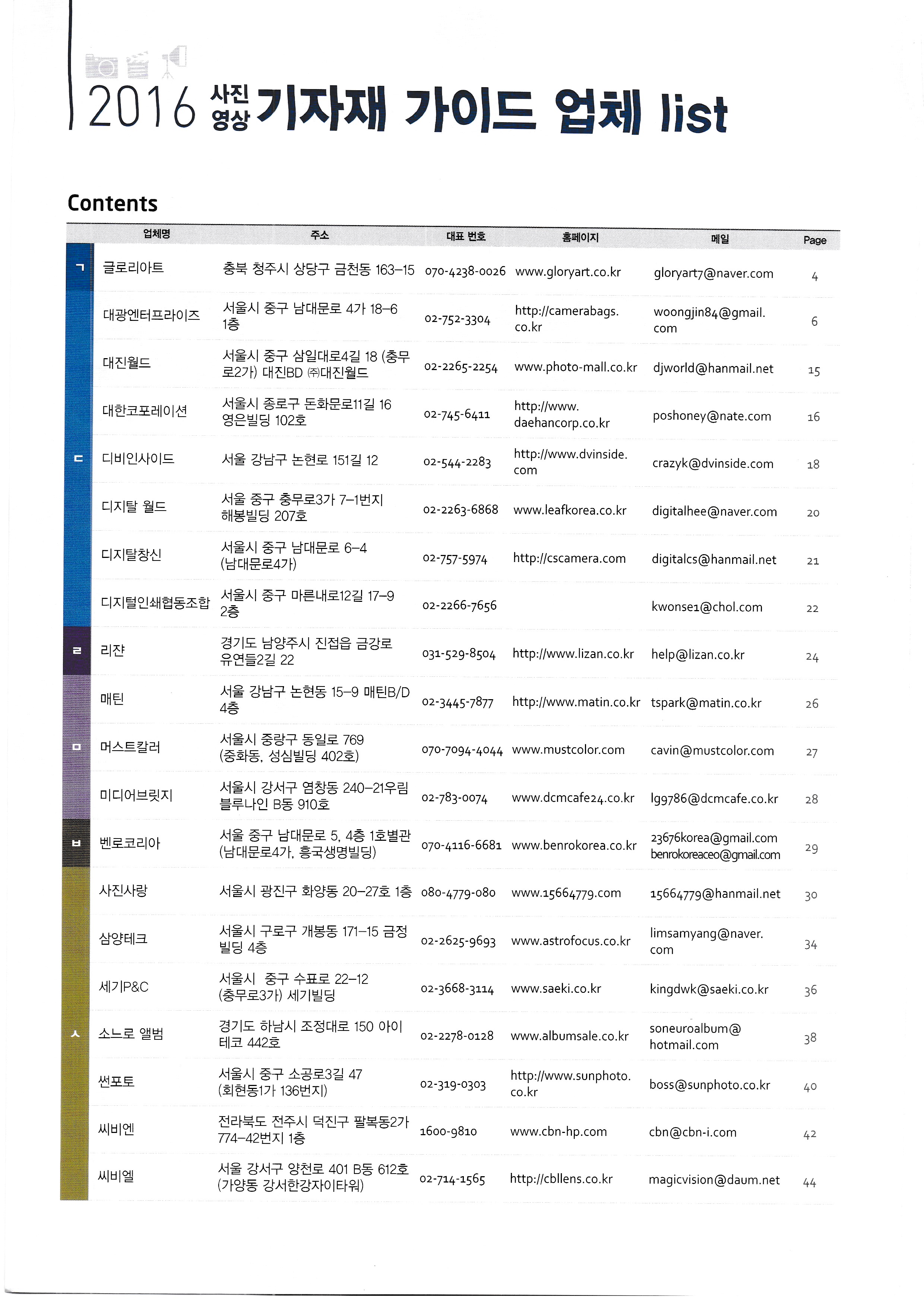 Photo and video equipment guide 1 Gloria Art Daekwang Enterprise Daejin World Daehan Corporation DB Inside digital world digital innovation Digital Printing Cooperative lee jan matine must color Media Bridge Benlo Korea love of photography Samyang Tech Century P&C solo album cben CBL CG Korea agaram umbilical cord seal art deco SLRrent SMDV HS Trading LC Corporation Yale Art Aurora Lighting Bank Unique P&I pleasant thought garden graffiti quasi-system Heaven and Earth Imaging KPS Tobtech photodynamic Hyundai Formex Hope Development |