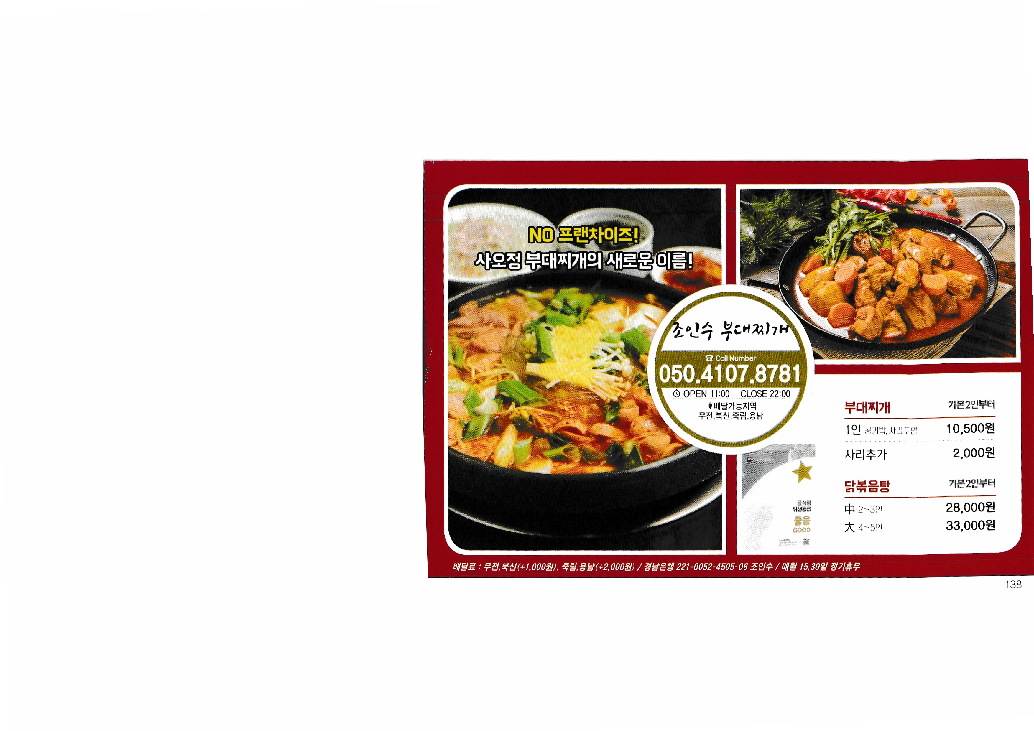 【送365】实时行情看2018年韩国价格...^^ --------------------------------------------- 龙宇洞武田店 一餐餐厅 肥肉餐厅 丸屋仓 釜山猪肉汤 韩日餐厅 华泰村 西加库克 龙谷洞凤坪支店 当东桥餐厅 参鸡汤 龙谷洞竹林店 统营特色餐 傻瓜哥哥 常房章鱼 裴三美 赵仁秀包炖 光浦海藏国 家猪肉味噌 好的西葫芦 泰ok点 公园点 马拉松 中国菜 毛 村民的麻辣烫 皇帝托盘Jjajang 珍珠斑 元山现货 名作炒年糕 炒年糕 新人炒年糕 宝贝紫菜包饭 天赋 急诊室炒年糕 新田炒年糕 菜鸟炒年糕 东大门日式炒年糕 布永博桑 |