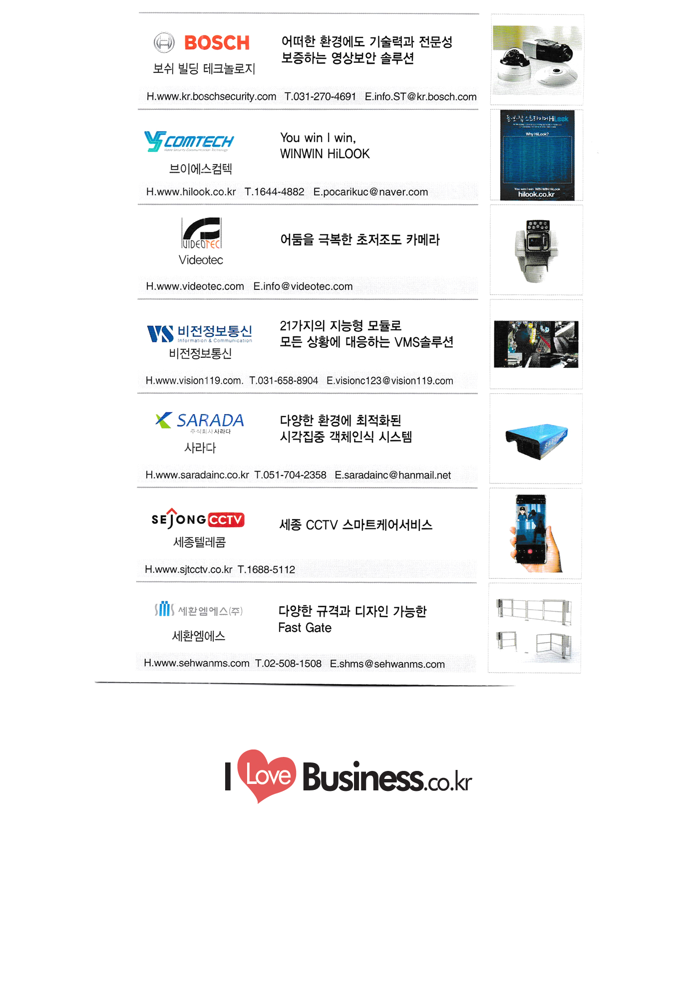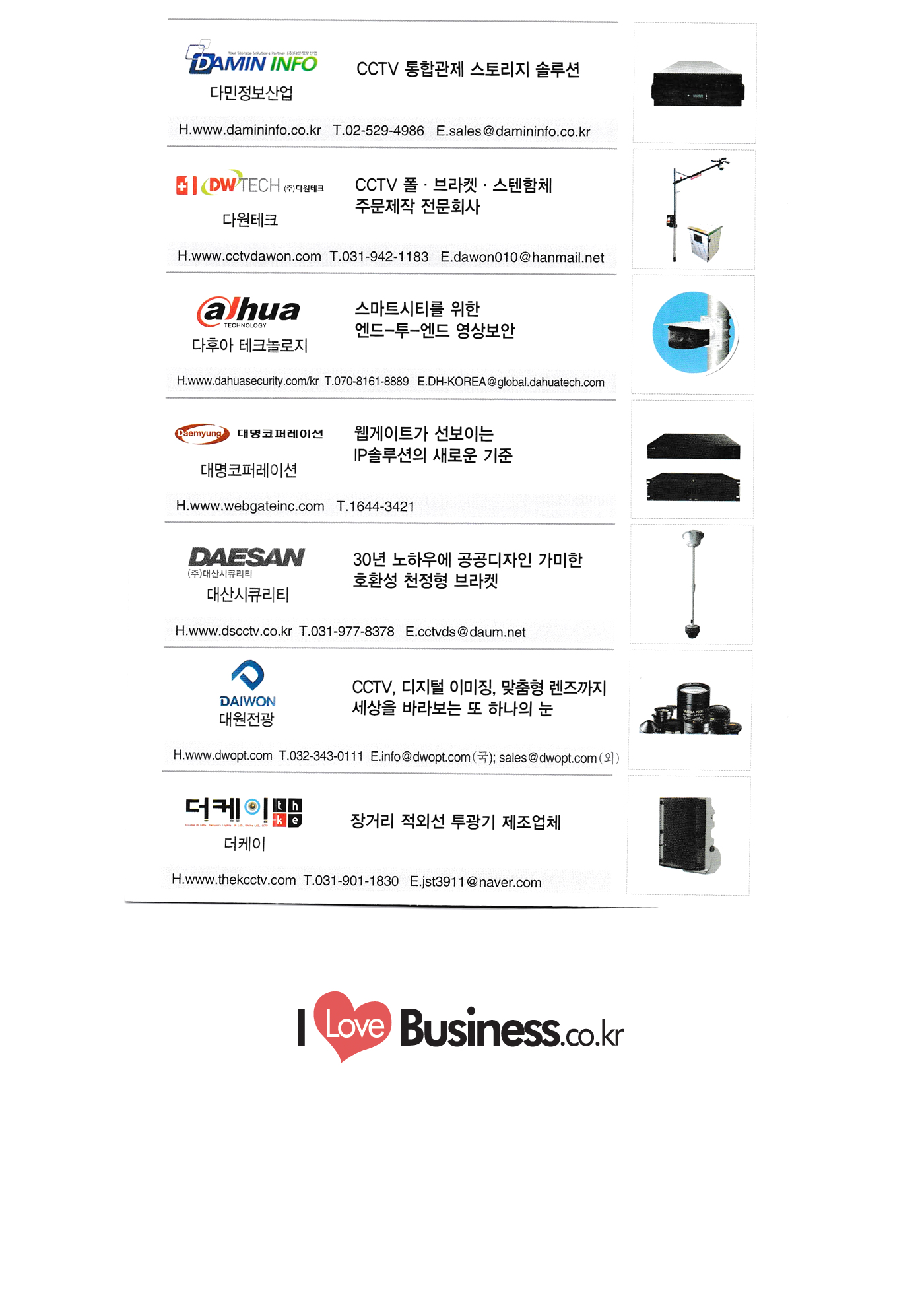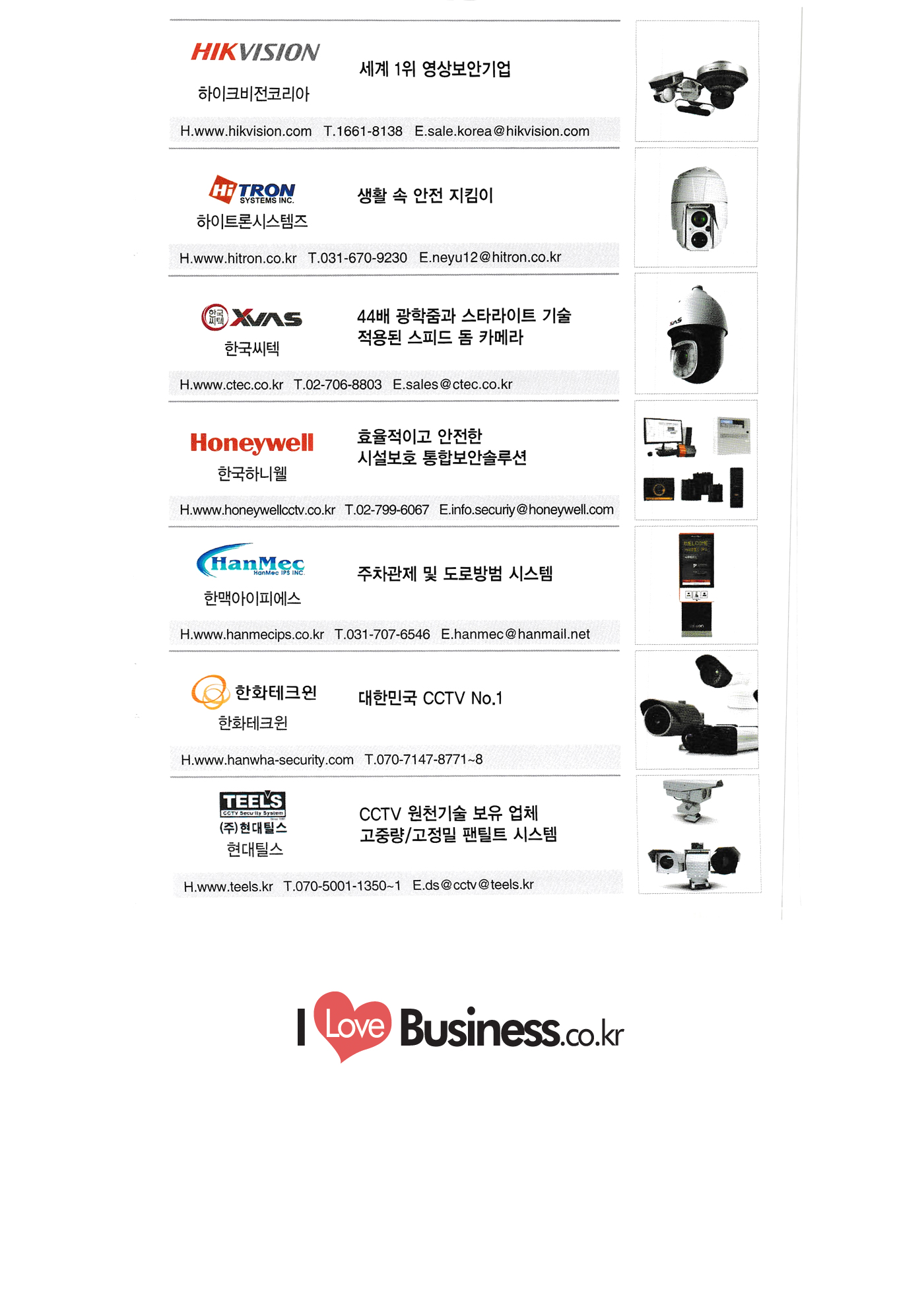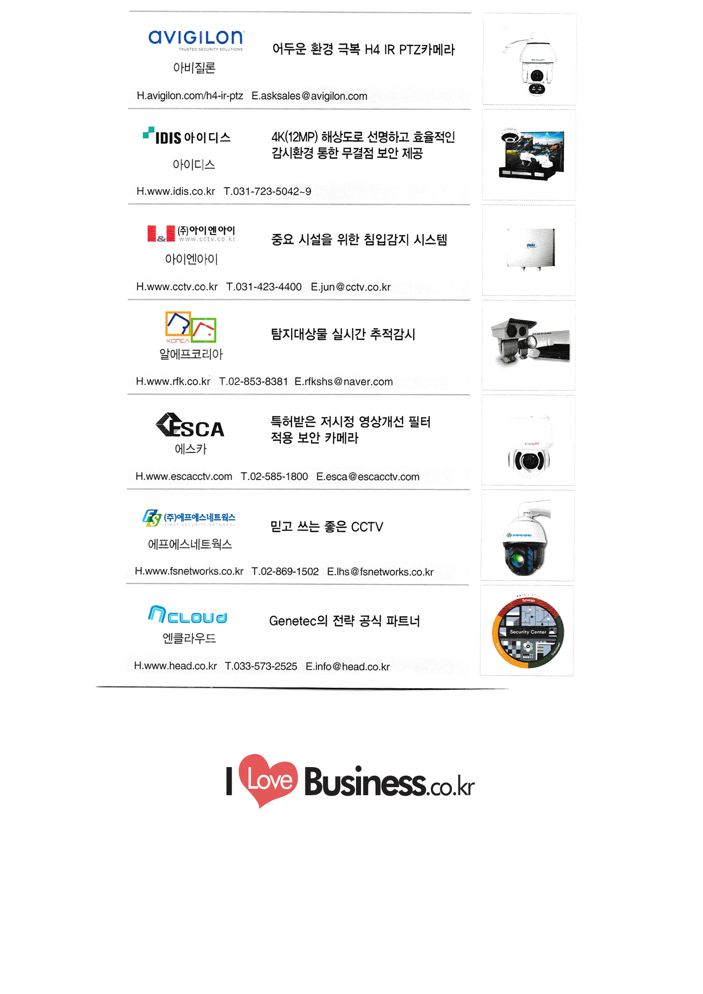 [List of companies related to the security industry] Gyeongin CNS Kunebo Korea glonex Global Bridge Goldstar Security naise neckflow Damin Information Industry Dawon Tech Dahua Technology Daemyung Corporation Daesan Security Daewon Electric Power The K Dongyang Unitech Doureoptronics Doohyun dk solution live zone future signal Best Digital Bosch Building Technology VS Comtech videotek Vision Information and Communication salad Sejong Telecom Sehwan MS Sellings System super rock Suprema Systech Electronics Seagate Korea Sea Eyes CMI Tech Abigillon IDIS I.N.I RF Korea Escar FS Networks ncloud Entos Information & Communication Elim Optical Communication lg innotek Optex Korea Optians Wonwoo ENG Western Digital Union Community ubitron Eugene Systems Korea Inodep Ire Industry EM Table Ewha Global Ewhatron Indus Vision Insight Technology incis incon Ilsan Precision JWC GS Engineering GY Networks ZTteco Jinmyung I&C Changwoo Katis KJ Tech Katy & C KPN commax Kolon Benit Kudo Communication tech sphere Truenne TSI solution TJ One Panasonic Korea Five GT pelco focus Hi-Entech Hikvision Korea Hitron Systems Hangoo Ctech Honeywell Korea Hanmac IPS Hanwha Techwin Hyundai Steels Hyein S&S White Box Robotics Fine box Hugen |