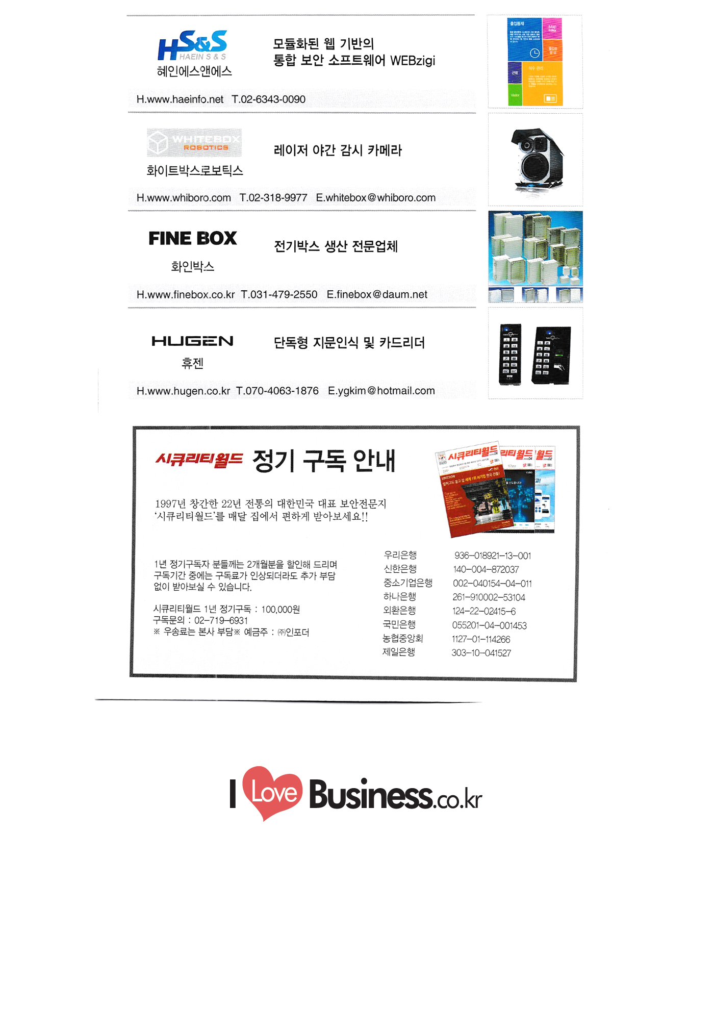 | [보안산업 관련기업 목록] 경인씨엔에스 구네보코리아 글로넥스 글로벌브릿지 금성보안 네이즈 넥플로우 다민정보산업 다원테크 다후아 테크놀로지 대명코퍼레이션 대산시큐리티 대원전광 더케이 동양유니텍 두레옵트로닉스 두현 dk솔루션 라이브존 미래시그널 베스트디지털 보쉬빌딩테크놀로지 브이에스컴텍 비디오텍 비전정보통신 사라다 세종텔레콤 세환엠에스 셀링스시스템 수퍼락 슈프리마 시스텍전자 씨게이트코리아 씨아이즈 씨엠아이텍 아비질론 아이디스 아이엔아이 알에프코리아 에스카 에프에스네트웍스 엔클라우드 엔토스정보통신 엘림광통신 lg이노텍 옵텍스코리아 옵티언스 원우이엔지 웨스턴디지털 유니온커뮤니티 유비트론 유진시스템코리아 이노뎁 이레산업 이엠따블류 이화글로벌 이화트론 인더스비전 인사이트테크놀러지 인씨스 인콘 일산정밀 JWC 지에스티엔지니어링 지와이네트웍스 ZTteco 진명아이앤씨 창우 카티스 케이제이테크 케이티앤씨 KPN 코맥스 코오롱베니트 쿠도커뮤니케이션 테크스피어 트루엔 티에스아이솔루션 티제이원 파나소닉코리아 파이브지티 펠코 포커스 하이엔텍 하이크비전코리아 하이트론시스템즈 한구씨텍 한국하니웰 한맥아이피에스 한화테크윈 현대틸스 혜인에스앤에스 화이트박스로보틱스 화인박스 휴젠 |