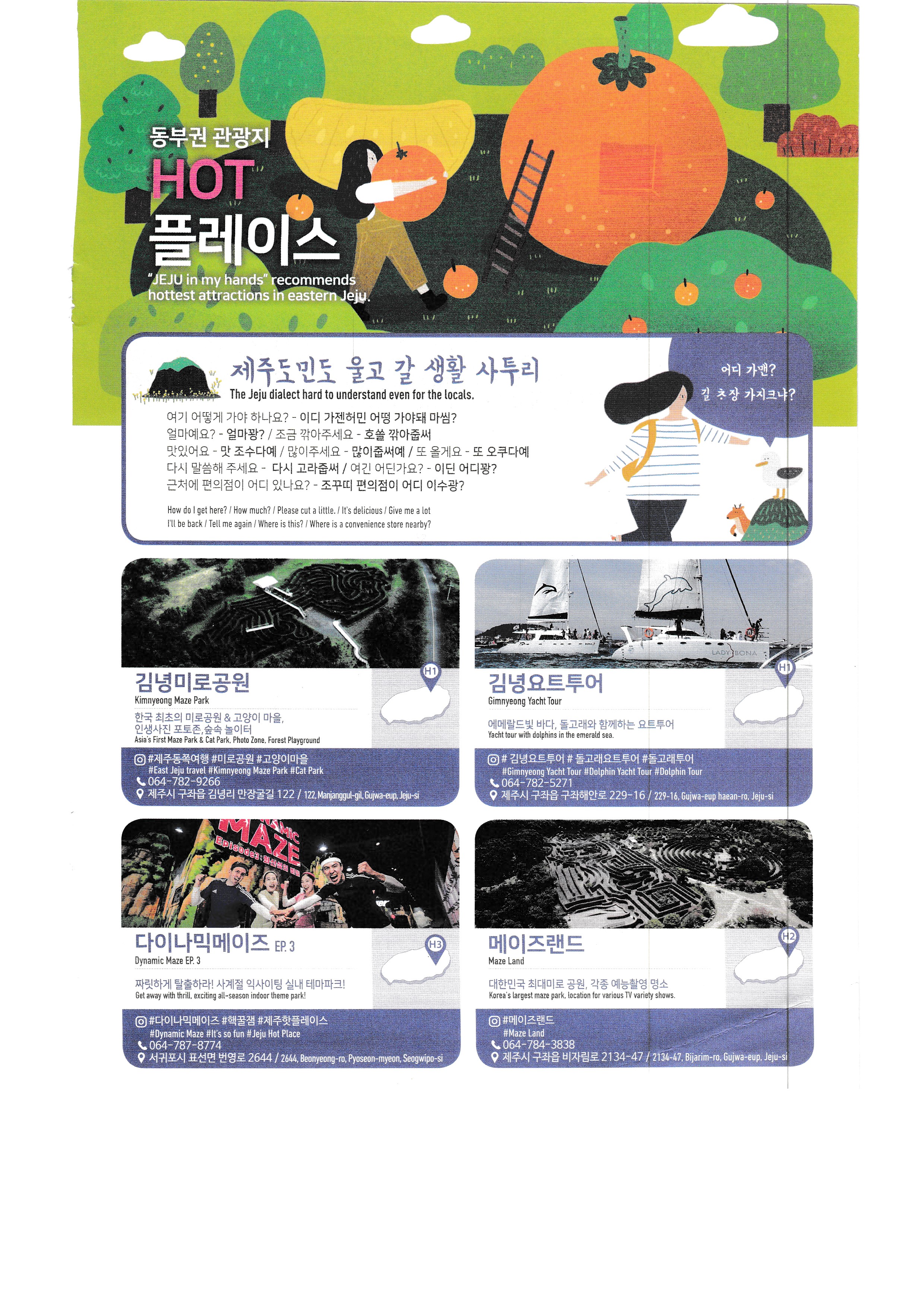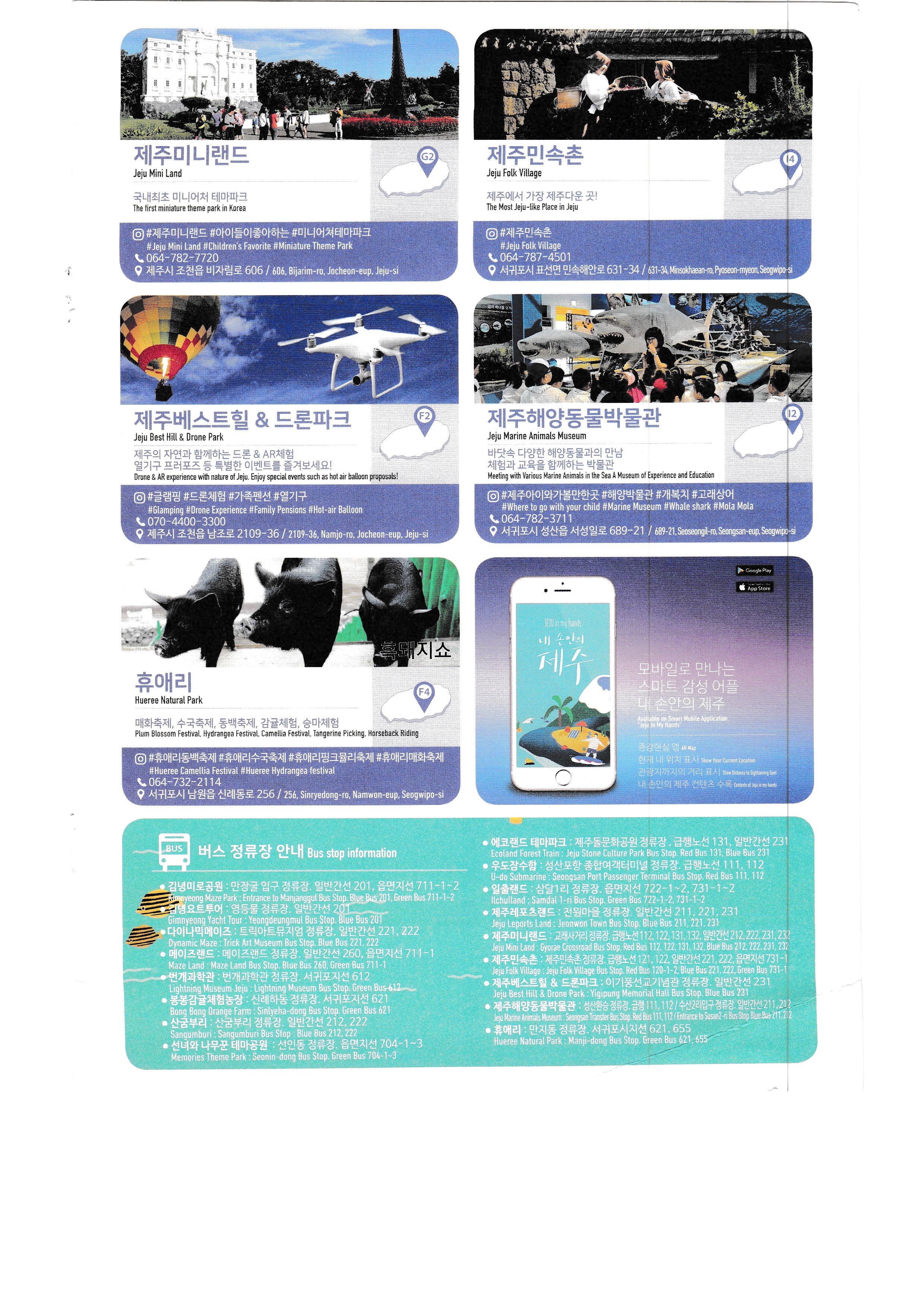 Остров Чеджу в моих руках, музей здоровья и секса, Компьютерный музей Nexon, Хотите верьте, хотите нет, но музей Музей живой, Музей Бонтаэ, Кирпичный кампус, Большой Балланд, Sanghyowon Arboretum, думающий сад Круизный лайнер Согвипхо, Подводная лодка Согвипхо, музей резьбы по камню, Всемирный автомобильный музей Чеджу, музей мировых раковин, Сери Мир, Тематический парк Соингук, музей арарио, Ботанический сад Ёмиджи, гигантская деревня, Земля динозавров Чеджу, Чеджу Нанта, бренд любви чеджу Чеджу Лайт Гарден, Конный парк Чеджу, Тир для стрельбы основной пулей Чеджу, Музей стекла Чеджу, Чеджу Каяк Бичеолин, музей шоколада, камелия холм подводное плавание covas & прозрачный каяк, сафари с плюшевым мишкой, Тропический парк Халлим, тихоокеанская земля играть kpop, цветочный сад, Хурим, Парк Лабиринт Кимнён, Яхт-тур в Кимнёнге, динамический лабиринт мазлэнд Музей науки о молниях, Bonbong Citrus Experience Farm, Сангумбури, Тематический парк "Фея и дровосек", тематический парк эколенд, Подводная лодка Удо, земля восхода солнца Земля Чеджу Лепортс, Чеджу Мини Лэнд, Народная деревня Чеджу, Чеджу Бест Хилл и парк дронов, Музей морских животных Чеджу, Хуэри, |