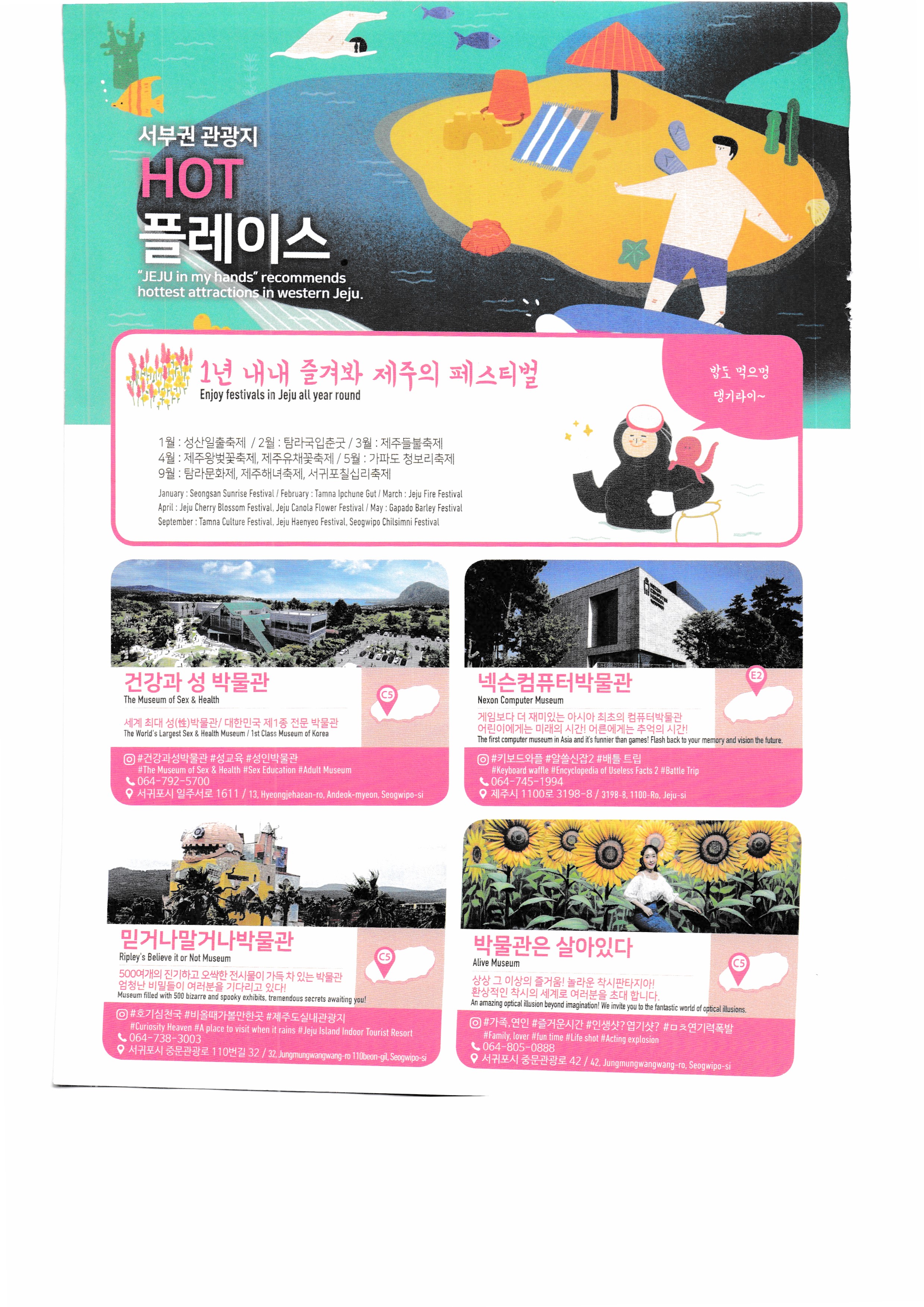 Jeju Island in my hands, health and sex museum, Nexon Computer Museum, Believe it or not, the museum The museum is alive, Bontae Museum, Brick Campus, Big Ballland, Sanghyowon Arboretum, thinking garden, Seogwipo cruise ship, Seogwipo Submarine, stone carving museum, World Automobile Jeju Museum, world conch museum, Seri World, Soinguk Theme Park, arario museum, Yeomiji Botanical Garden, jumbo village, Jeju Dinosaur Land, Jeju Nanta, jeju love brand, Jeju Light Garden, Jeju Equestrian Park, Jeju main bullet shooting range, Jeju Glass Museum, Jeju Kayak Bicheolin, chocolate museum, camellia hill, covas scuba & transparent kayak, teddy bear safari, Tropical Hallim Park, pacific land, play kpop, flower garden, Hurim, Gimnyeong Maze Park, Gimnyeong Yacht Tour, dynamic maze, mazeland, Lightning Science Museum, Bonbong Citrus Experience Farm, Sangumburi, Fairy and the Woodcutter Theme Park, ecoland theme park, Udo Submarine, sunrise land, Jeju Leports Land, Jeju Mini Land, Jeju Folk Village, Jeju Best Hill & Drone Park, Jeju Marine Animal Museum, Hueri, |