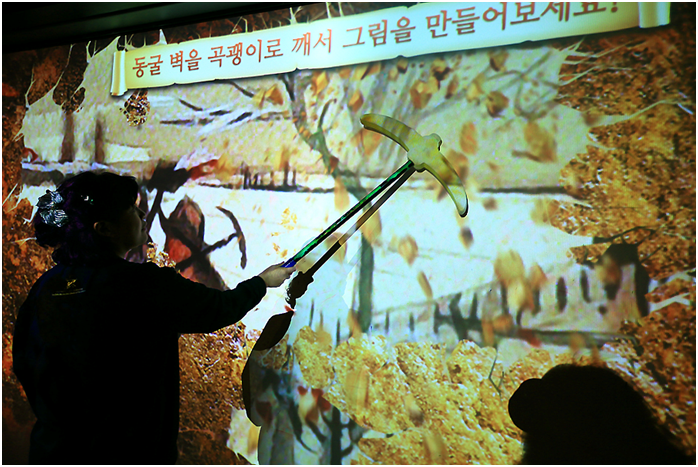 곡괭이로 벽면을 긁어 내리면 동굴벽이 깨지면서 그림이 완성됩니다. 직접해보니 신기방기하더라구요.