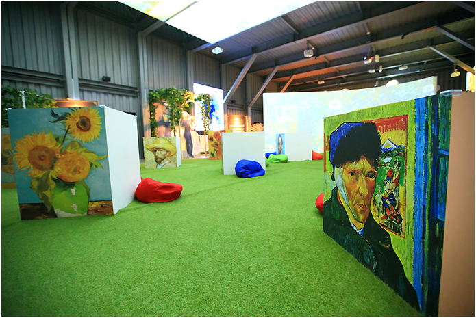 안쪽으로 들어서면 넓은 초원위가 연상되는 바닥면에 고흐의 그림들이 놓여져 있습니다. 이 공간은 ‘별이 빛나는 밤’을