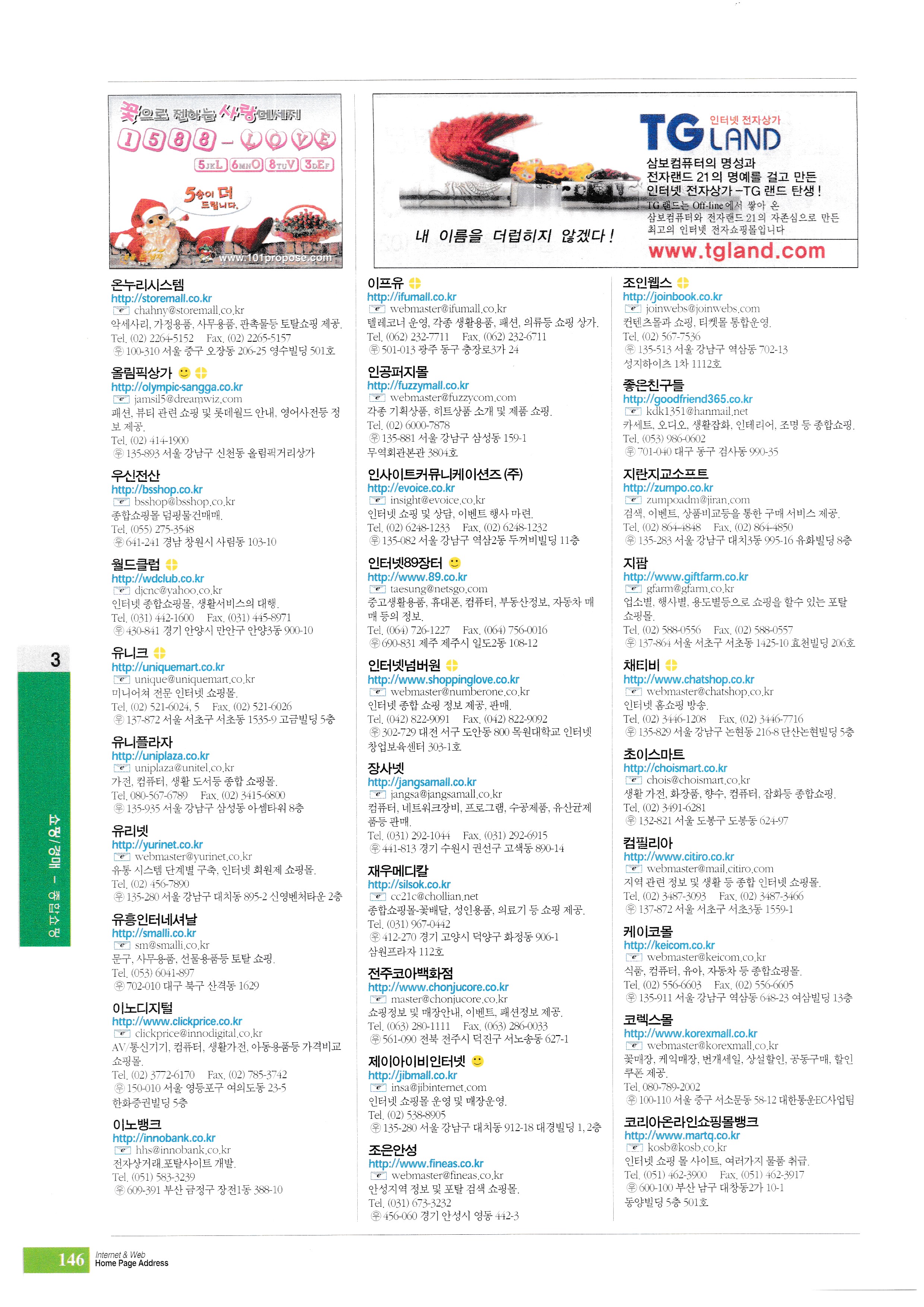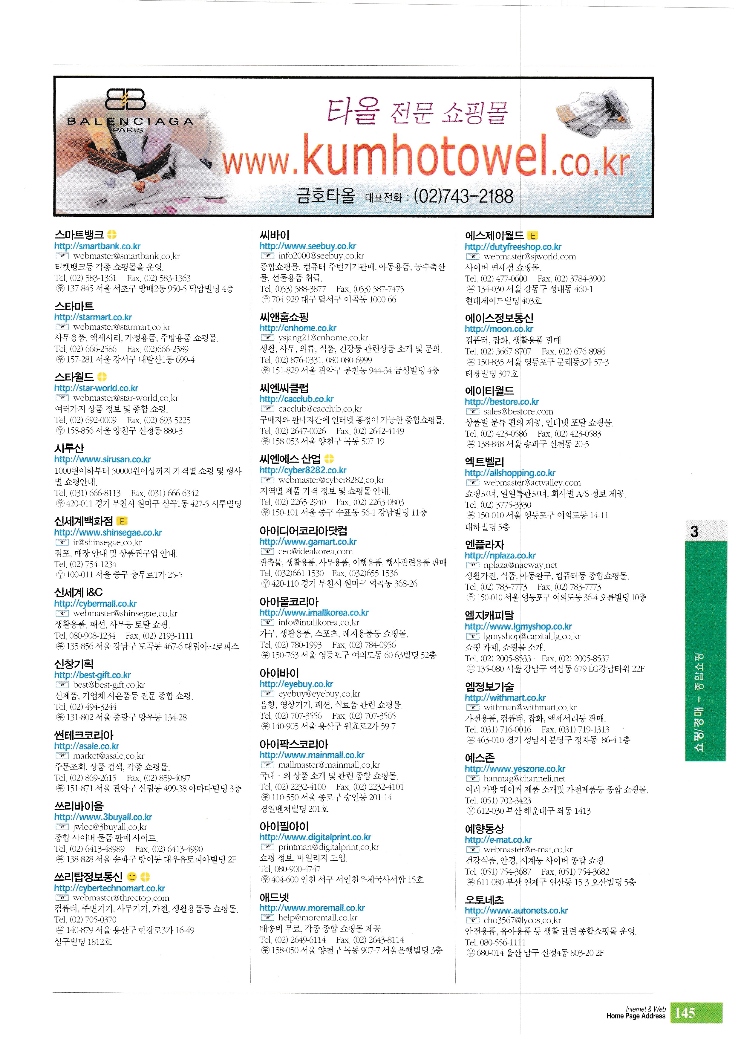 | 쇼핑/경매 2001해피클럽 815쇼핑 강코리아 게토 고마트 광주전남쇼핑몰 구스닥 글로리쇼핑플라자 기프트서울 나래씨앤씨 네오팝 네티모아 농심가 다시모아 대백인터넷쇼핑몰 대일닷컴 대우 대우프라자 대전중소기업종합지원센터 동방마트(주) 드림바이 라이브홈쇼핑 롯데백화점 마이 그로서리 마이데코 마켓코리아 만물 메일오더코리아 만물 메일오더코리아 메타랜드 미래종합유통 바람소프트 바이25클럽 바잉나우 베스트바이어 브랜드몰 브이아이피숍 비비아이 코리아 비엔비통상 사이버21 사이버마트 사이버밸리 사이버쇼핑플라자 사이버이터내셔날 삼성몰 삼성테스코(주) 삼육구쇼핑 삼정홈쇼핑 샵포스쿨 서울백화점 성진유통 세운마트 세일 소자 소호마트 스마트뱅크 스타마트 스타월드 시루산 신세계백화점 신세계 I&C 신창기획 썬테크코리아 쓰리바이올 쓰리탑정보통신 씨바이 씨앤홈쇼핑 씨엔씨클럽 씨엔에스 산업 아이디어코리아닷컴 아이몰코리아 아이바이 아이팍스코리아 아이필아이 애드넷 에스제이월드 에이스정보통신 에이티월드 엑트벨리 엔플라자 엘지캐피탈 엠정보기술 예스존 예향통상 오토네츠 온누리시스템 올림픽상가 우신전산 월드클럽 유니크 유니플라자 유리넷 유흥인터네셔날 이노디지털 이뇅크 이프유 인공퍼지몰 인사이트커뮤니케이션즈 인터넷89장터 인터넷넘버원 장사넷 재우메디칼 전주코아백화점 제이아이비인터넷 조은안성 조인웹스 좋은친구들 지란지교소프트 지팜 채티피 초이스마트 컴필리아 케이코몰 코렉스몰 코리아온라인쇼핑몰뱅크 |