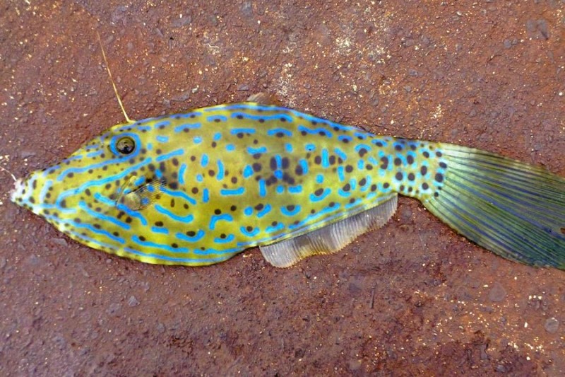 일반개요; 어미는 녹갈색 내지 회색 바탕이며 성장 중에 있을 때는 노란색이 강한 황갈색 바탕이다. 검은 점들과 푸른색 선들이 산재한다. 몸은 길고 심하게 측편되었다. 꼬리지느러미는 길고 밖으로 둥글다. 배지느러미의 퇴화 흔적은 있거나 또는 없다. 라군이나 해초가 있는 암초에 서식하며 가끔 수면 표류 물체 밑에서 발견된다. 해조류, 해초, 고르고니언 산호, 군체멍게, 말미잘 히드로충류를 먹는다. 단독 생활을 하며 수심 범위는 3~120m이다. 쥐치류 중에서 가장 크다.