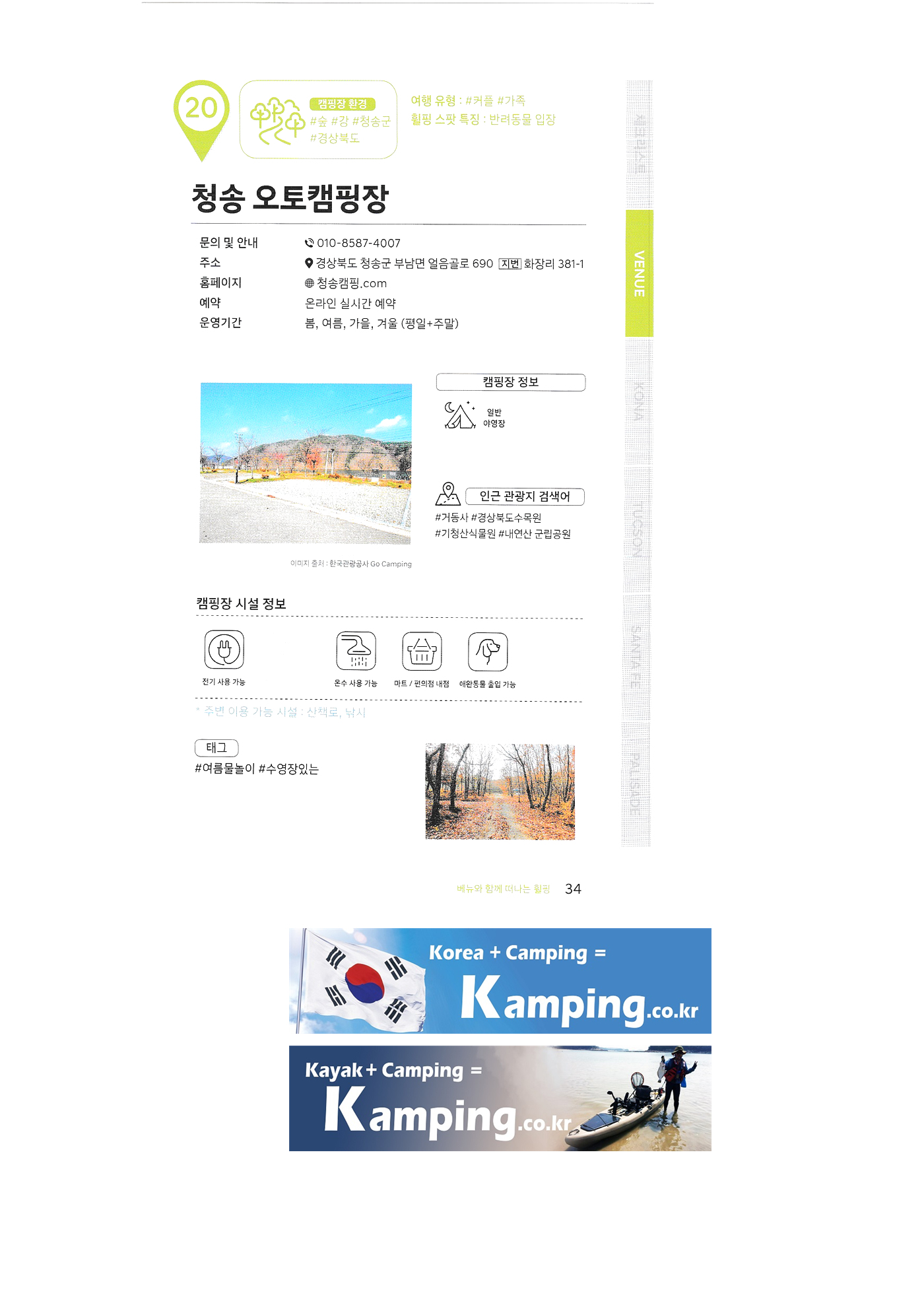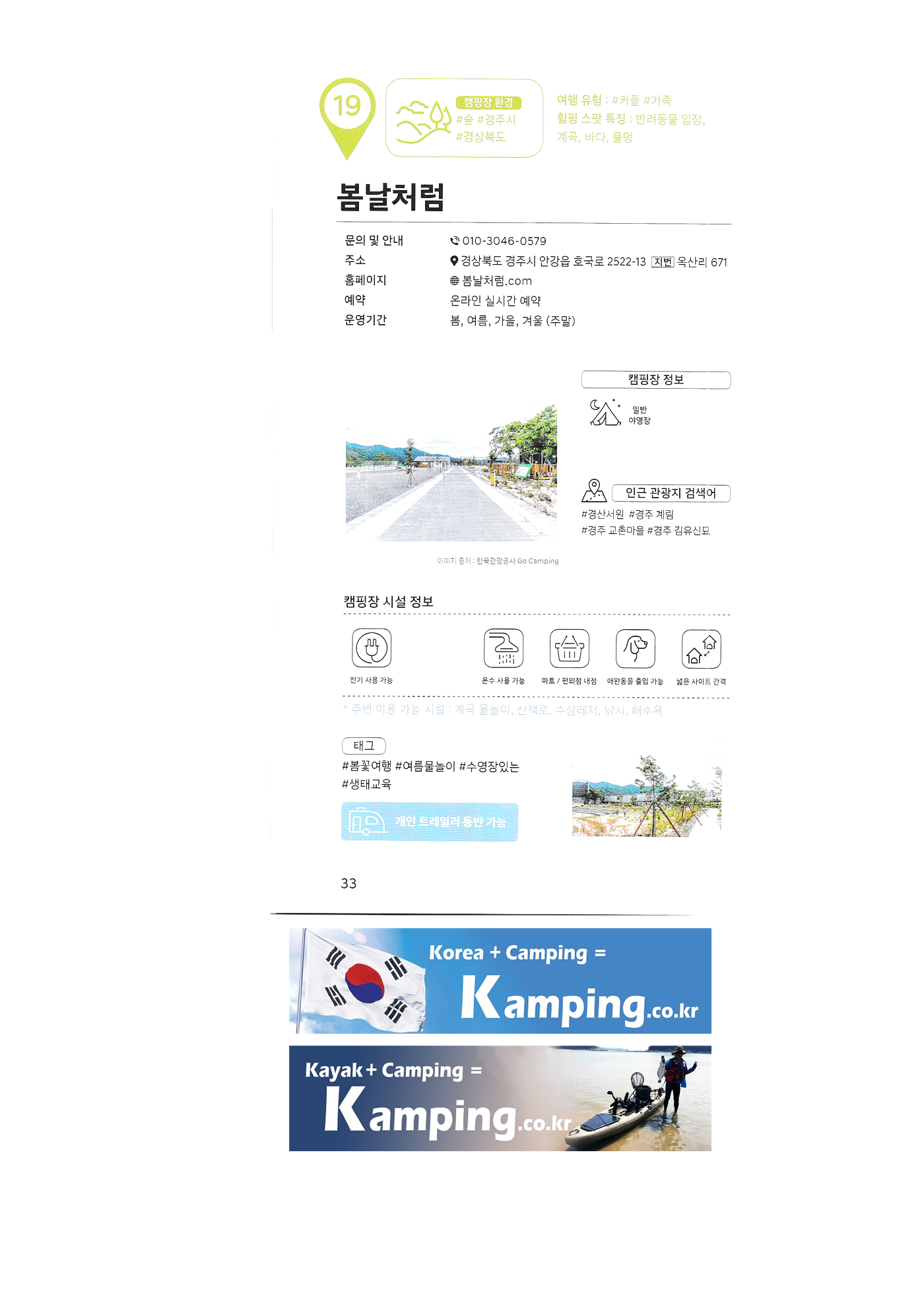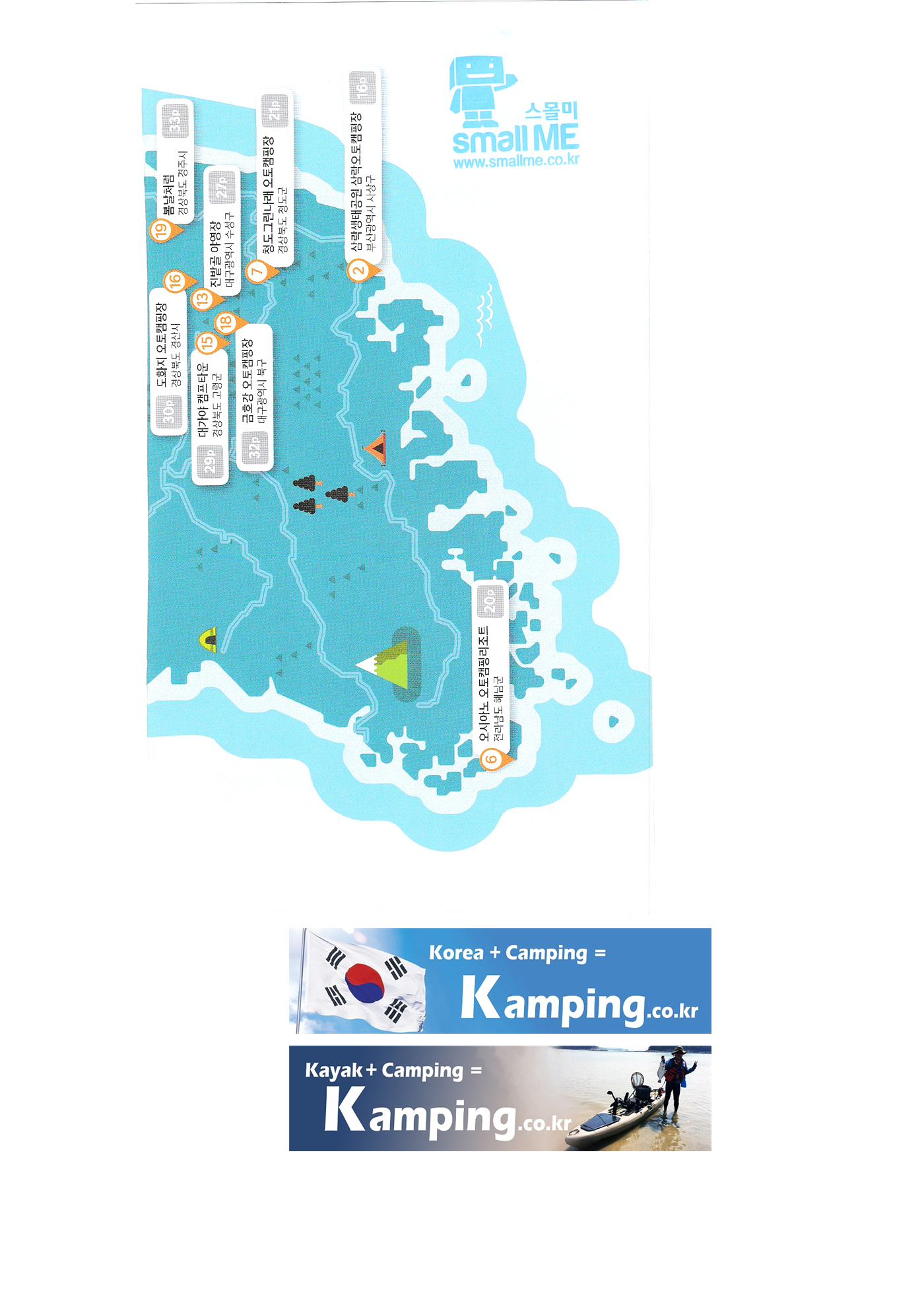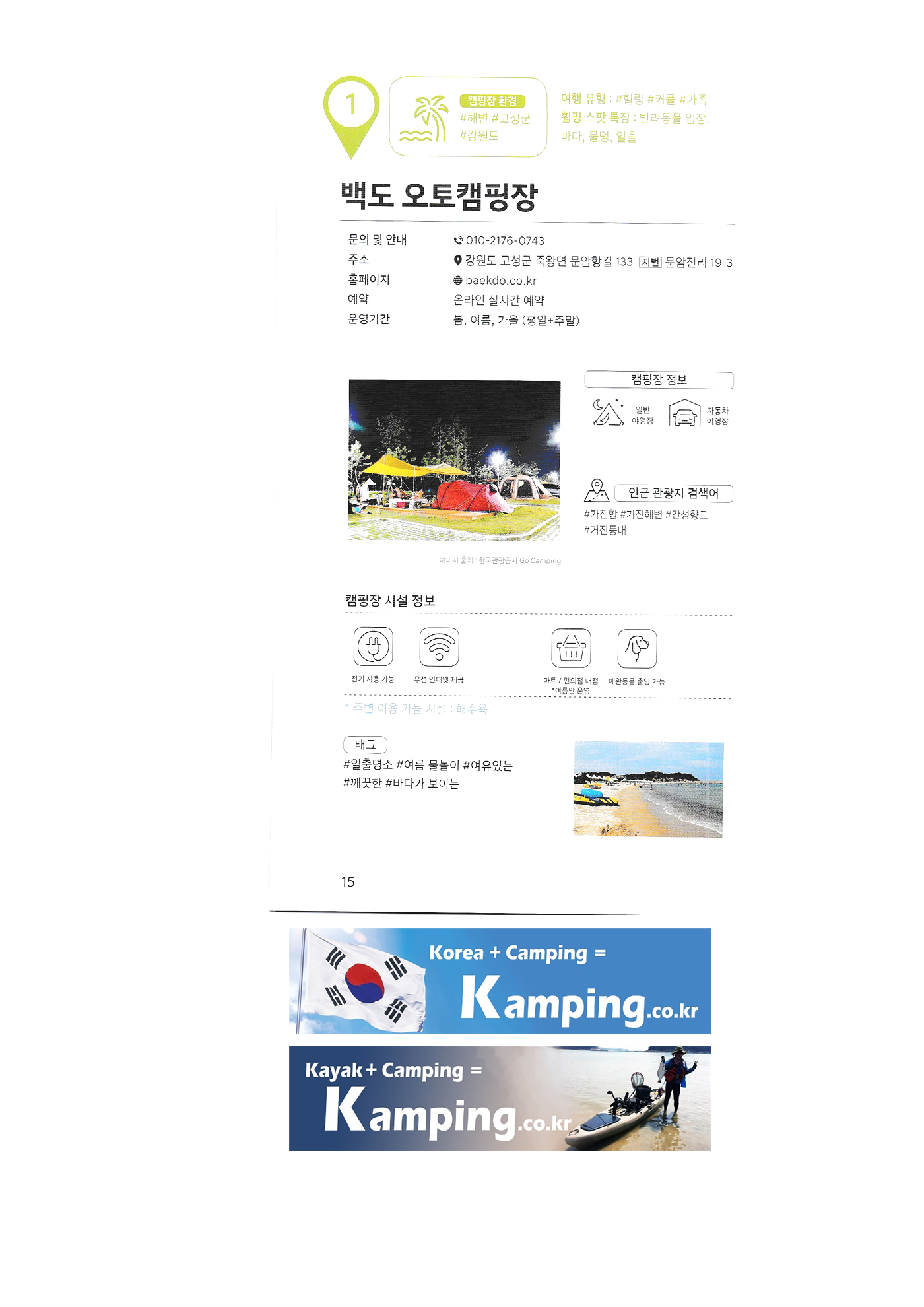 | 한국 관광공사 휠핑여지도 1 : 전국 캠핑장 안내 백도 오토캠핑장 삼락생태공원 삼락오토캠핑장 서해땅끝 파도리 아치내 캠핑장 송지호 오토캠핑장 양양캠핑장 오시아노 오토캠핑리조트 청도그린나래 오토캠핑장 키즈드림 오토캠핑장 그린콩 캠핑장 정원펜션 캠핑장 팡팡 캠핑장 힐링 가평 오토캠핑장, 진밭골 야영장 어망골 캠핑장 대가야 캠프타운 도화지 오토캠핑장 장항 오토캠핑장 금호강 오토캠핑장 봄날처럼 청송 오토캠핑장 |