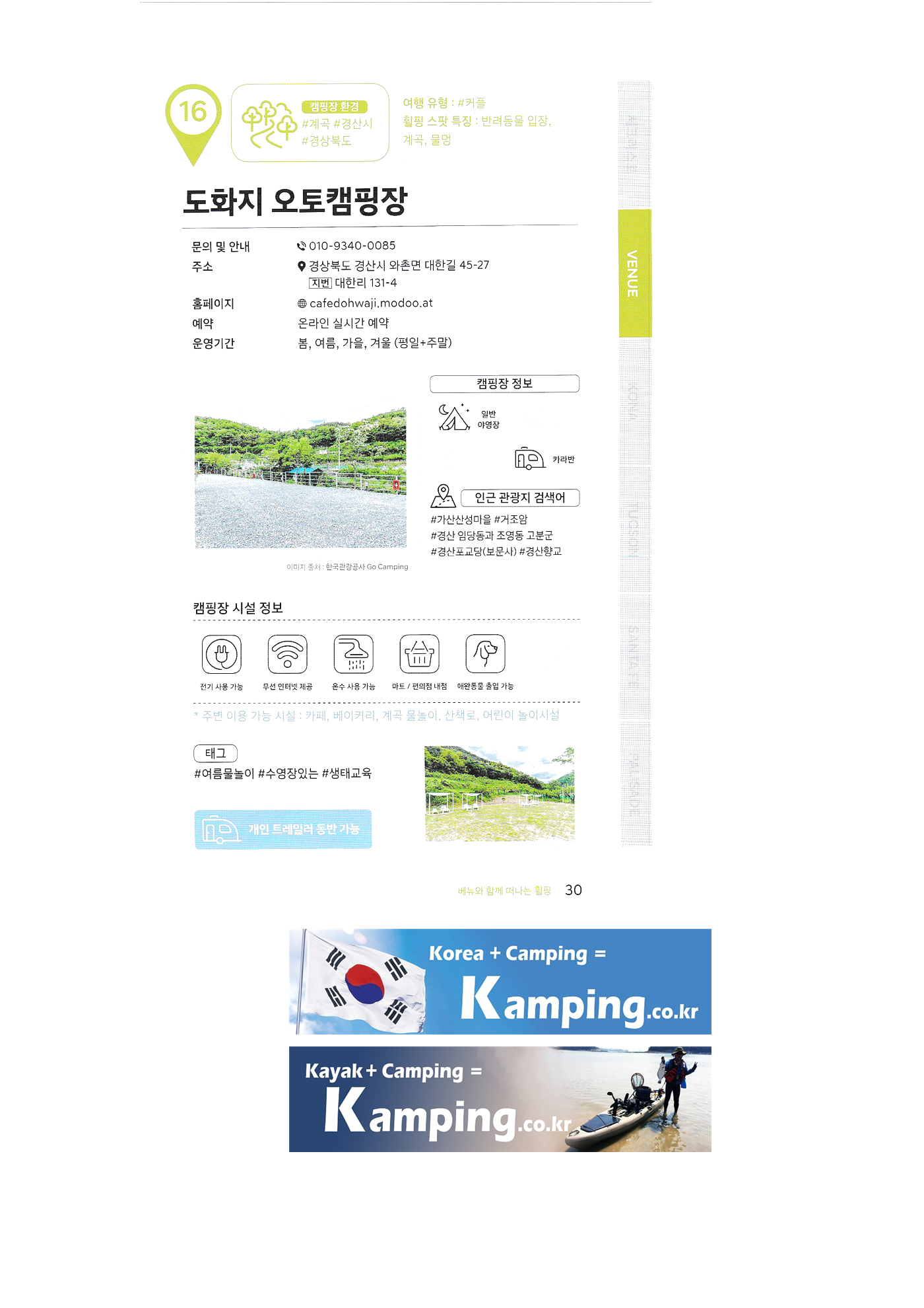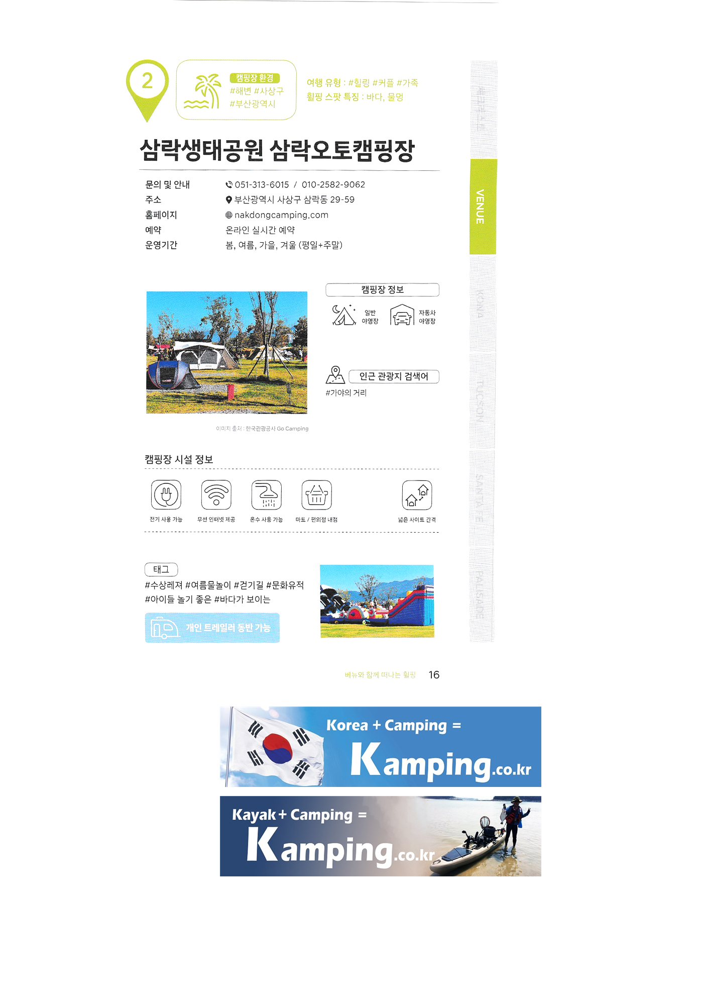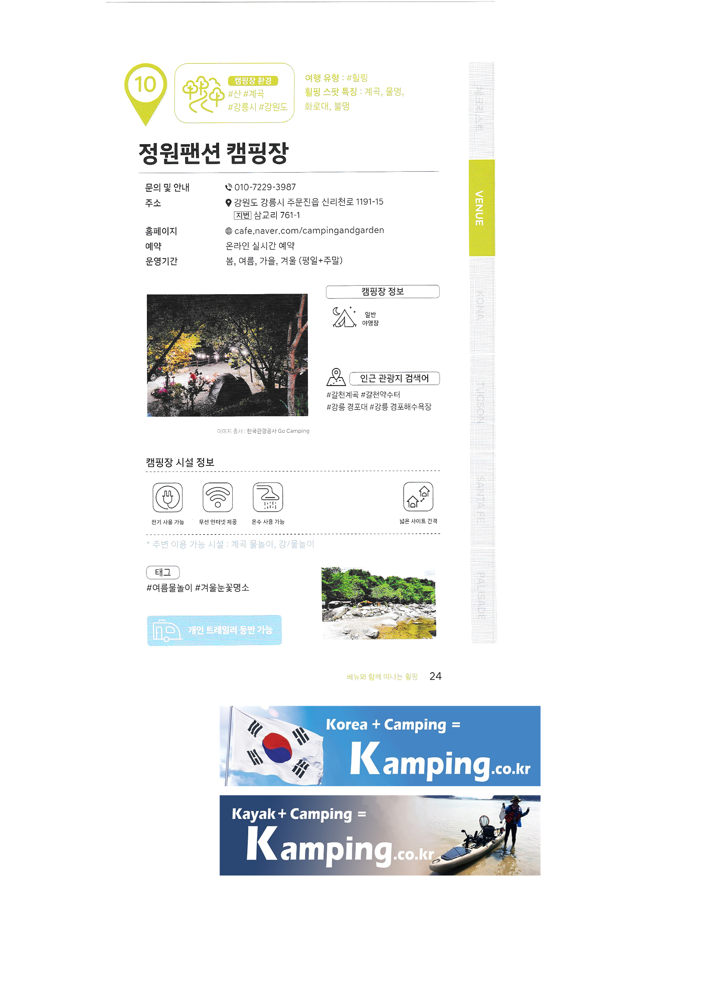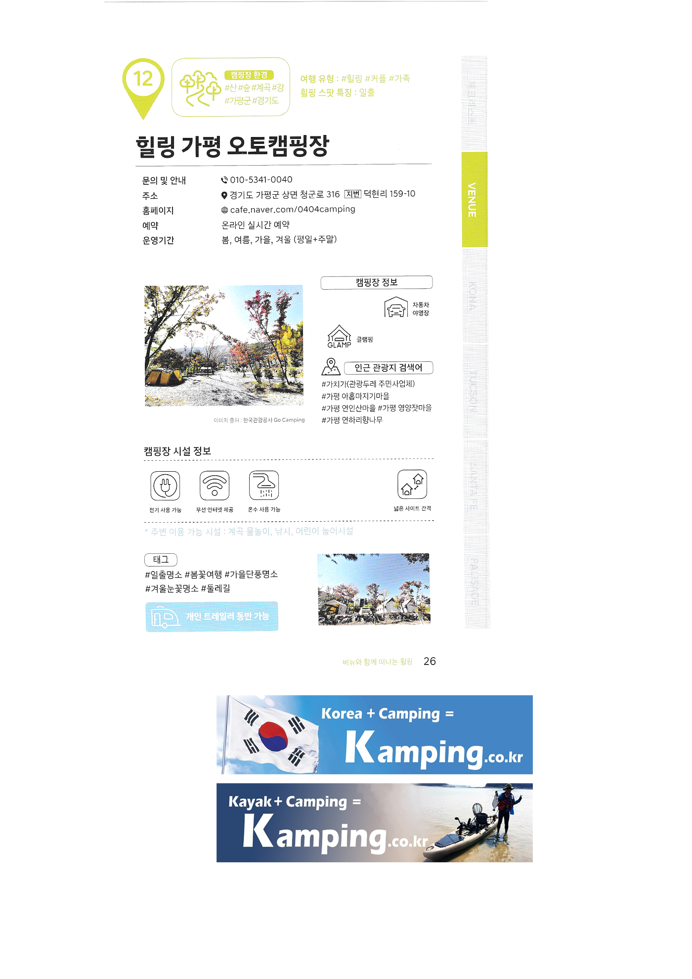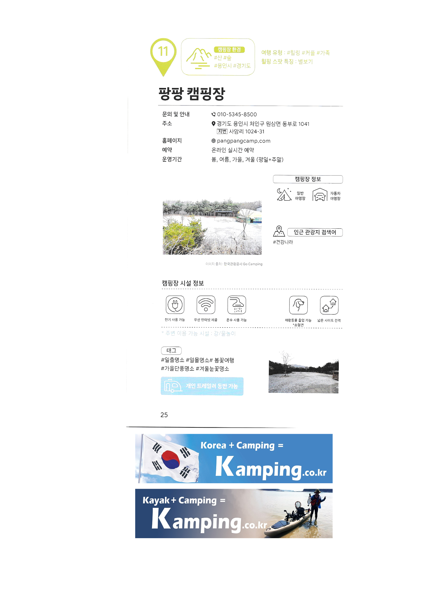 | 한국 관광공사 휠핑여지도 1 : 전국 캠핑장 안내 백도 오토캠핑장 삼락생태공원 삼락오토캠핑장 서해땅끝 파도리 아치내 캠핑장 송지호 오토캠핑장 양양캠핑장 오시아노 오토캠핑리조트 청도그린나래 오토캠핑장 키즈드림 오토캠핑장 그린콩 캠핑장 정원펜션 캠핑장 팡팡 캠핑장 힐링 가평 오토캠핑장, 진밭골 야영장 어망골 캠핑장 대가야 캠프타운 도화지 오토캠핑장 장항 오토캠핑장 금호강 오토캠핑장 봄날처럼 청송 오토캠핑장 |