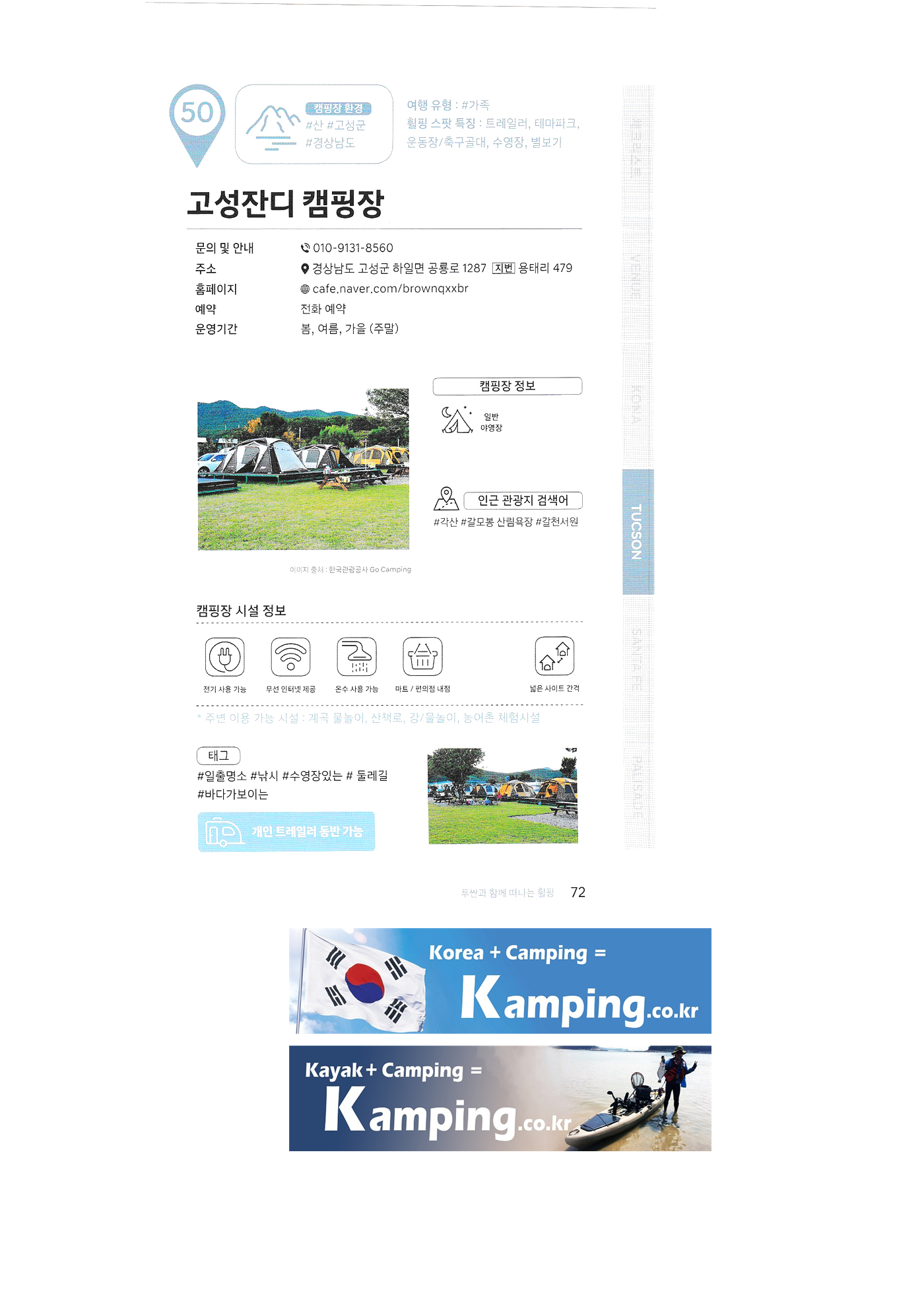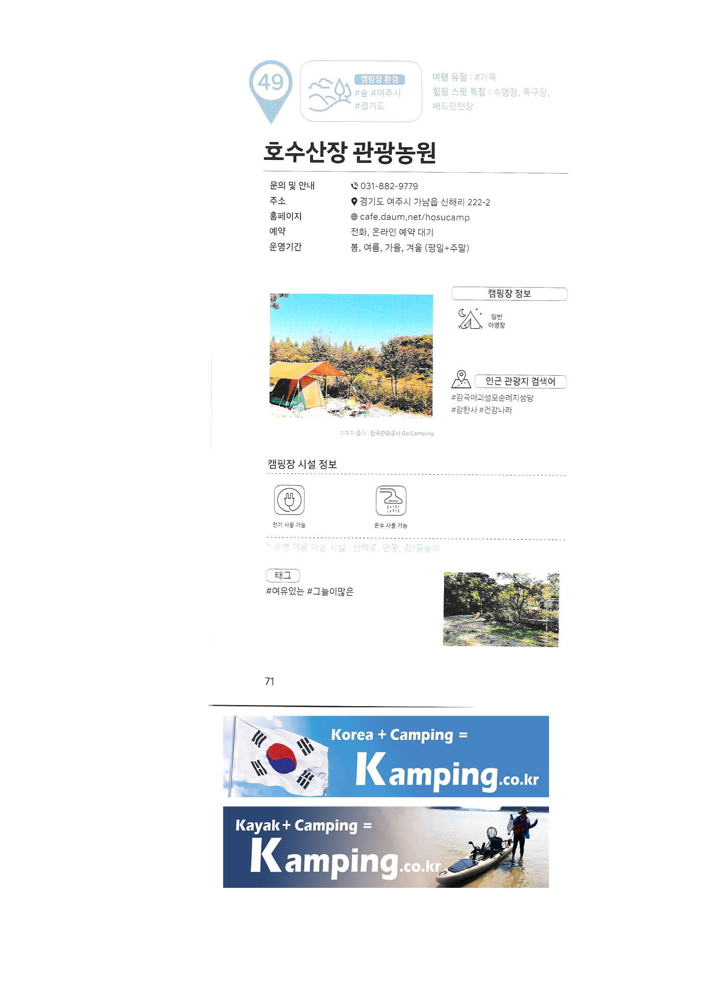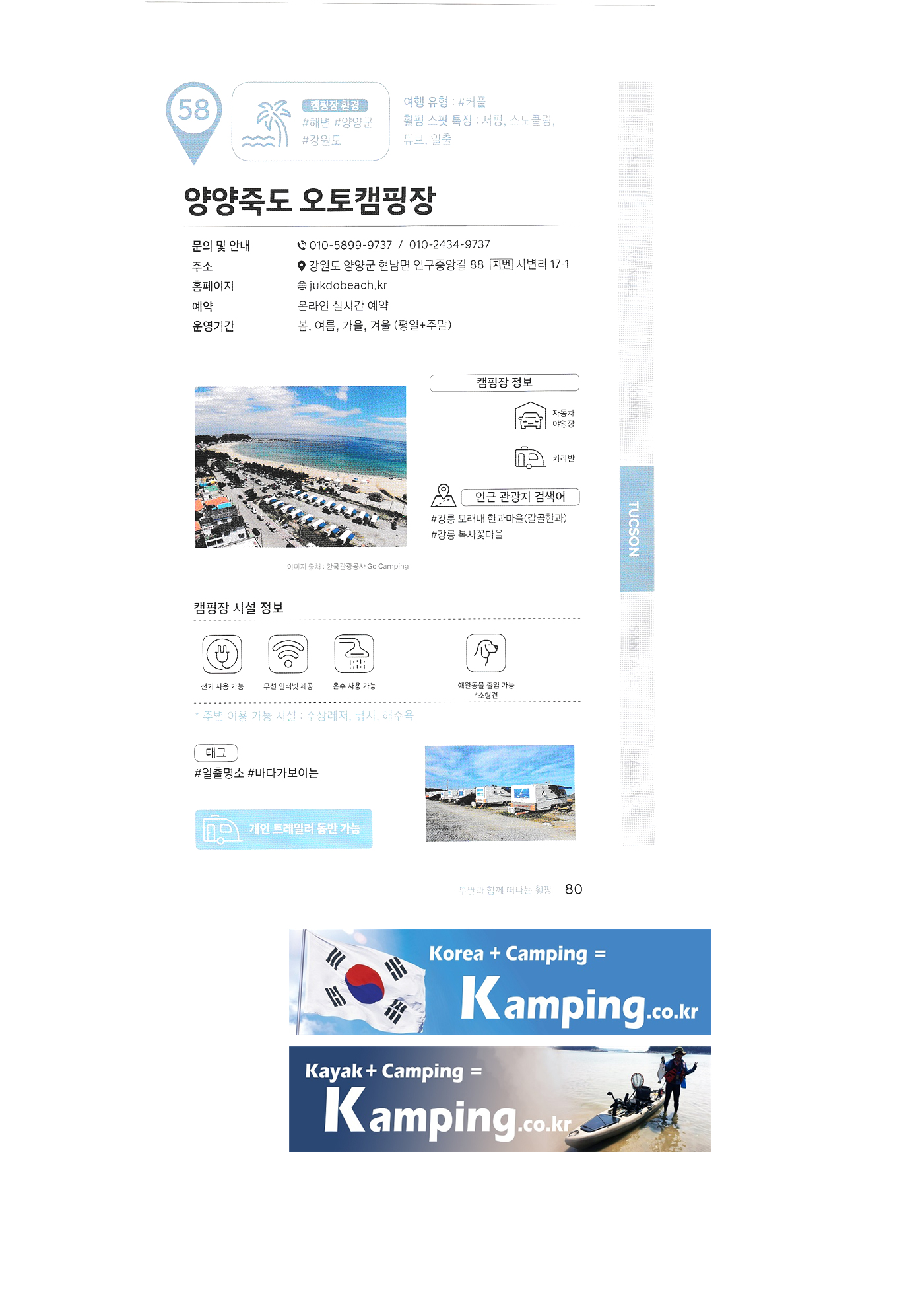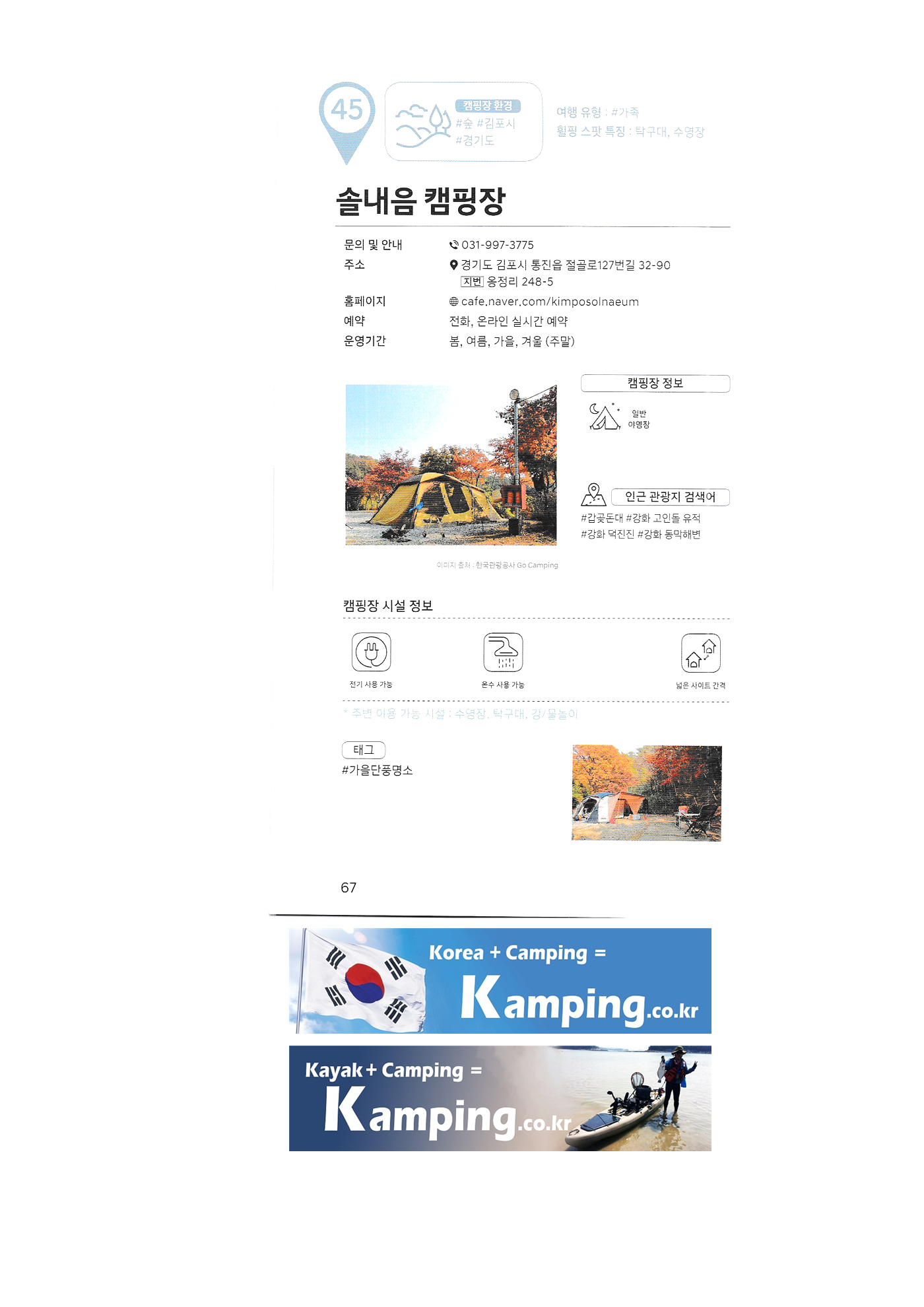 | 한국 관광공사 휠핑여지도 3 : 전국 캠핑장 안내 소나무와 계곡 캠핑장 큐브존 캠핑장 검봉산 자연휴양림 오토캠핑장 대저 캠핑장 솔내음 캠핑장 고성 얼음골 공원 펜션 캠핑장 옥계 오토캠핑장 치악산림 오토캠핑장 호수산장 관광농원 고성잔디 캠핑장 백경 오토캠핑장 산촌 캠핑 성동힐링센터 휴 영월캠프 수목화 송정마을 오토캠핑장 안산화랑 오토캠핑장 알프스밸리 캠핑장 월드니스 오토캠핑장 양양죽도 오토캠핑장 철원가산농원 캠핑장 리버뷰 캠핑장 |