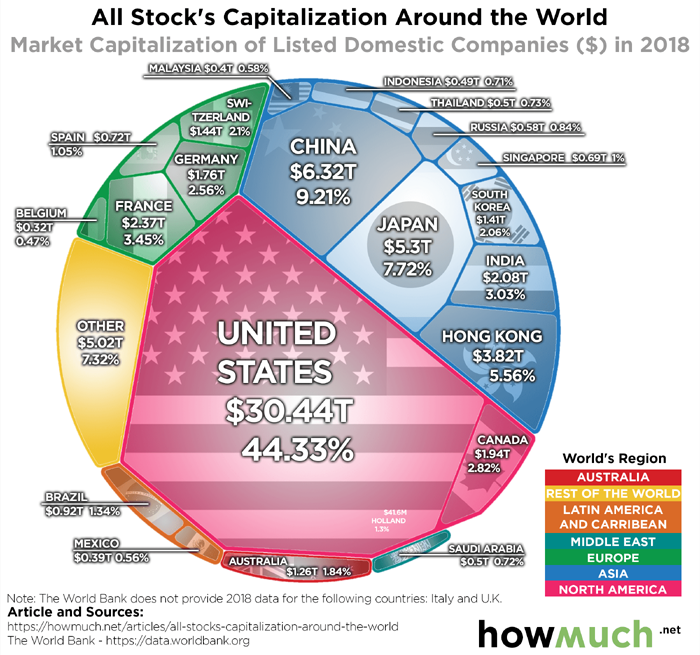 - 실제, 미국은 전 세계 주식 시장의 거의 절반을 차지할 정도로 크다.