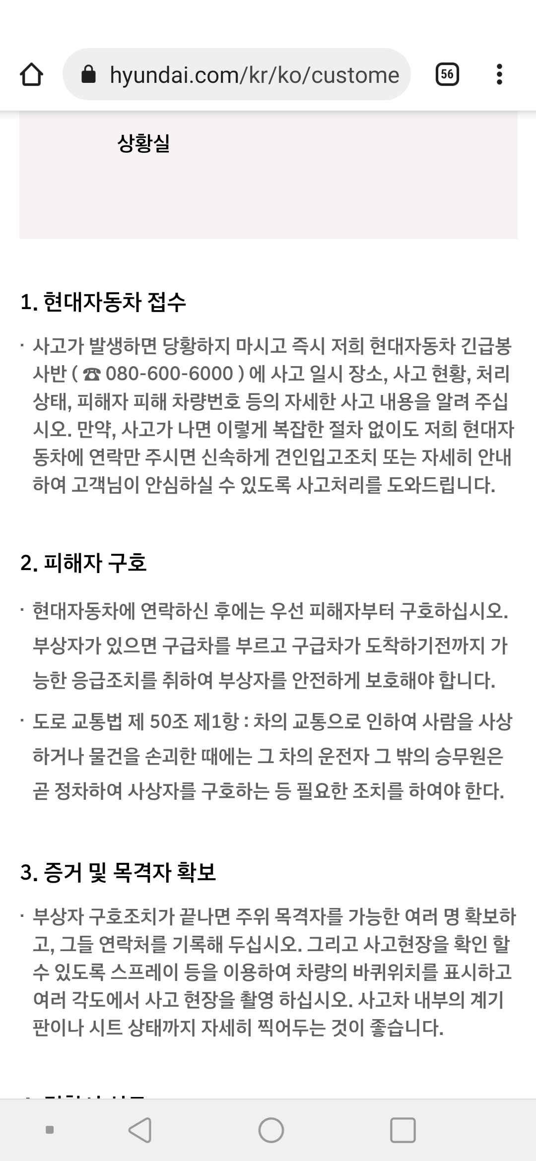 사고가 발생하면 당황하지 마시고 즉시 저희 현대자동차 긴급봉사반 ( ☎ 080-600-6000 ) 에 사고 일시 장소, 사고 현황, 처리상태, 피해자 피해 차량번호 등의 자세한 사고 내용을 알려 주십시오. 만약, 사고가 나면 이렇게 복잡한 절차 없이도 저희 현대자동차에 연락만 주시면 신속하게 견인입고조치 또는 자세히 안내하여 고객님이 안심하실 수 있도록 사고처리를 도와드립니다.